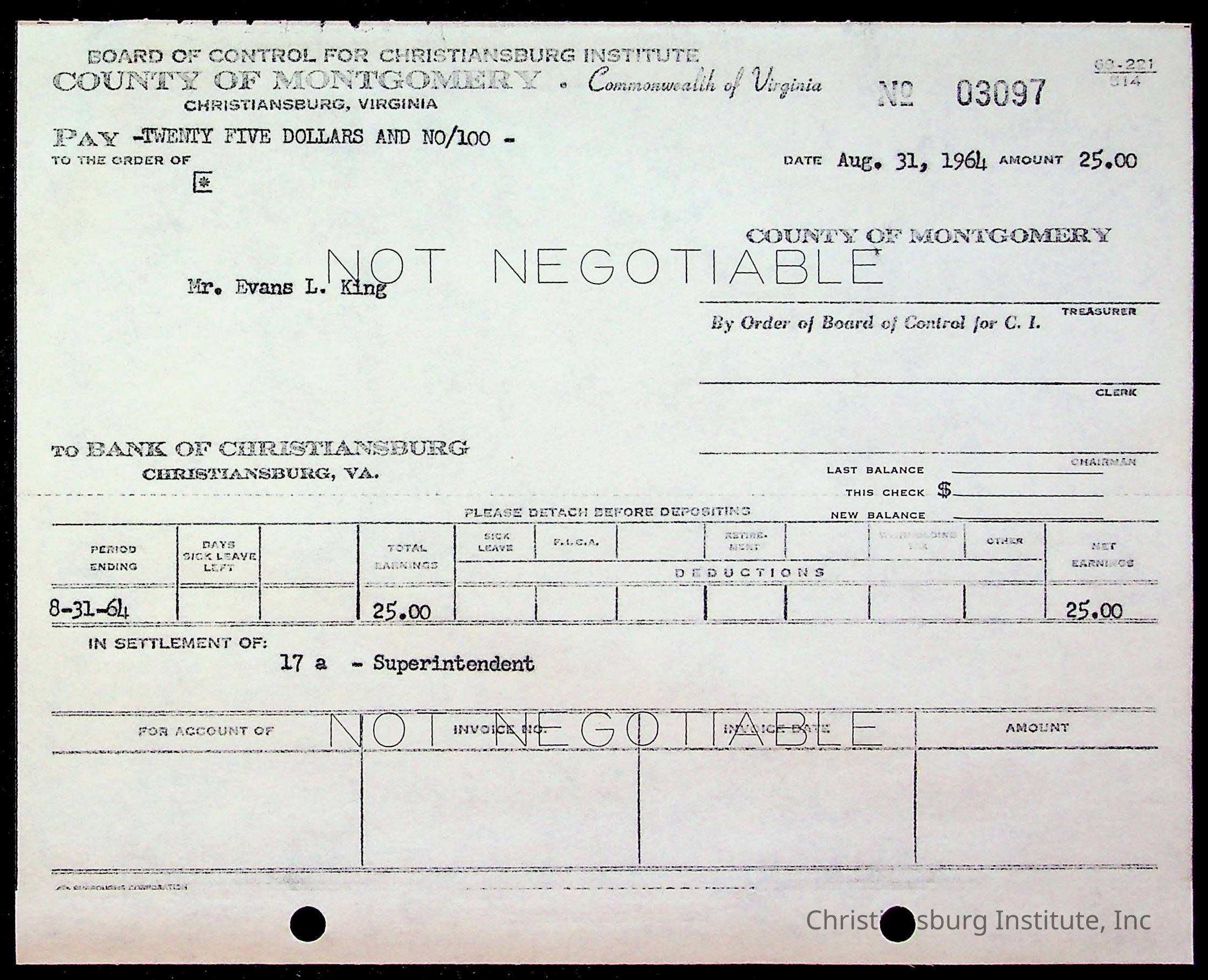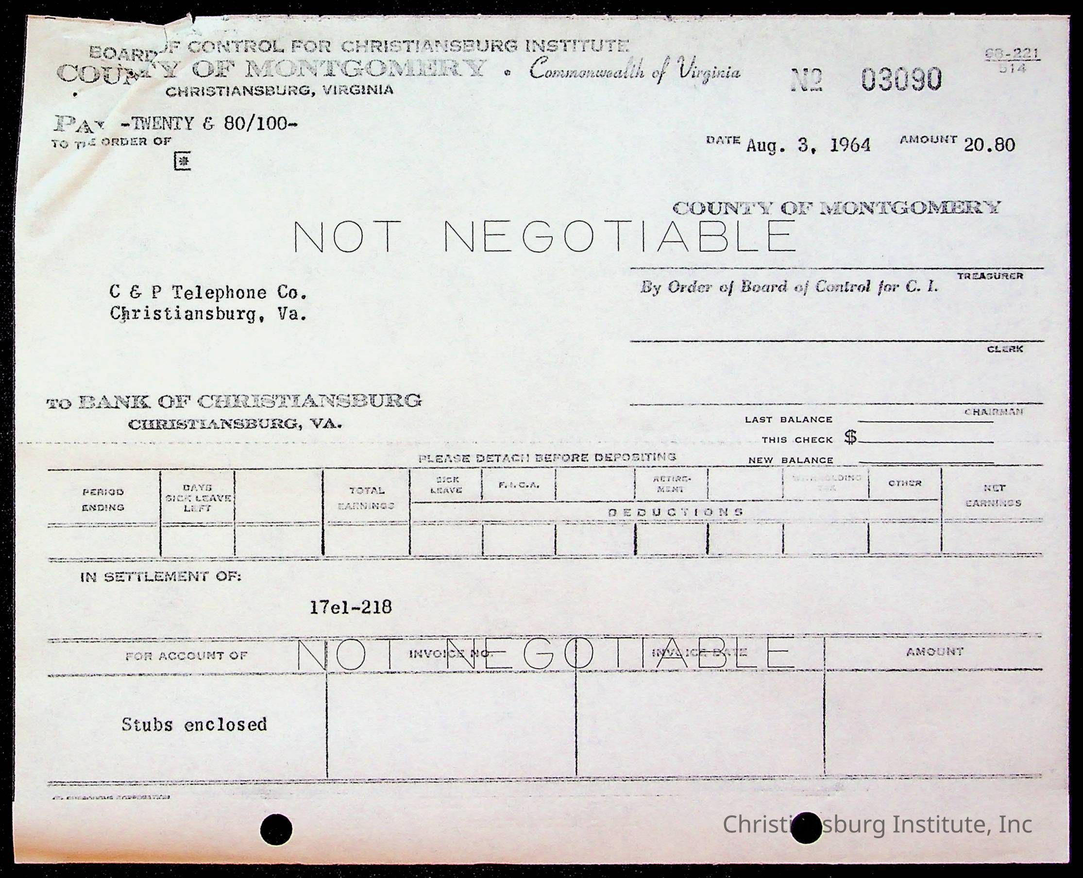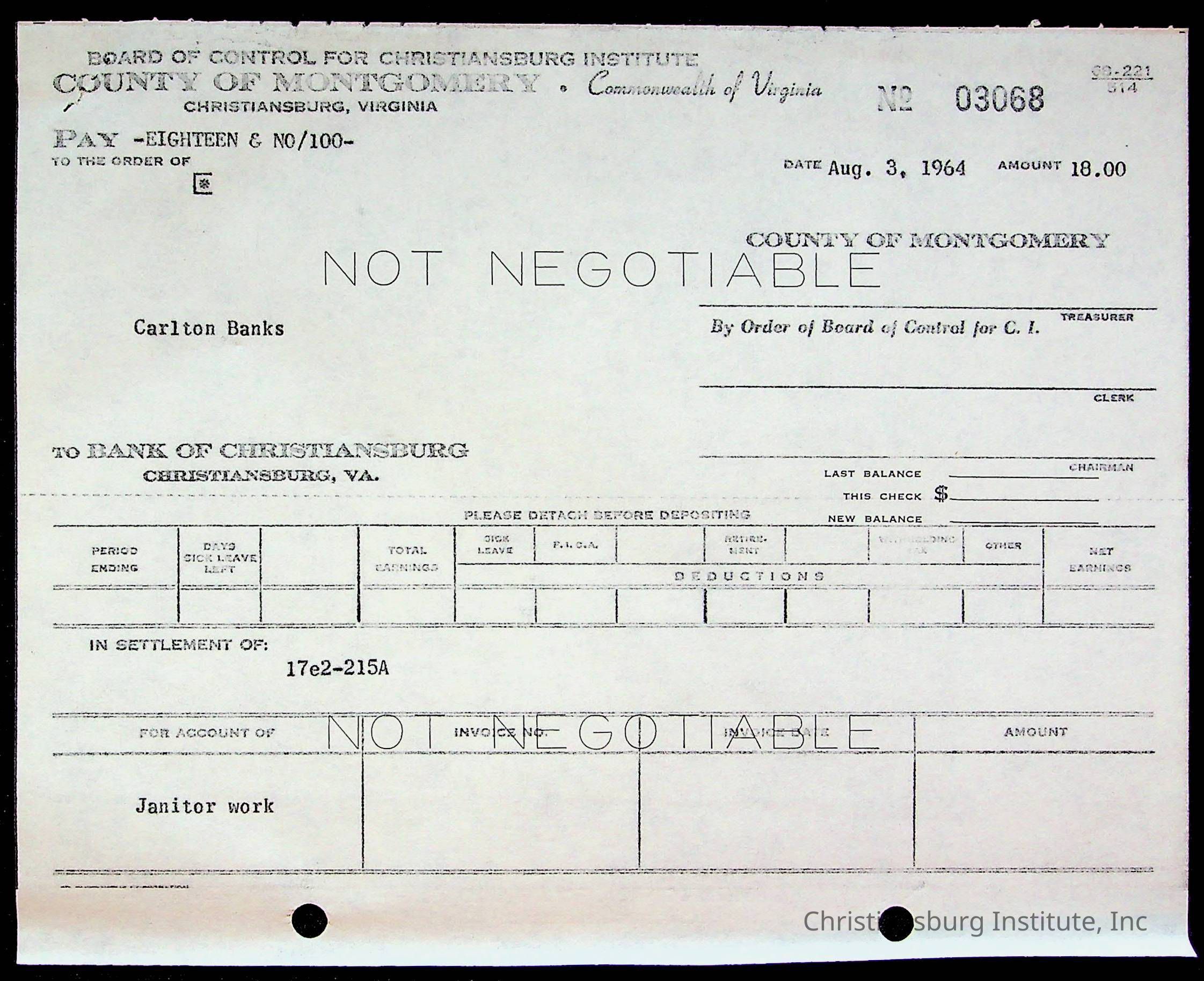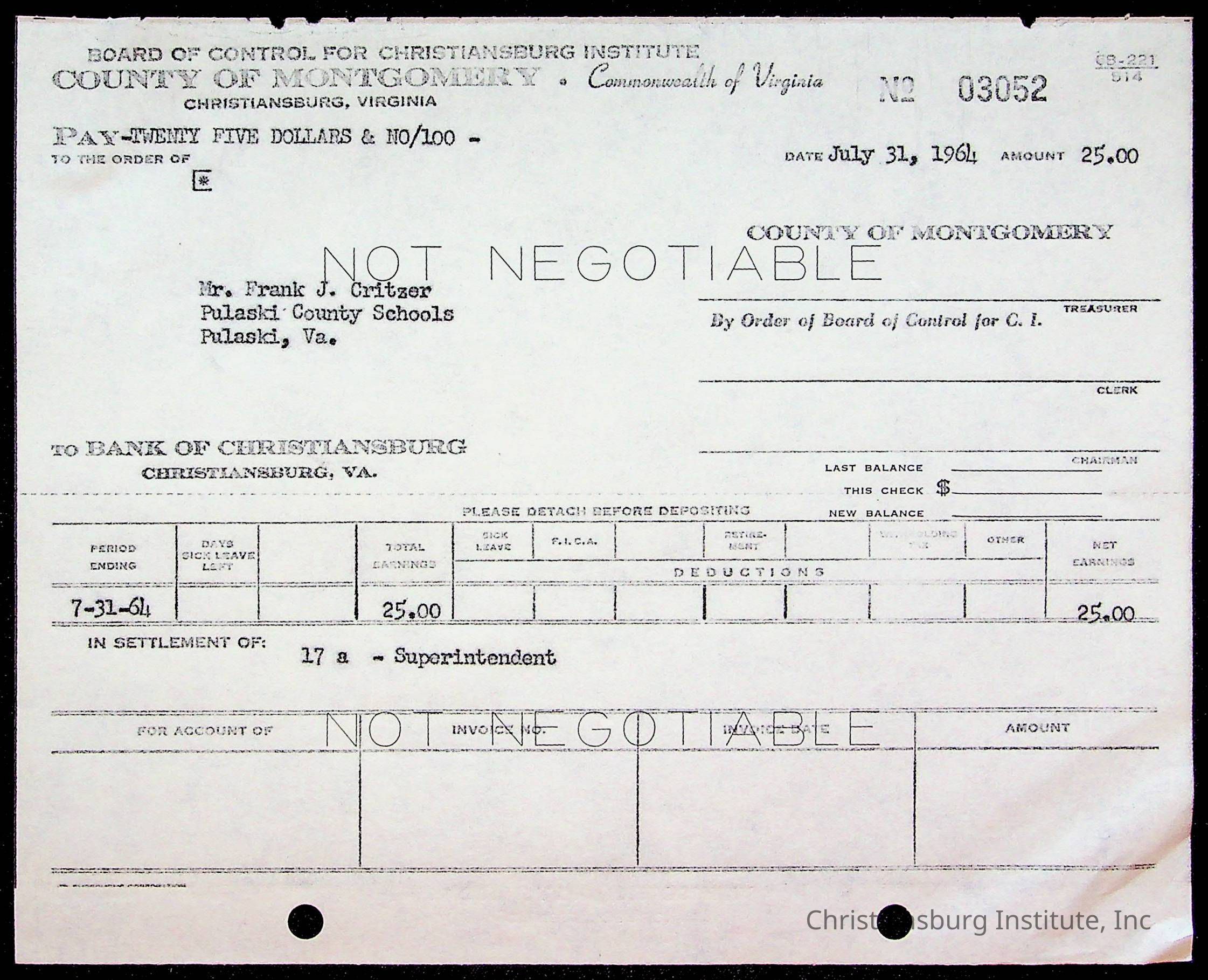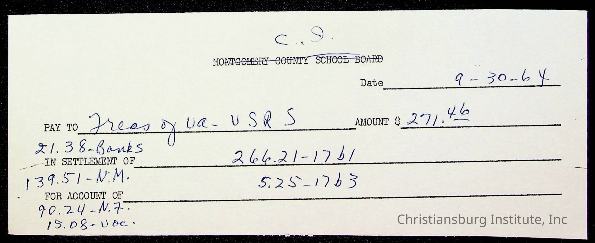 An archive of bills and receipts for the Board of Control of Christiansburg Institute and the Montgomery County School Board, circa 1960s.