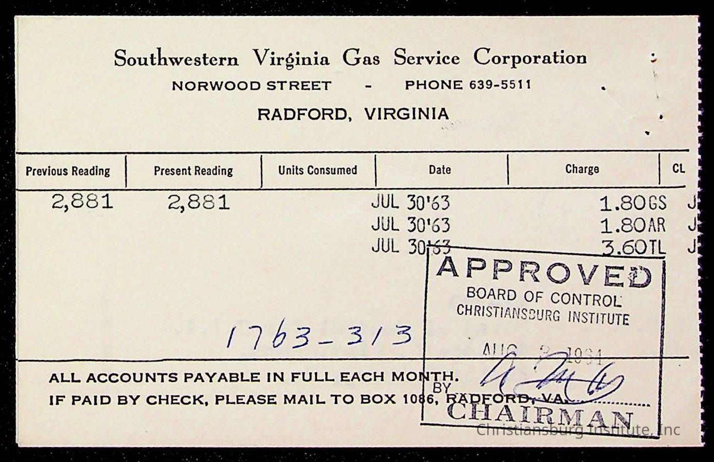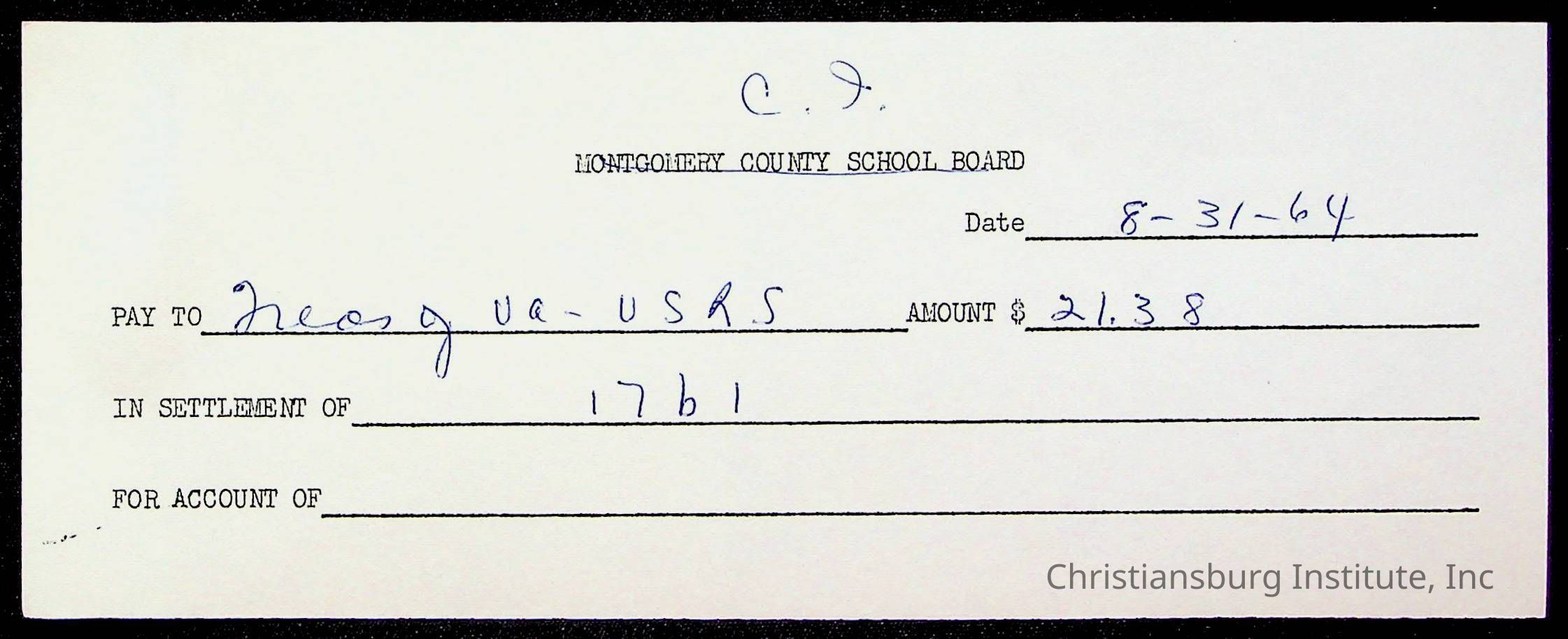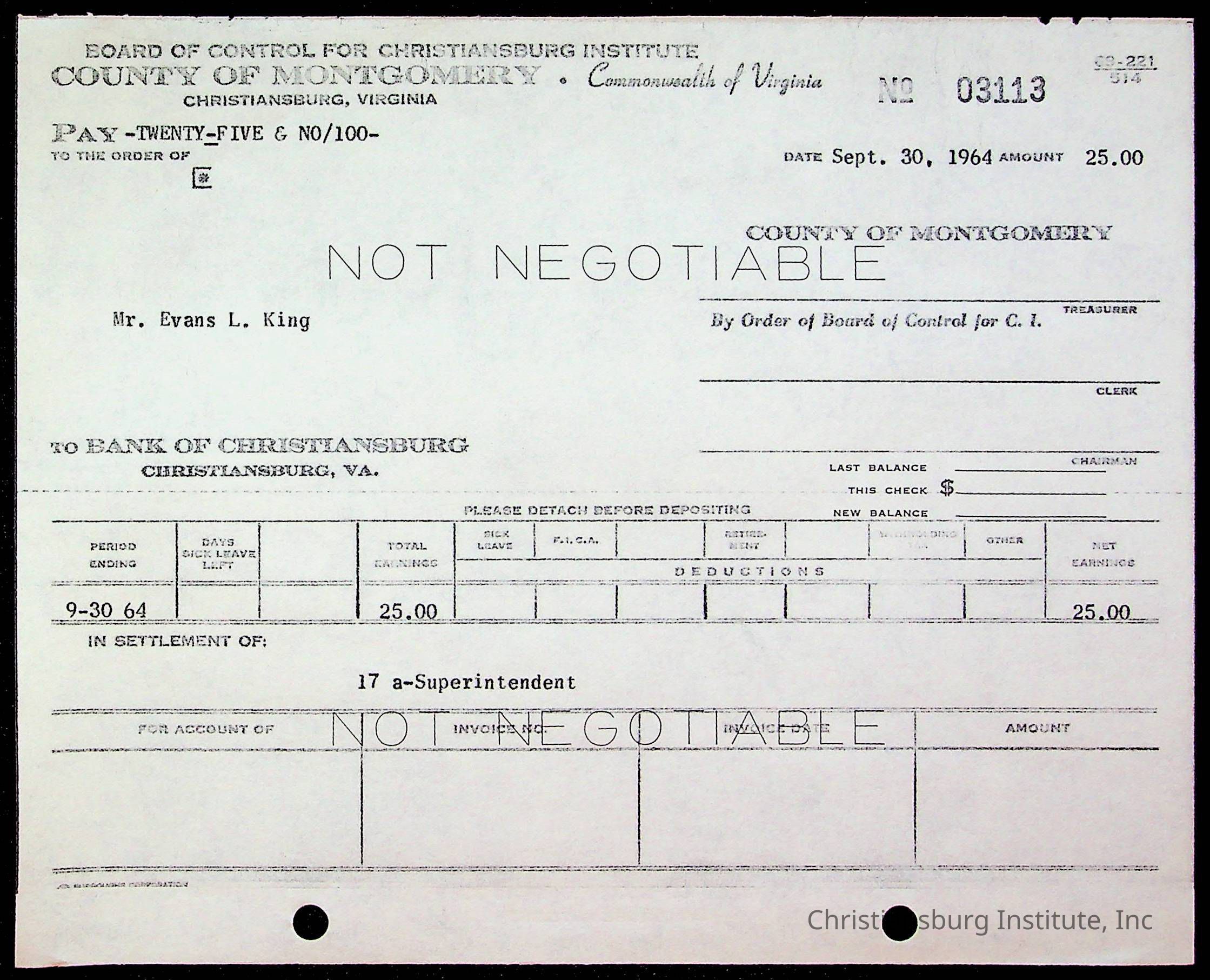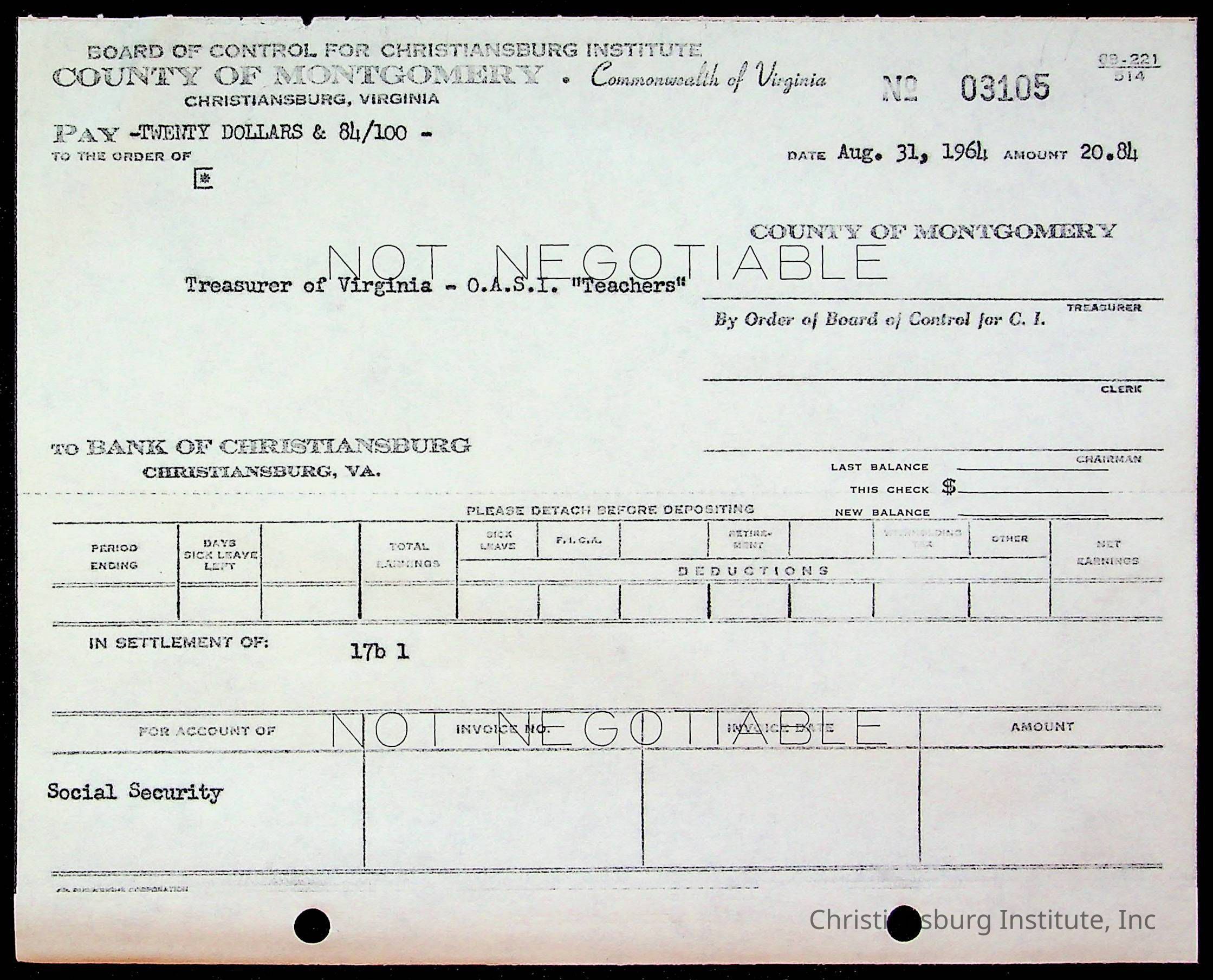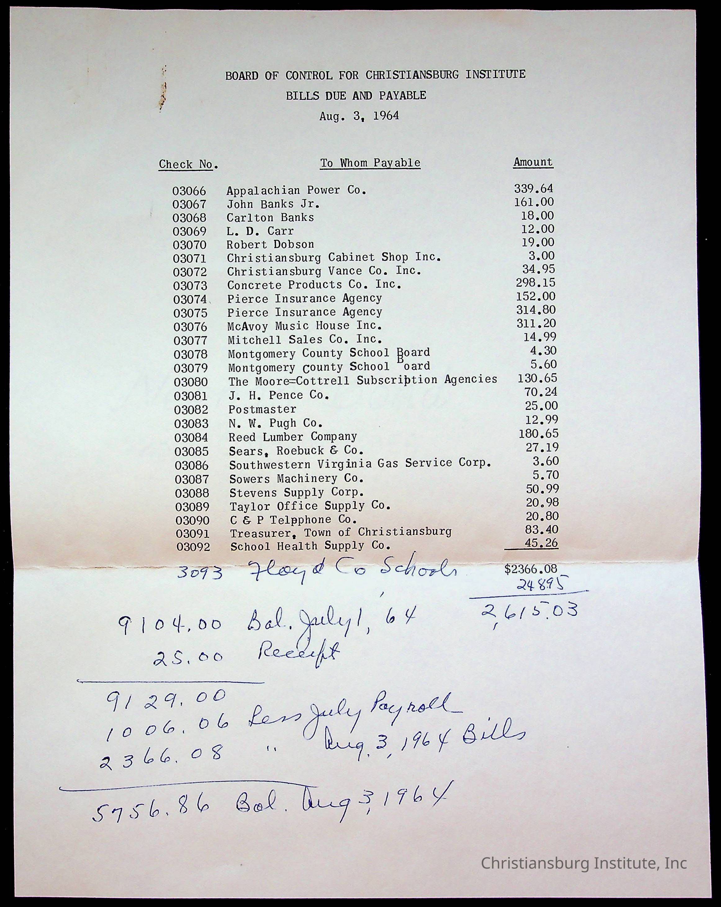 An archive of bills and receipts for the Board of Control of Christiansburg Institute and the Montgomery County School Board, circa 1960s.