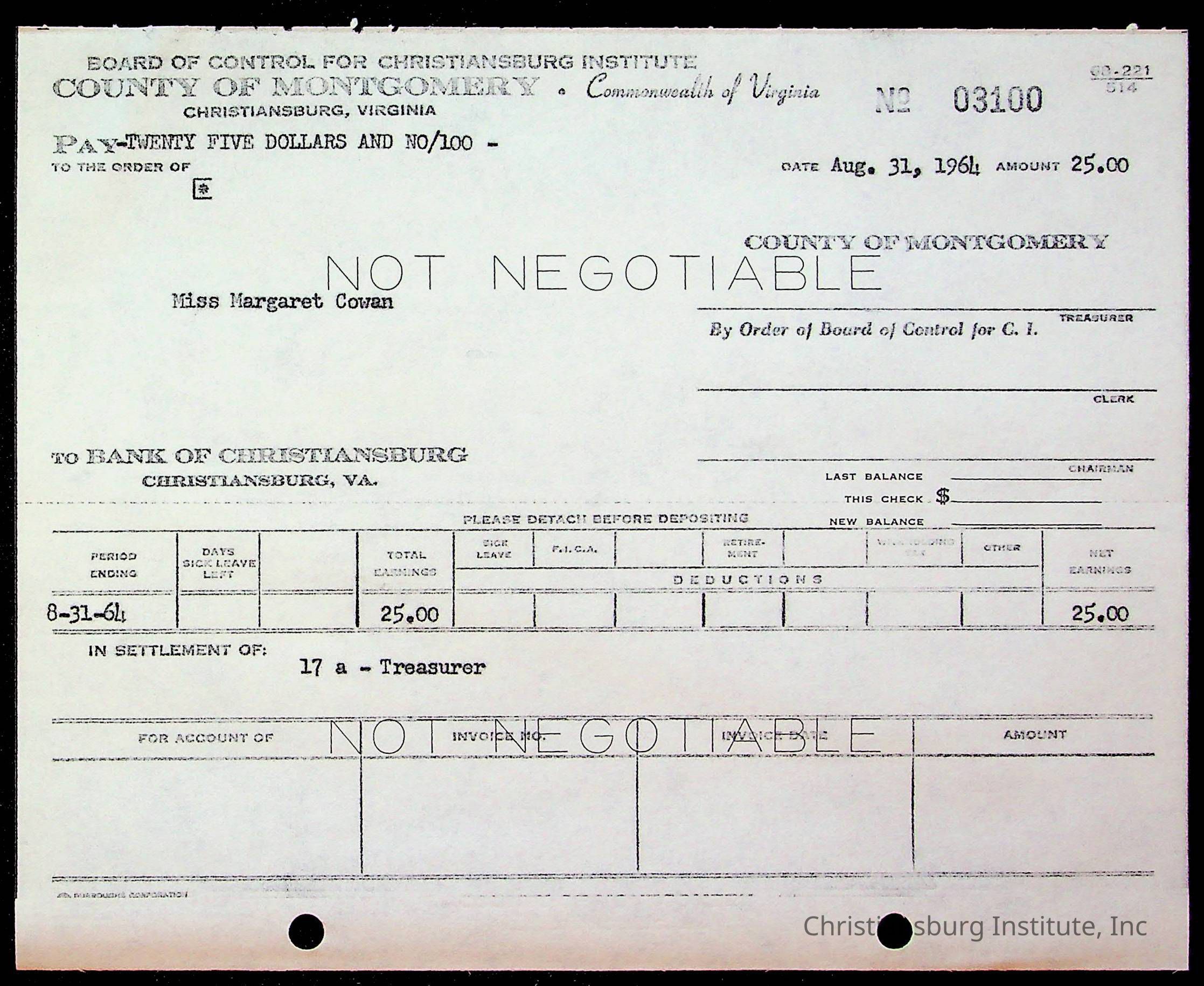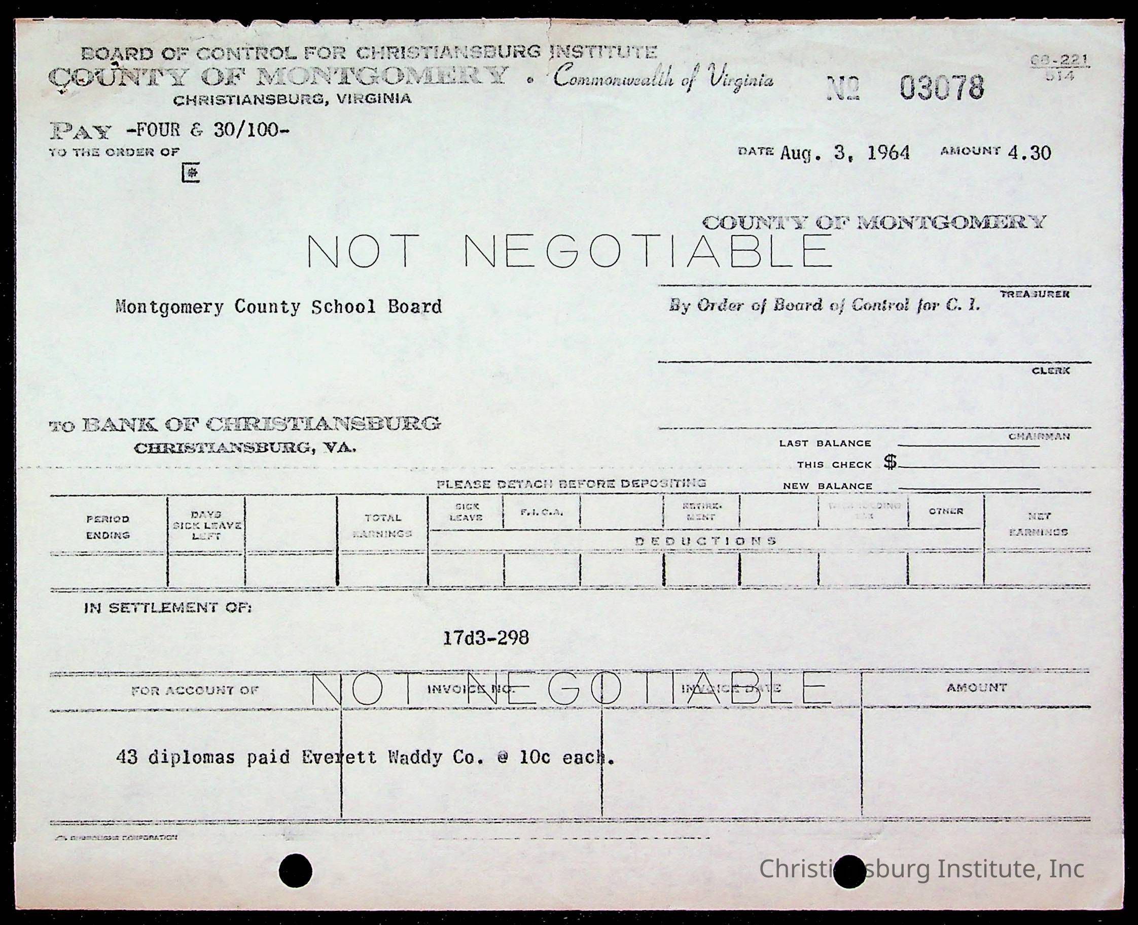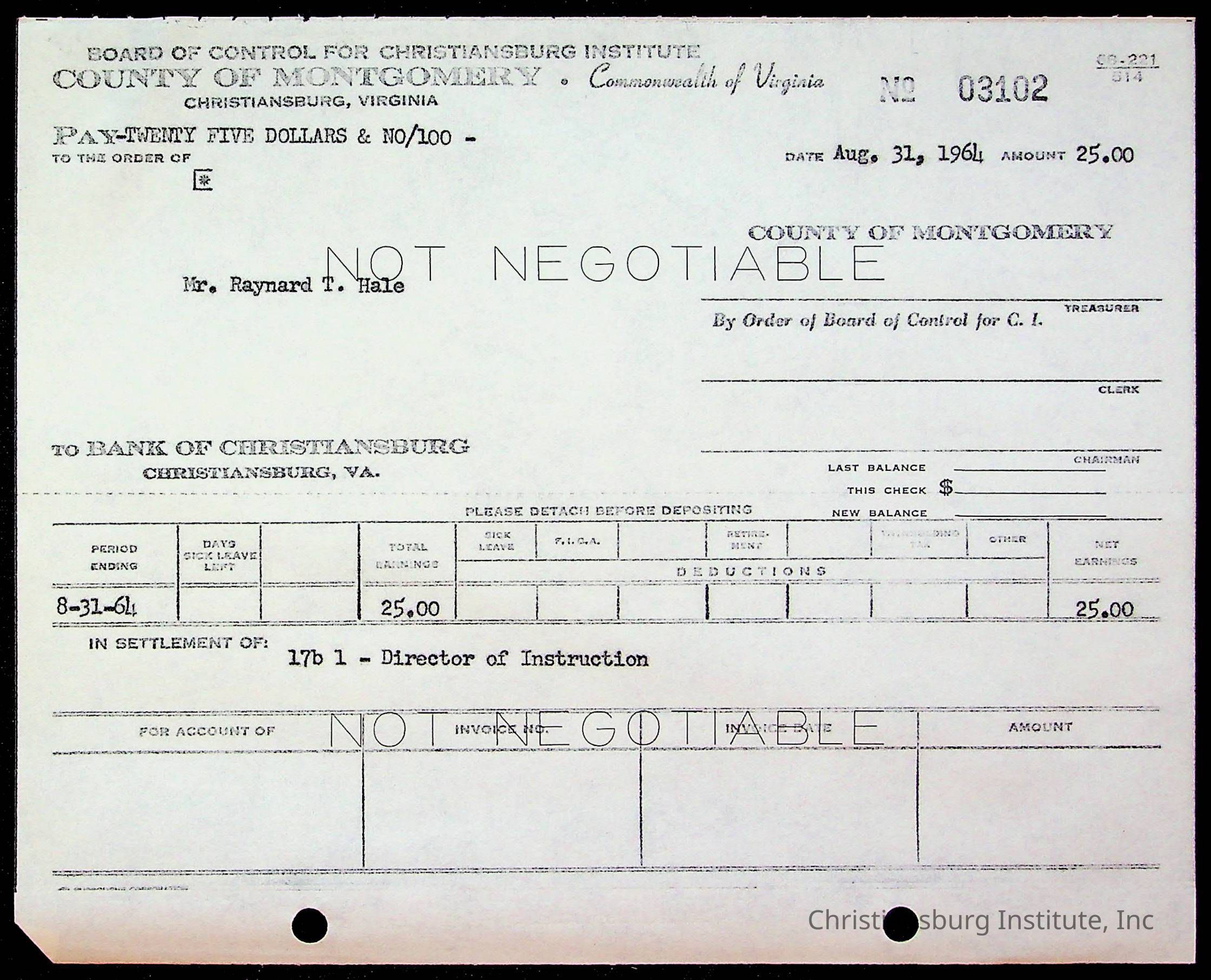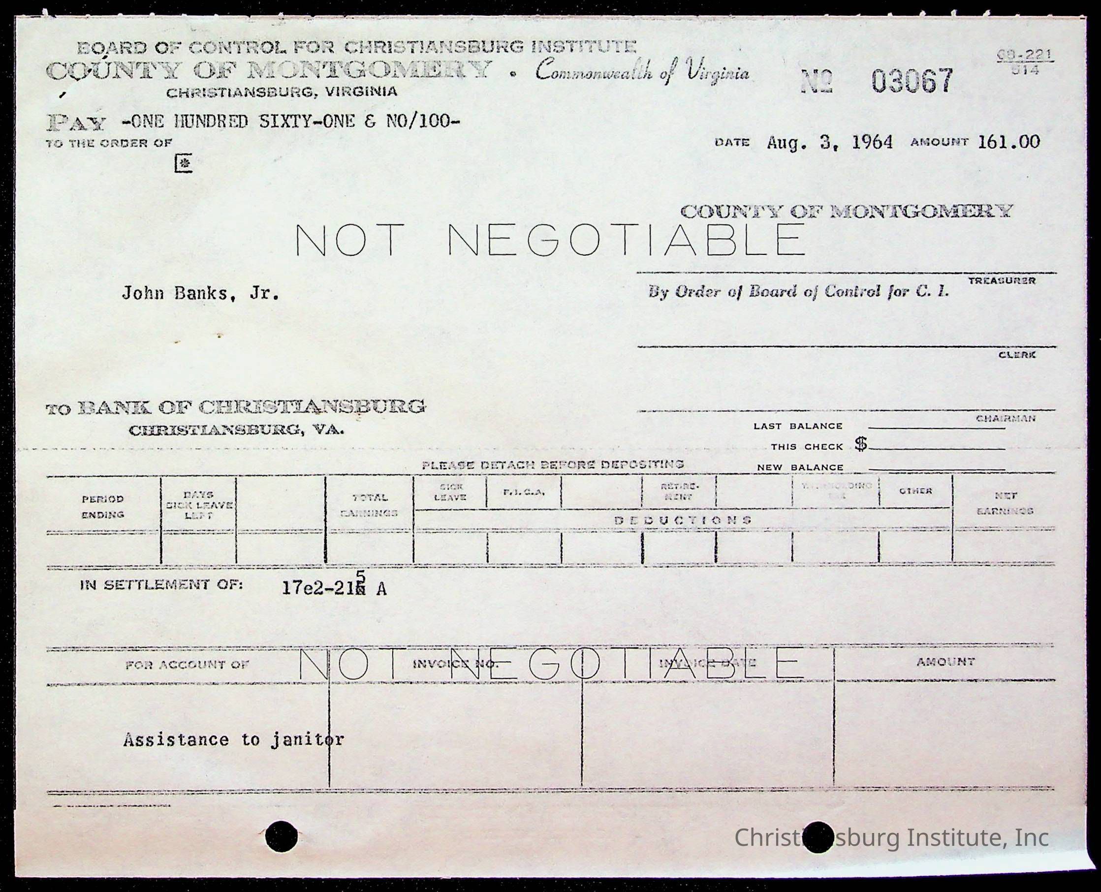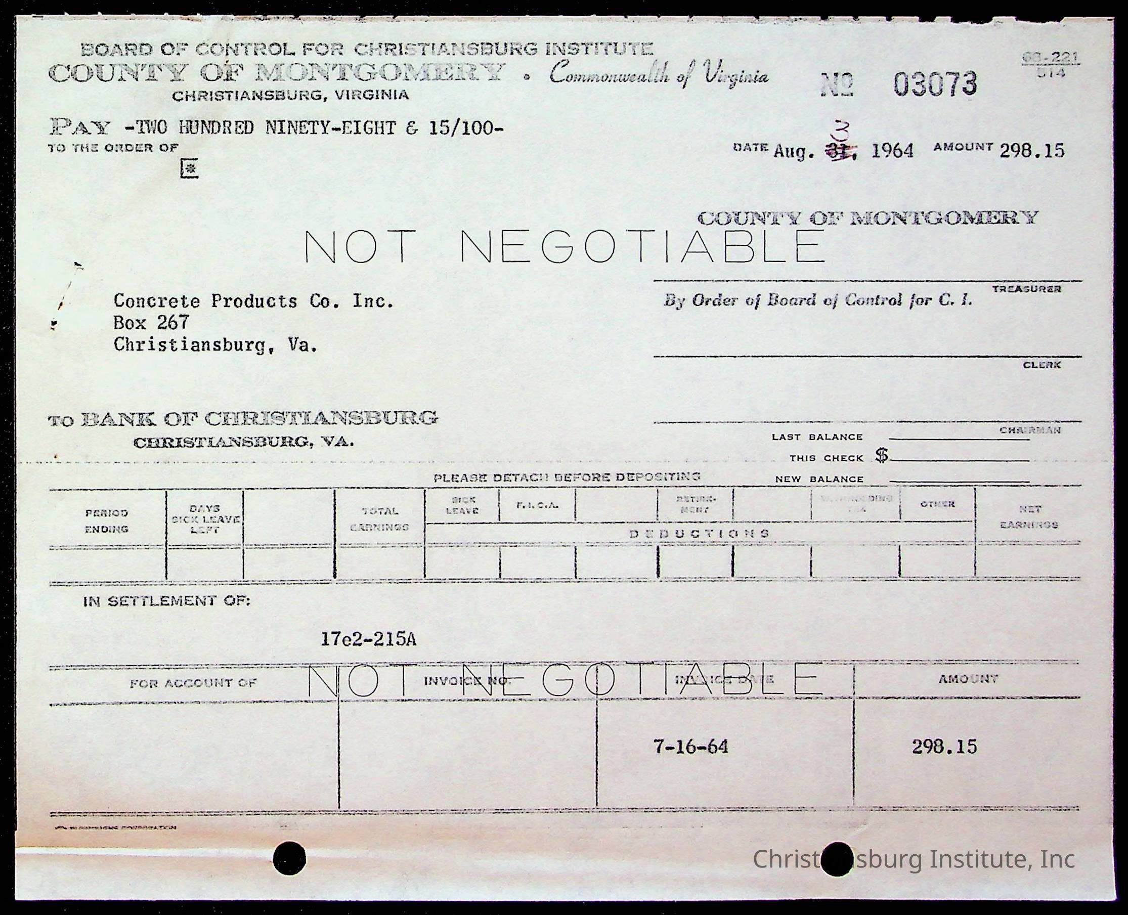 An archive of bills and receipts for the Board of Control of Christiansburg Institute and the Montgomery County School Board, circa 1960s.