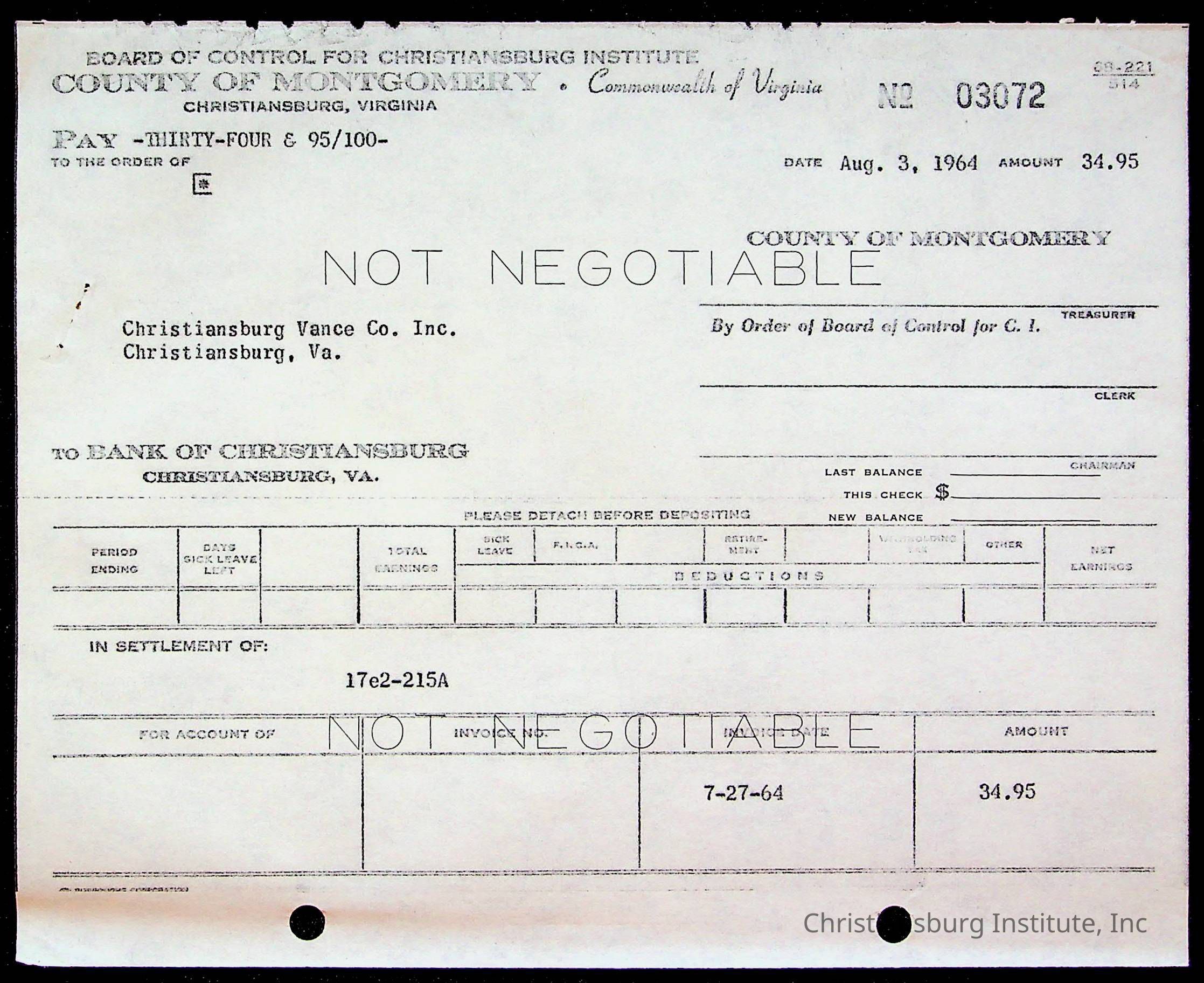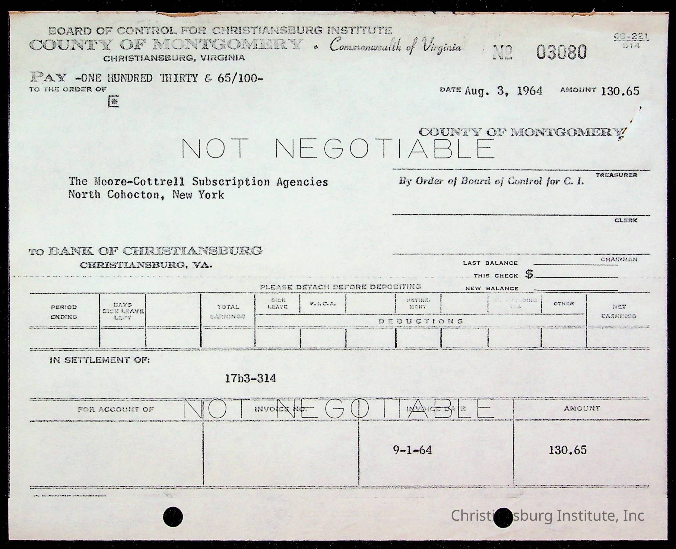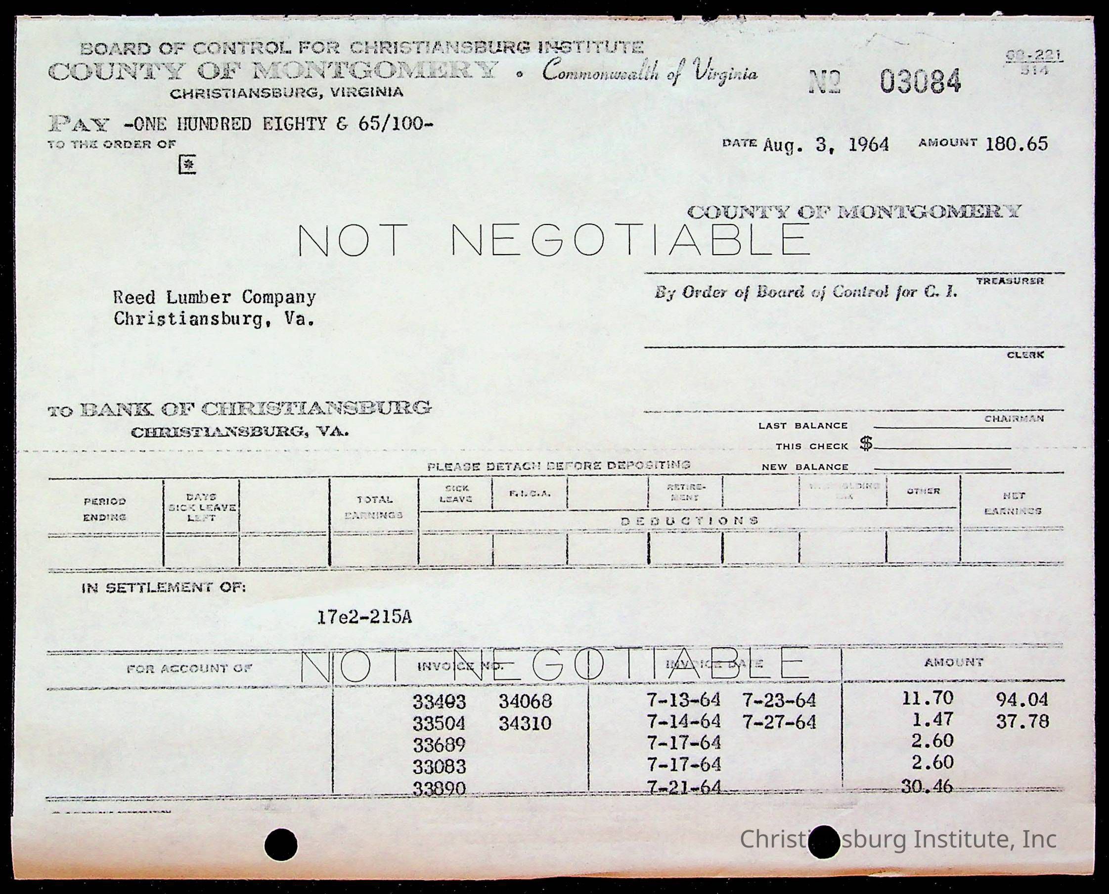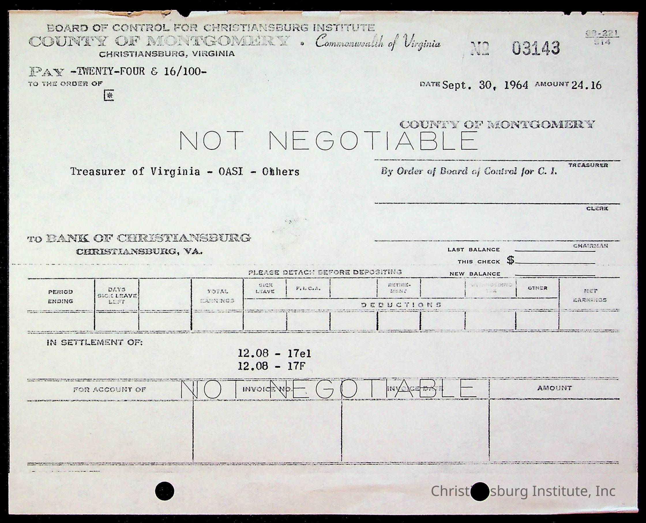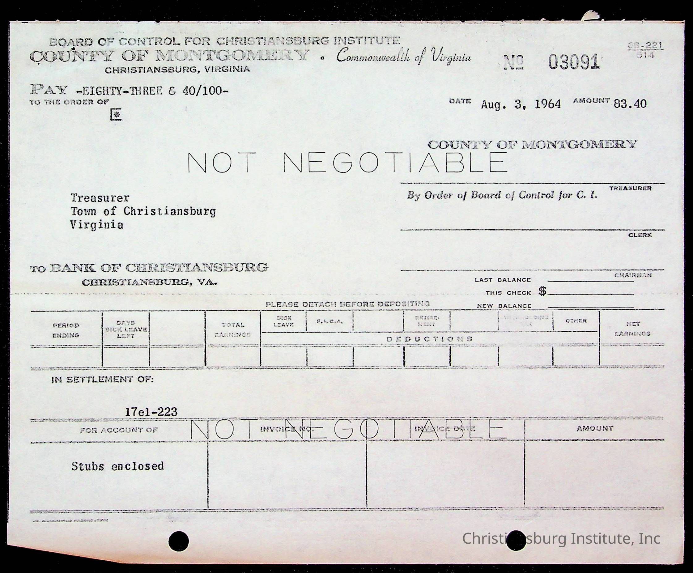 An archive of bills and receipts for the Board of Control of Christiansburg Institute and the Montgomery County School Board, circa 1960s.