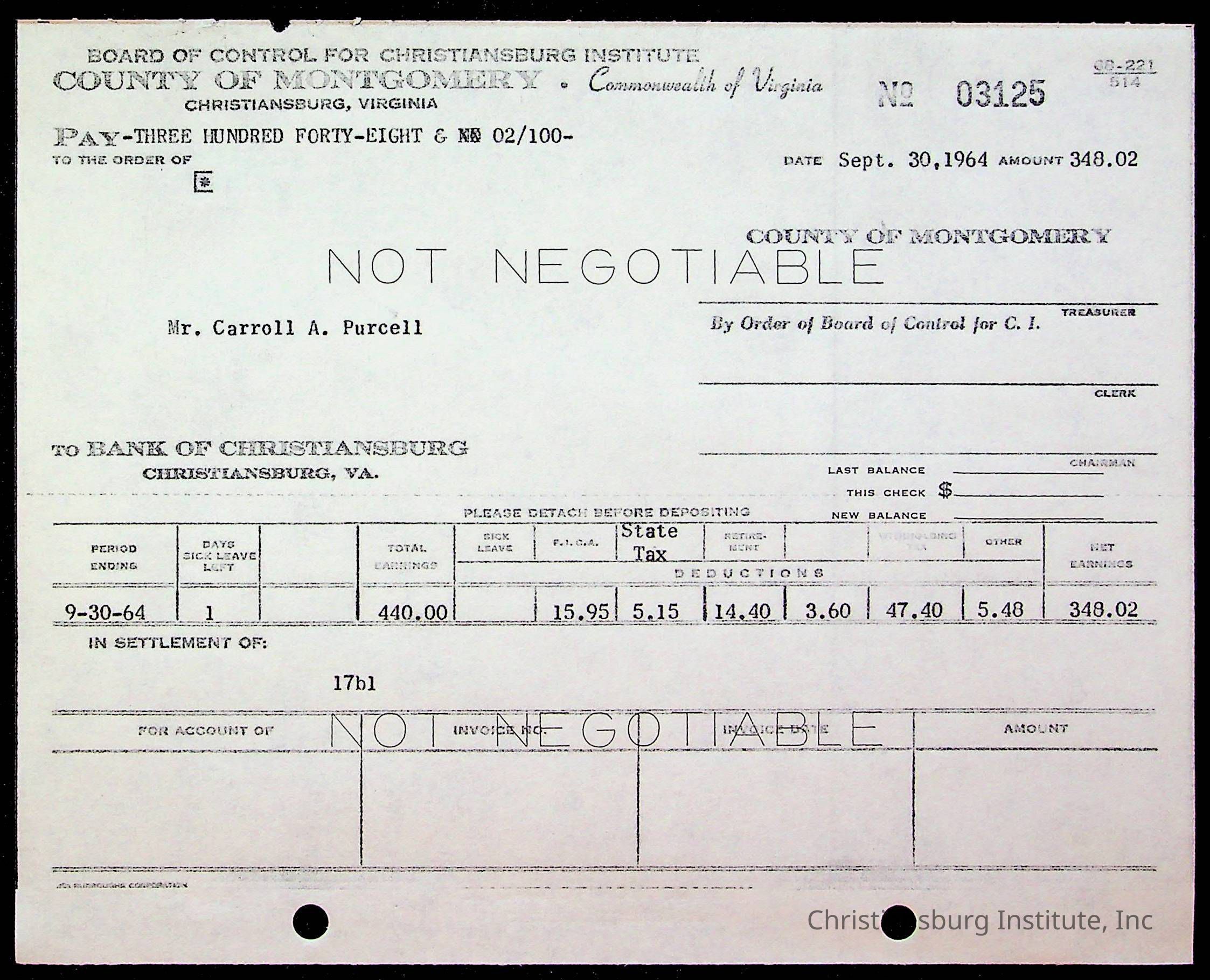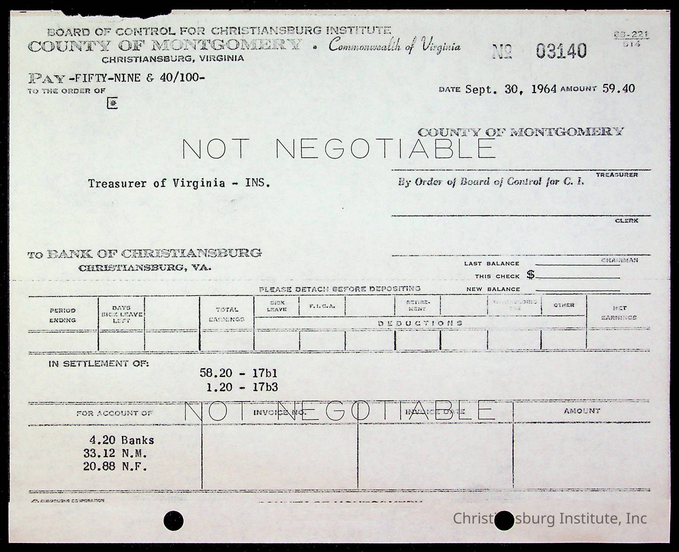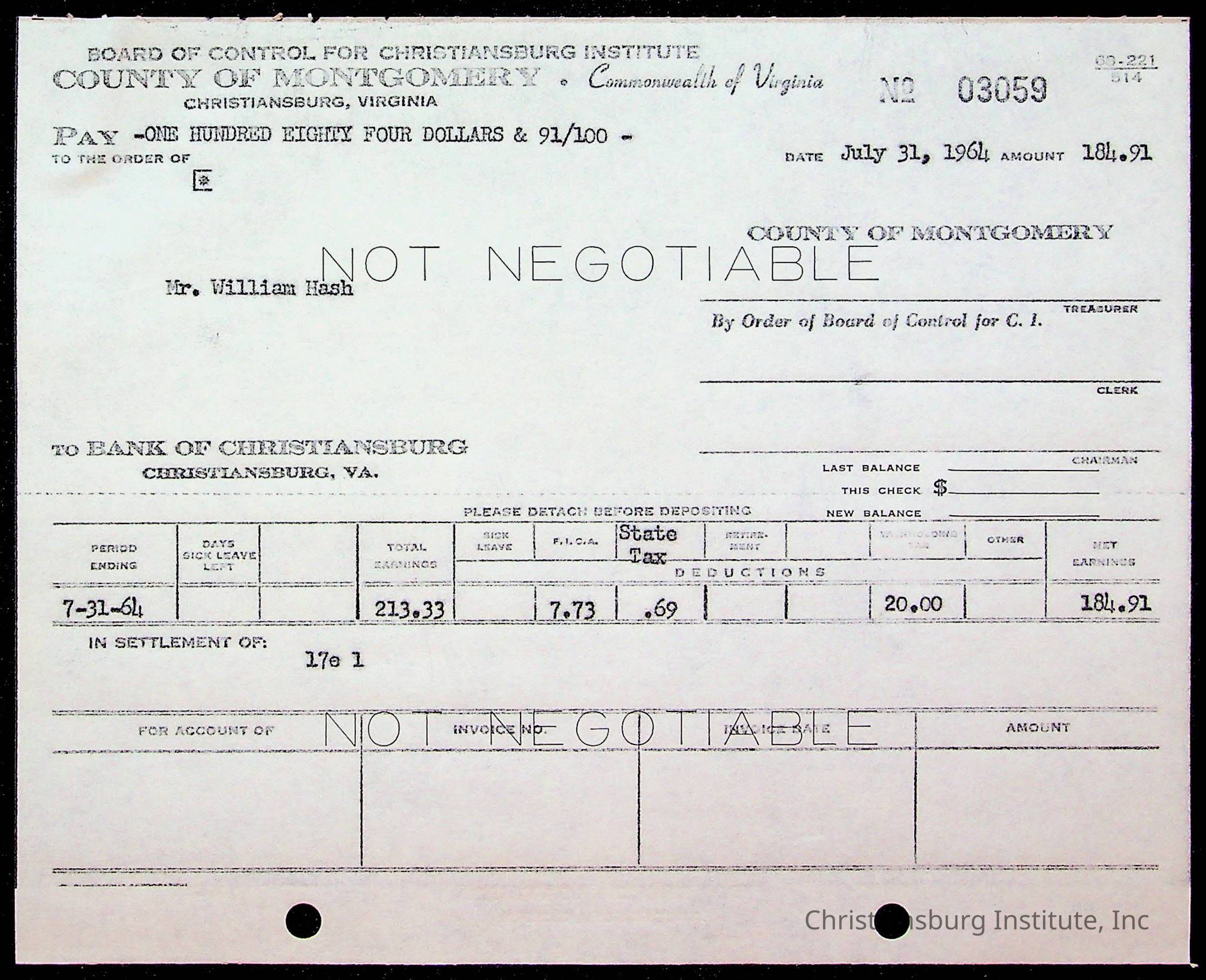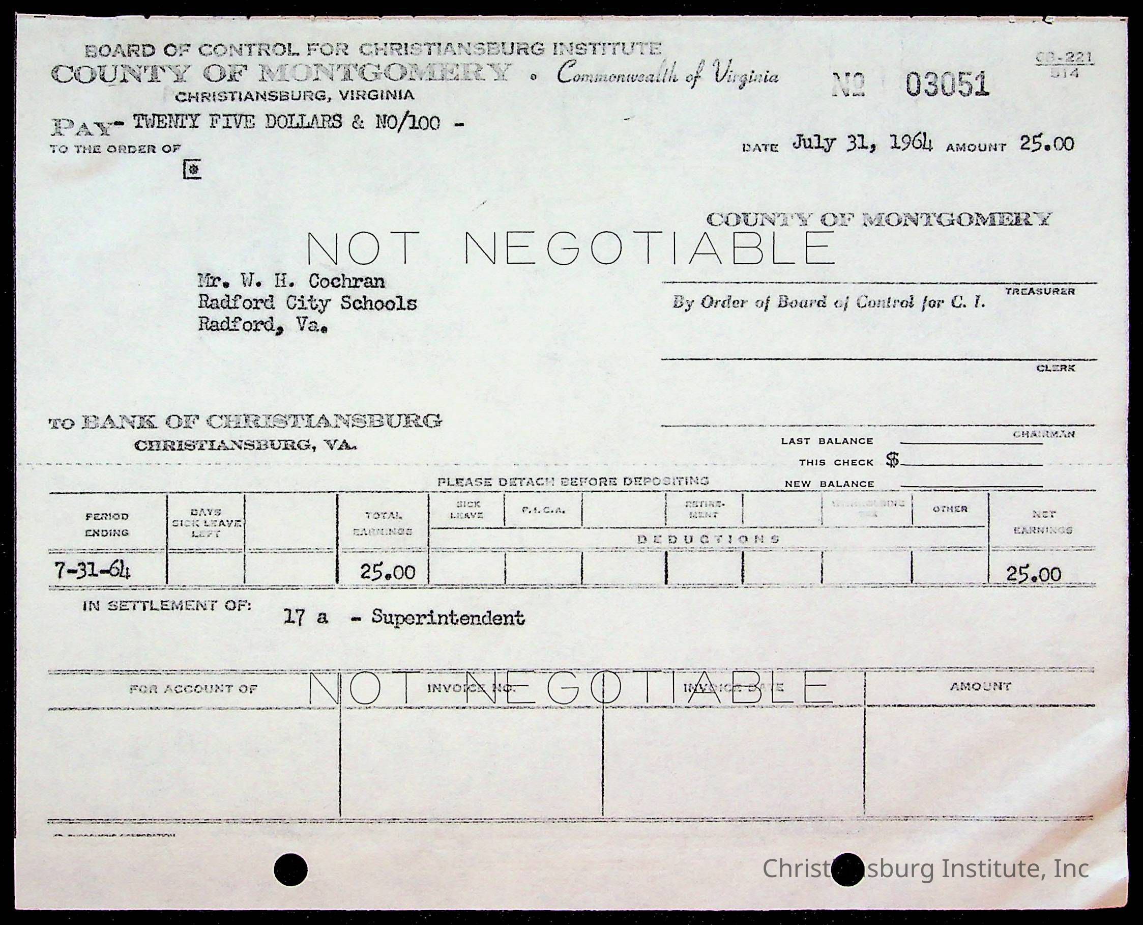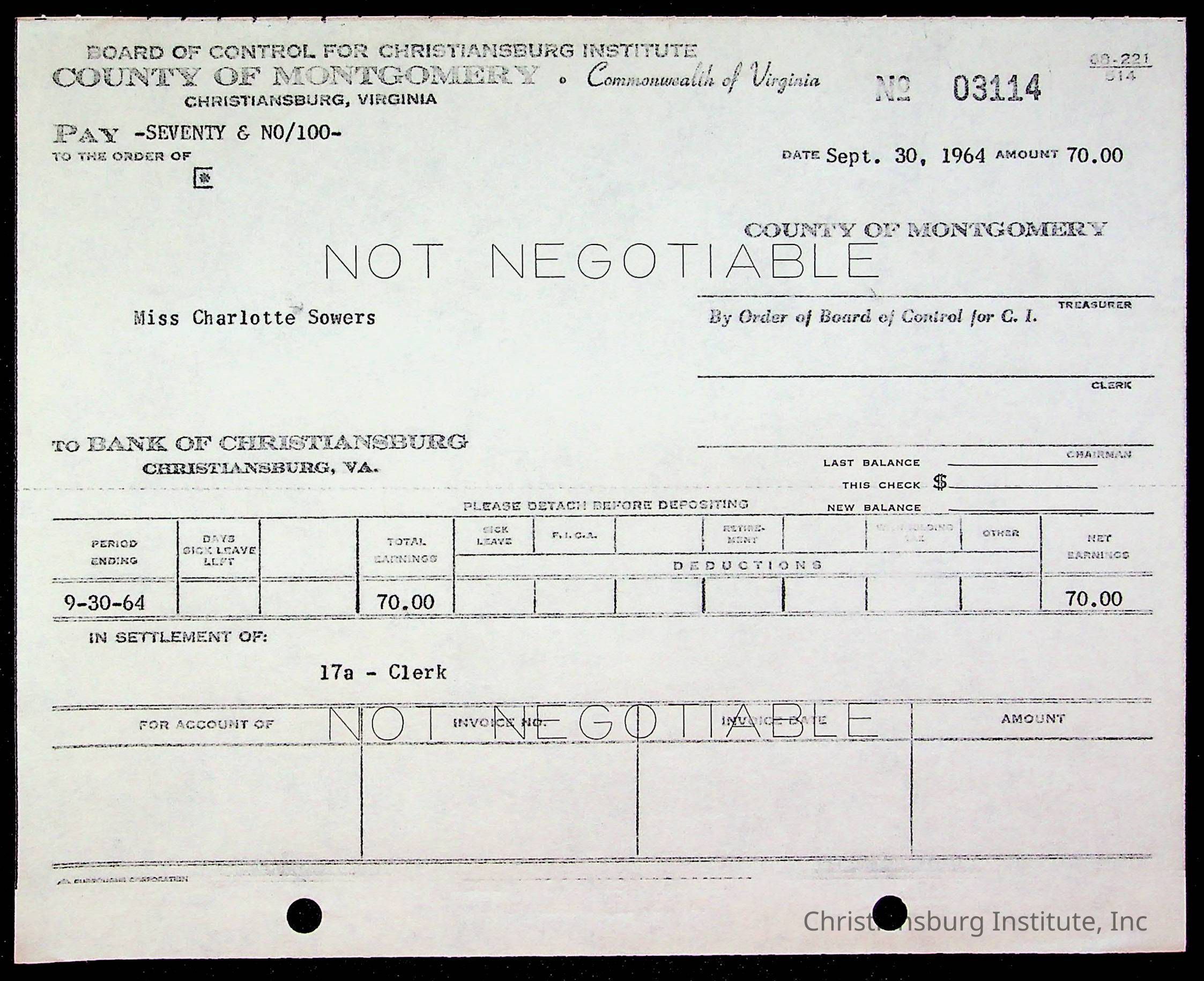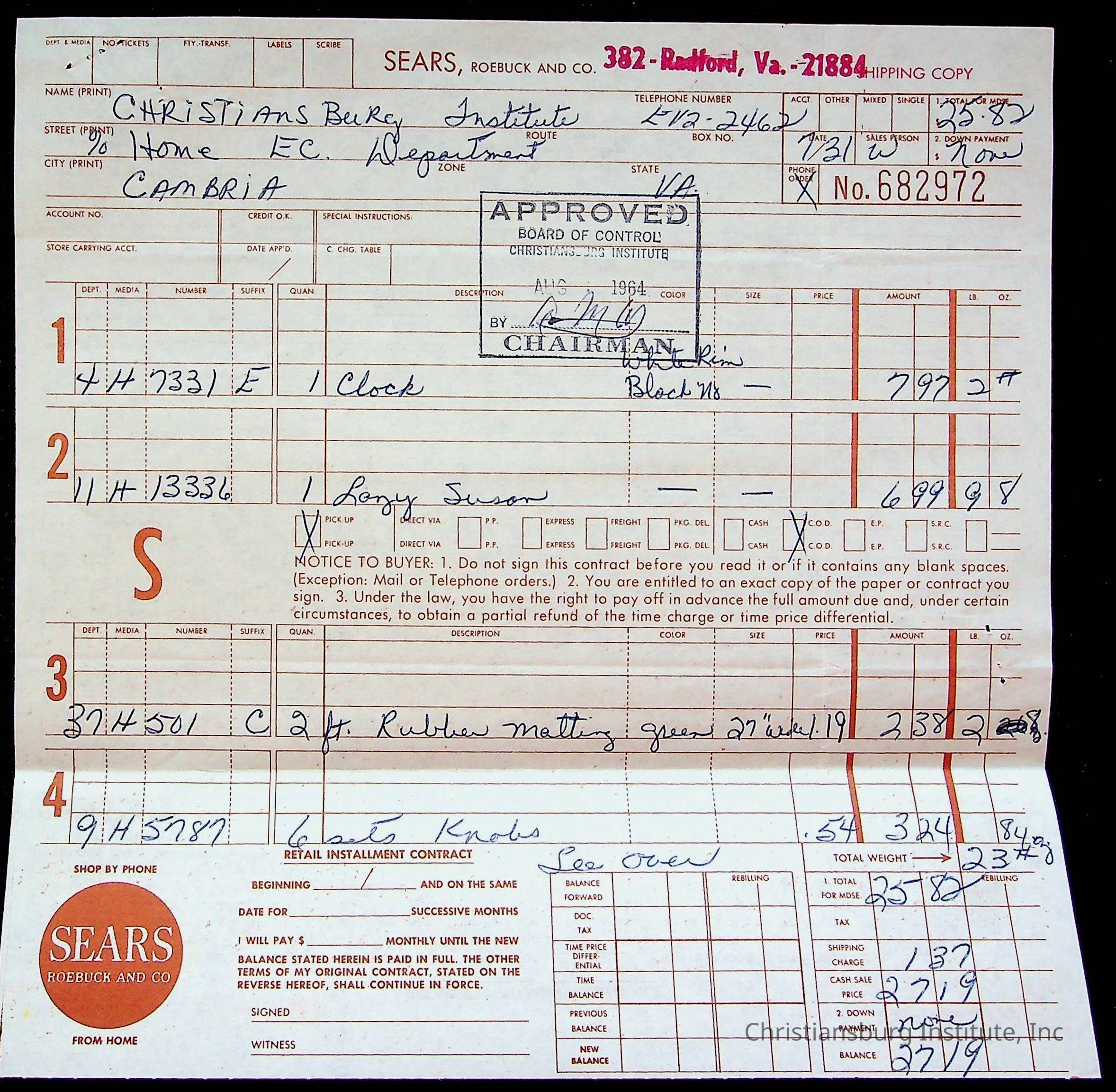 An archive of bills and receipts for the Board of Control of Christiansburg Institute and the Montgomery County School Board, circa 1960s.
