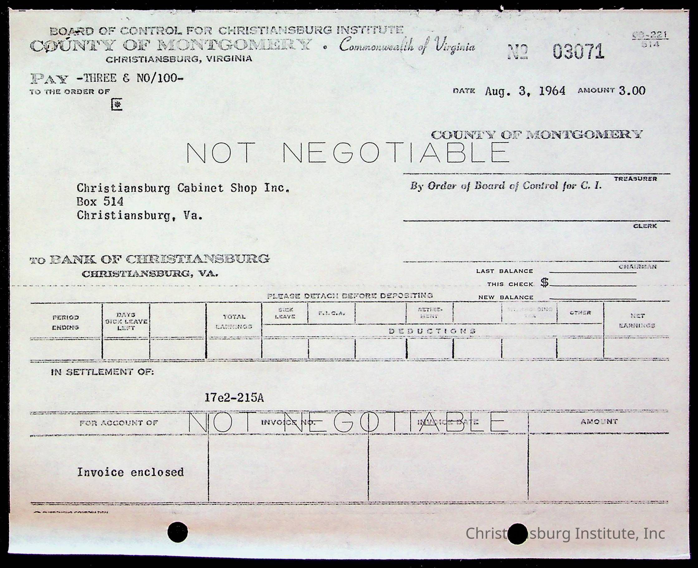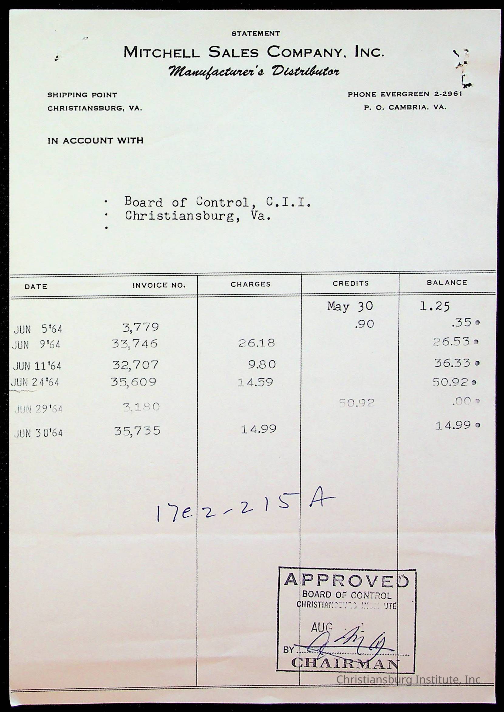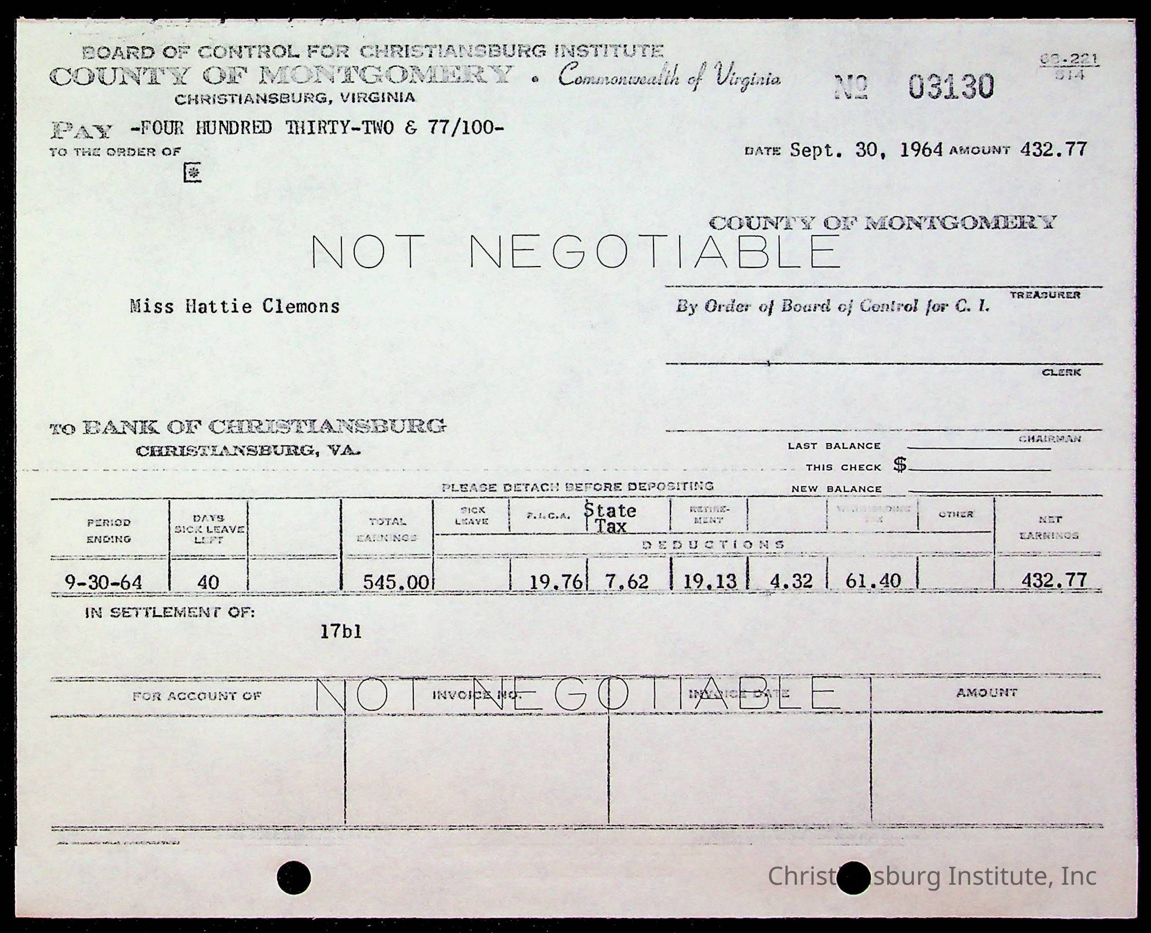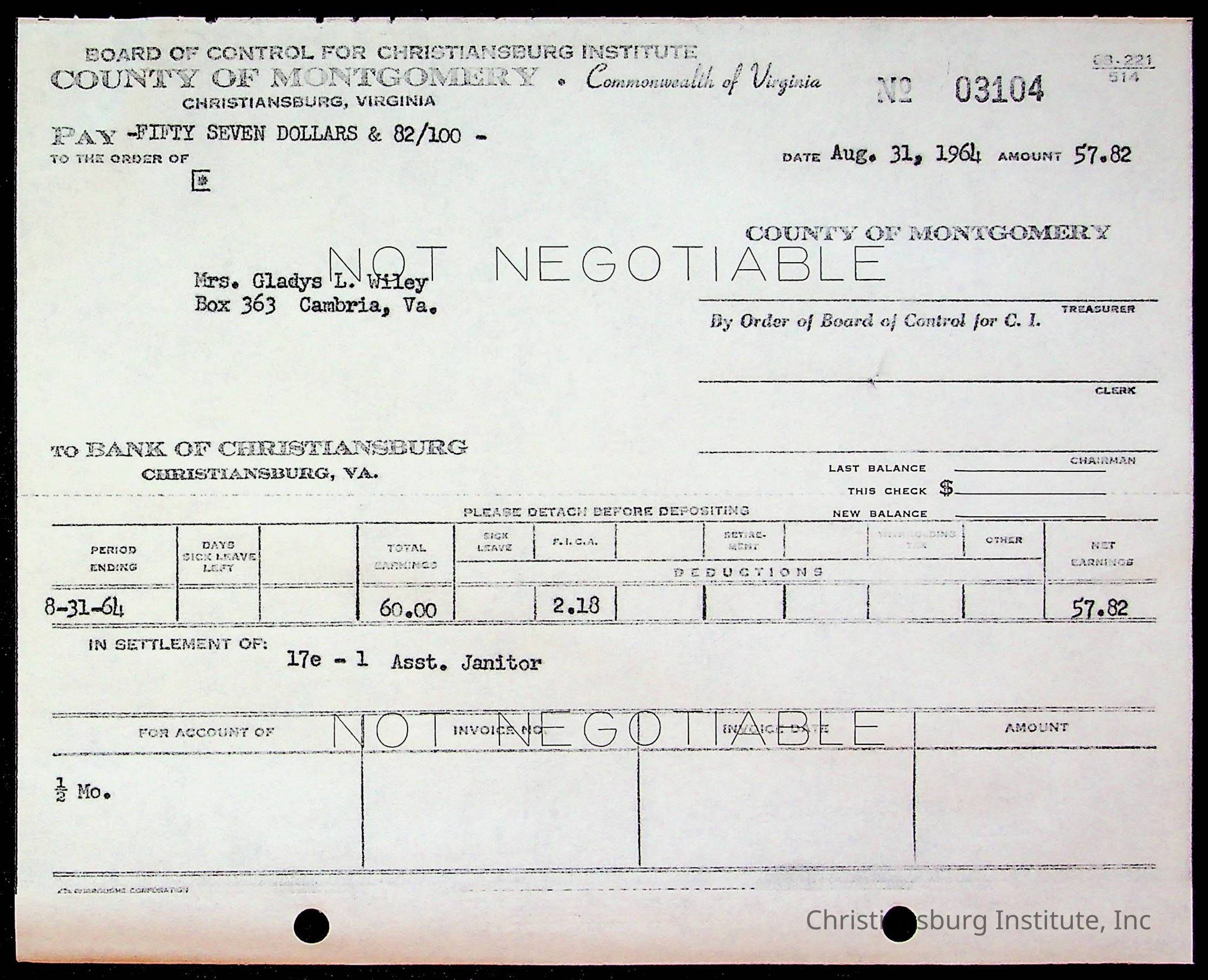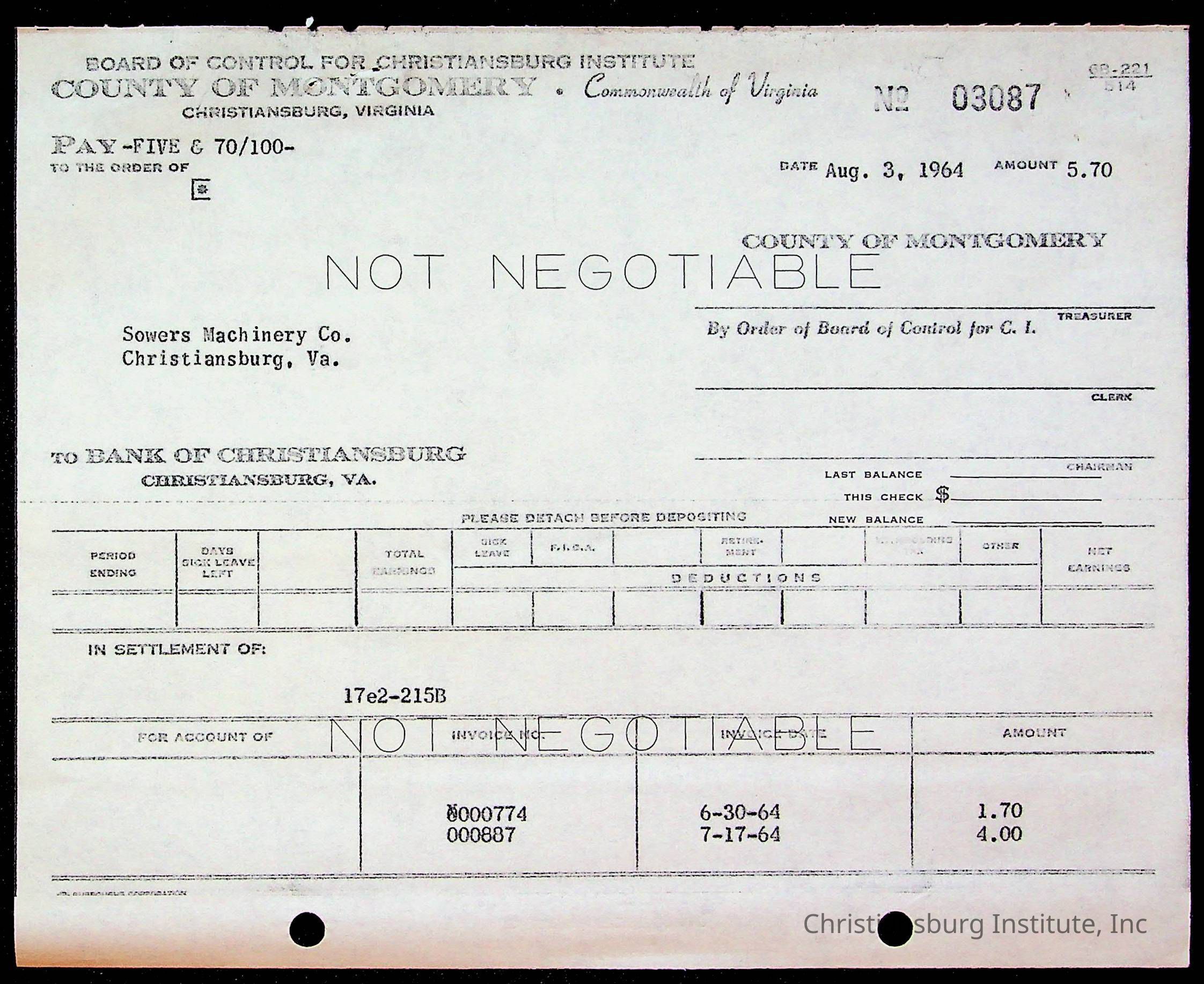 An archive of bills and receipts for the Board of Control of Christiansburg Institute and the Montgomery County School Board, circa 1960s.