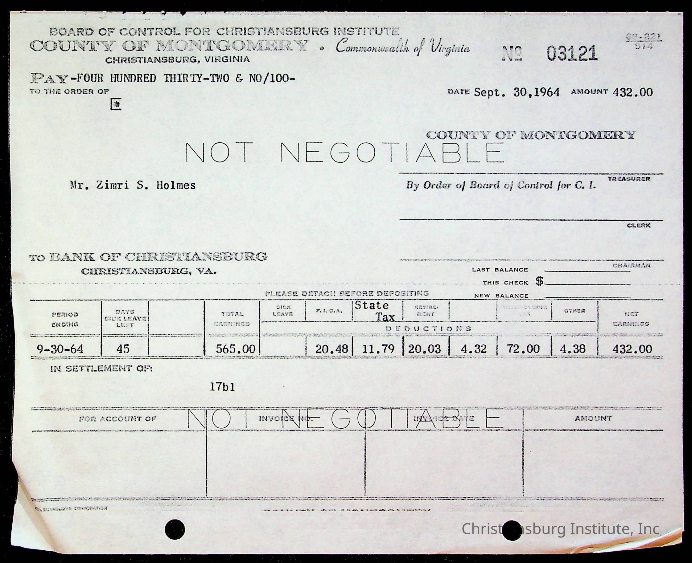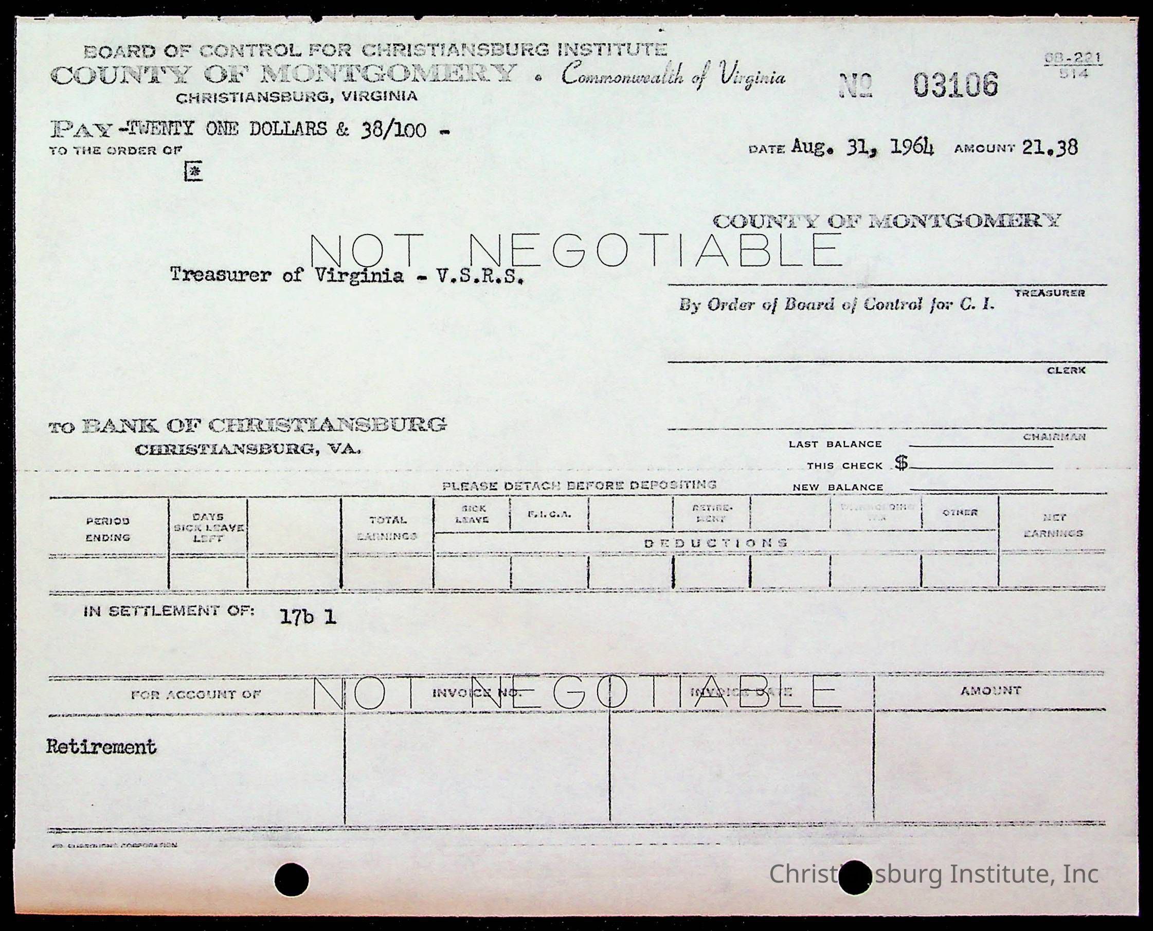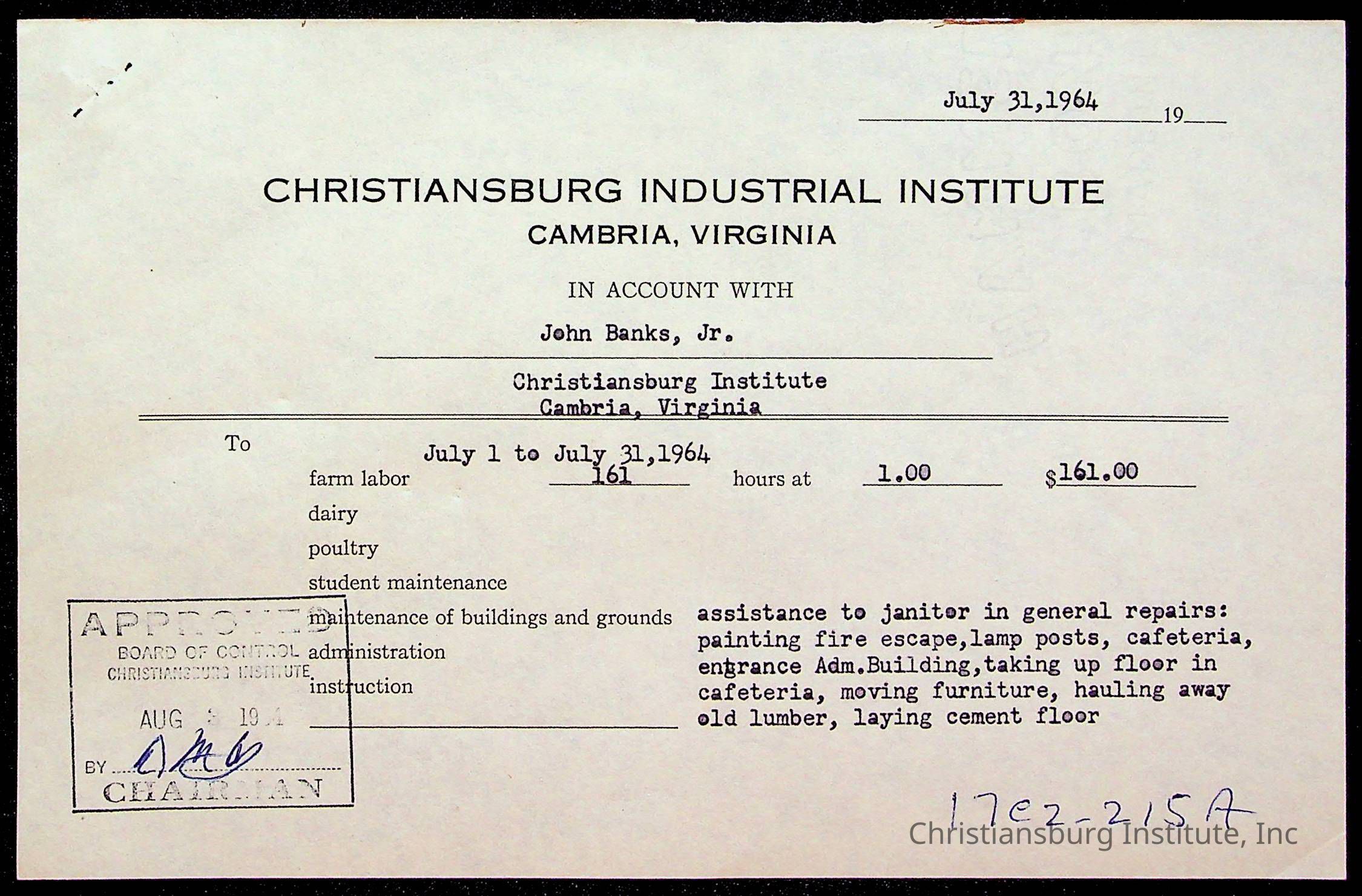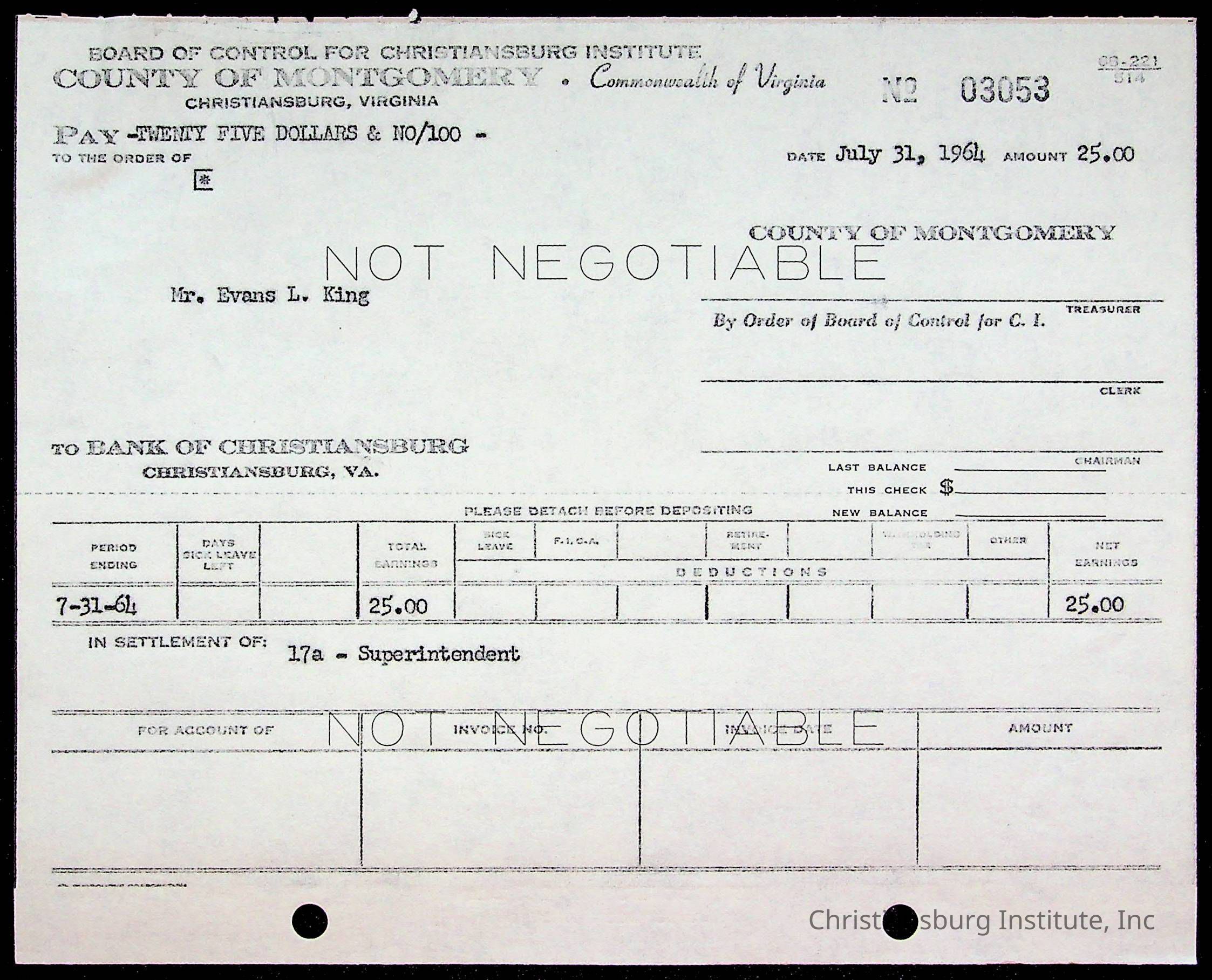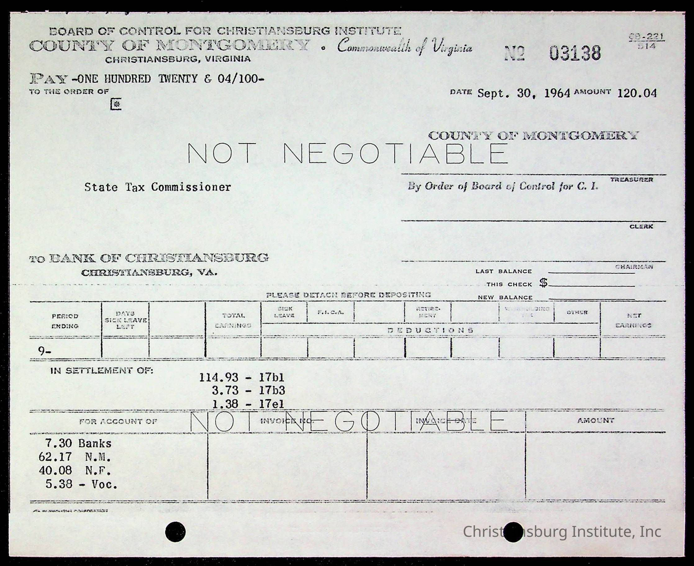 An archive of bills and receipts for the Board of Control of Christiansburg Institute and the Montgomery County School Board, circa 1960s.
