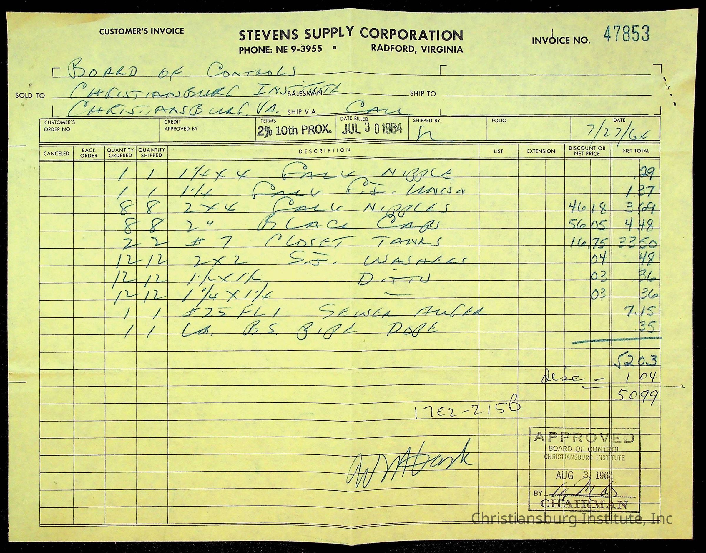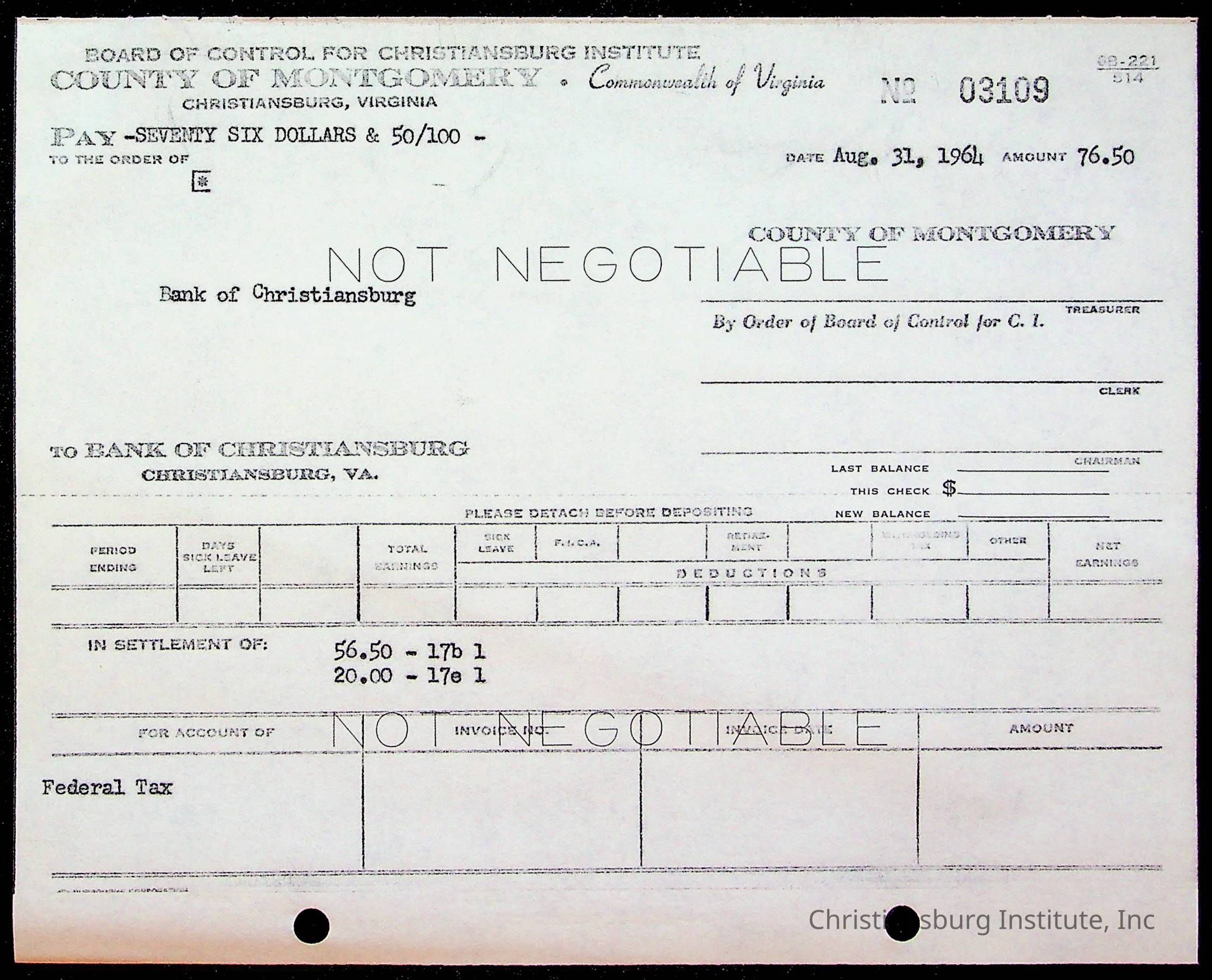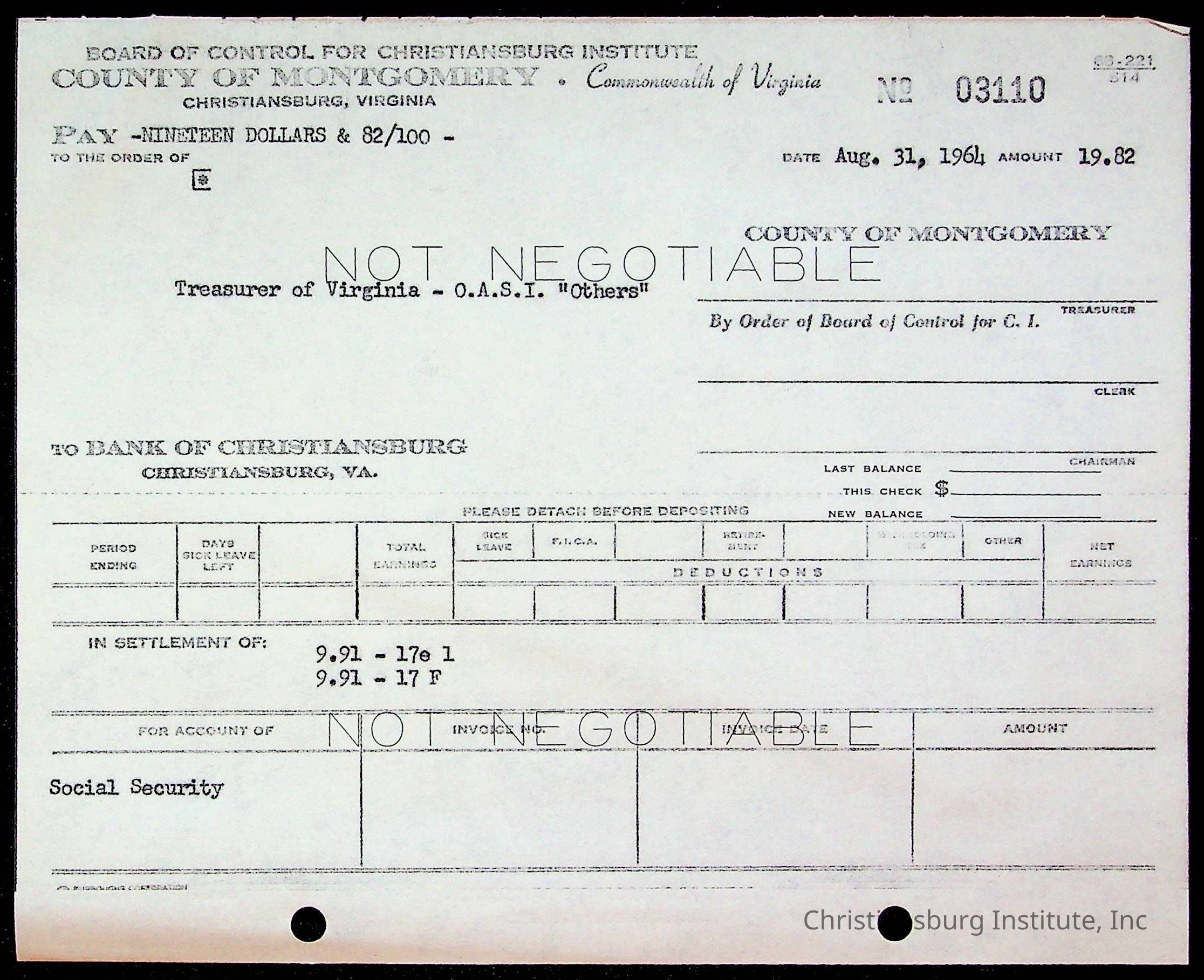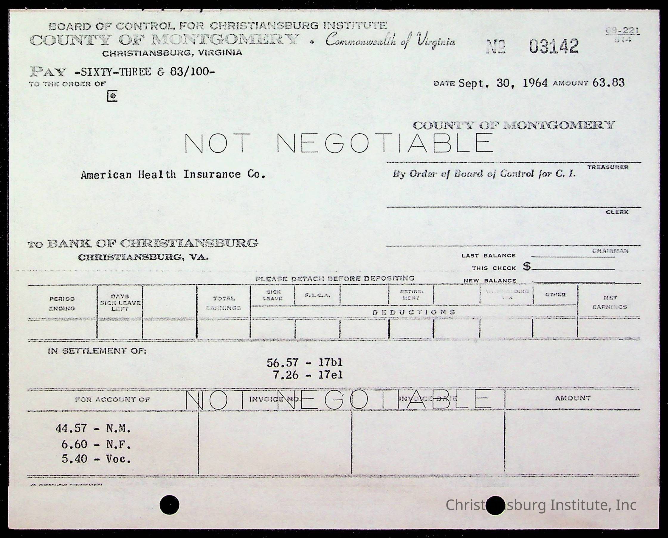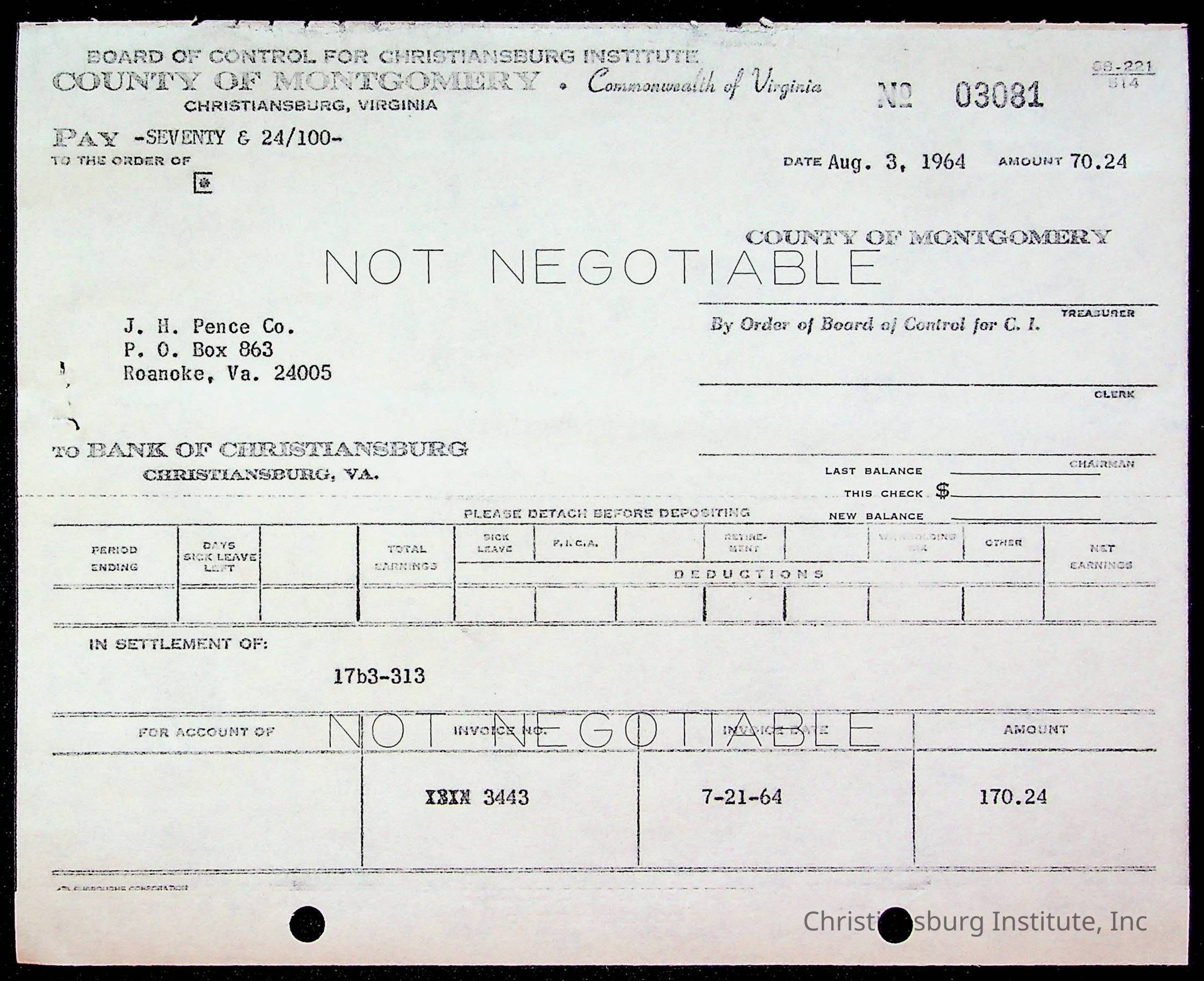 An archive of bills and receipts for the Board of Control of Christiansburg Institute and the Montgomery County School Board, circa 1960s.