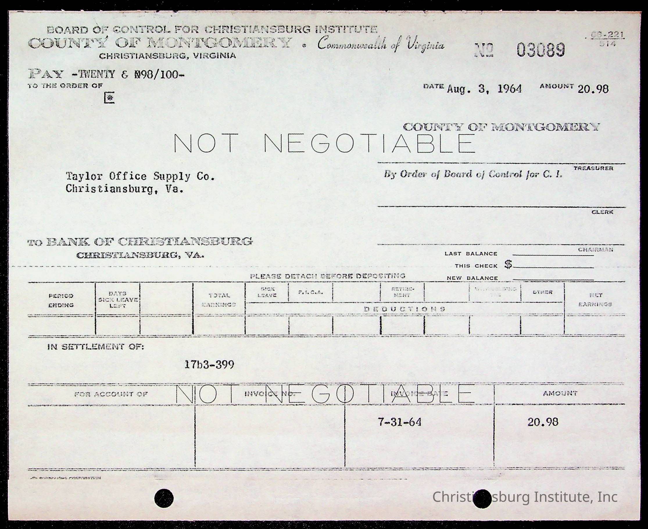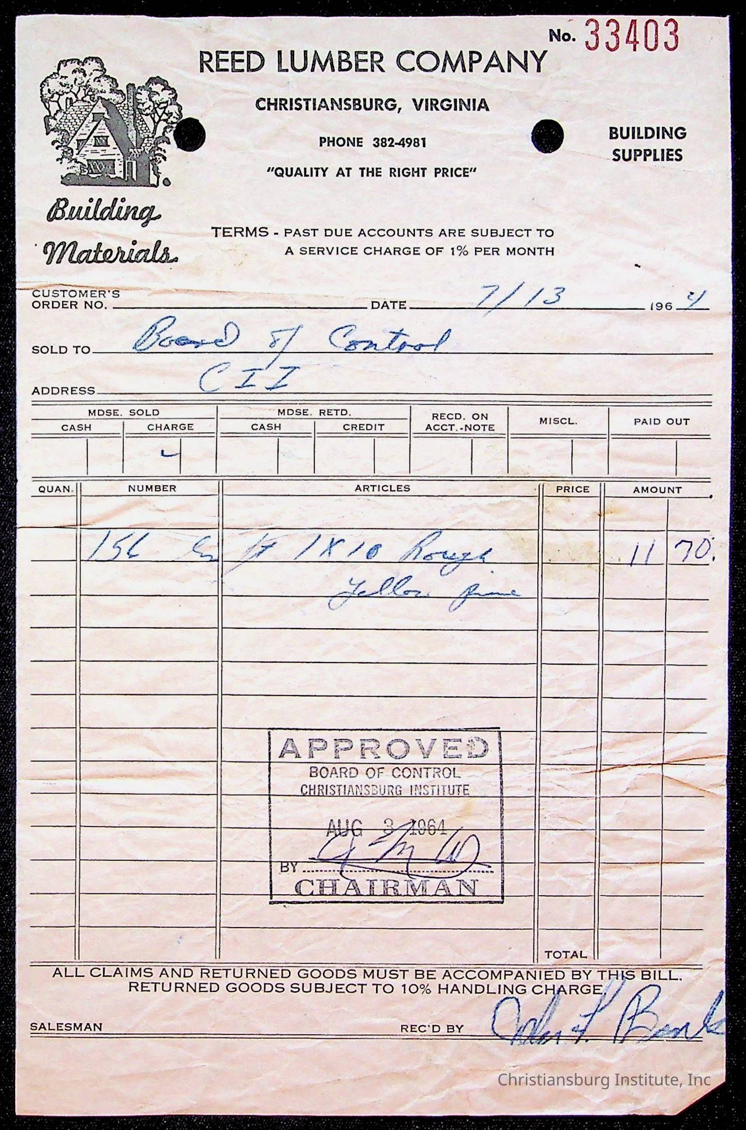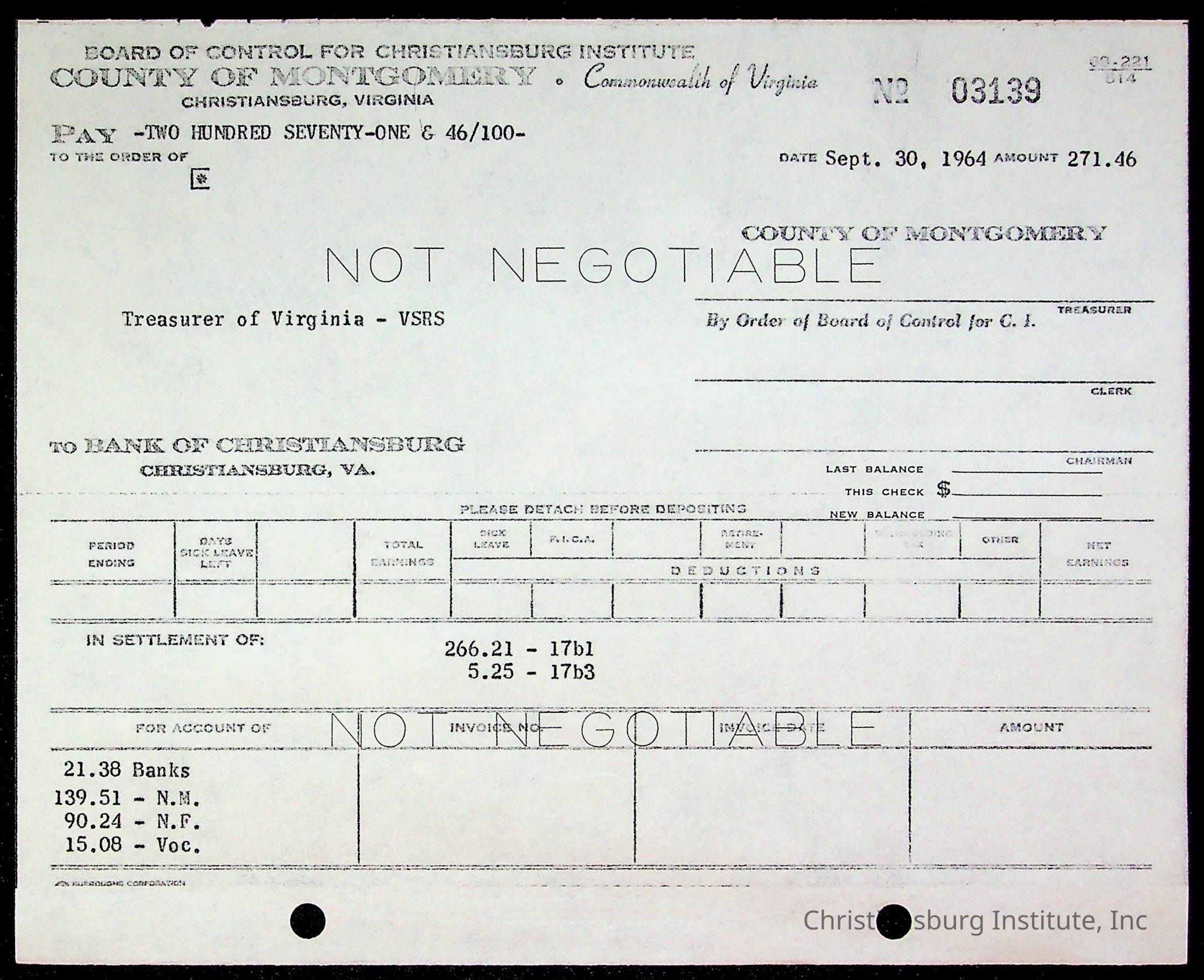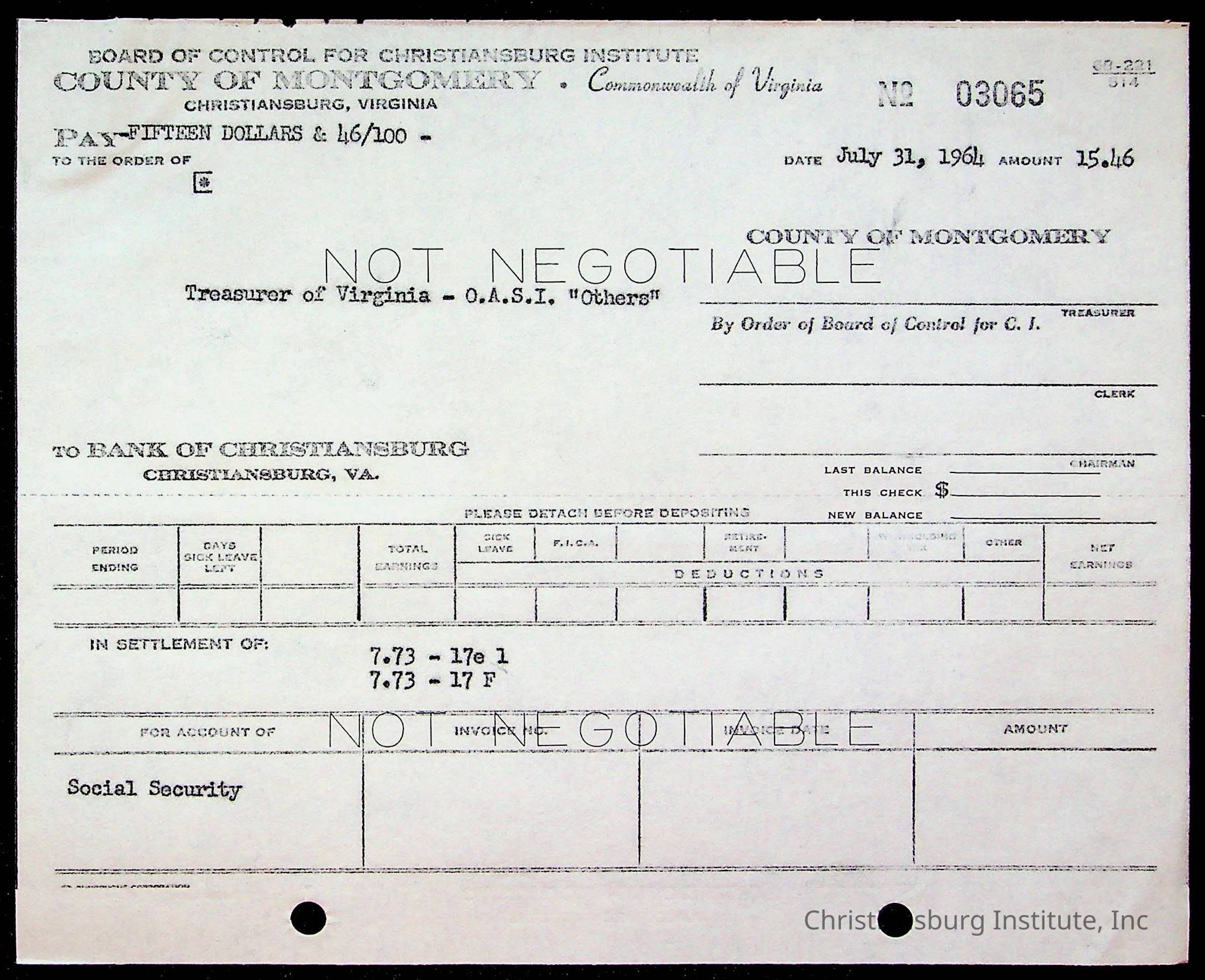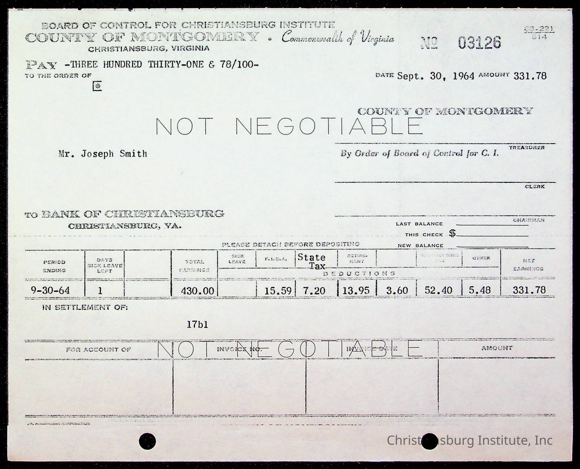 An archive of bills and receipts for the Board of Control of Christiansburg Institute and the Montgomery County School Board, circa 1960s.