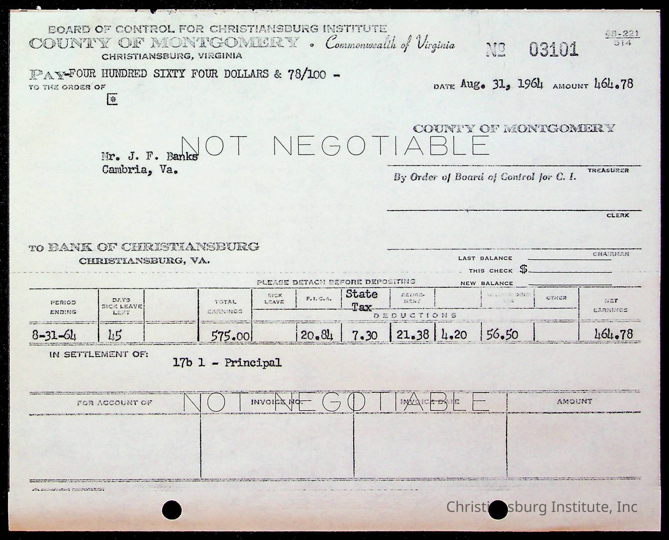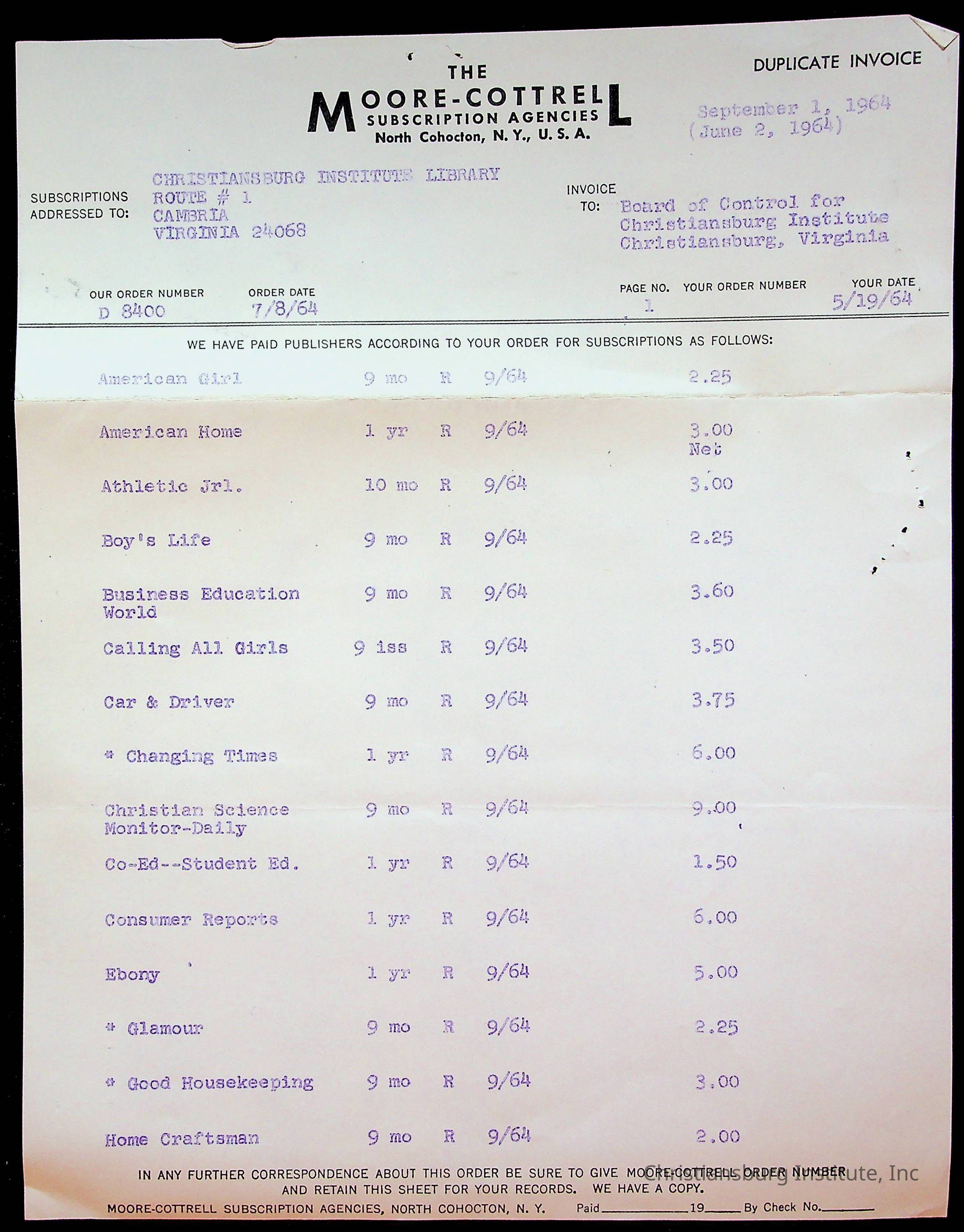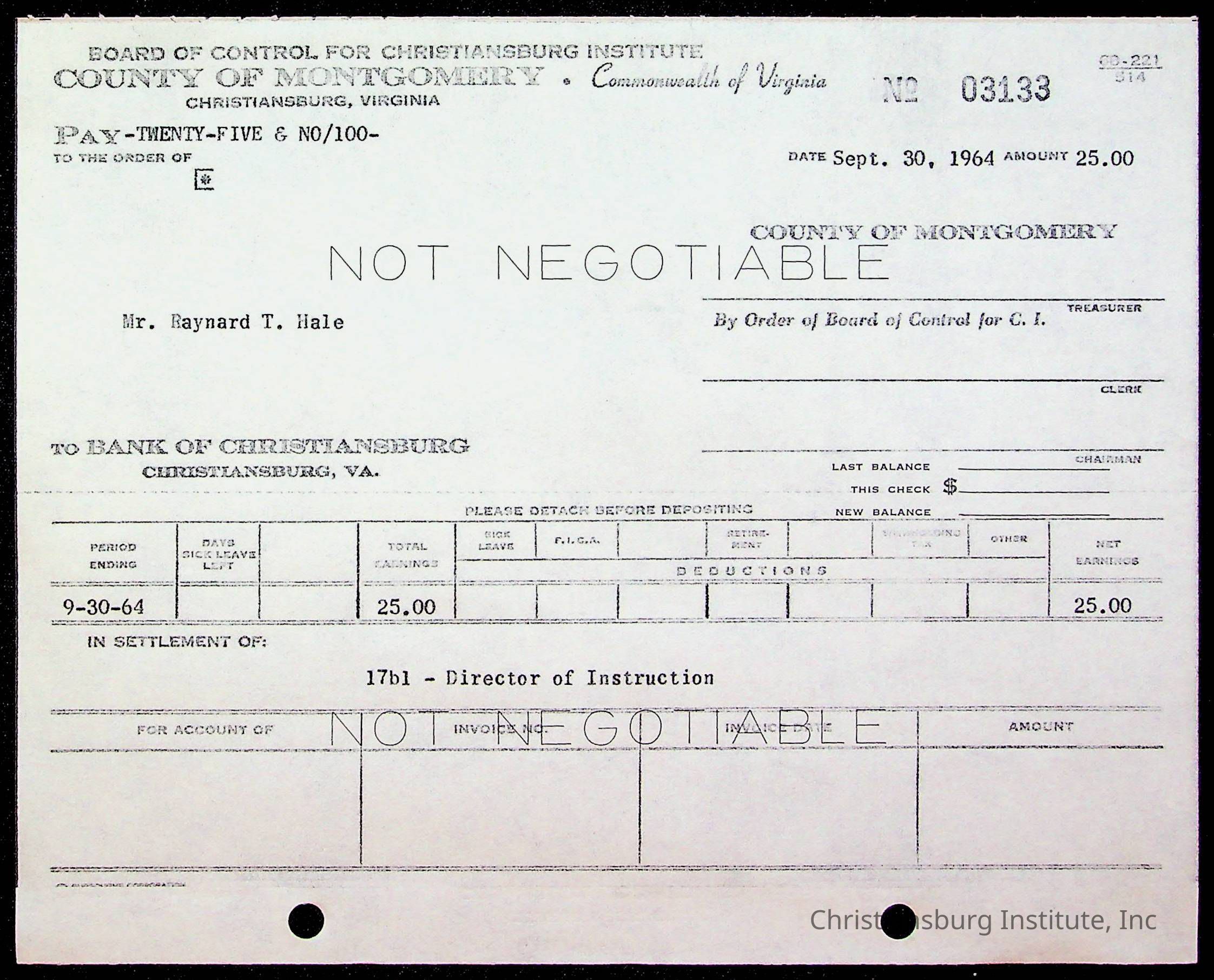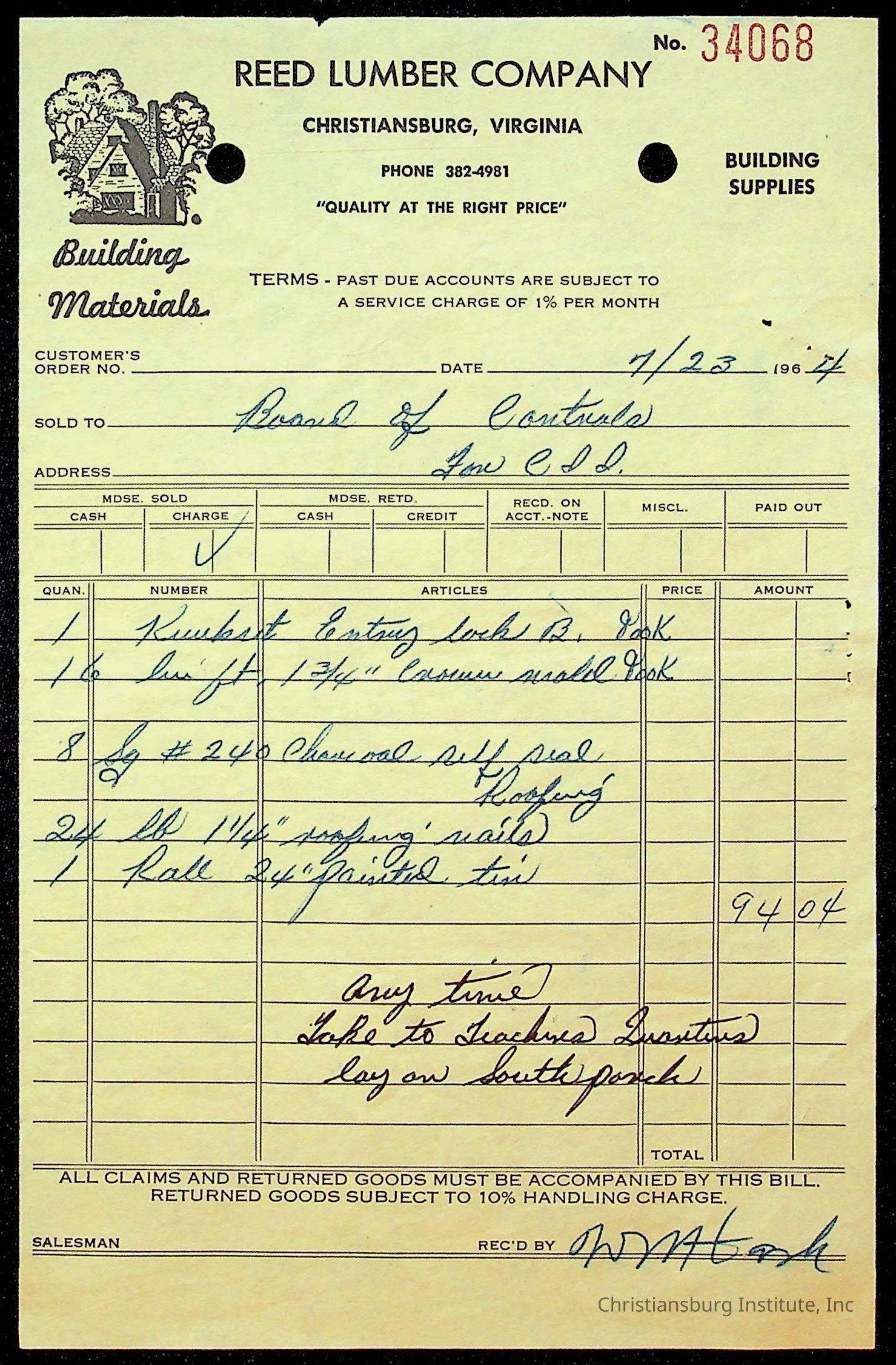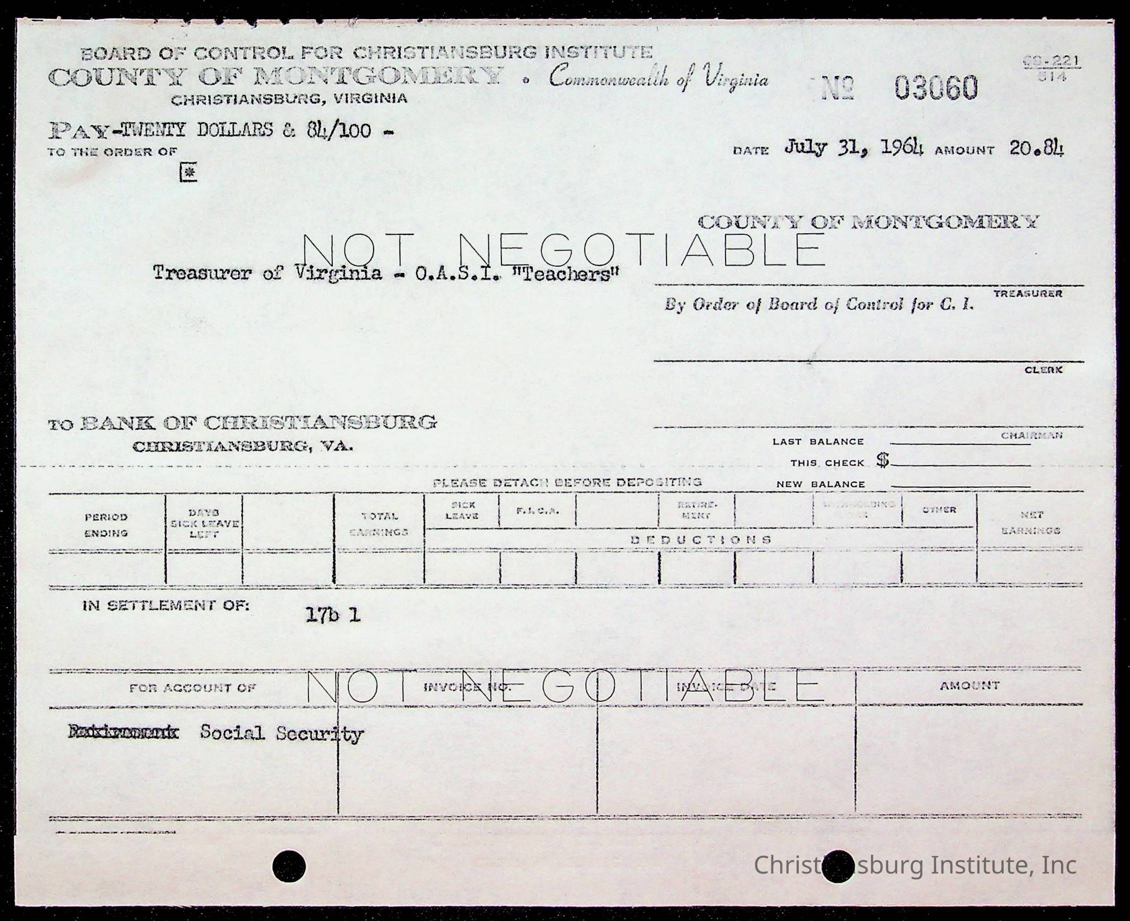 An archive of bills and receipts for the Board of Control of Christiansburg Institute and the Montgomery County School Board, circa 1960s.