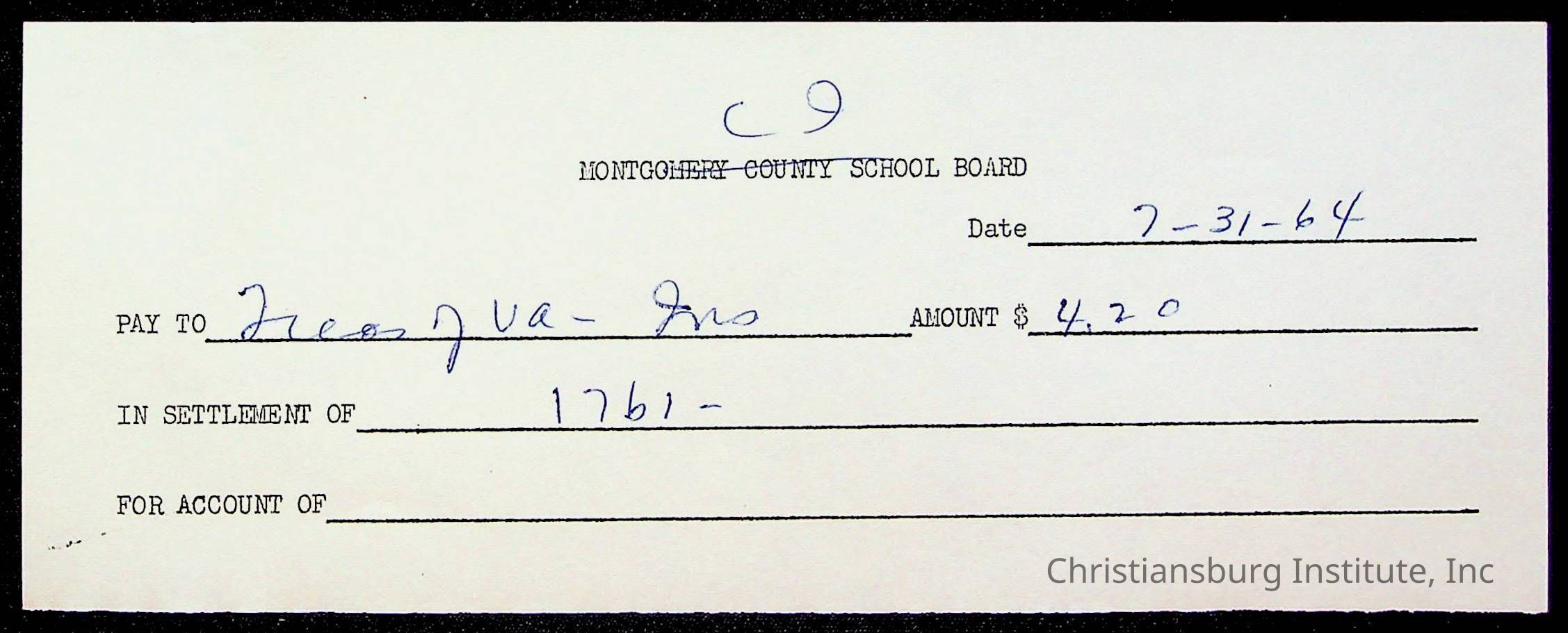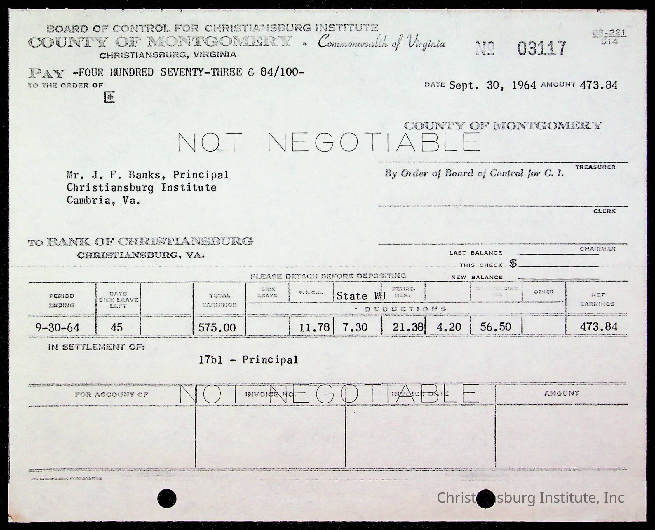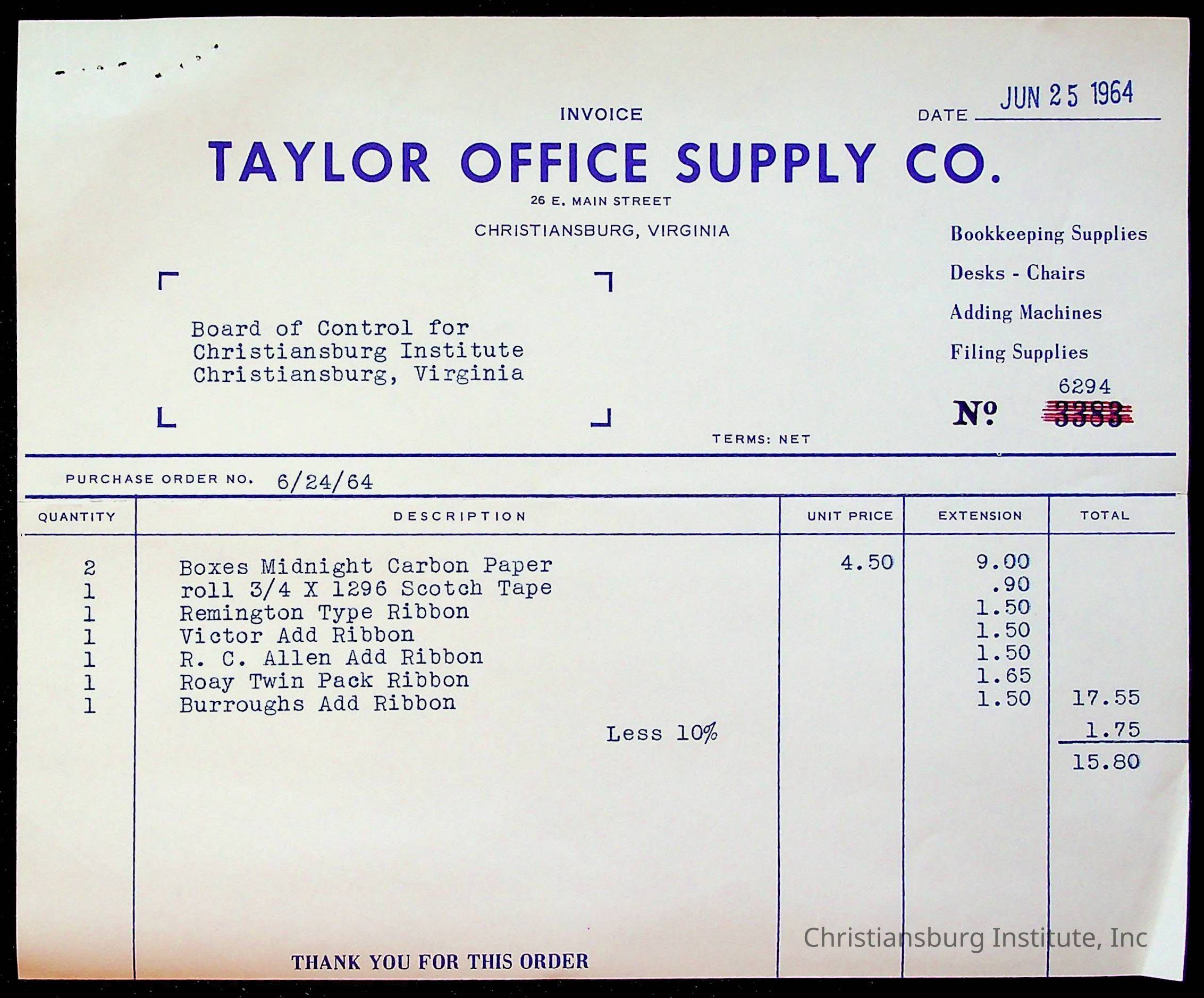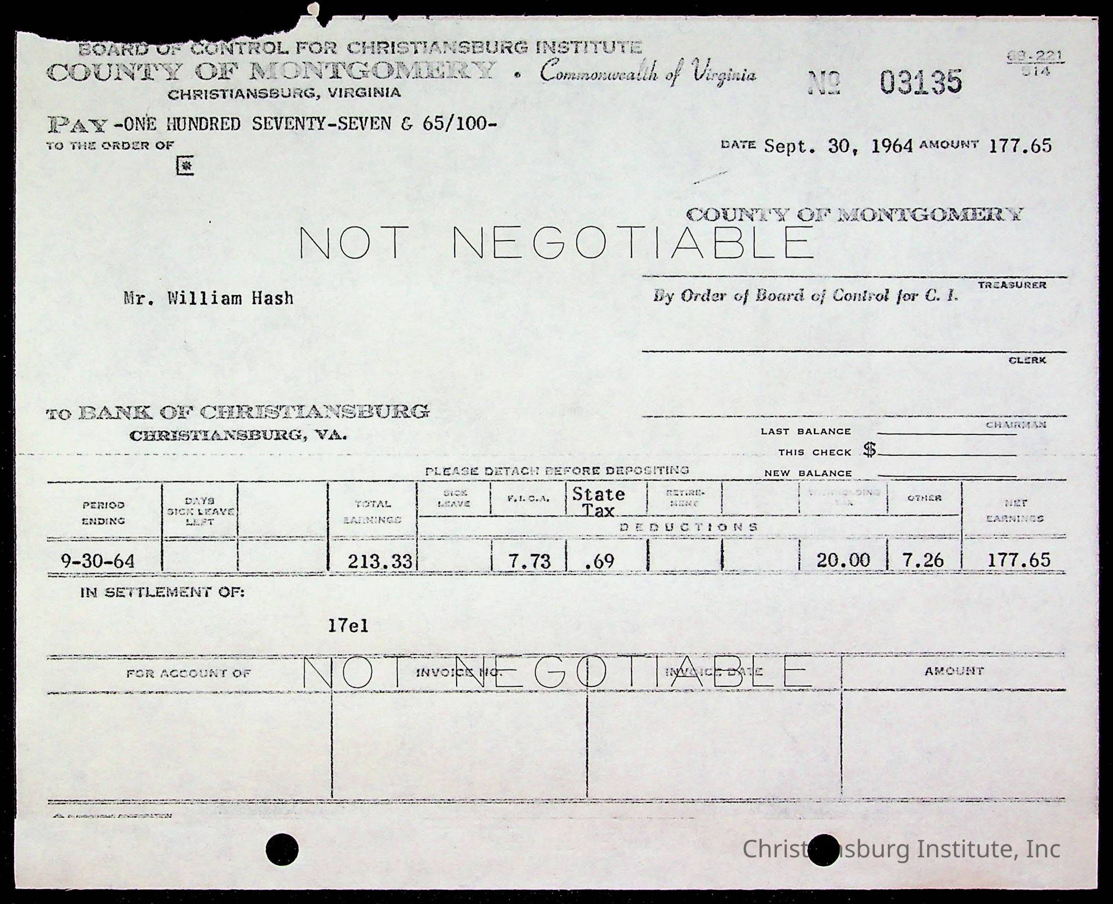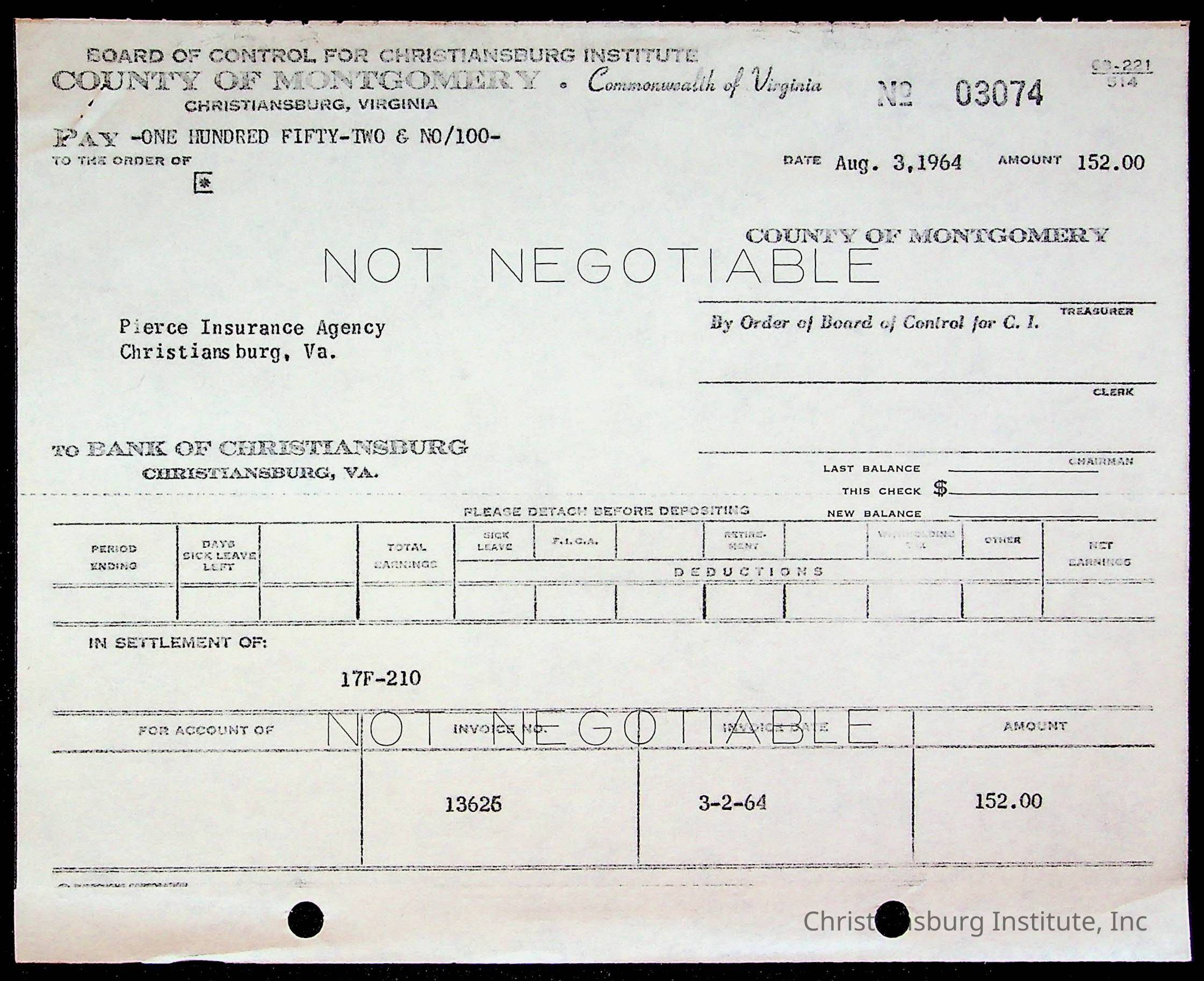 An archive of bills and receipts for the Board of Control of Christiansburg Institute and the Montgomery County School Board, circa 1960s.