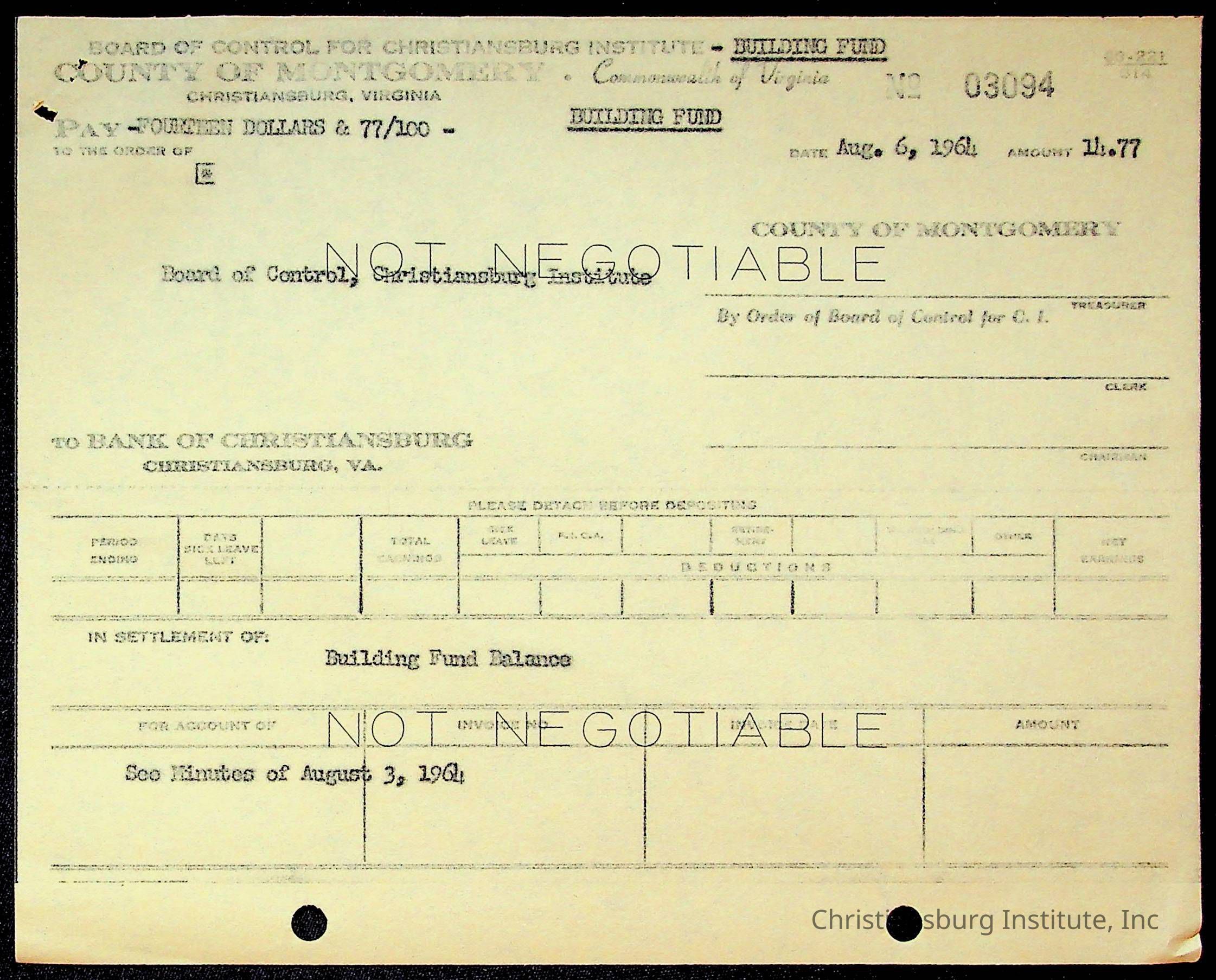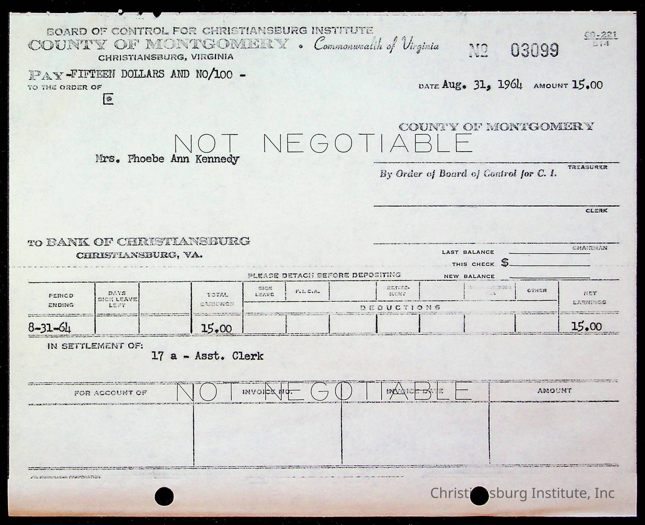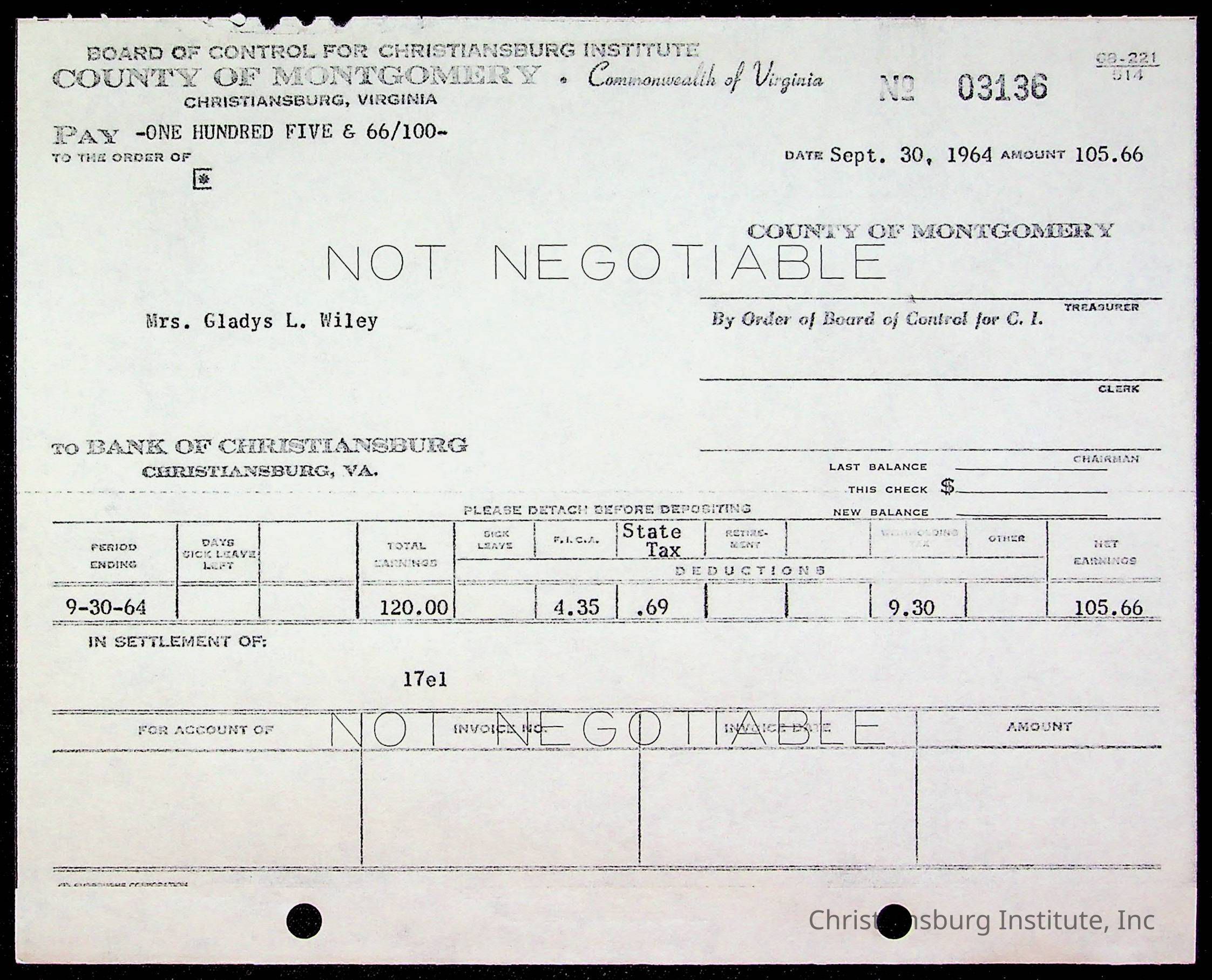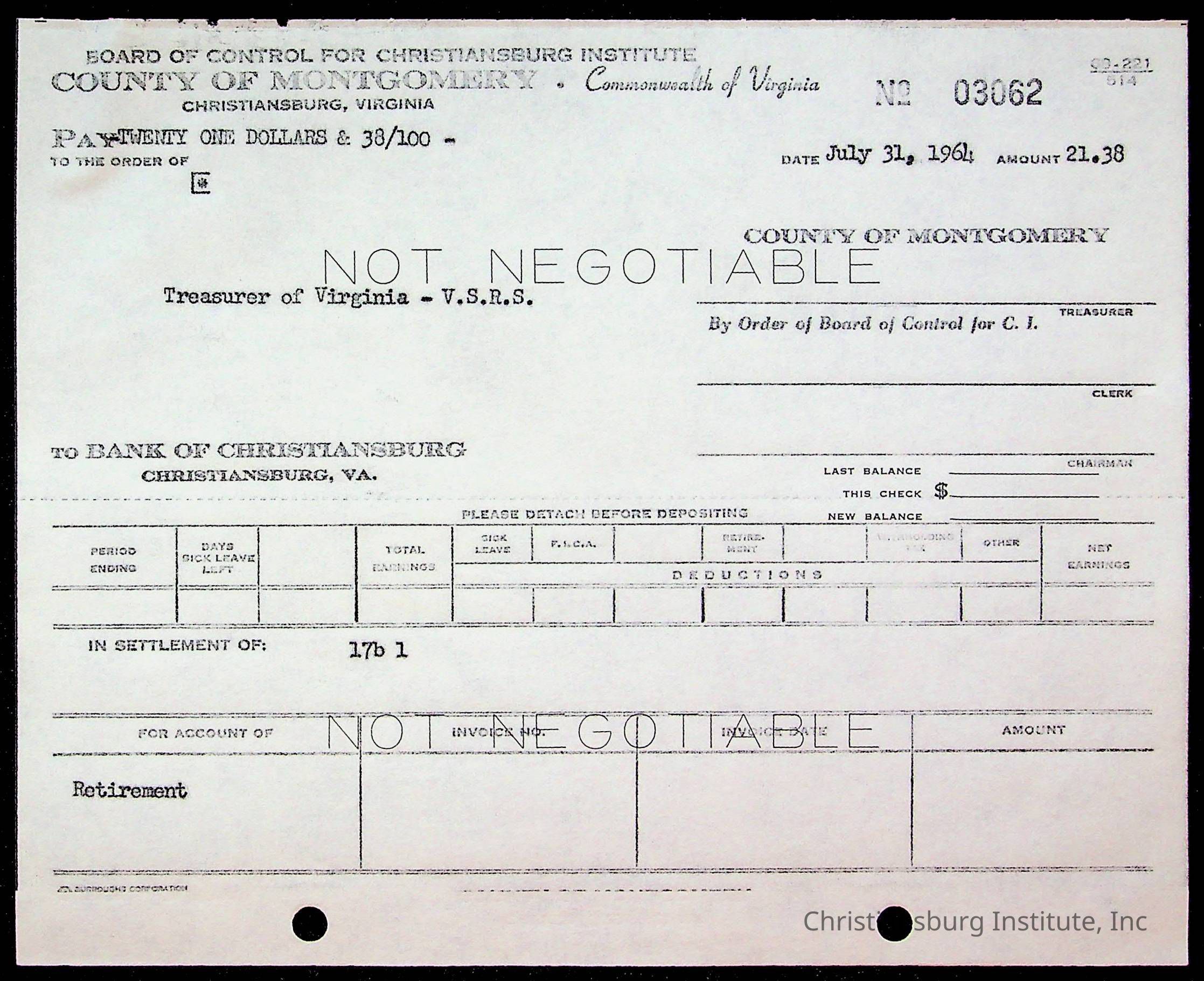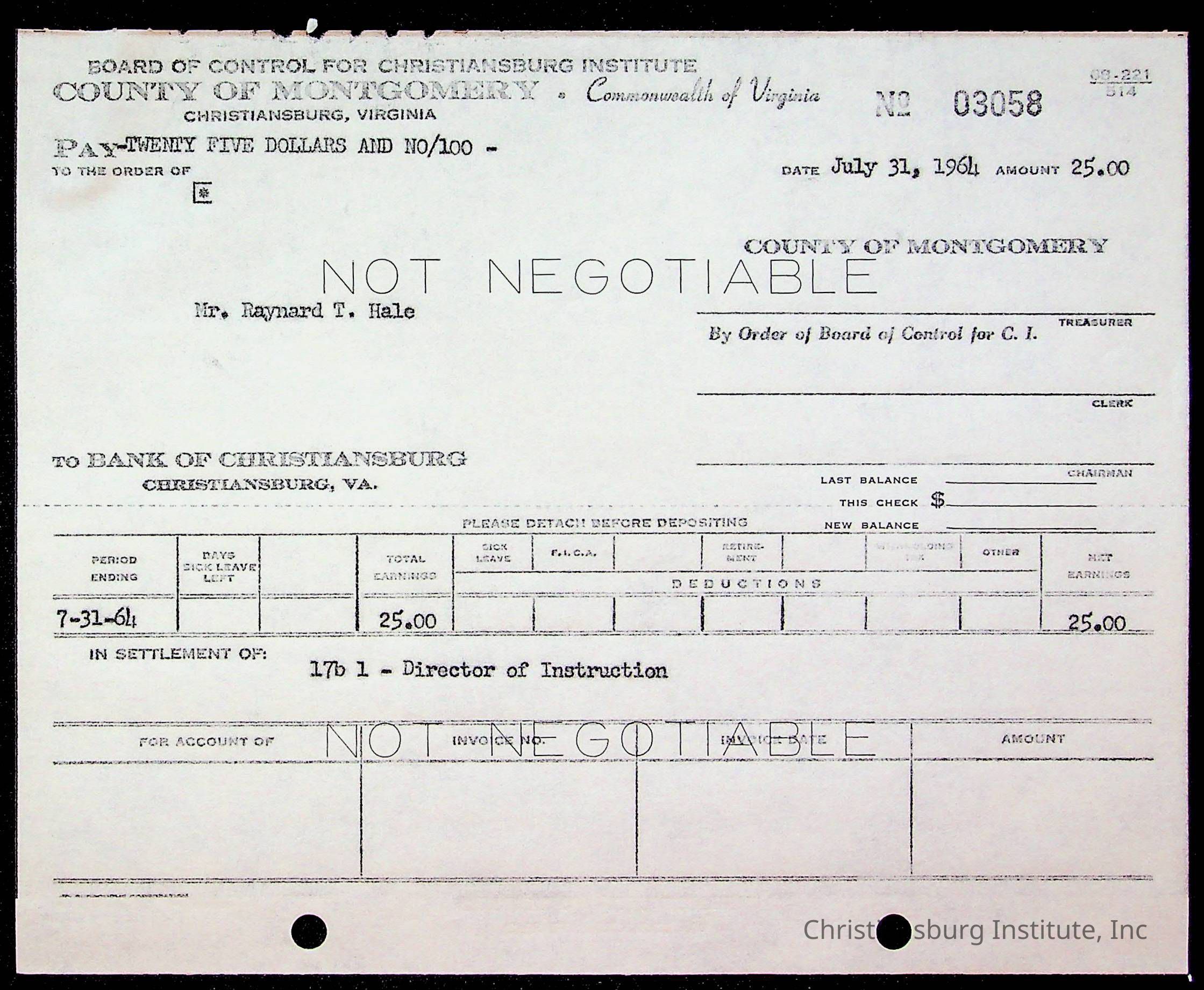 An archive of bills and receipts for the Board of Control of Christiansburg Institute and the Montgomery County School Board, circa 1960s.