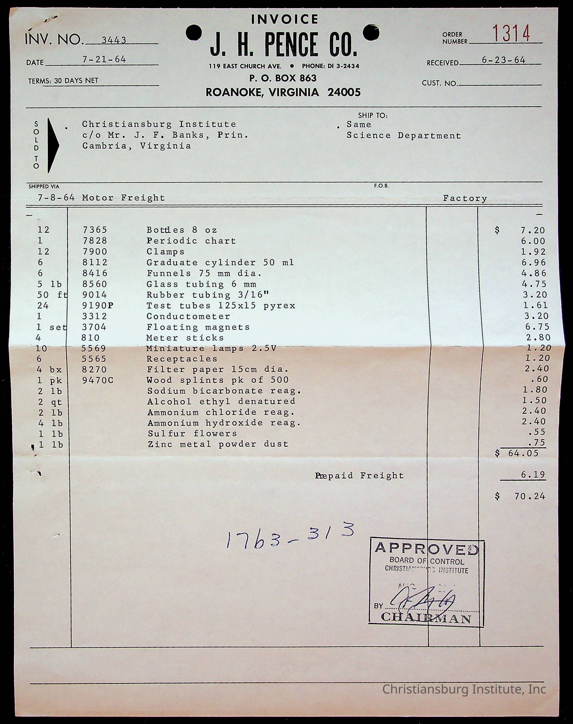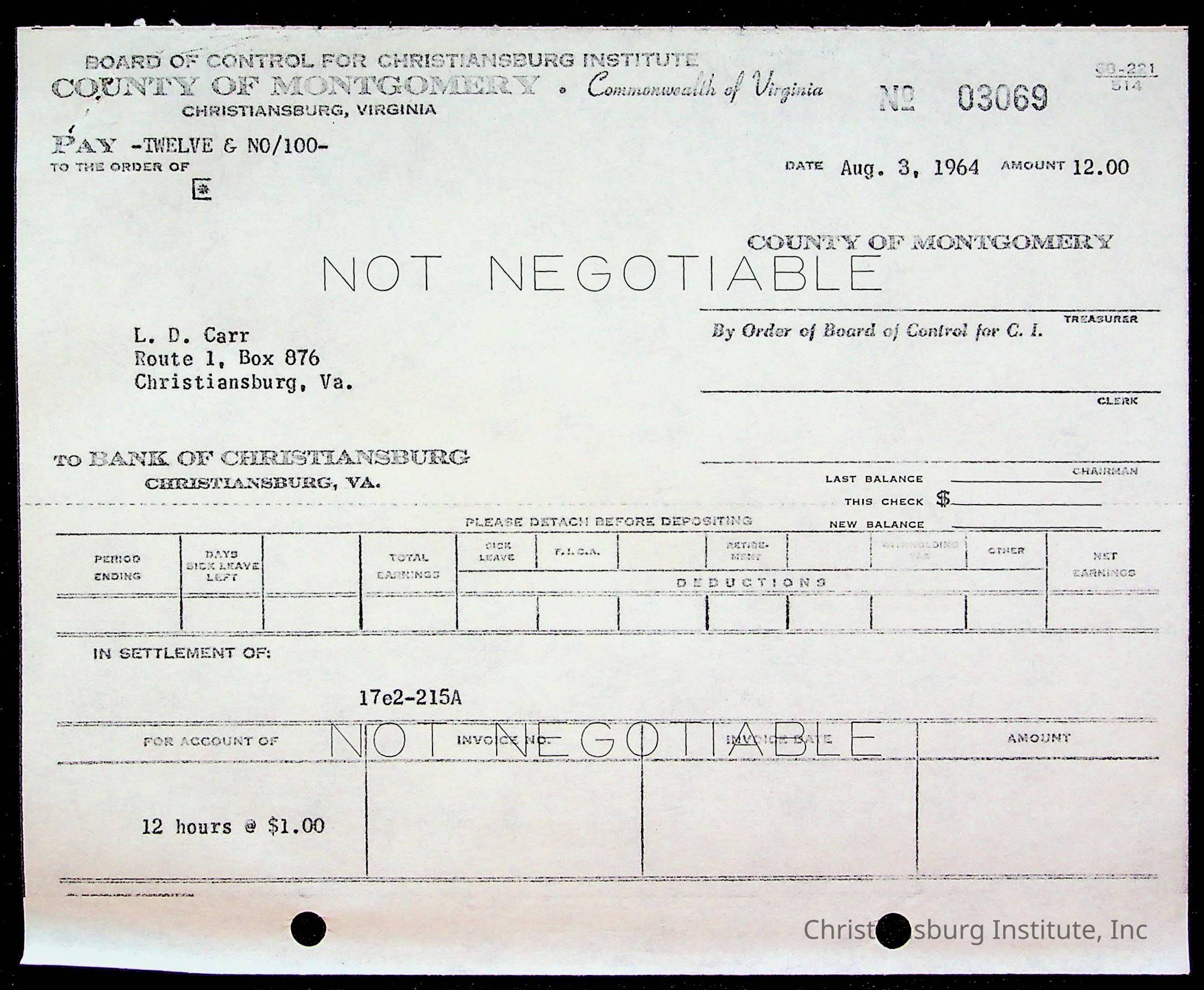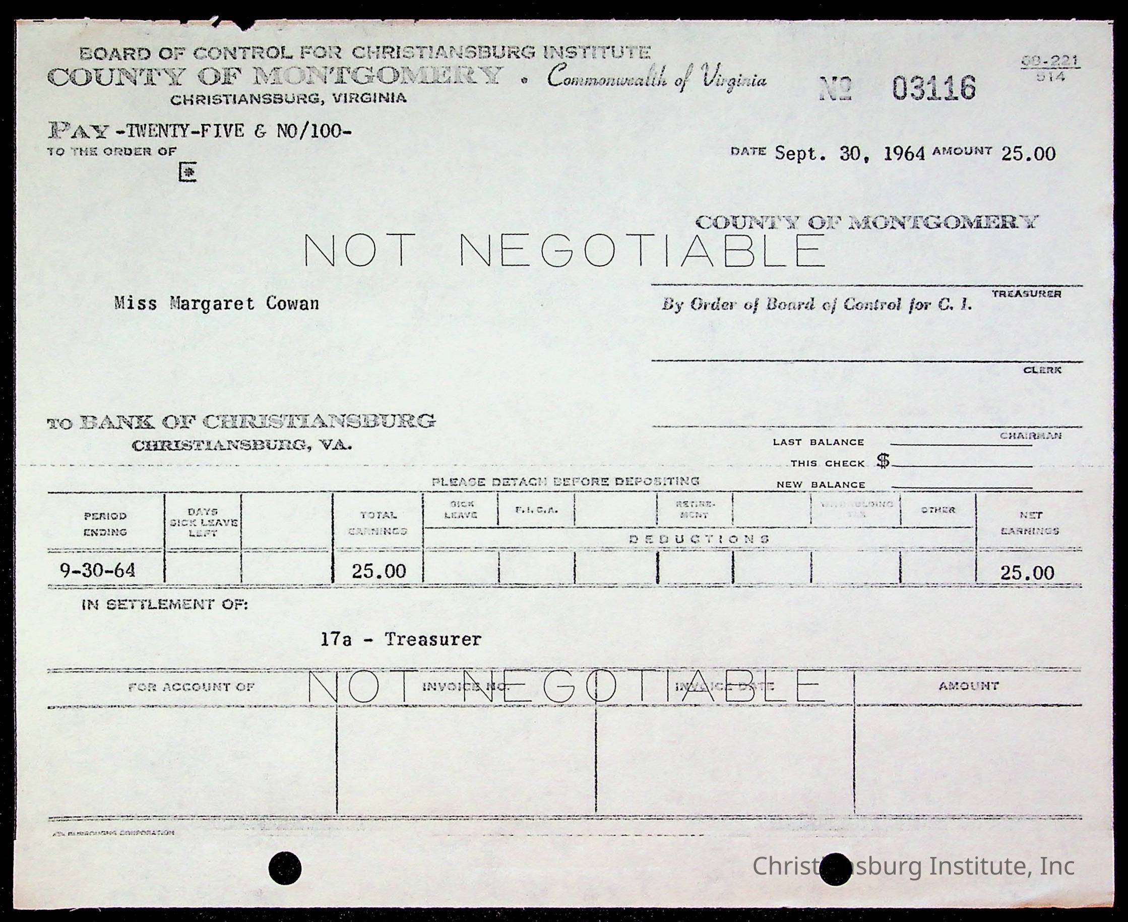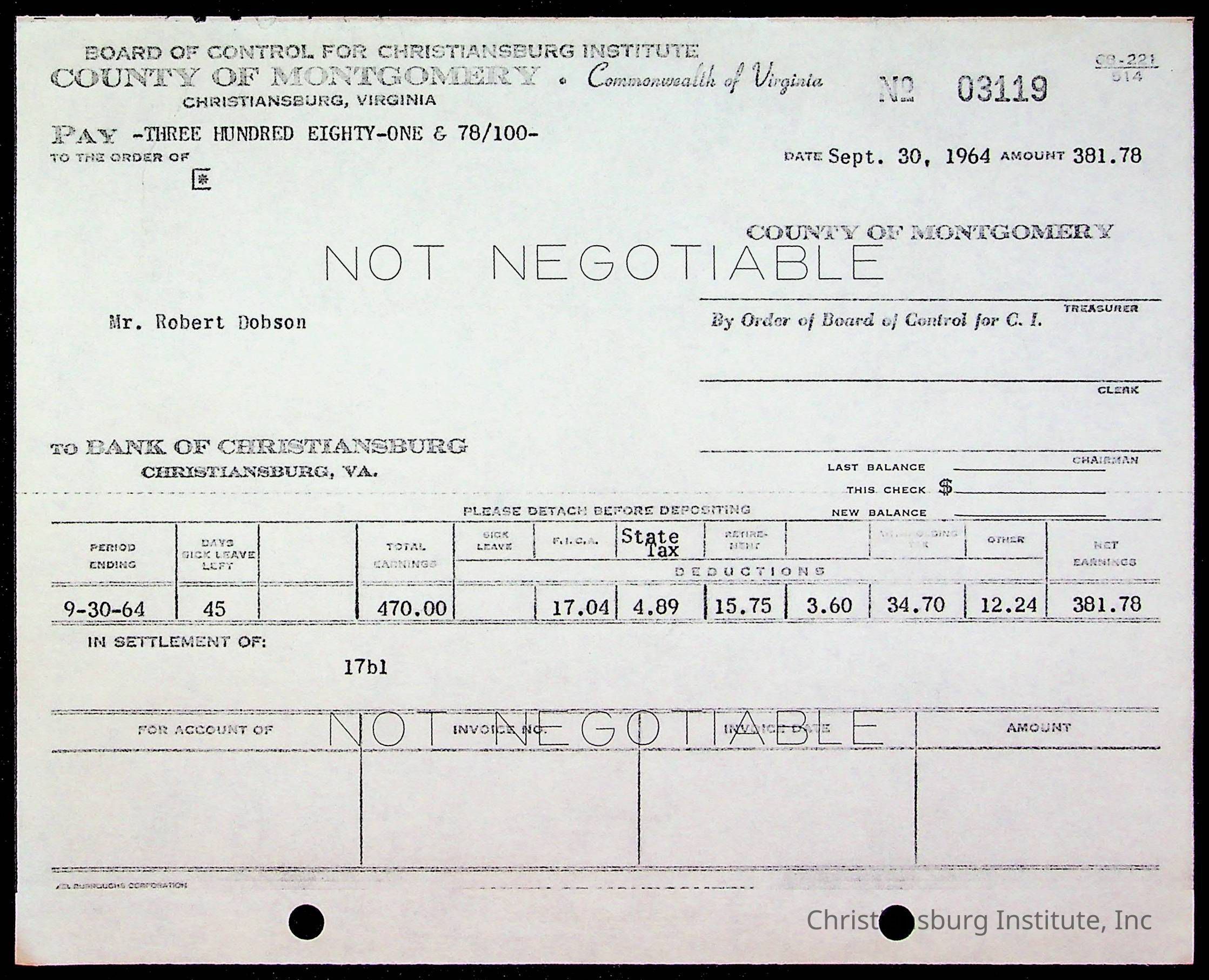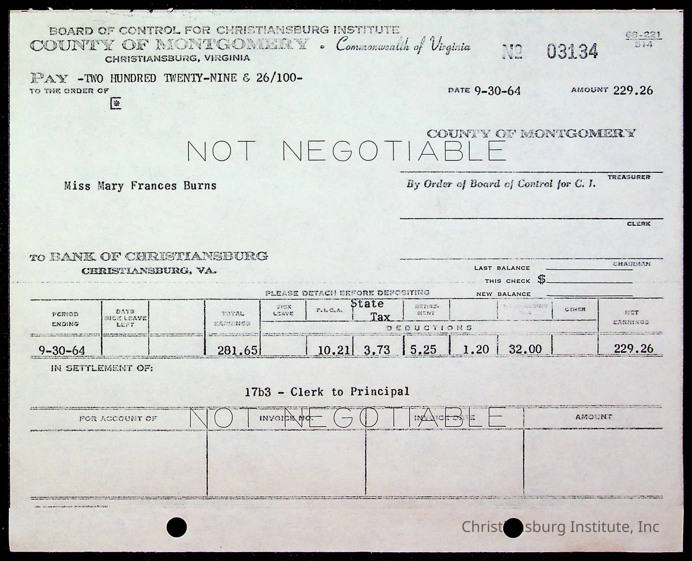 An archive of bills and receipts for the Board of Control of Christiansburg Institute and the Montgomery County School Board, circa 1960s.