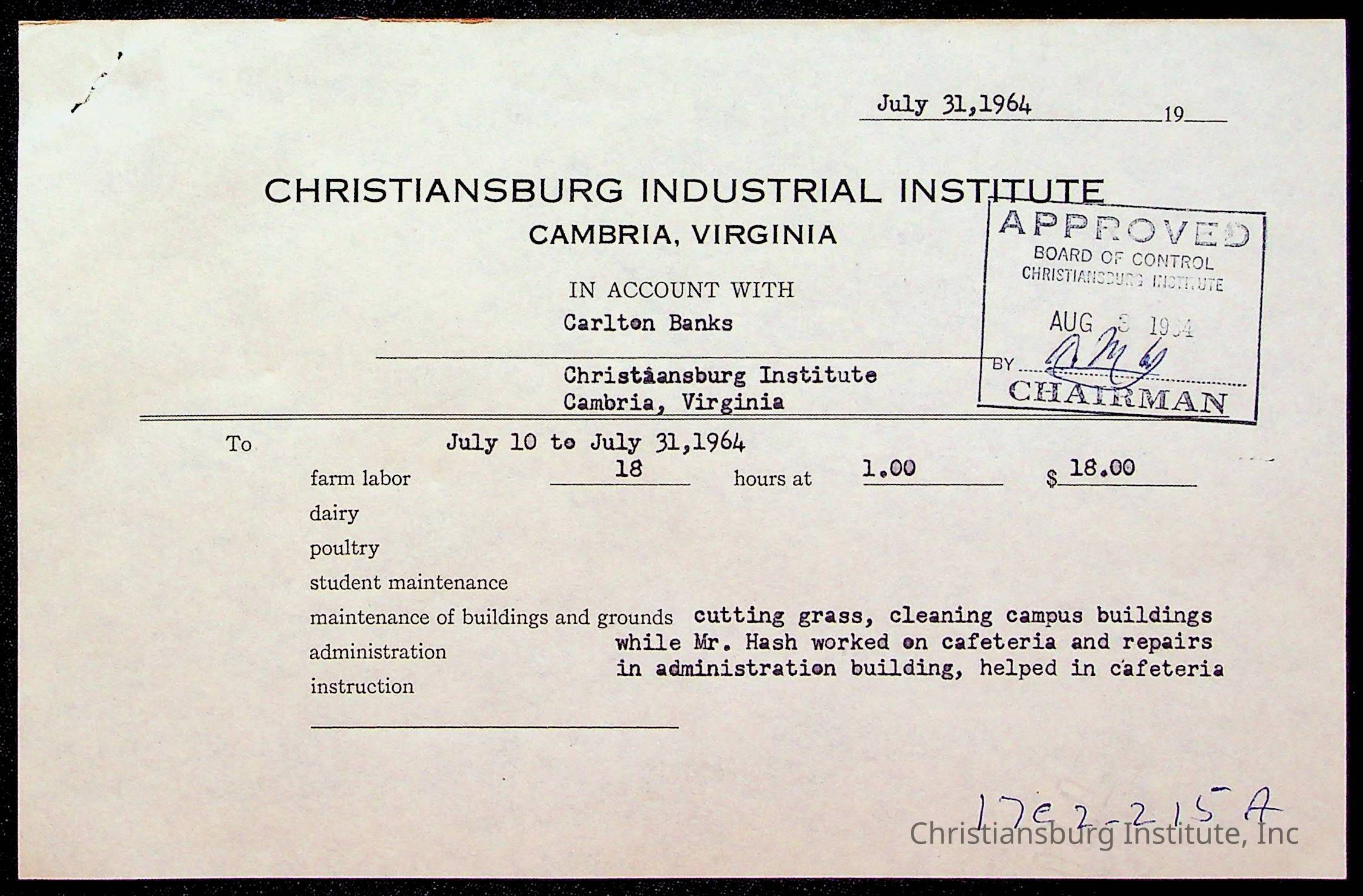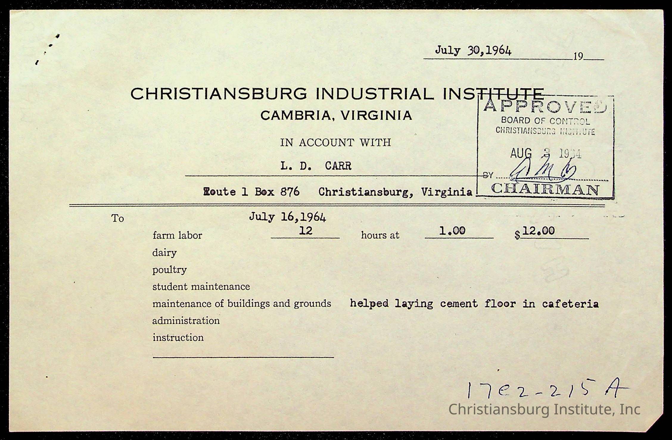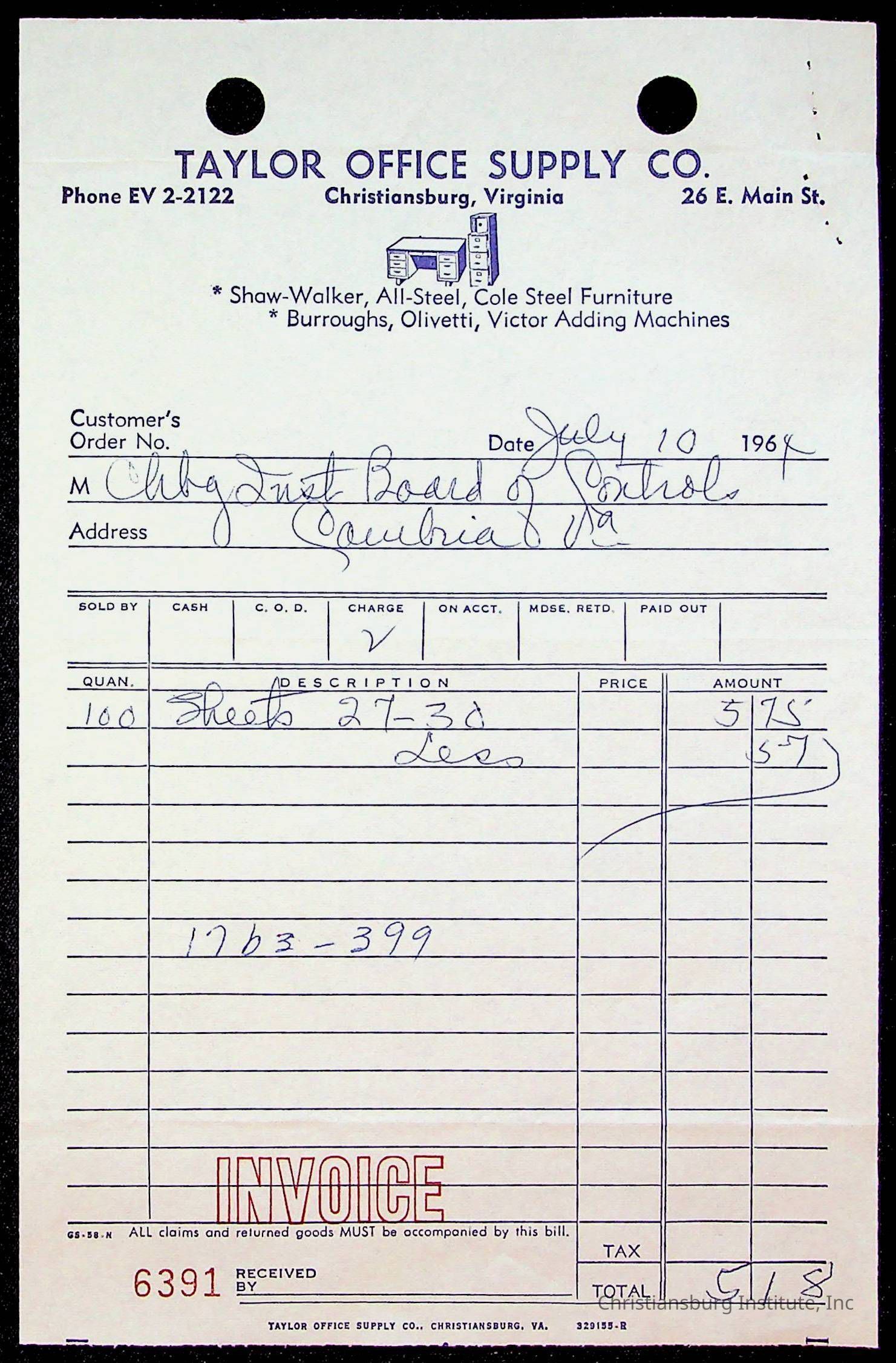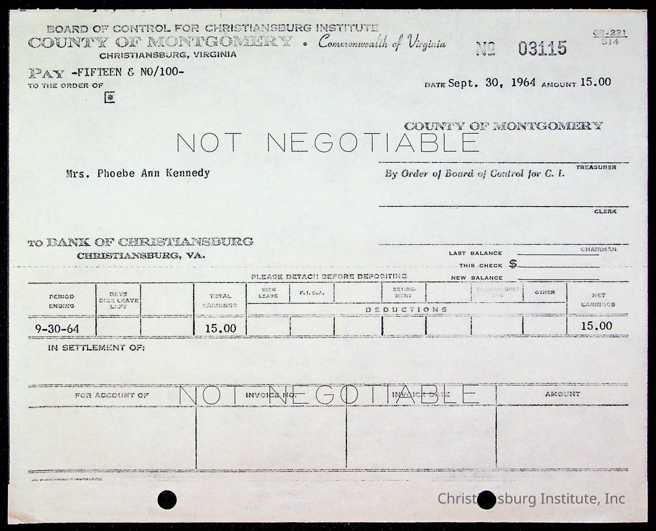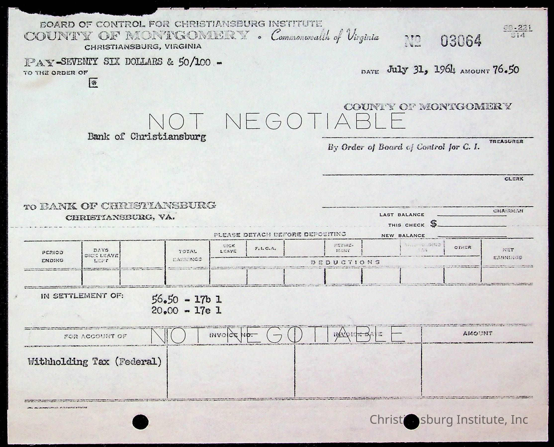An archive of bills and receipts for the Board of Control of Christiansburg Institute and the Montgomery County School Board, circa 1960s.