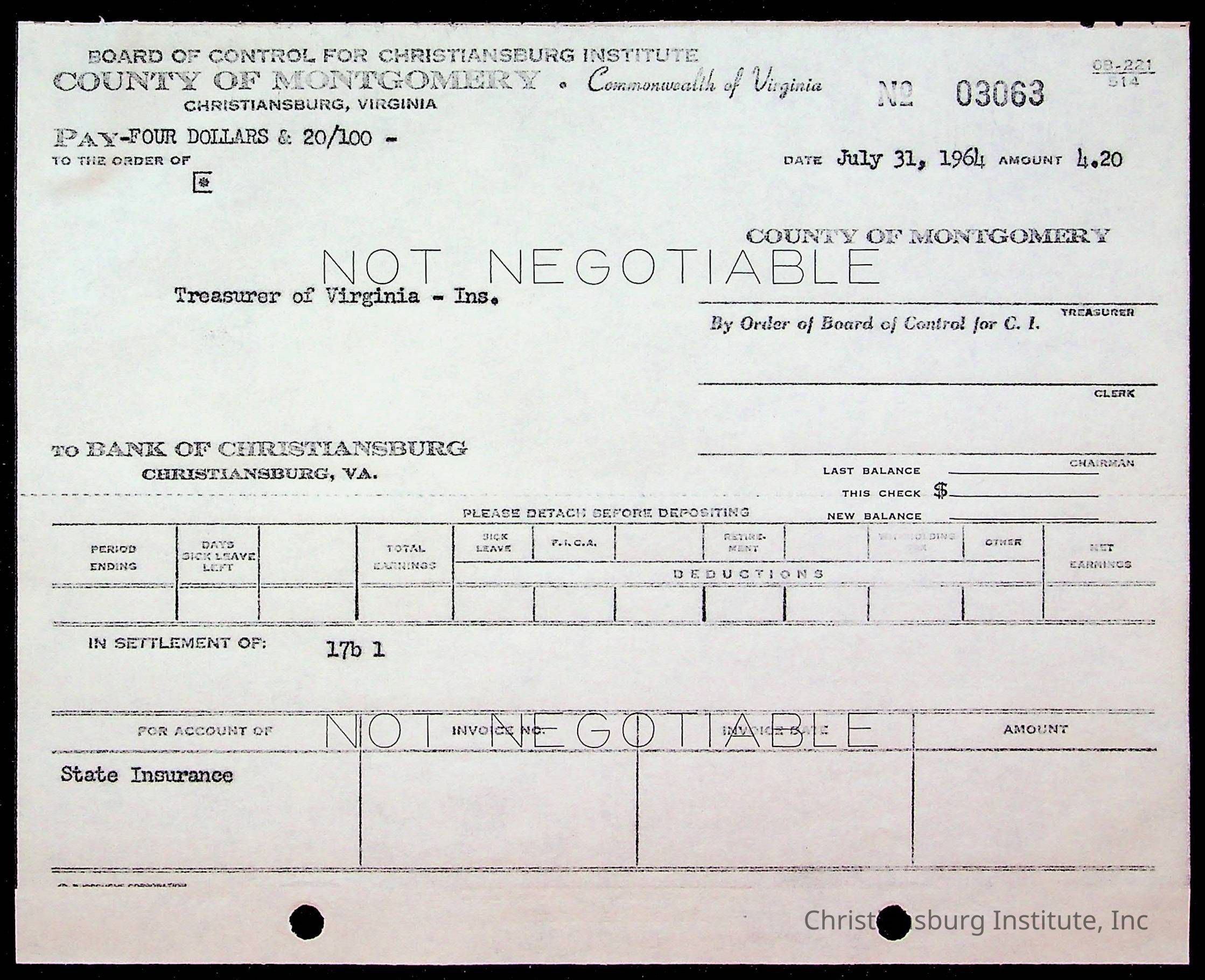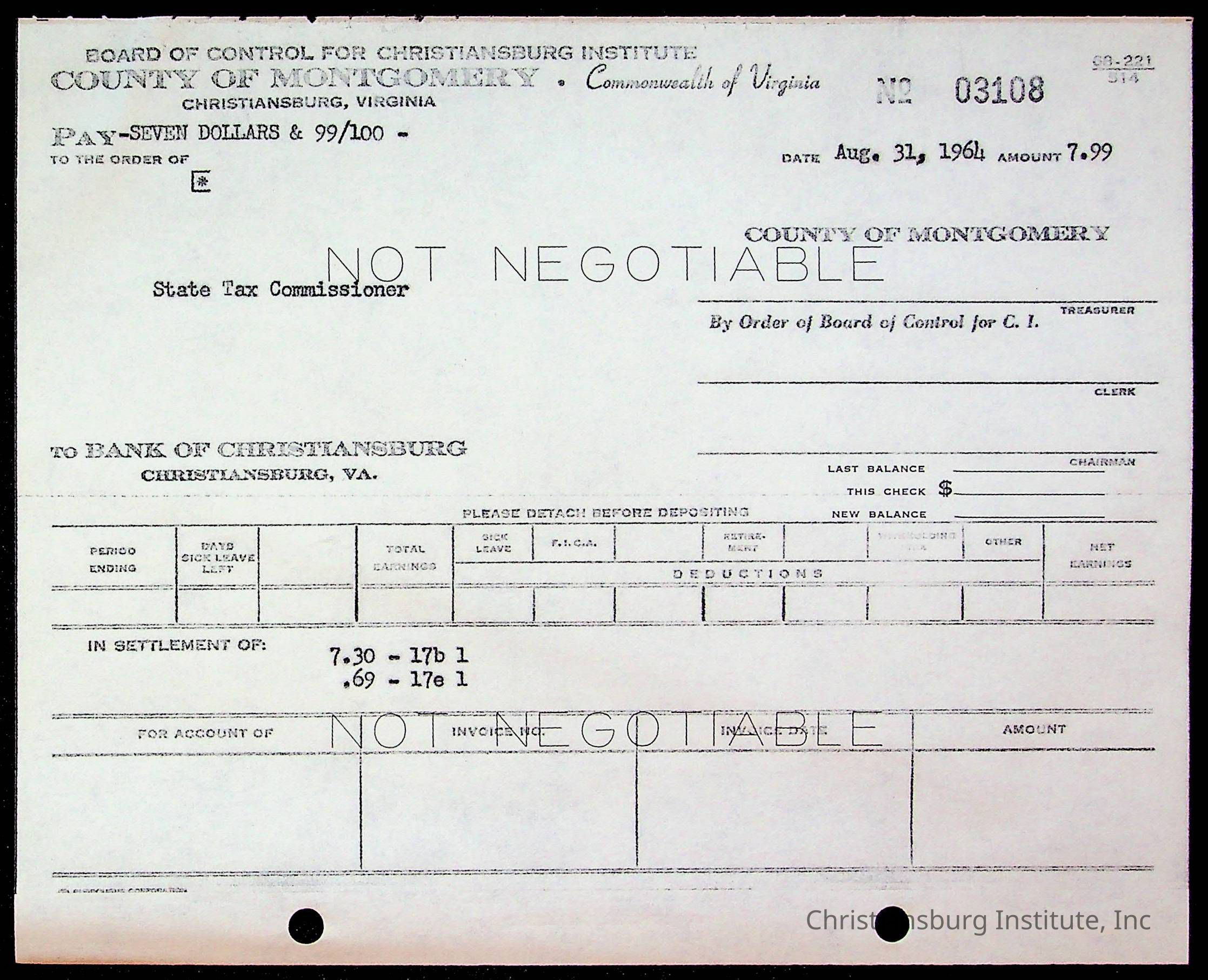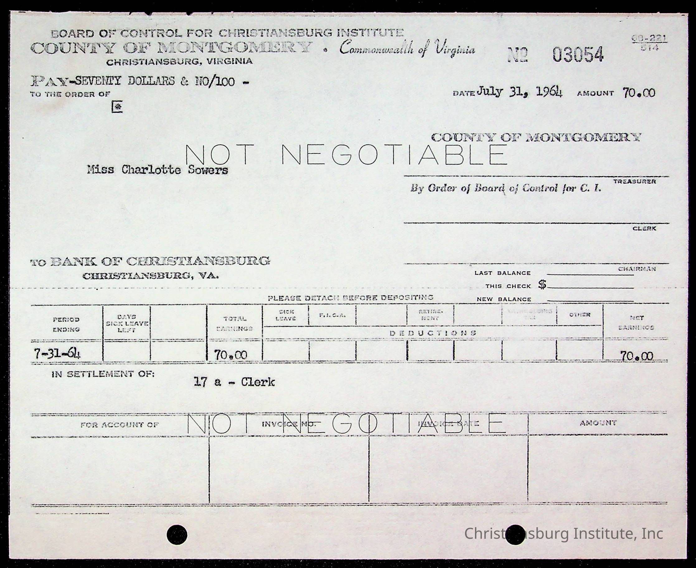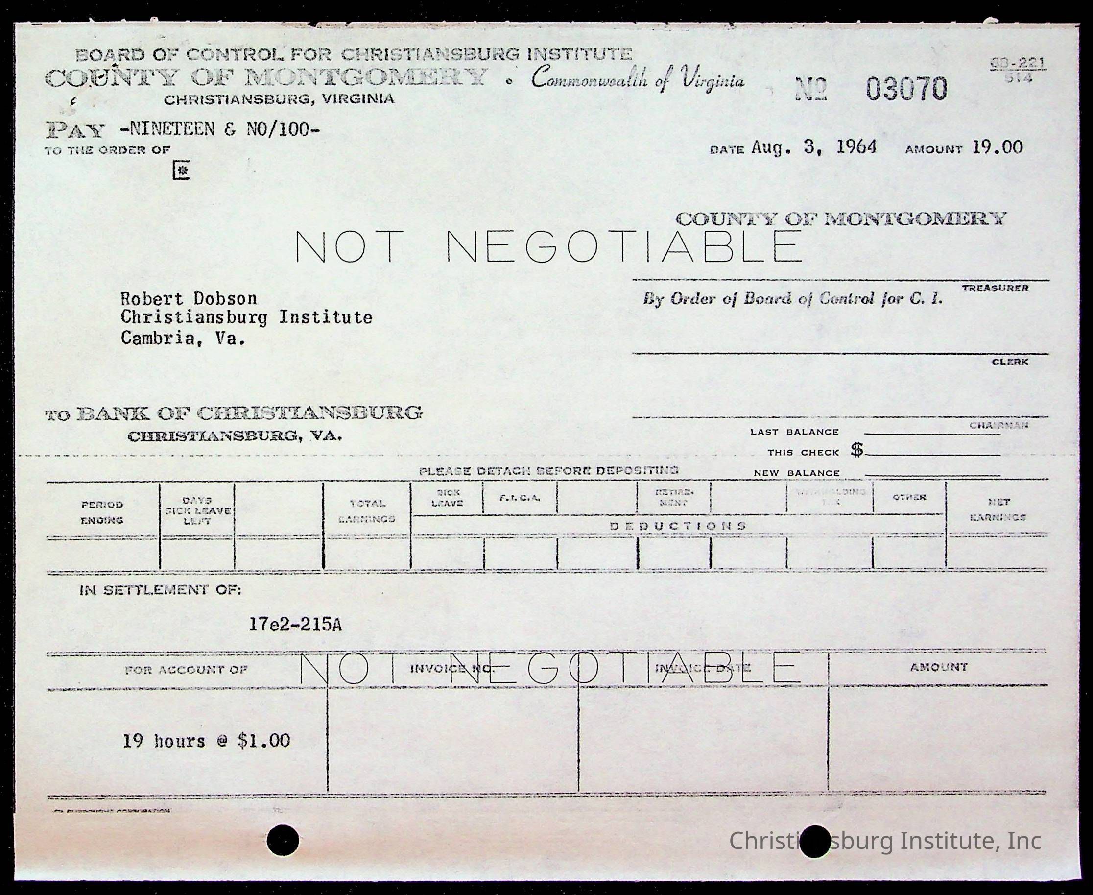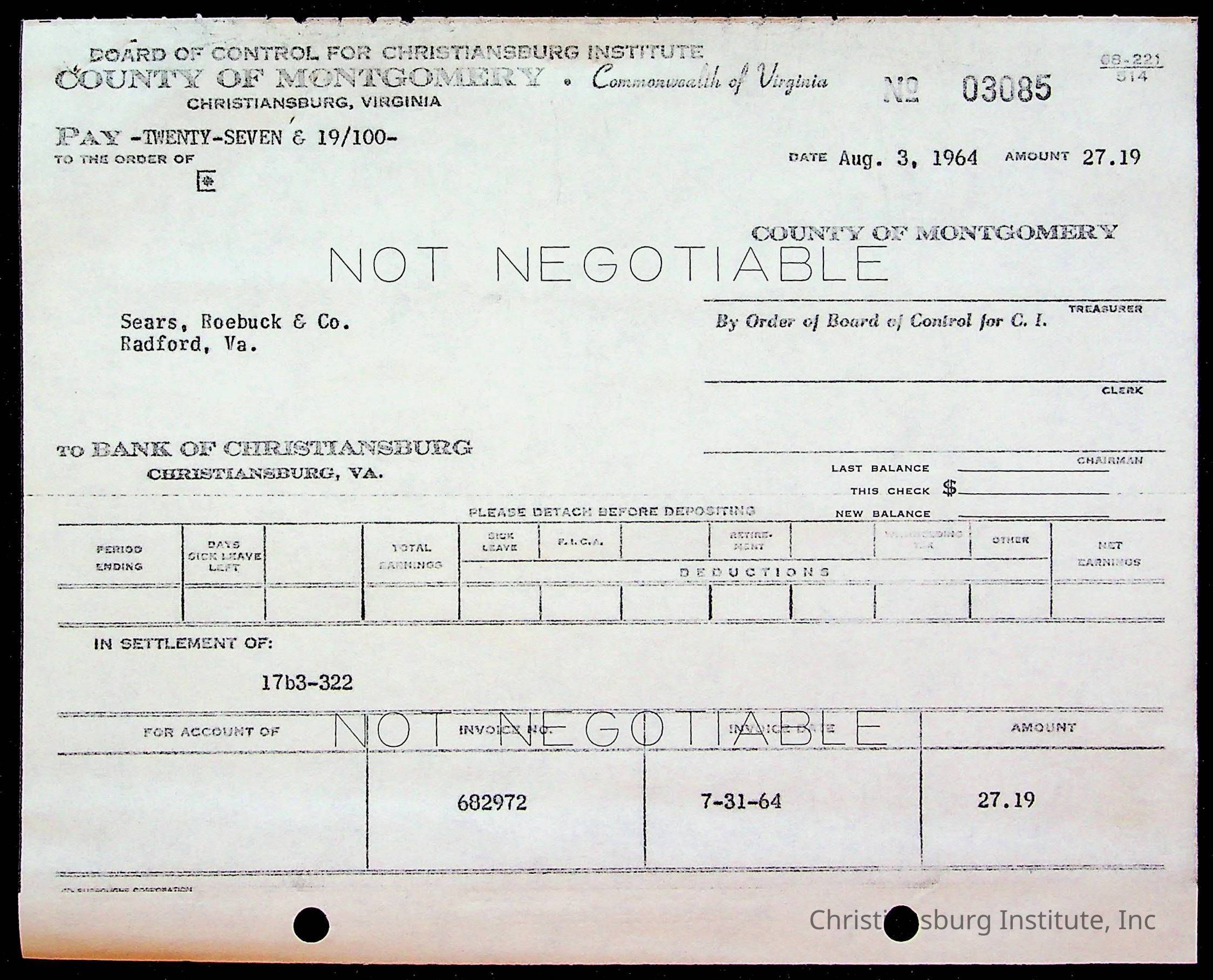 An archive of bills and receipts for the Board of Control of Christiansburg Institute and the Montgomery County School Board, circa 1960s.