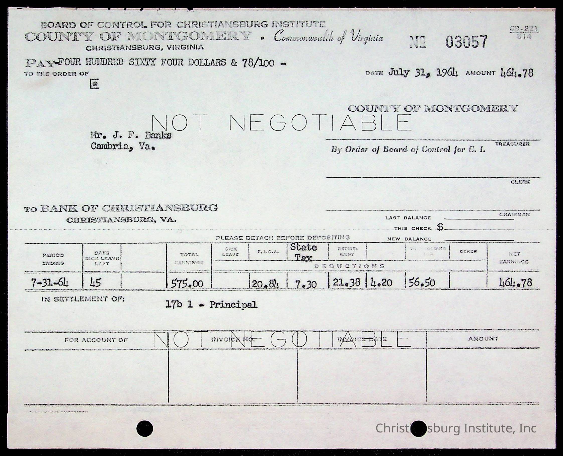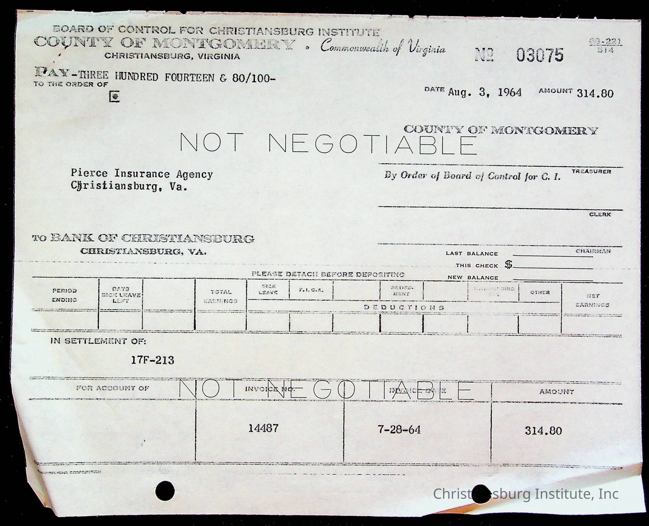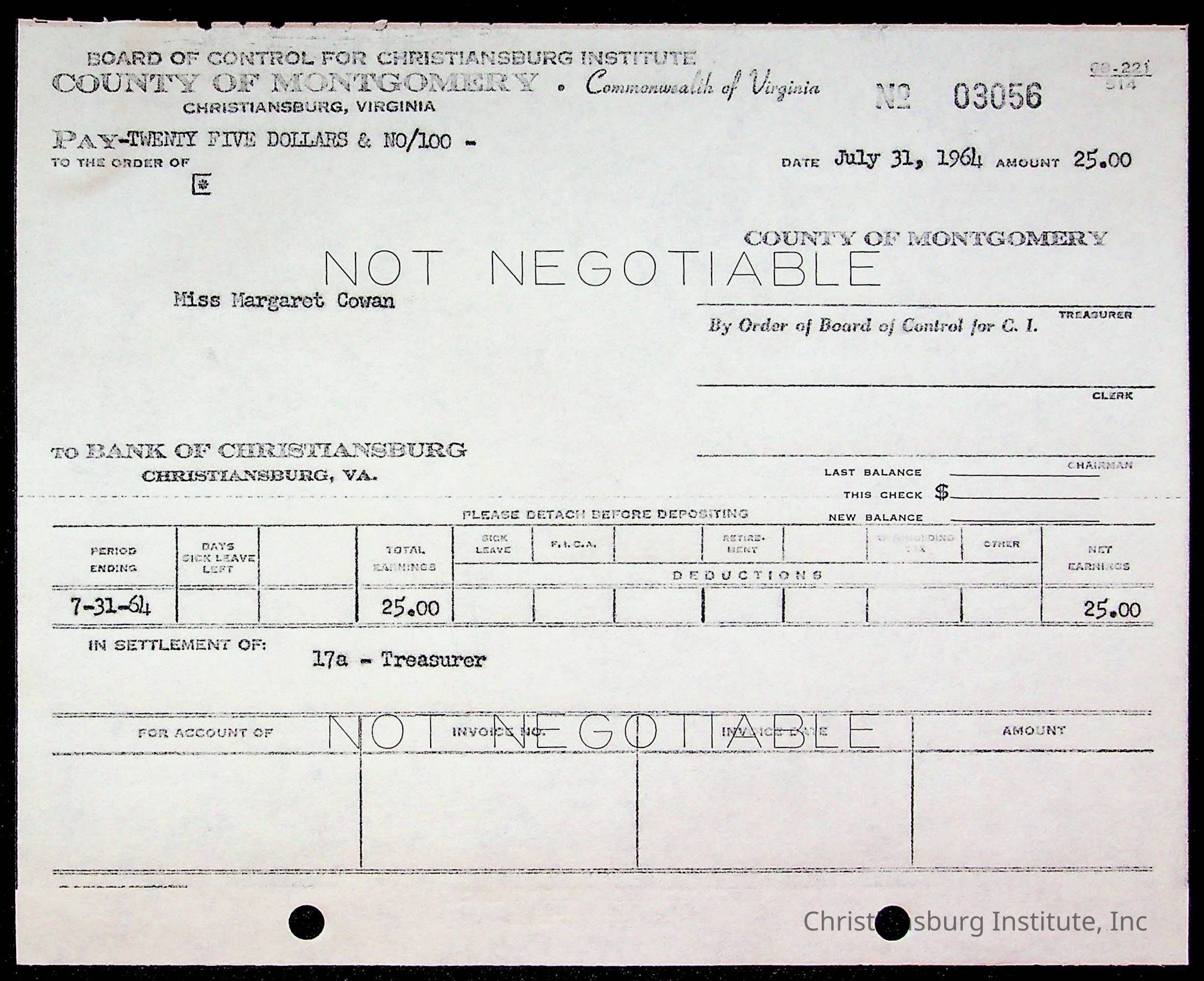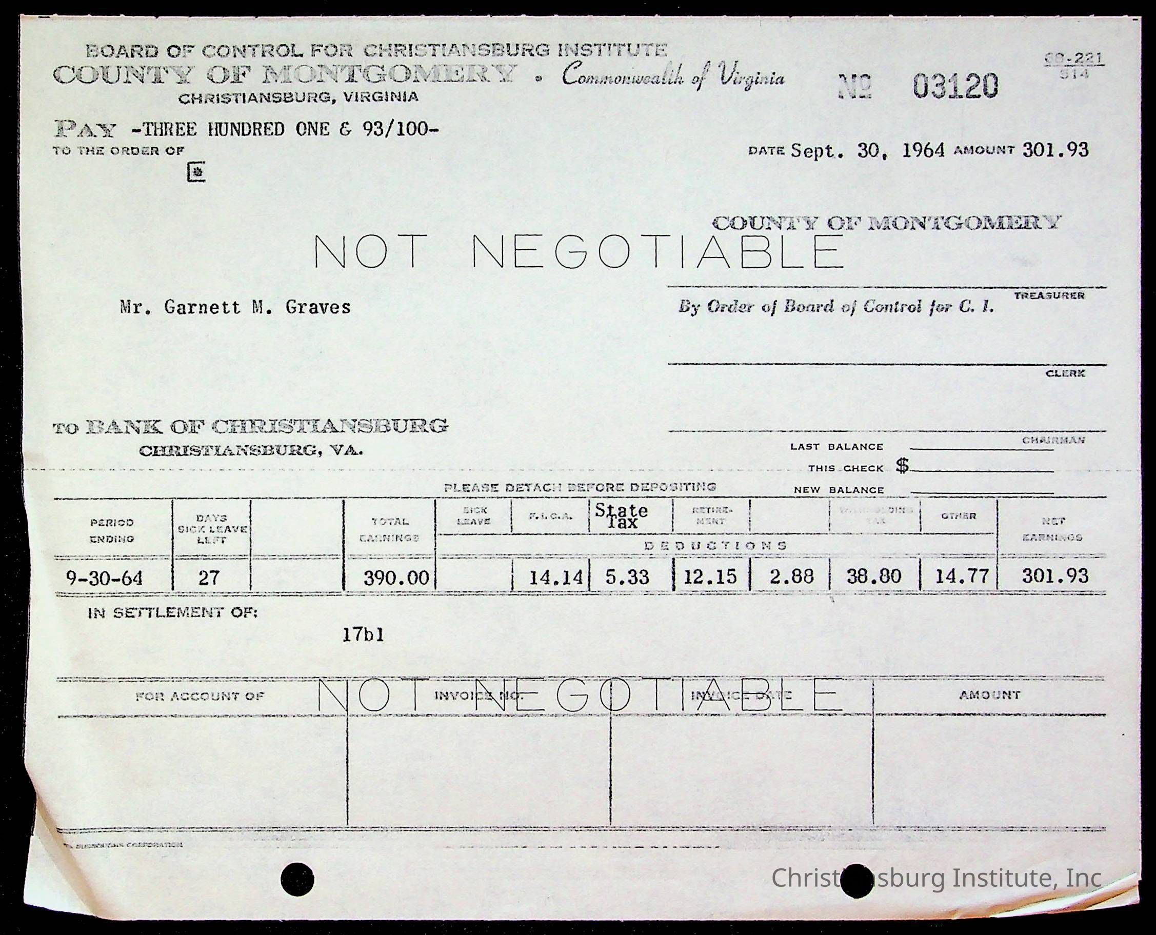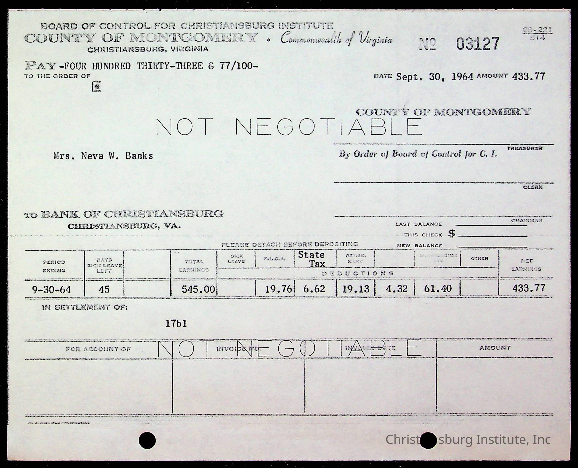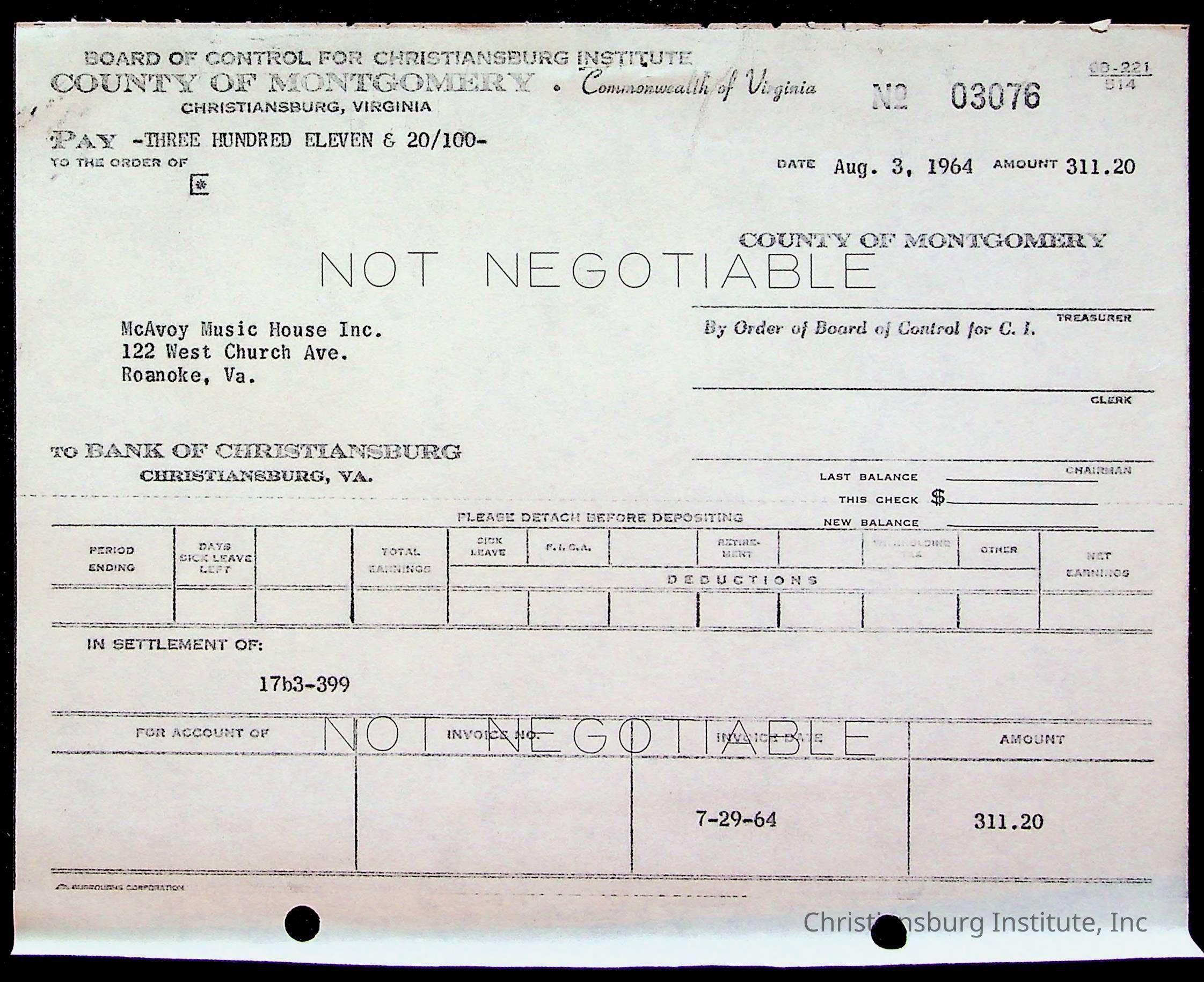 An archive of bills and receipts for the Board of Control of Christiansburg Institute and the Montgomery County School Board, circa 1960s.