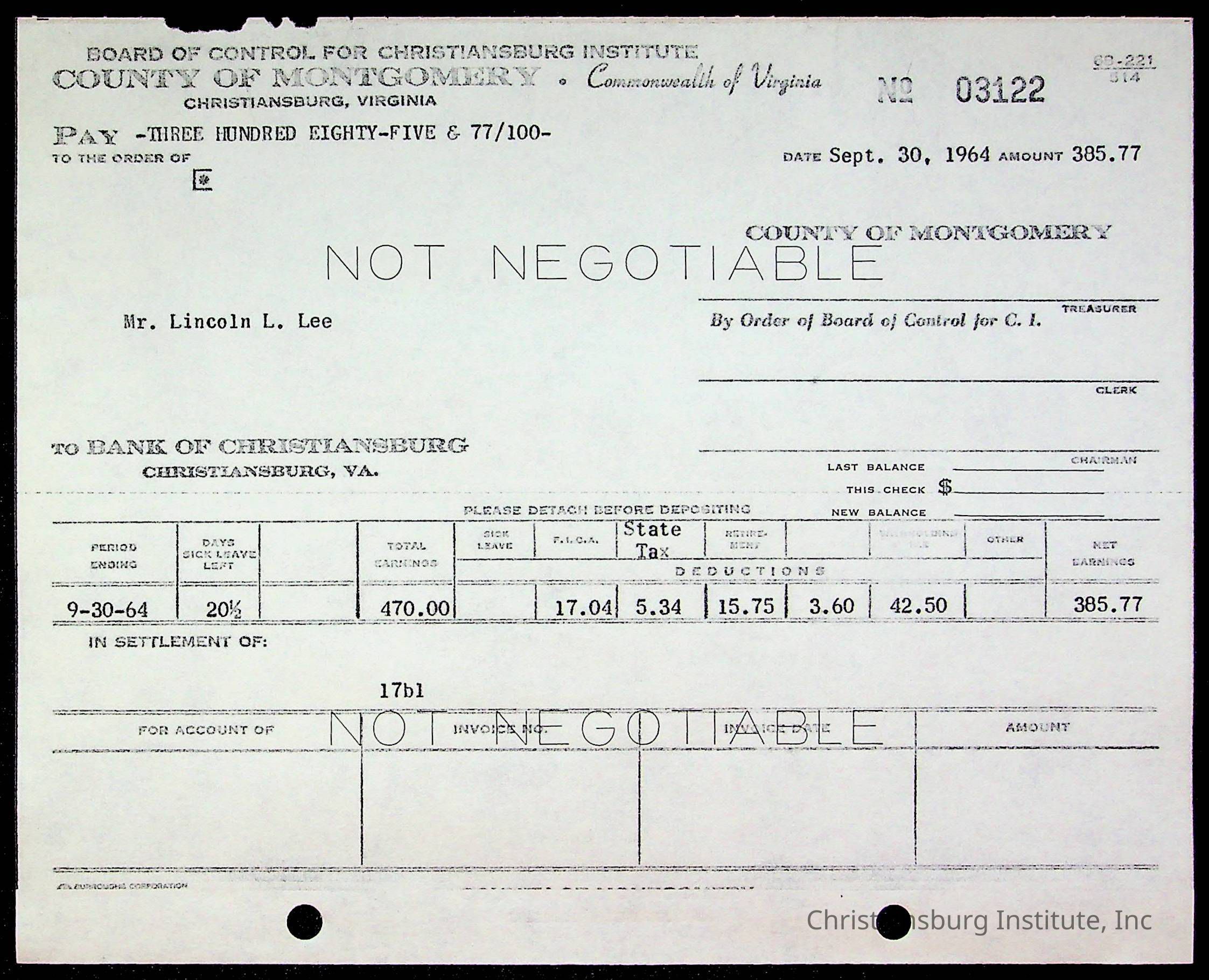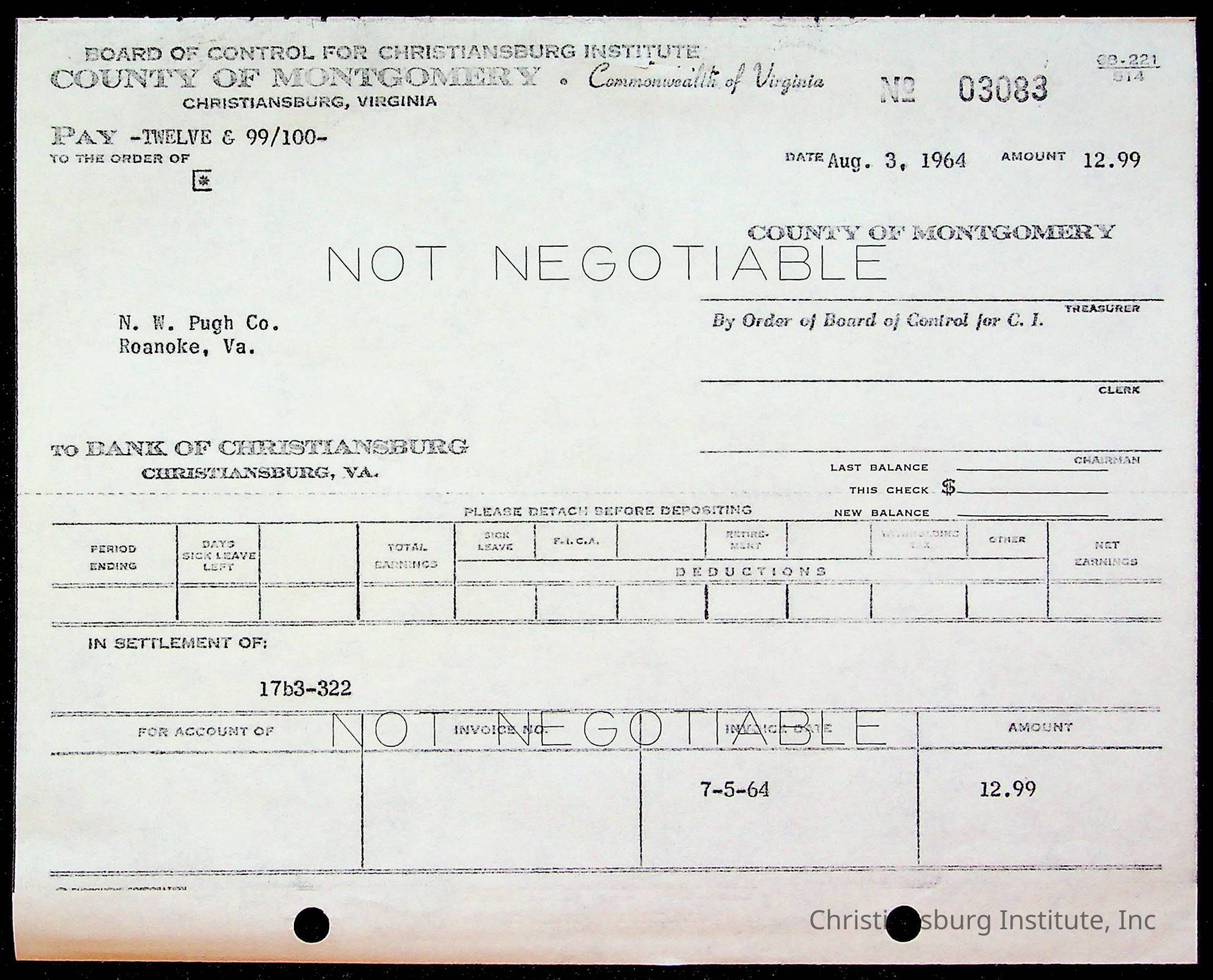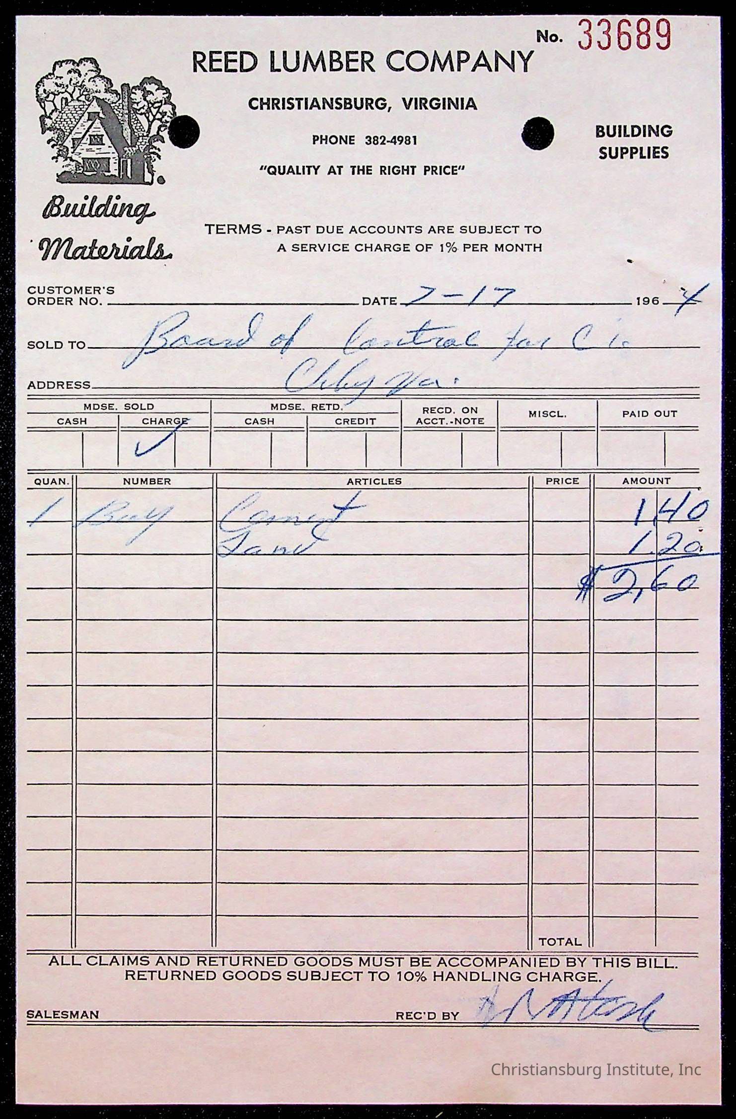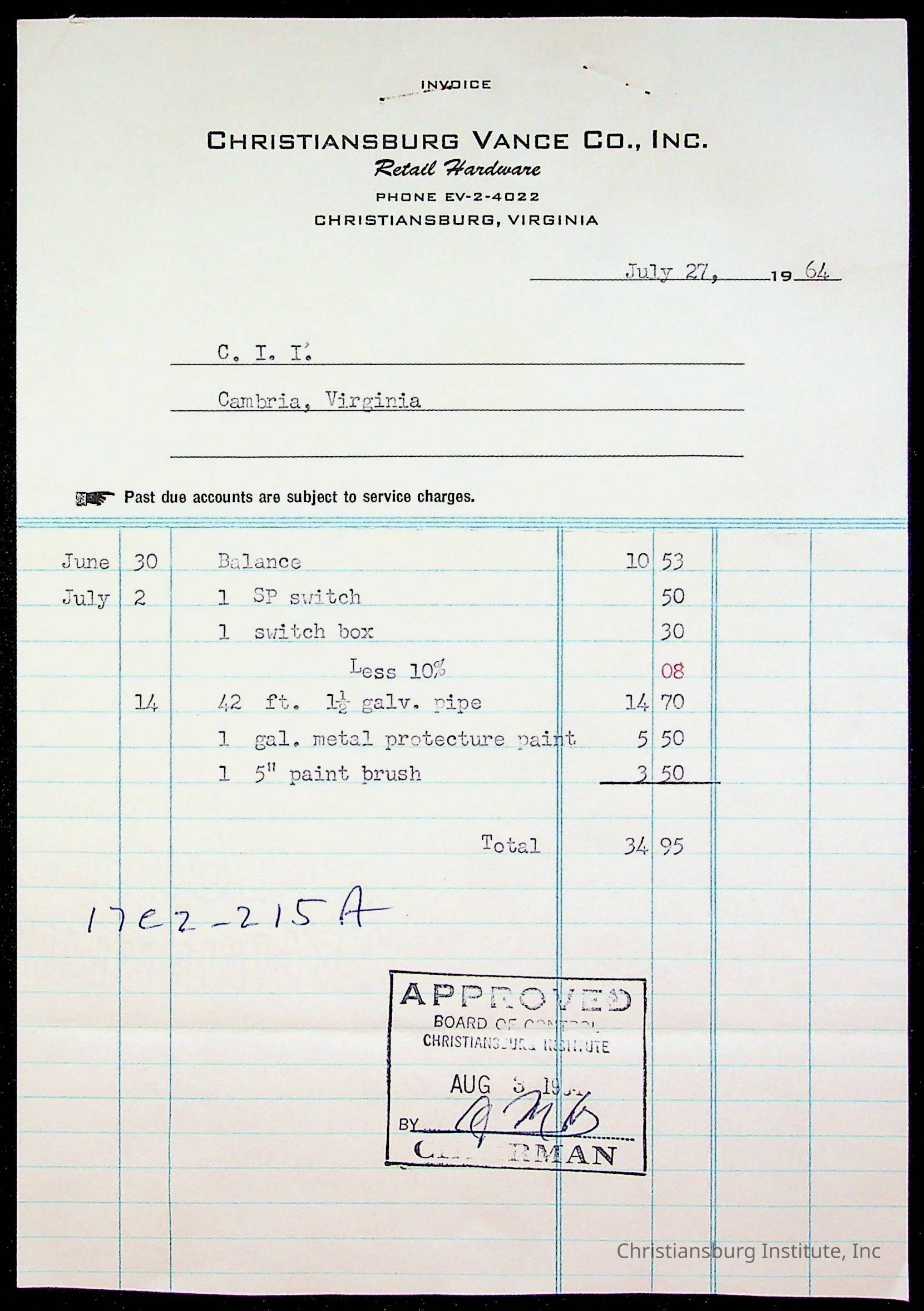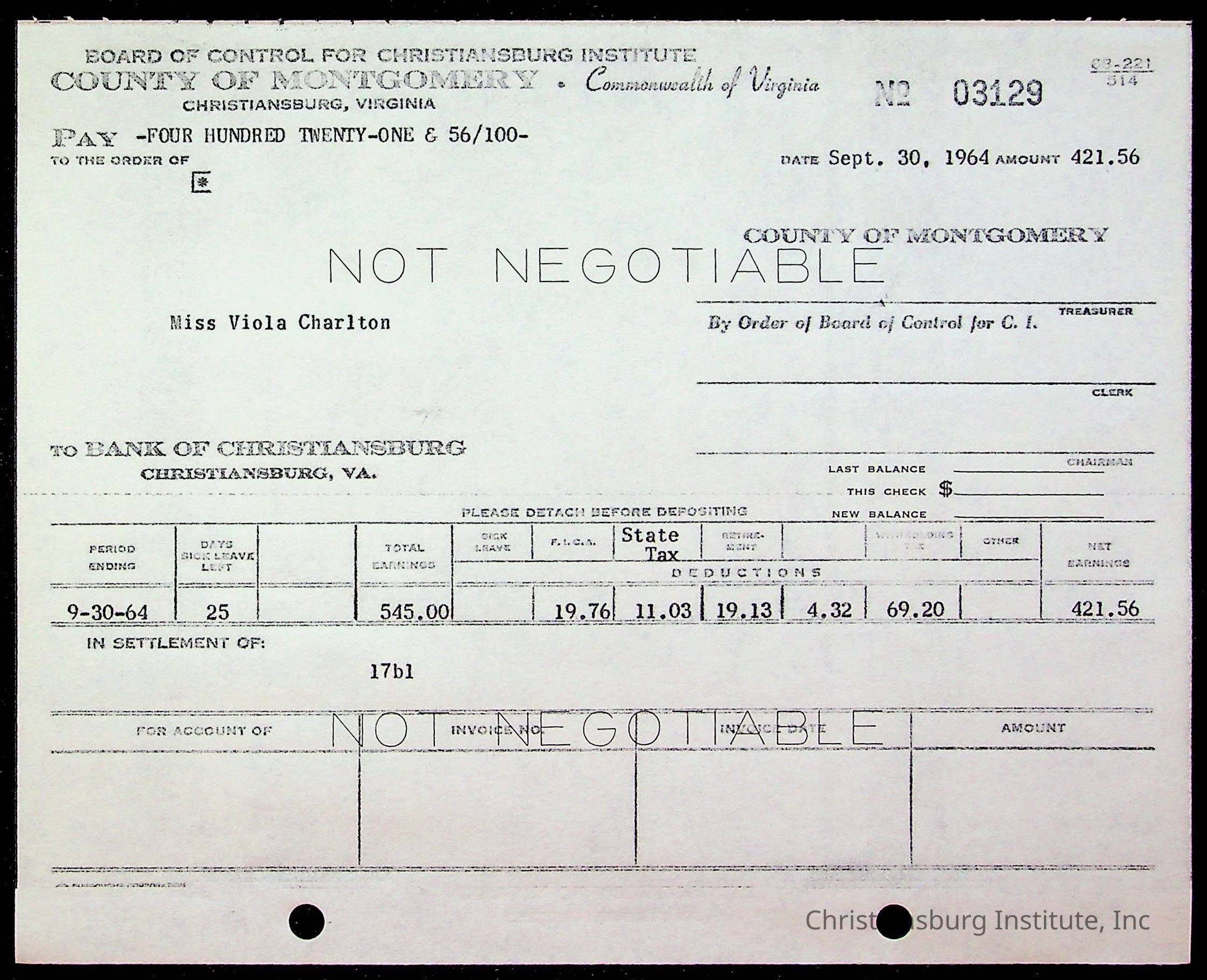 An archive of bills and receipts for the Board of Control of Christiansburg Institute and the Montgomery County School Board, circa 1960s.