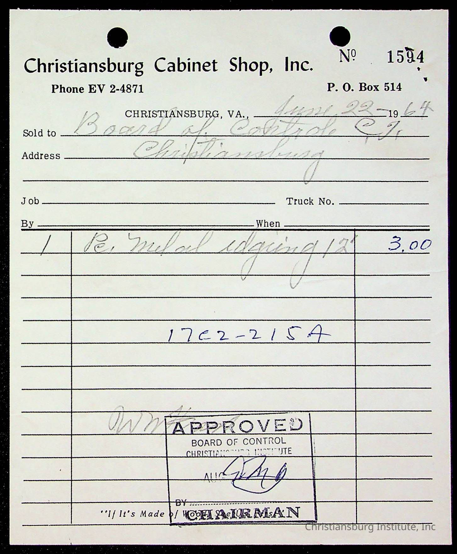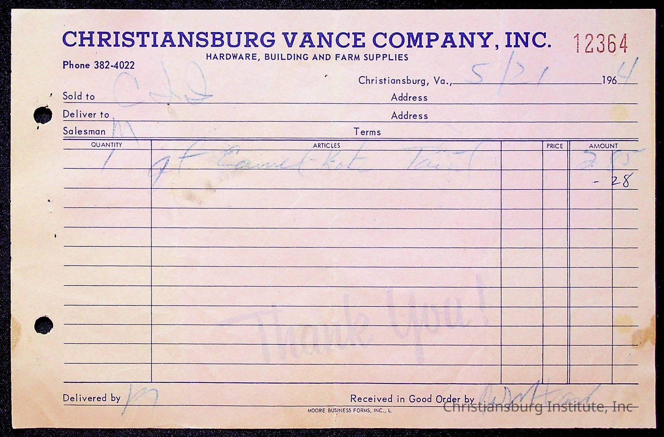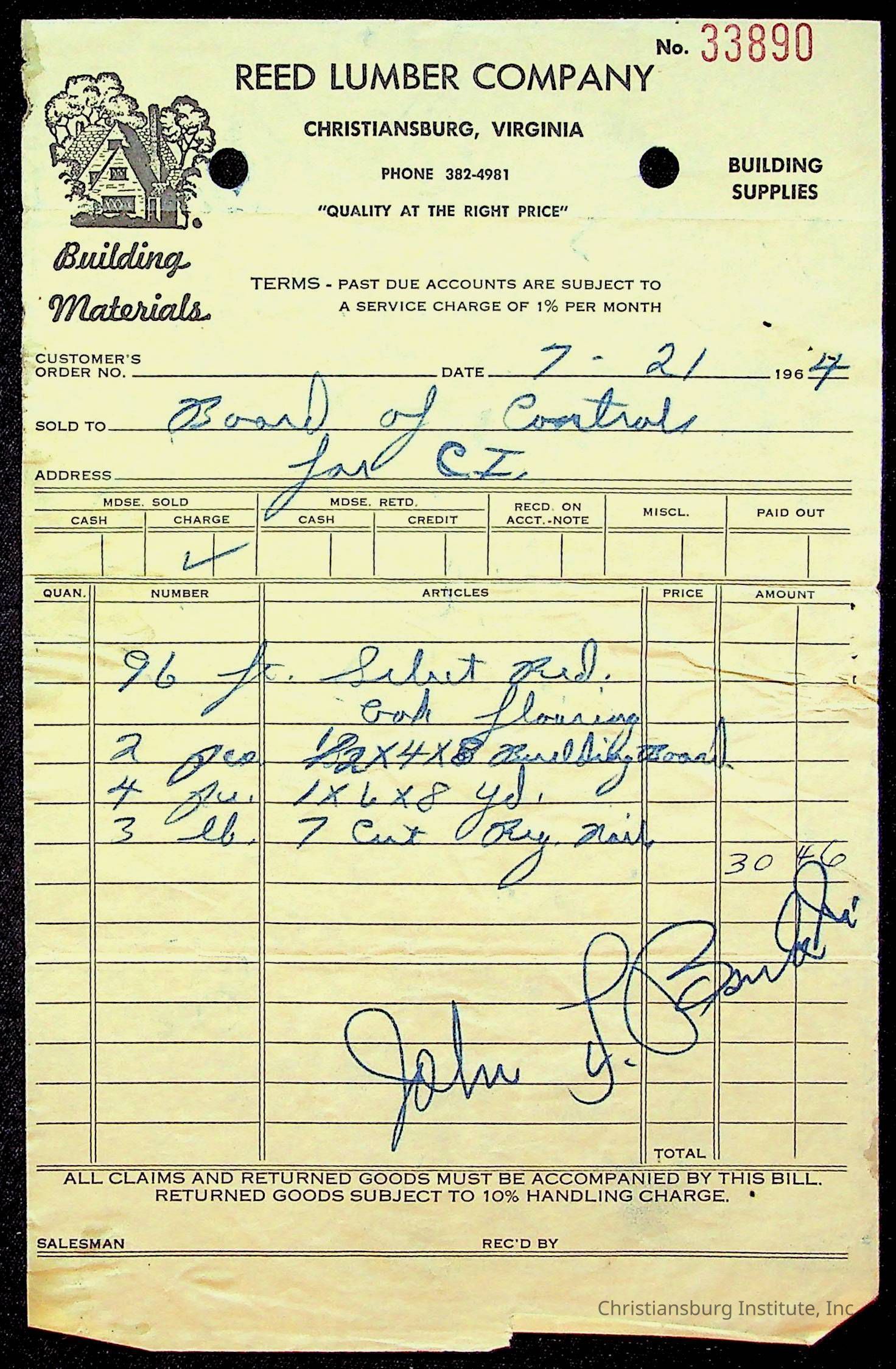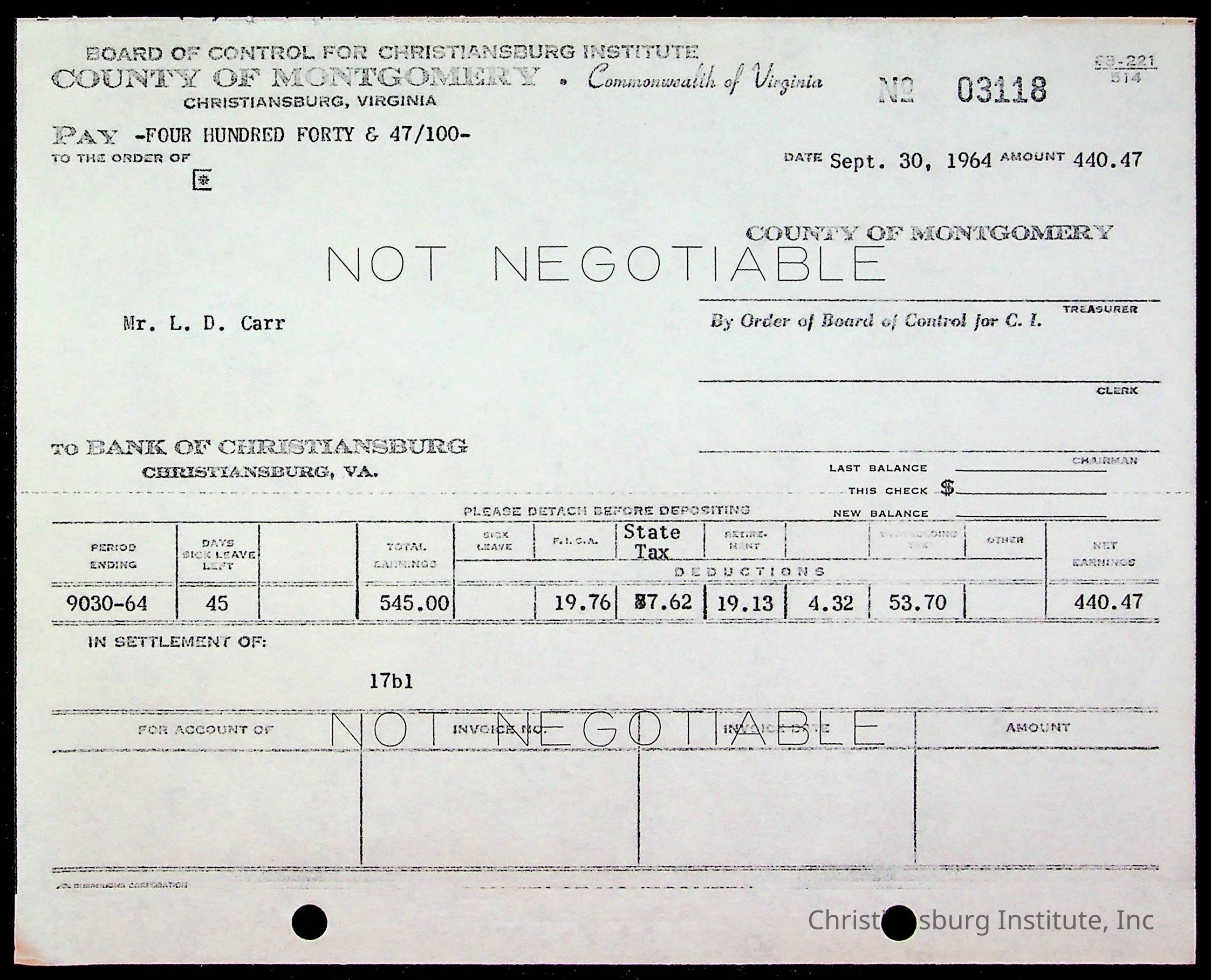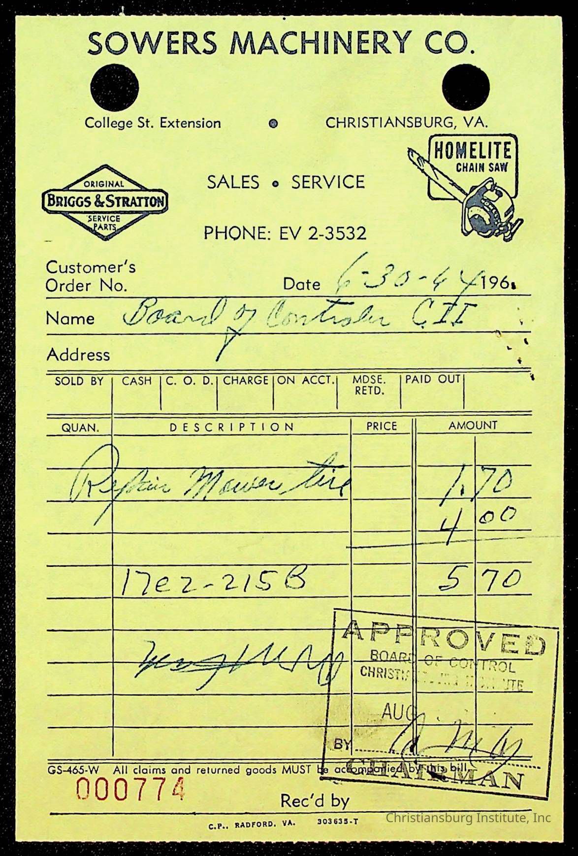 An archive of bills and receipts for the Board of Control of Christiansburg Institute and the Montgomery County School Board, circa 1960s.