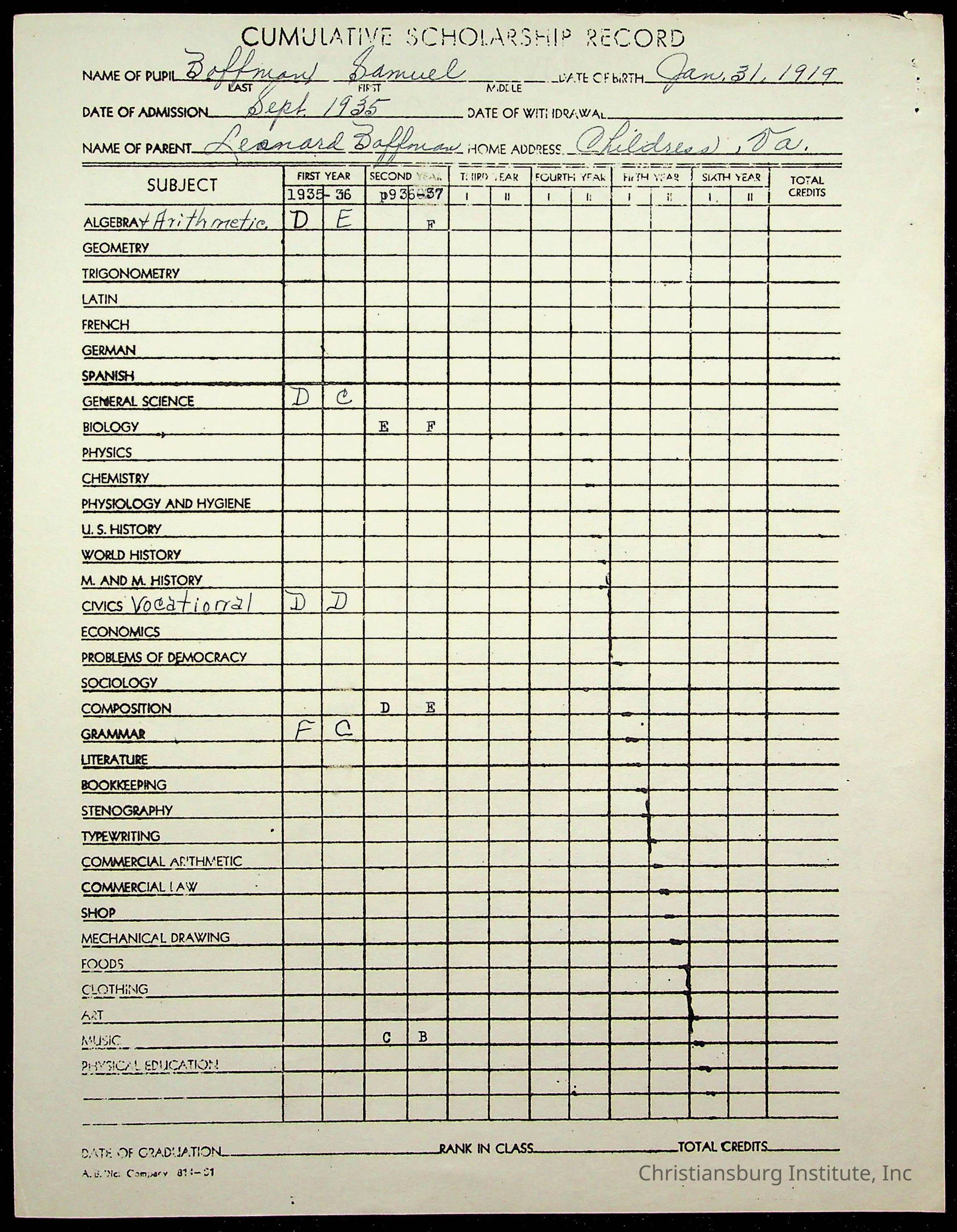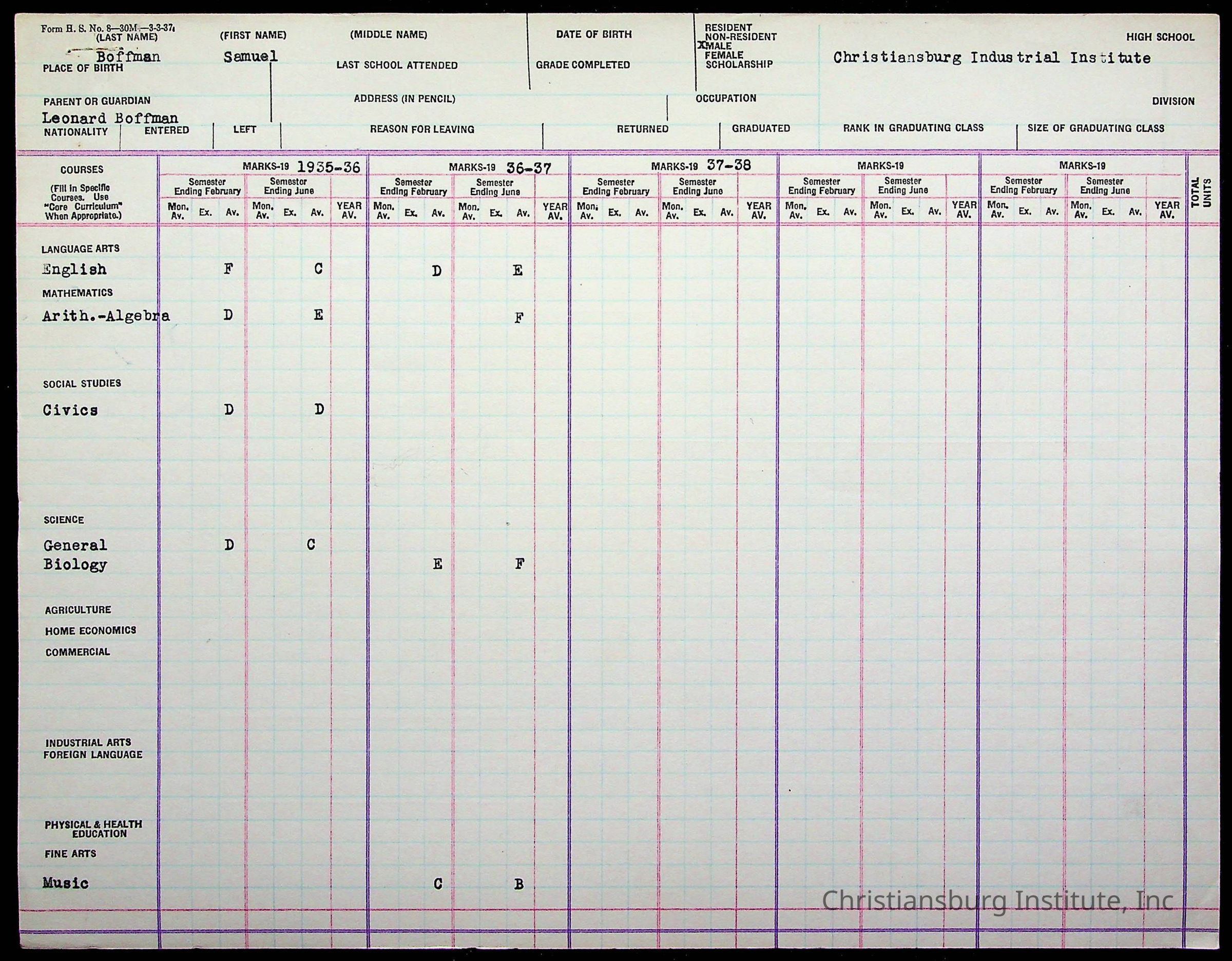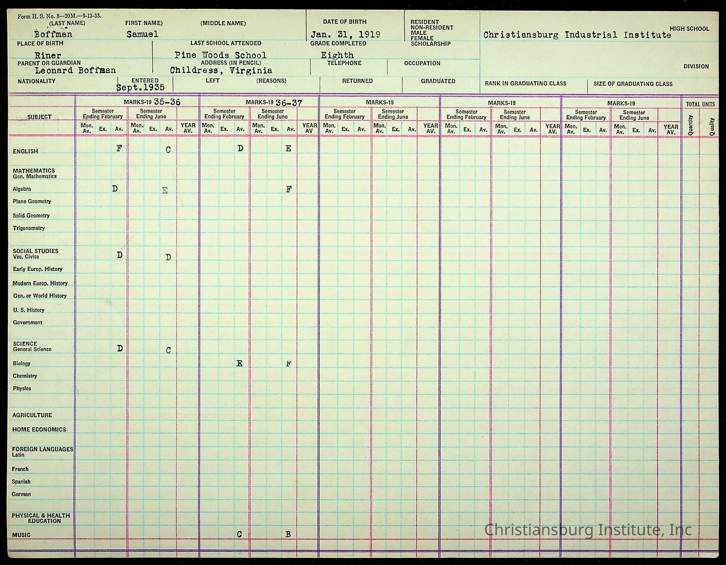 The student file for the Christiansburg Institute student, Samuel Boffman circa 1930s.