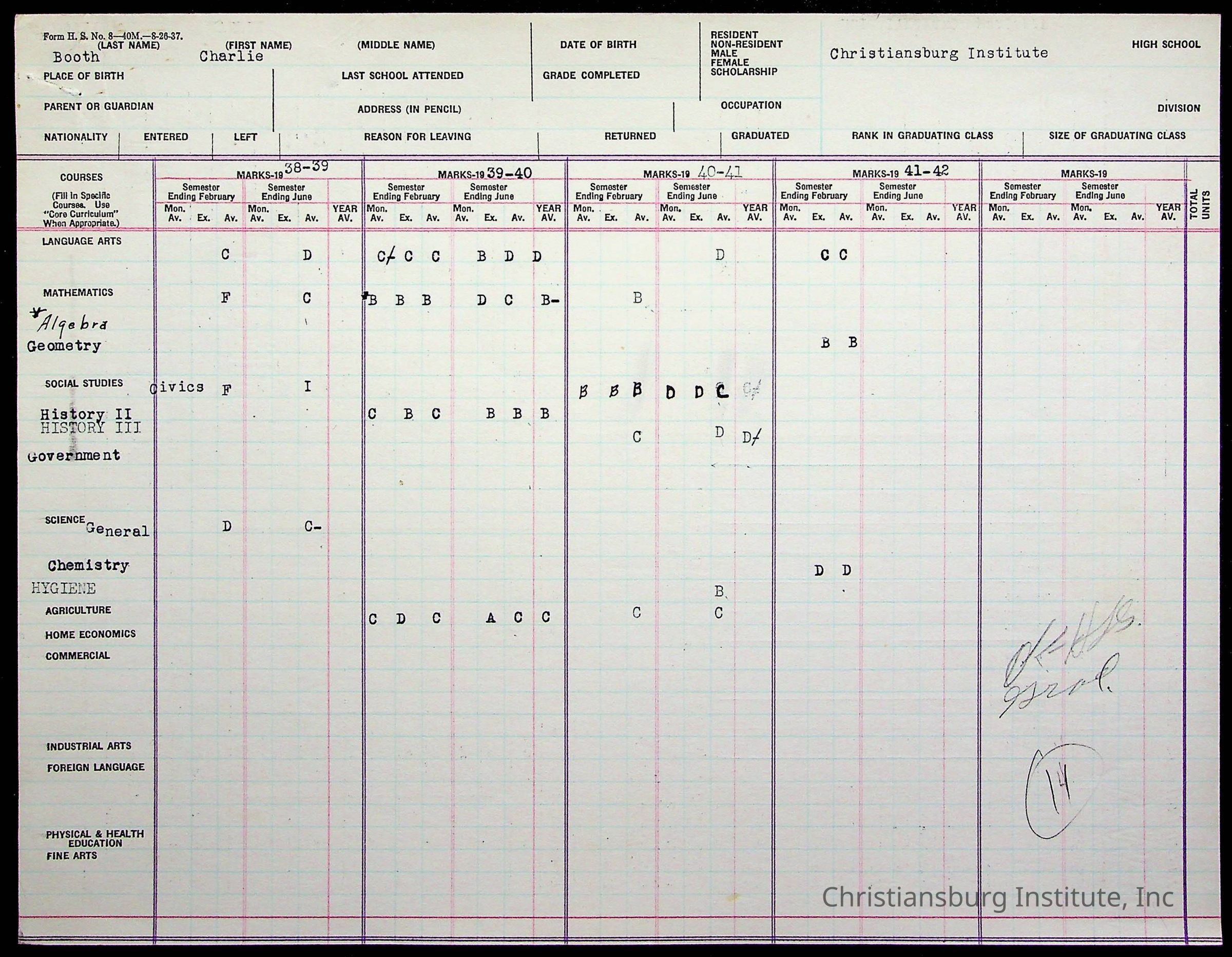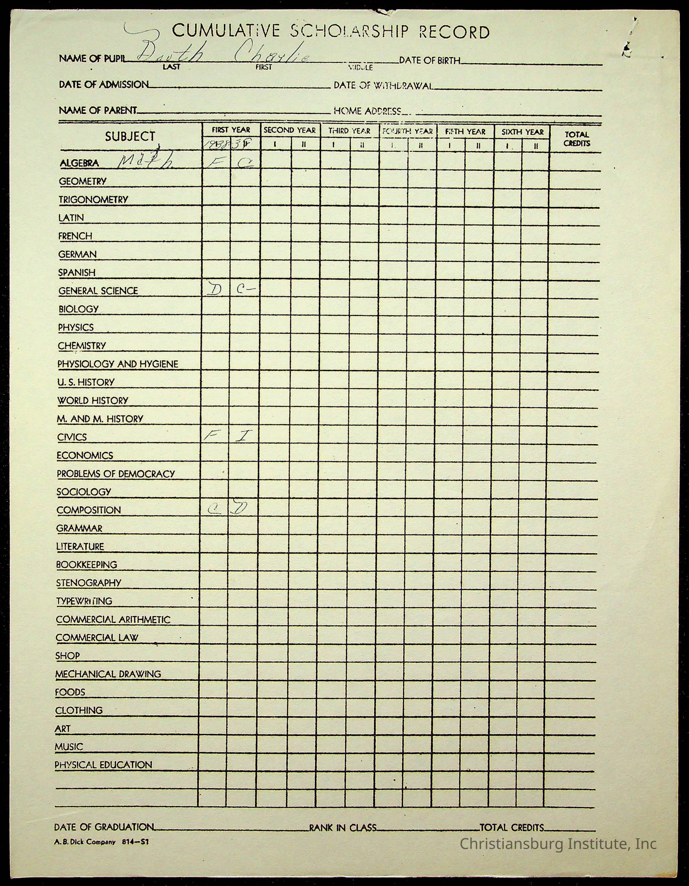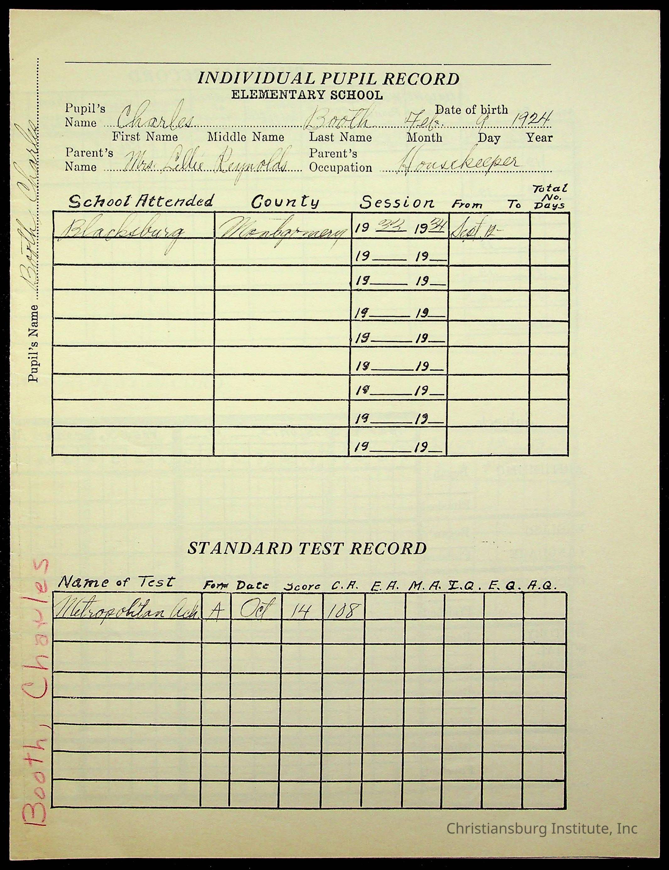 The student file for the Christiansburg Institute student, Charles Booth circa 1930s.