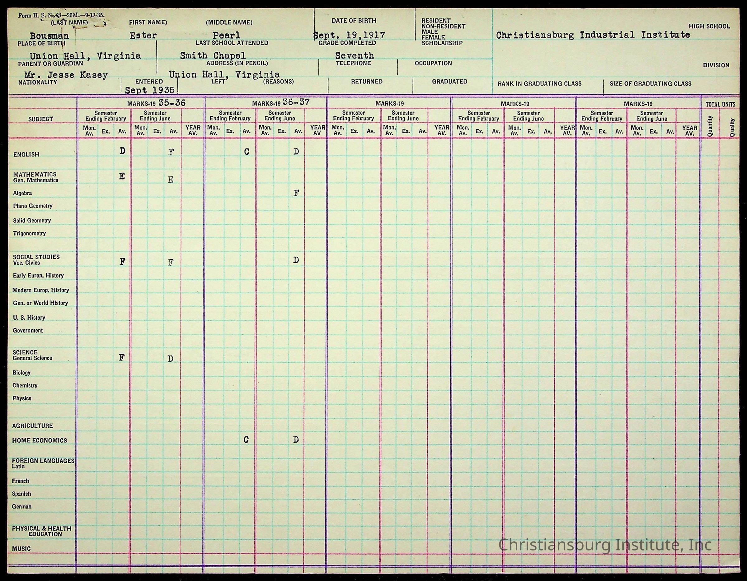 The student file for the Christiansburg Institute student, Ester Pearl Bousman circa 1930s.