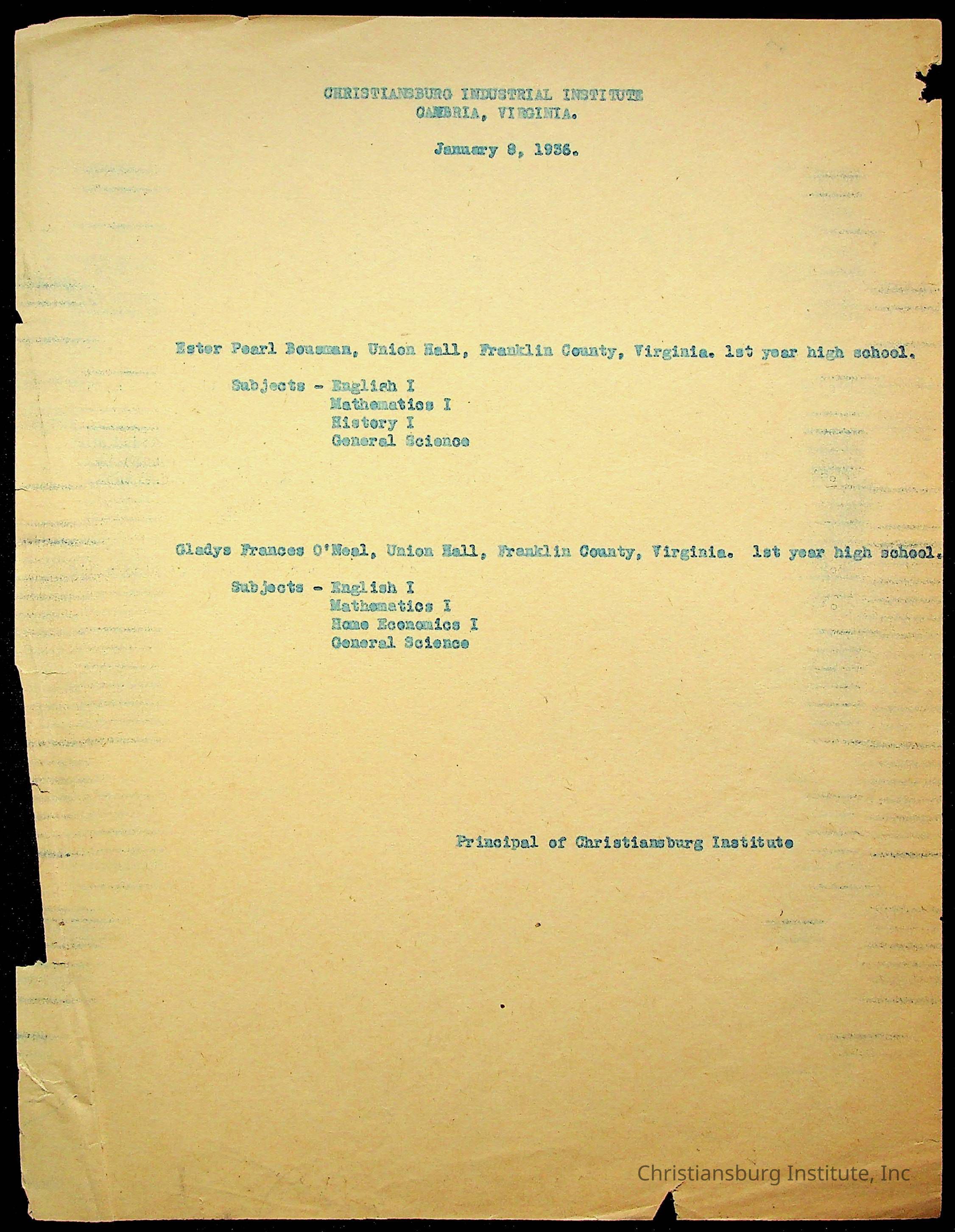 Copyright has been assigned to Christiansburg Institute Museum & Archives by Montgomery County Public Schools. For permission to publish materials created by the donor, contact CIMA@christiansburginstitute.com. Materials not created by Christiansburg Industrial Institute may still be under copyright.