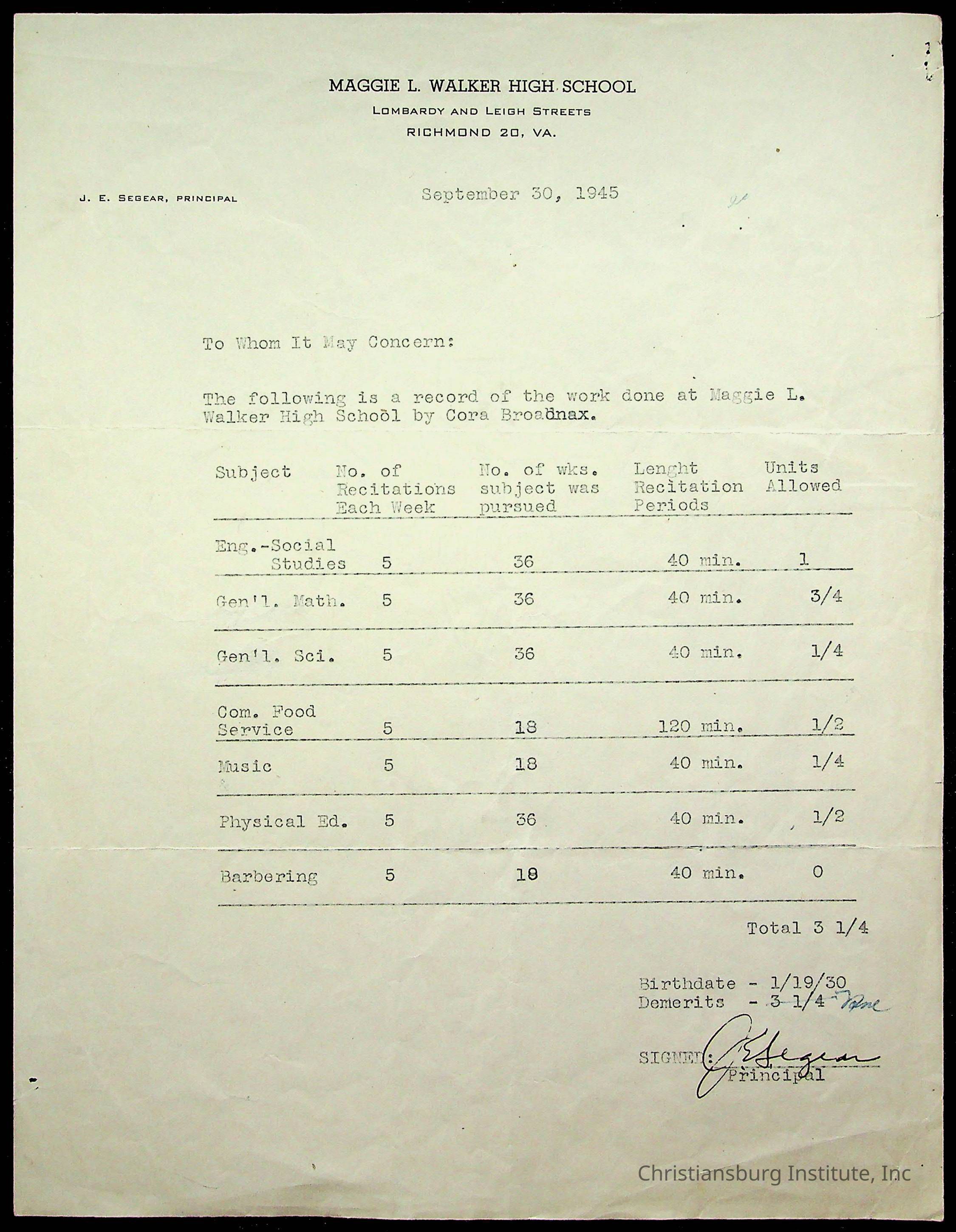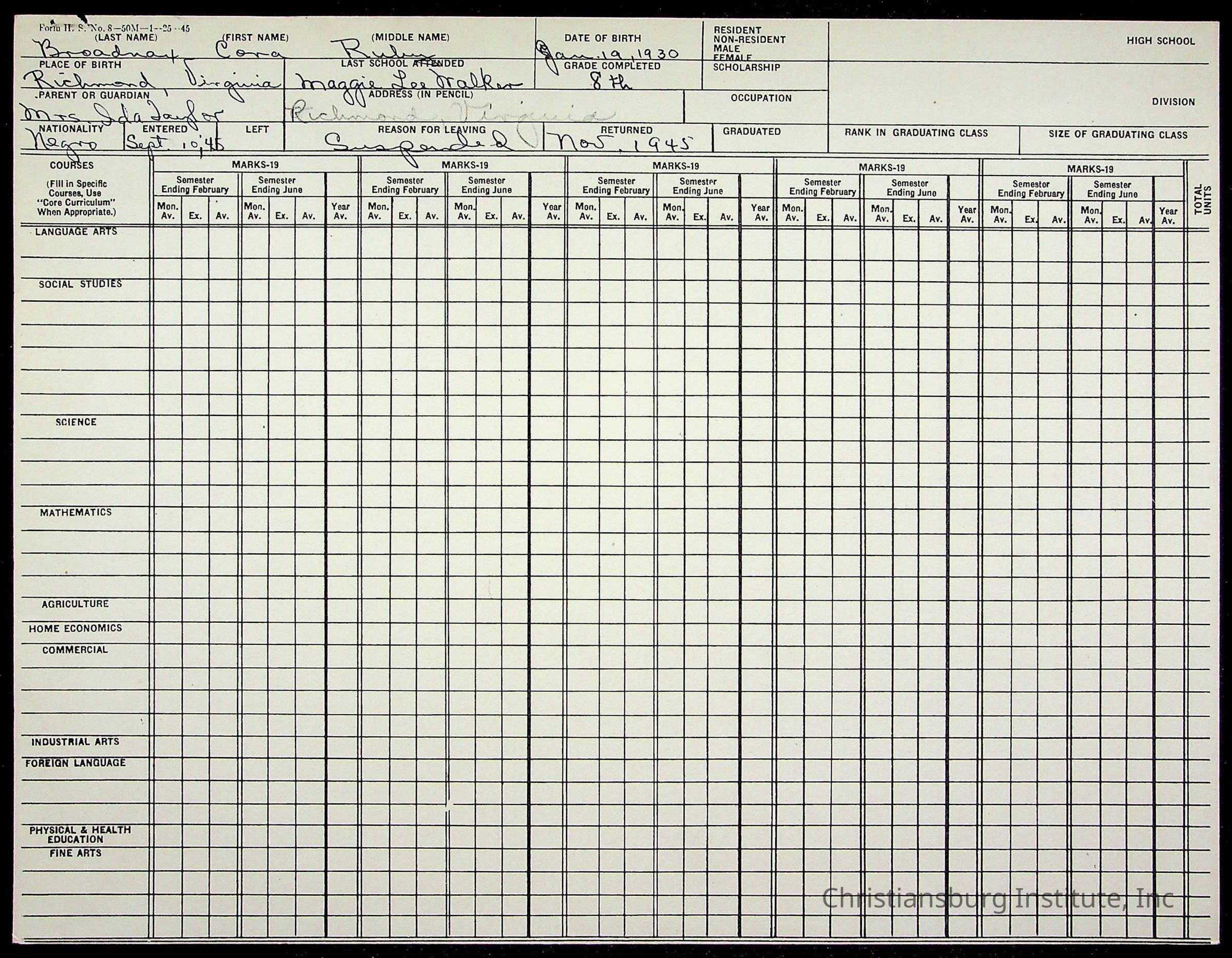 The student file for the Christiansburg Institute student, Cora Ruby Bradnax circa 1940s.