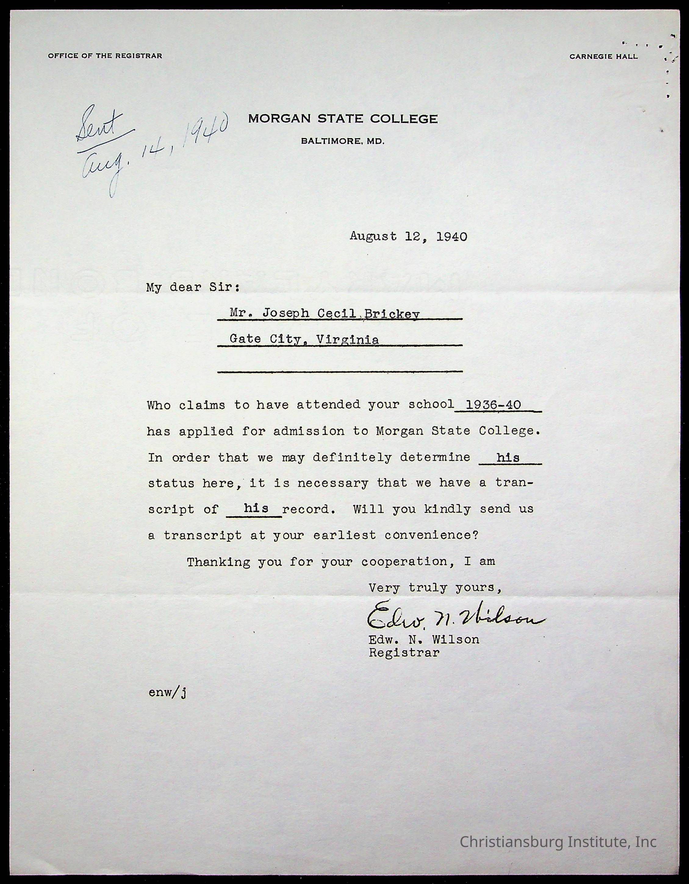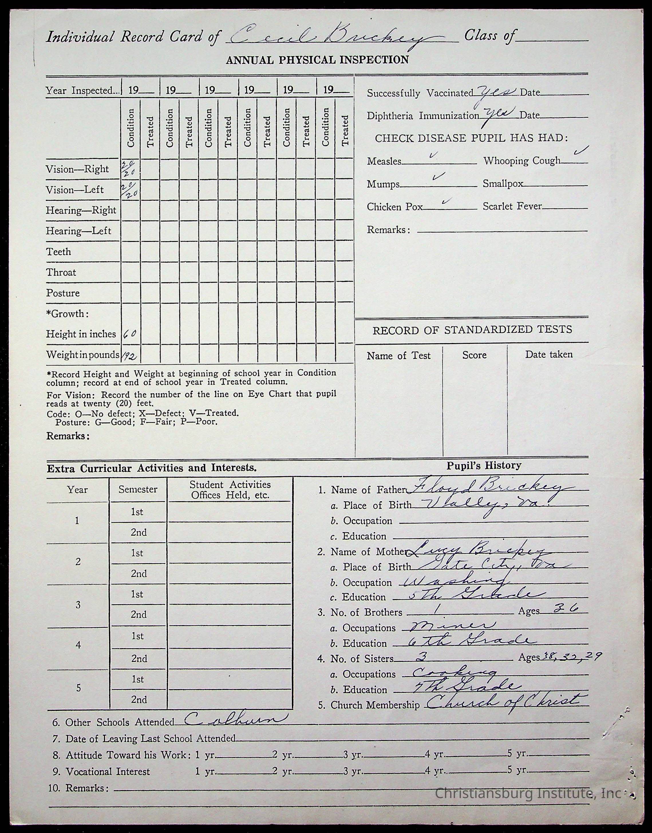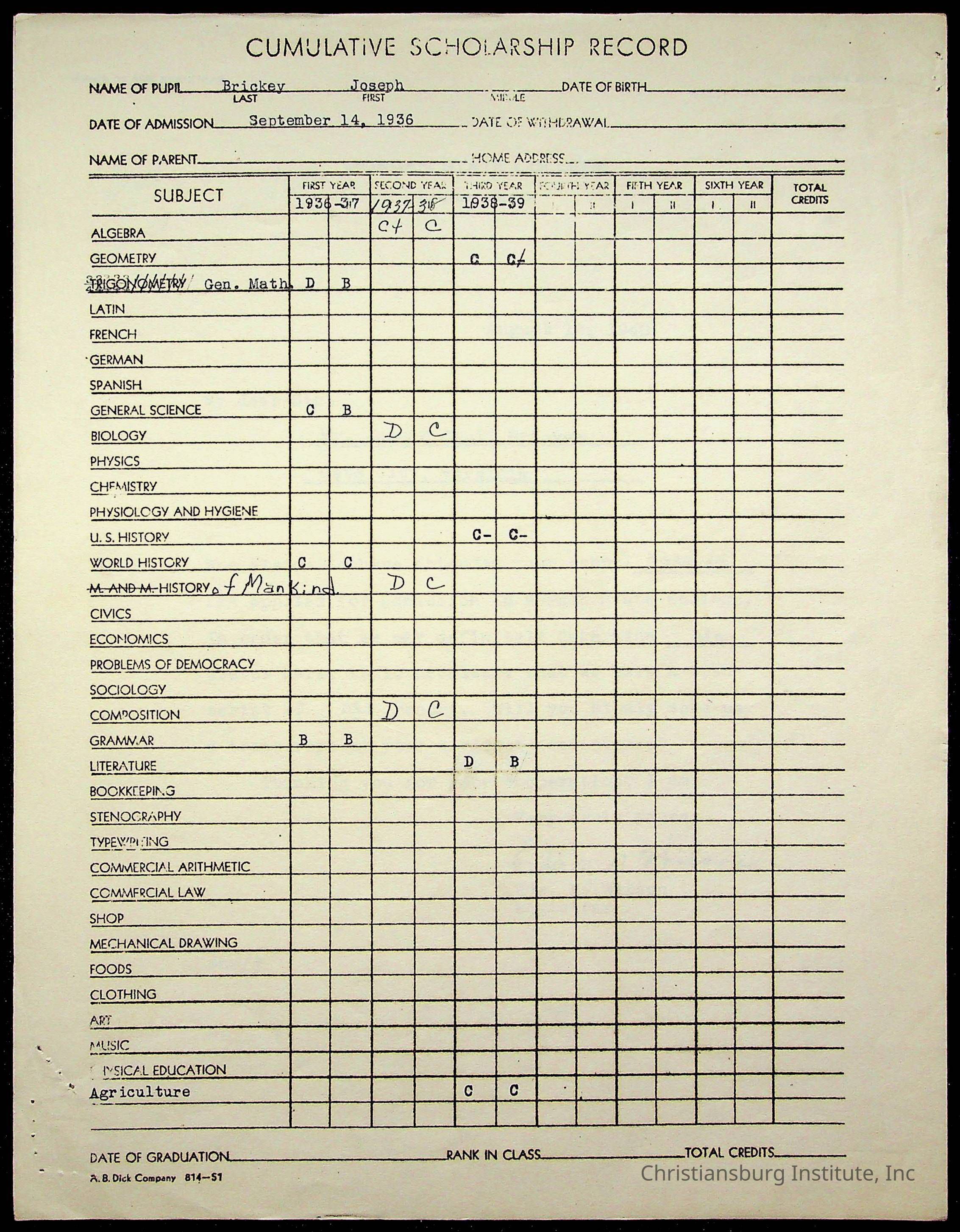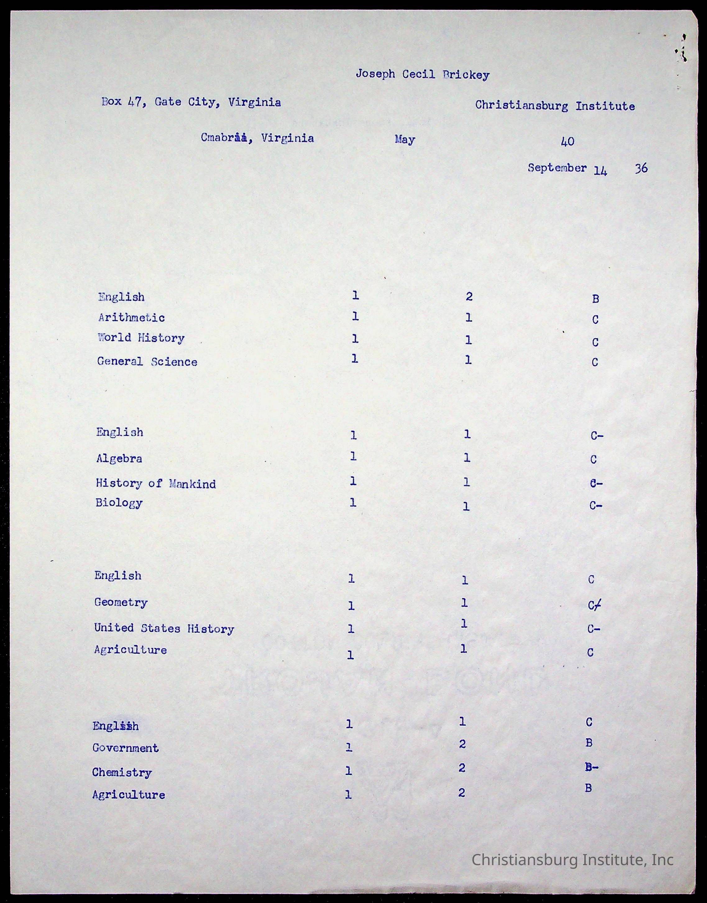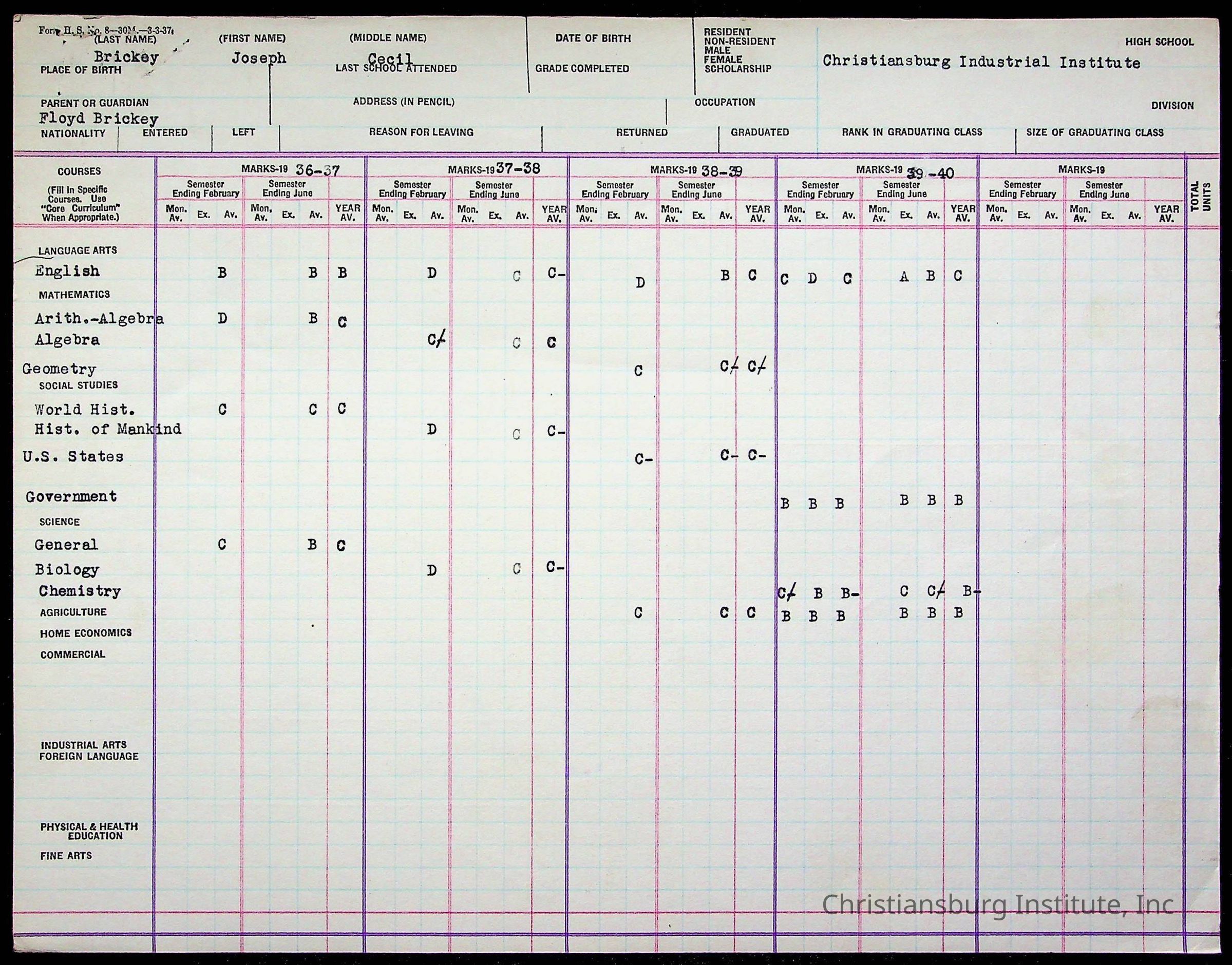 The student file for the Christiansburg Institute student, Joseph Cecil Brickey circa 1930s.