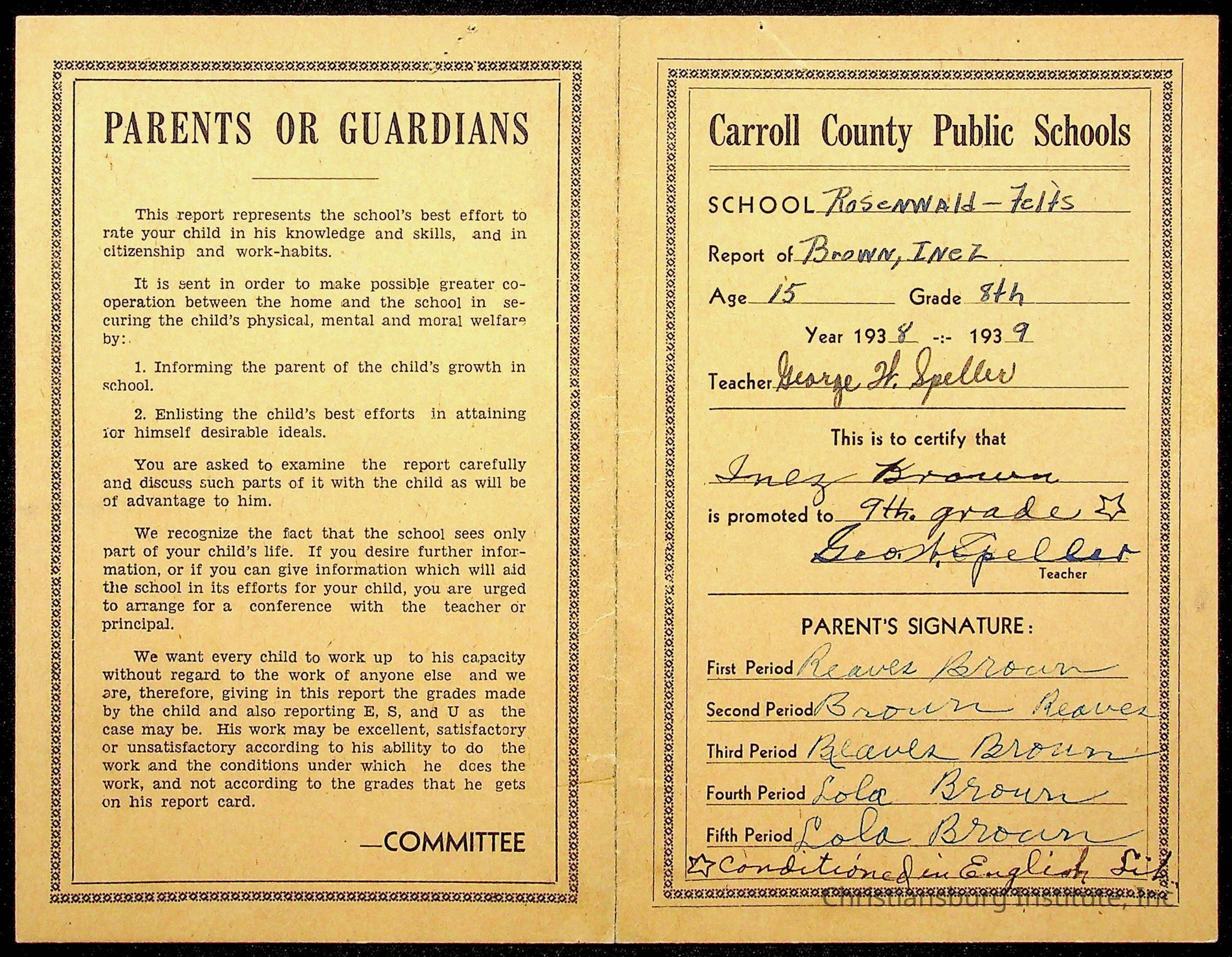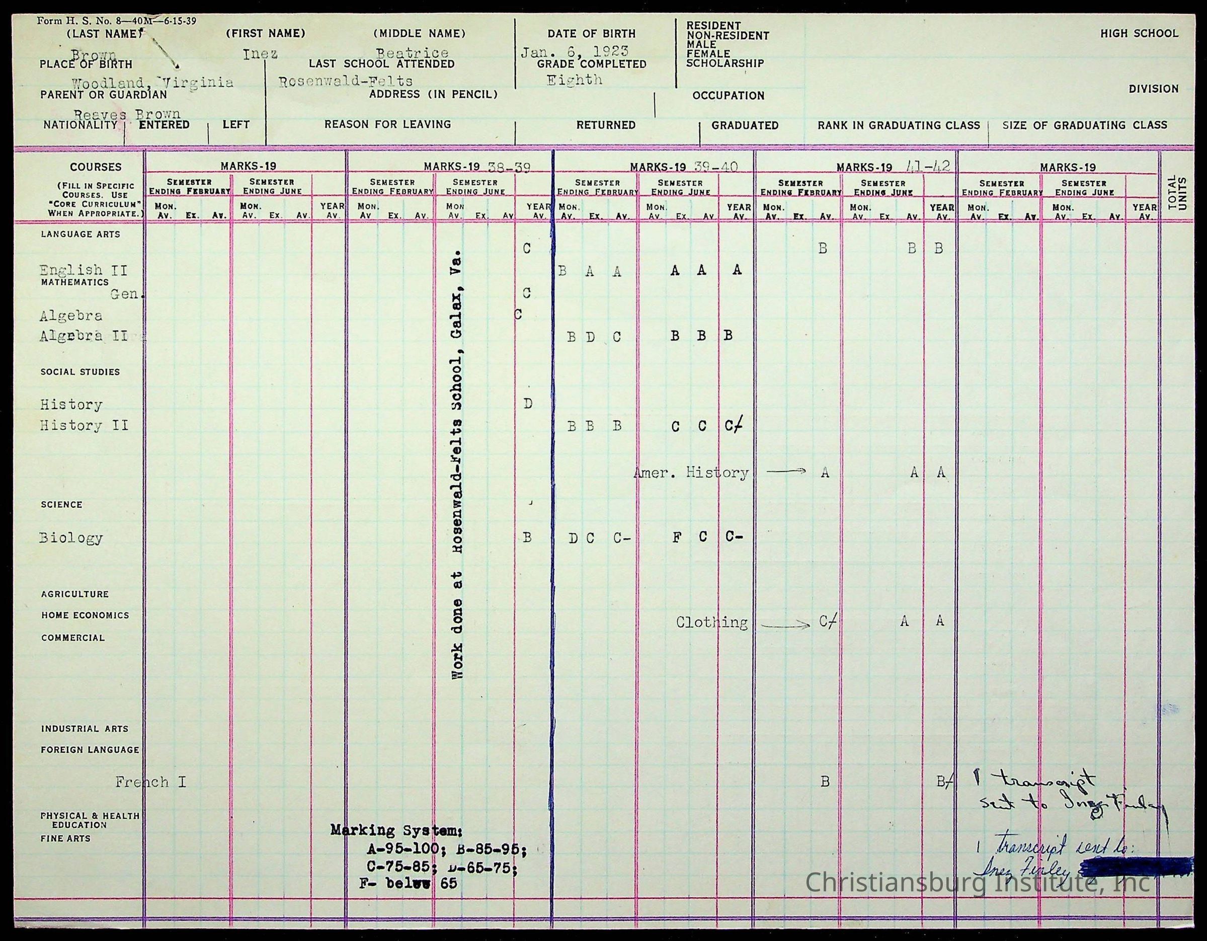 The student file for the Christiansburg Institute student, Inez Beatrice Brown circa 1940s.