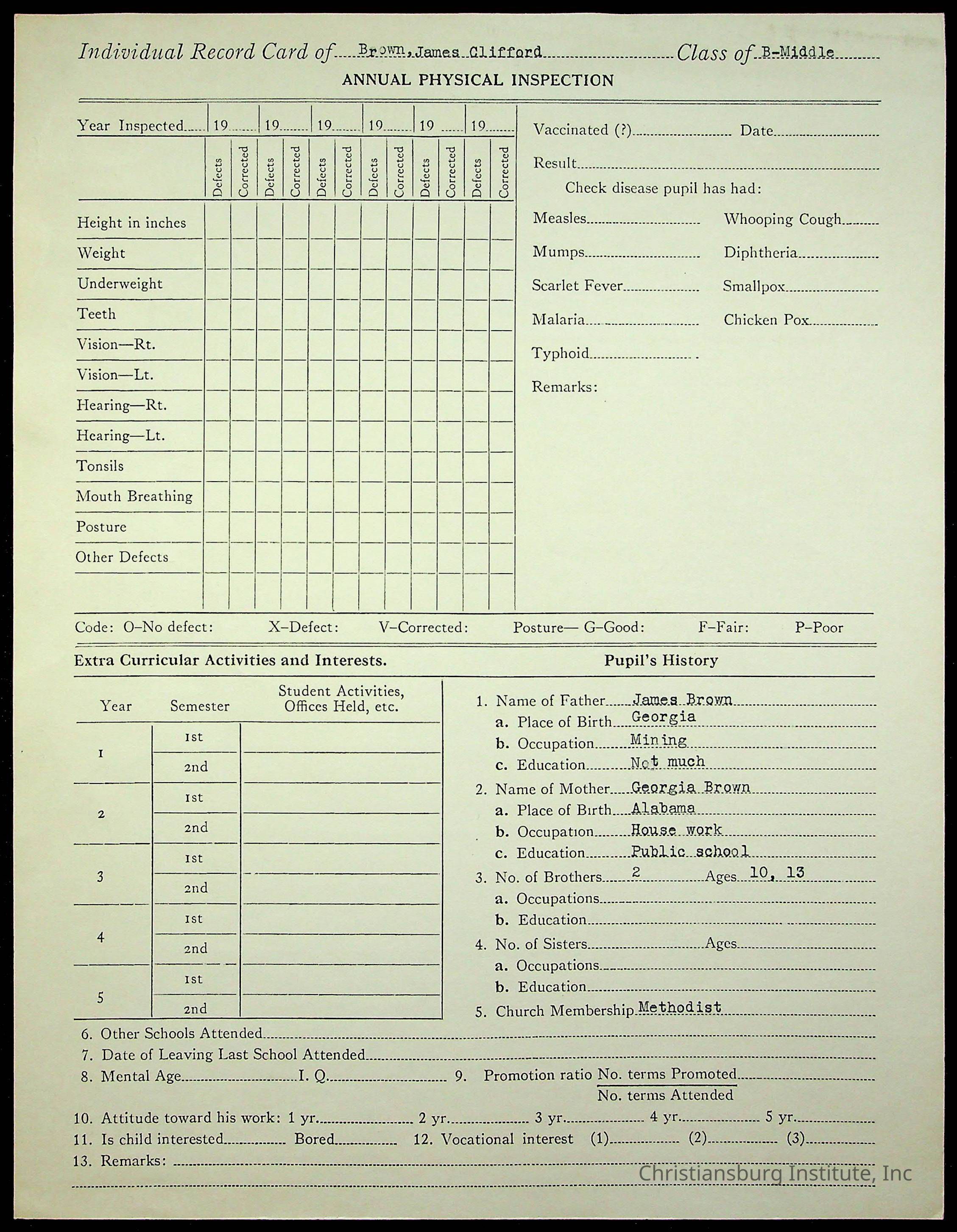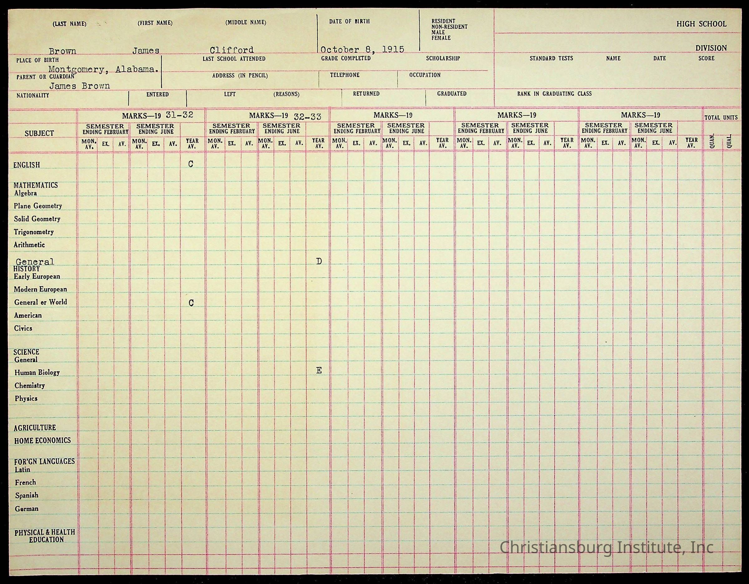 The student file for the Christiansburg Institute student, James Clifford Brown circa 1930s.