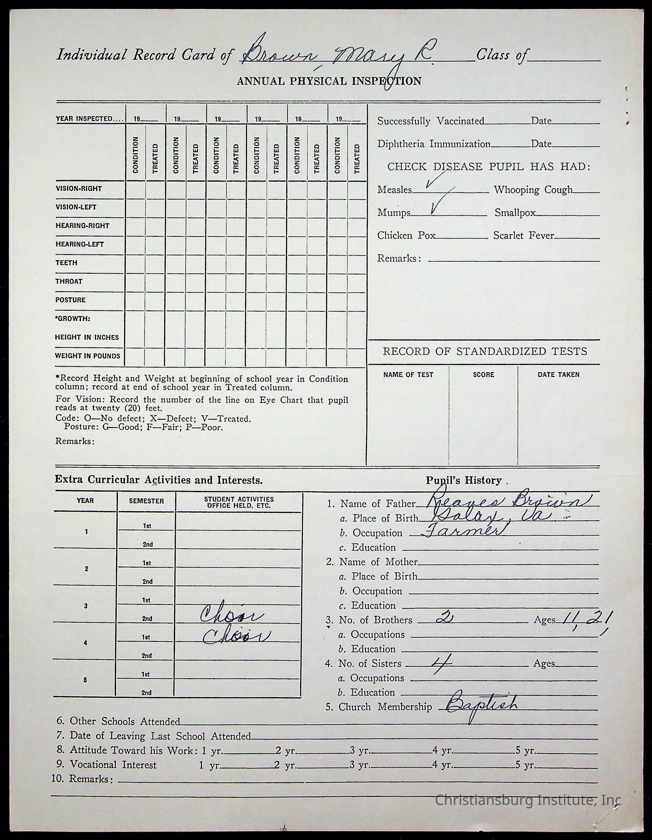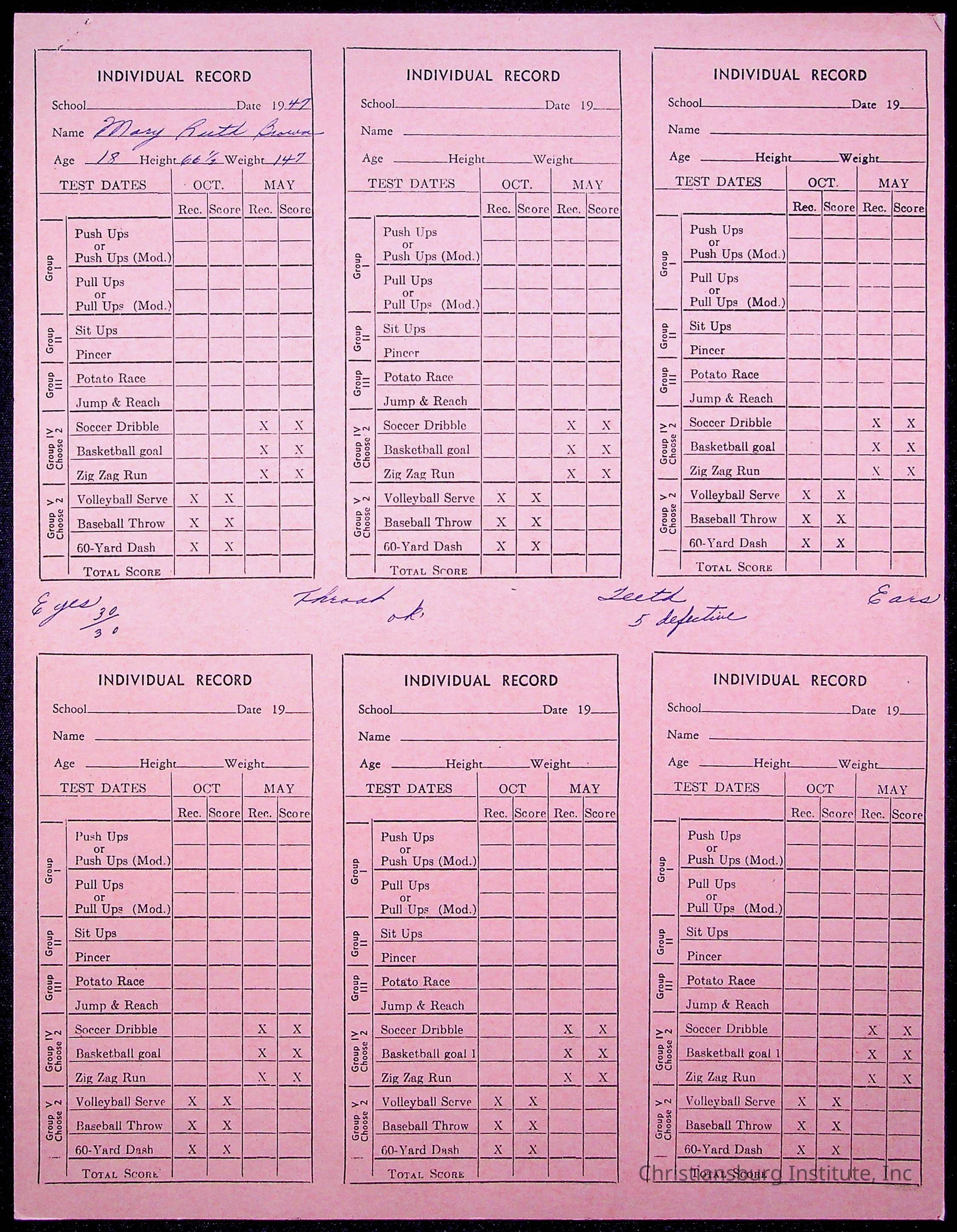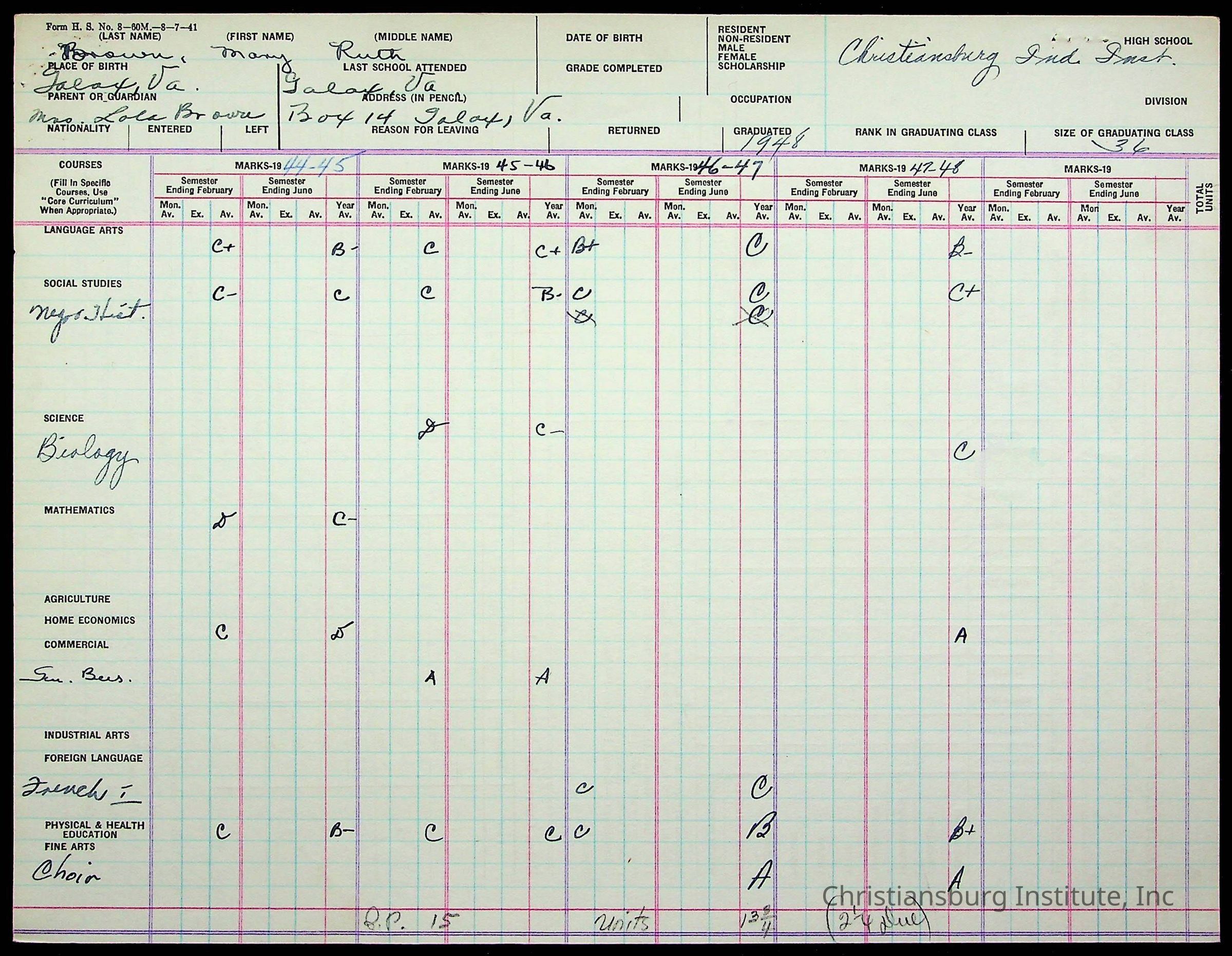 The student file for the Christiansburg Institute student, Mary Ruth Brown circa 1940s.