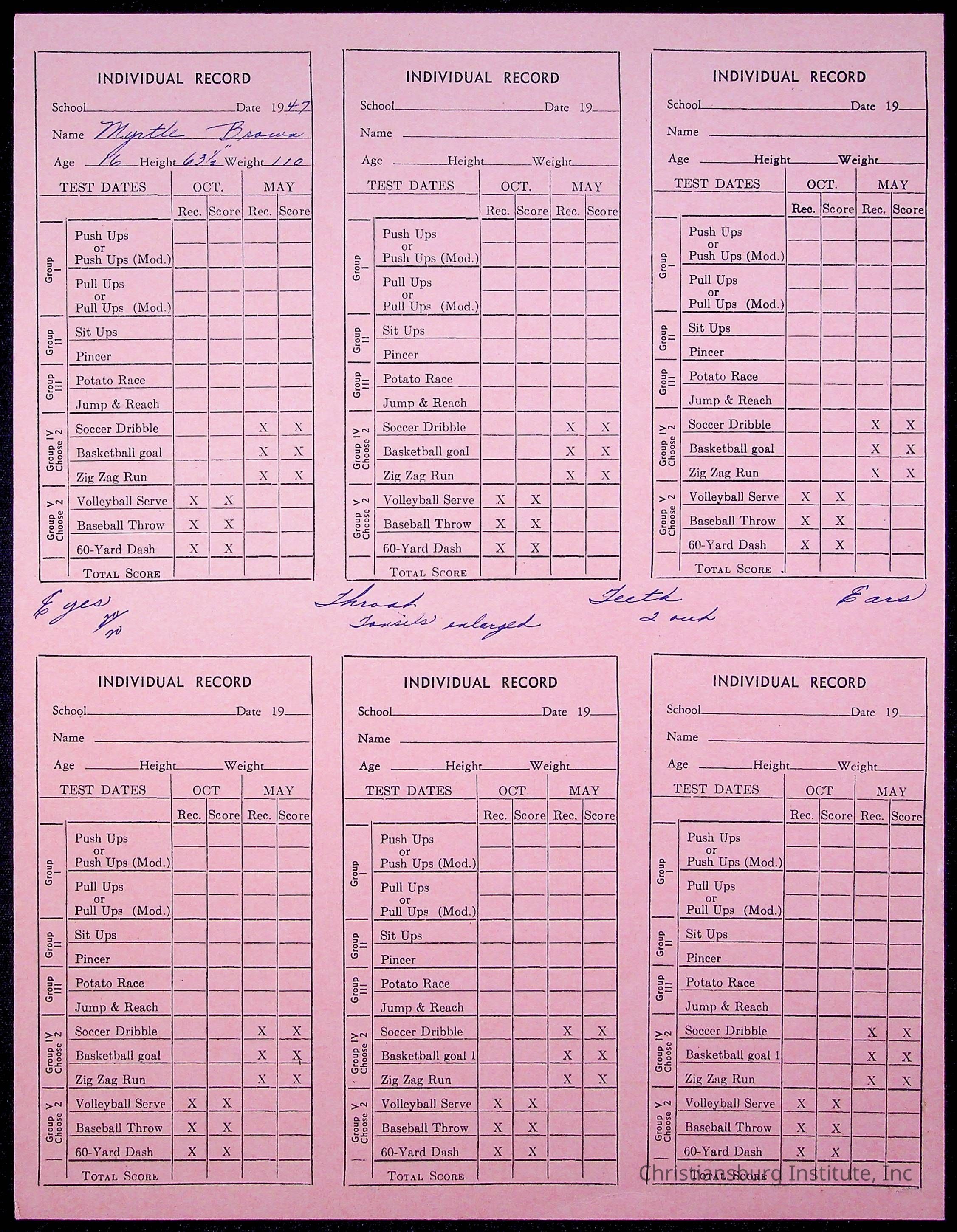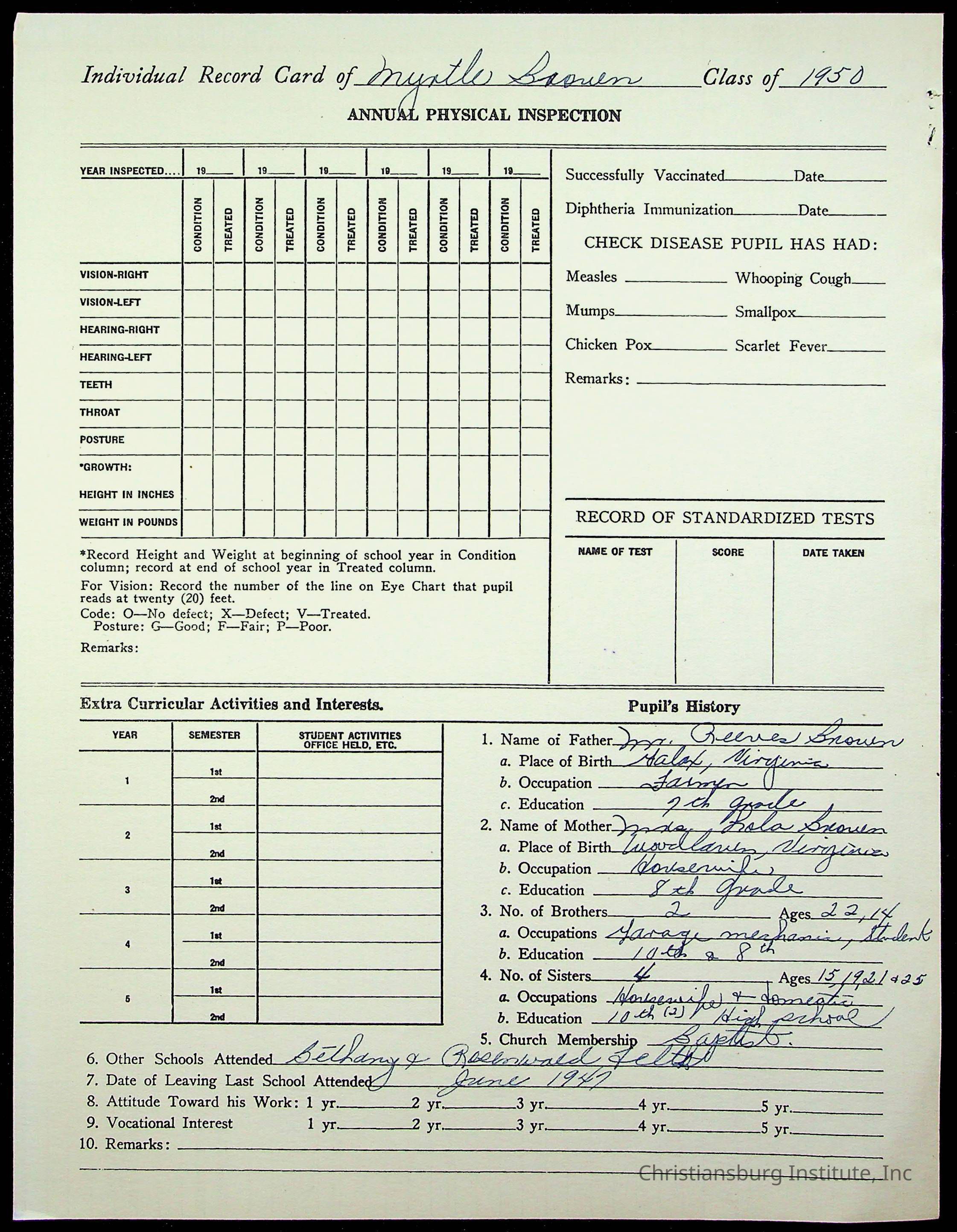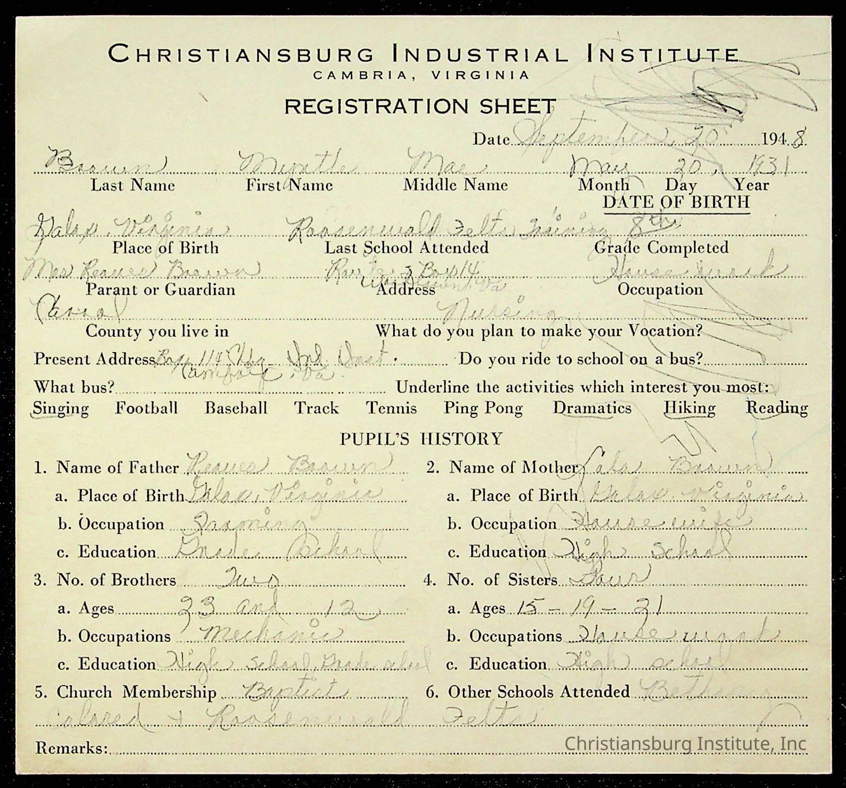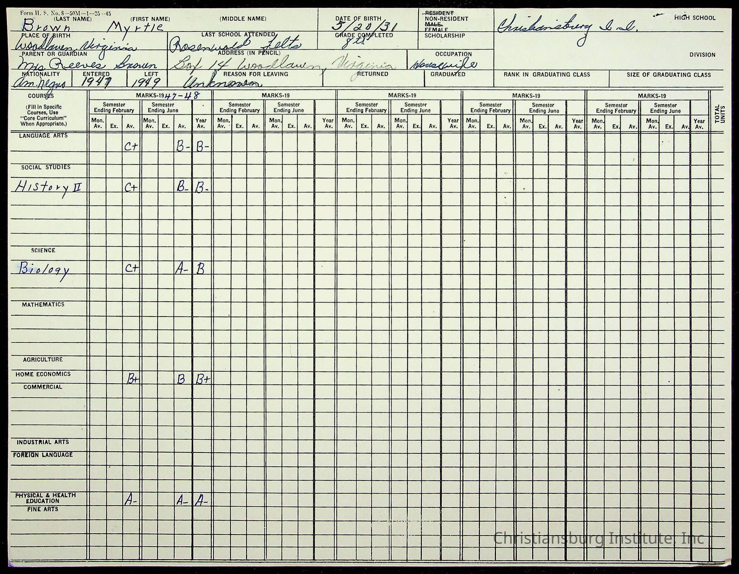 The student file for the Christiansburg Institute student, Myrtle Brown circa 1940s.