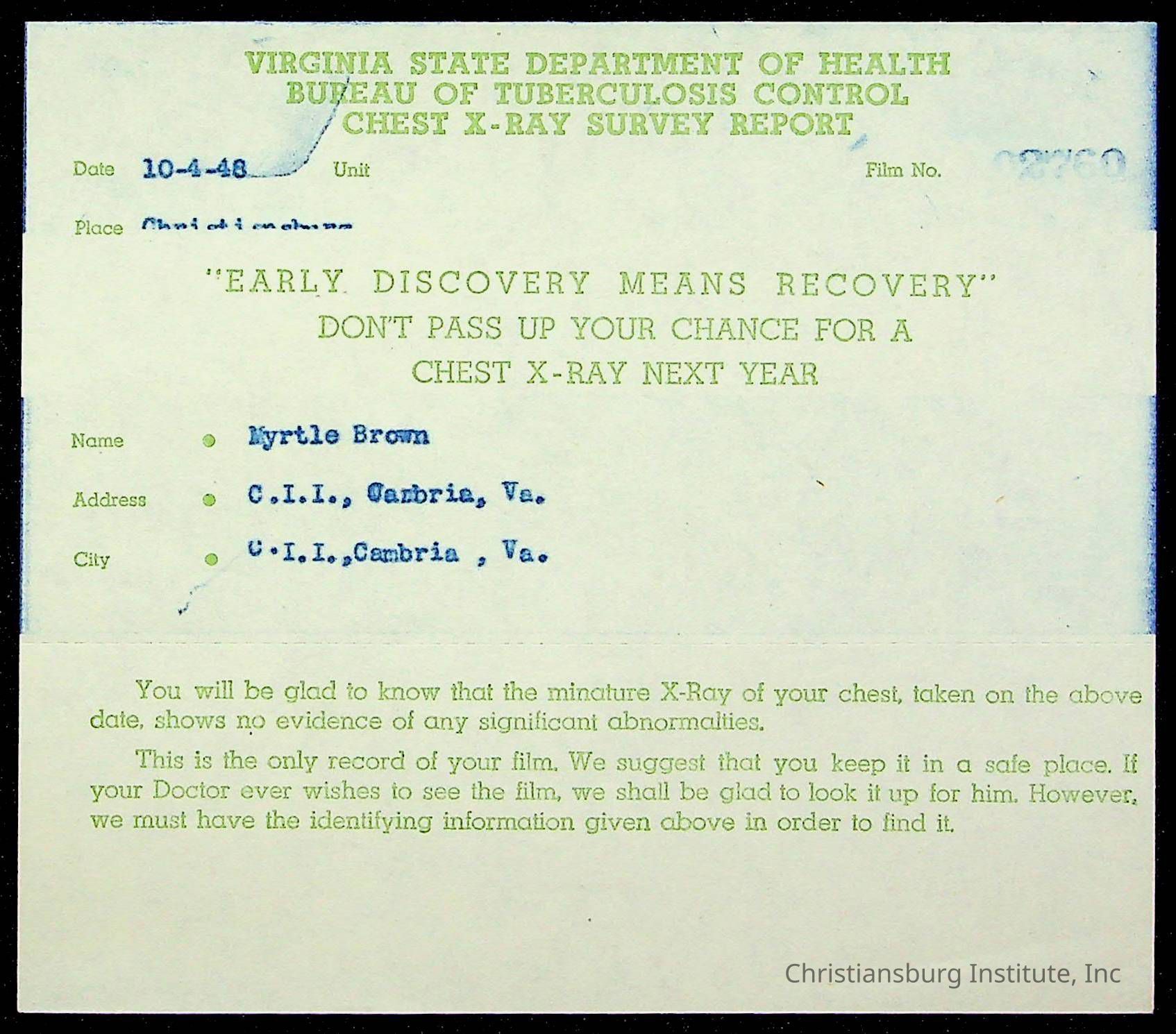 Copyright has been assigned to Christiansburg Institute Museum & Archives by Montgomery County Public Schools. For permission to publish materials created by the donor, contact CIMA@christiansburginstitute.com. Materials not created by Christiansburg Industrial Institute may still be under copyright.