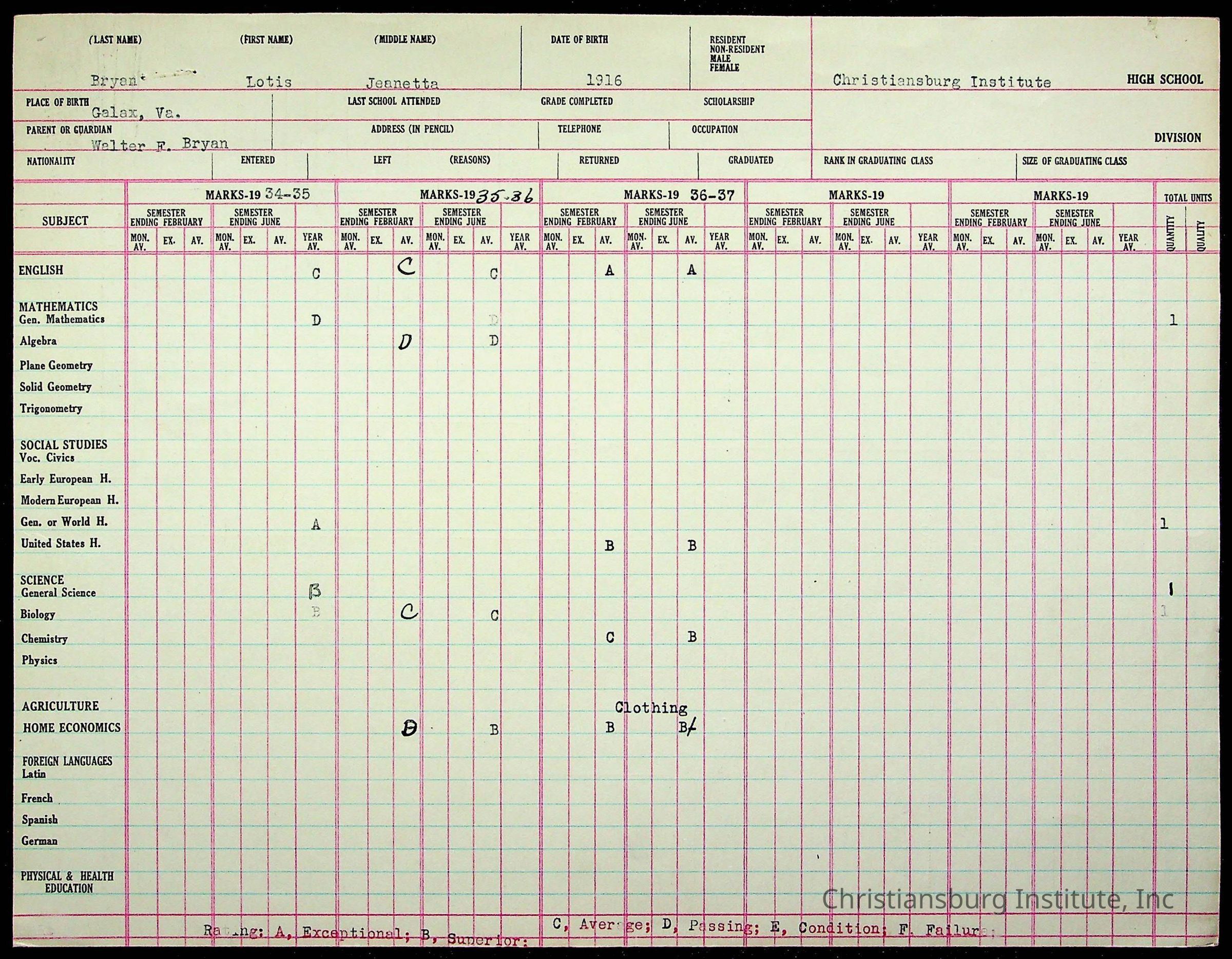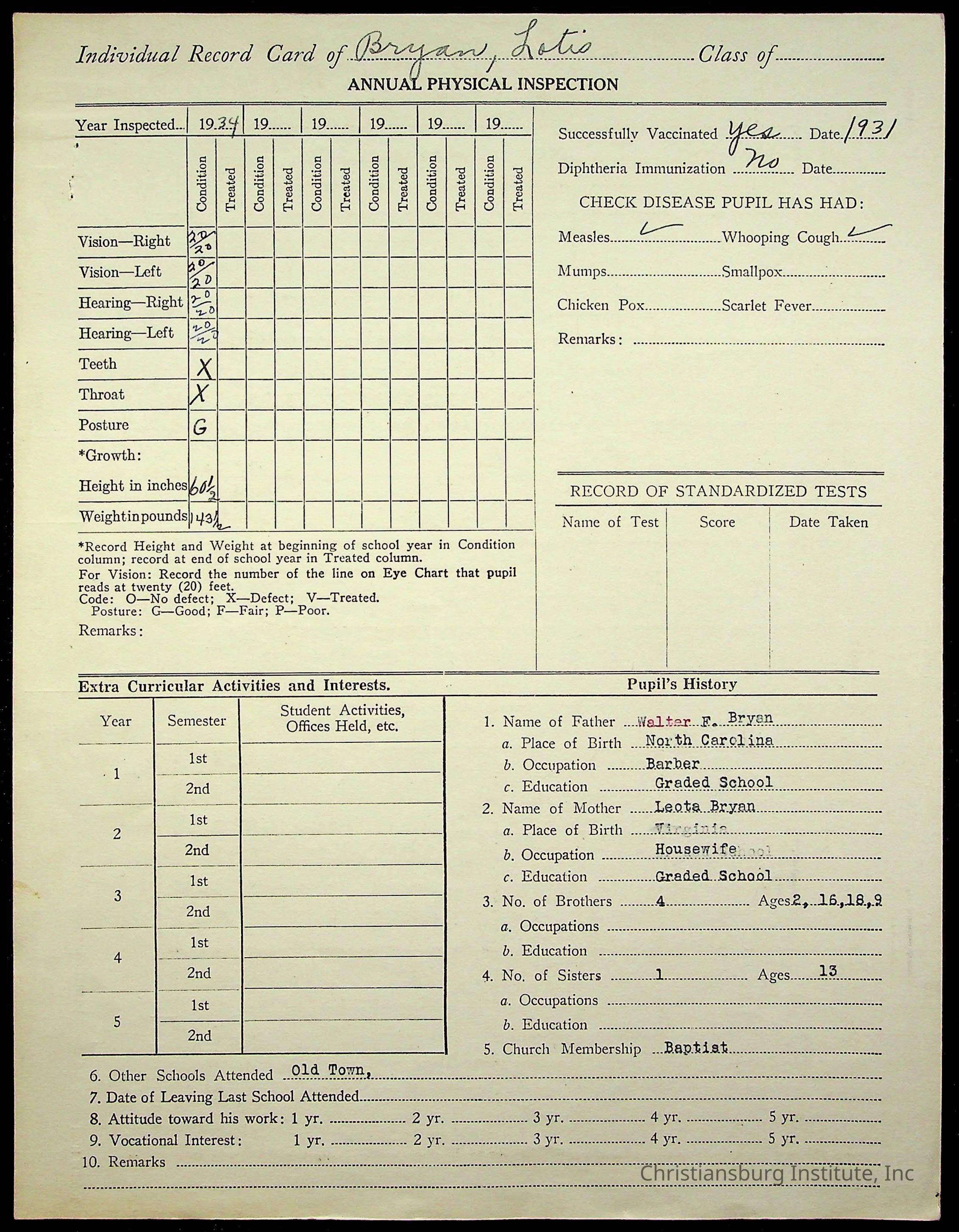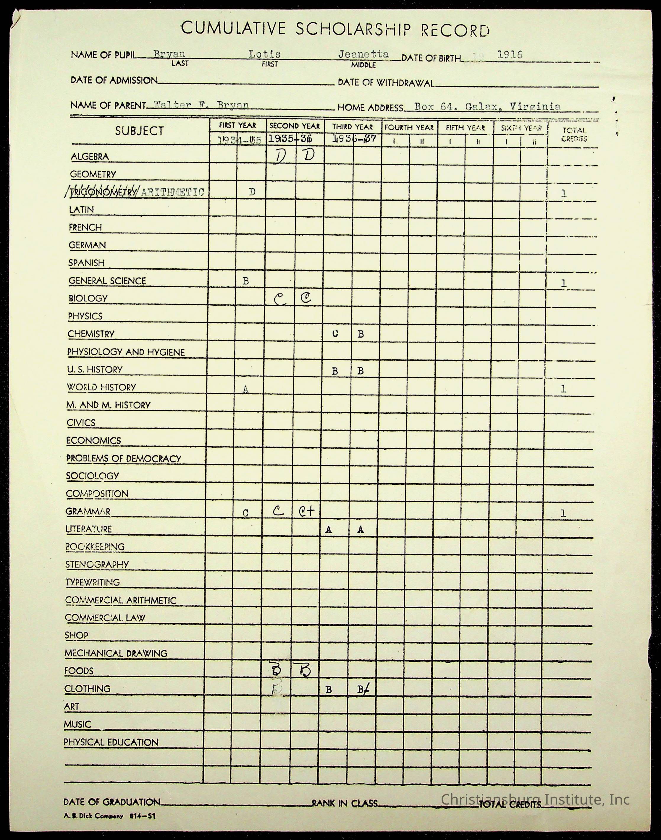 The student file for the Christiansburg Institute student, Lotis Bryan circa 1930s.