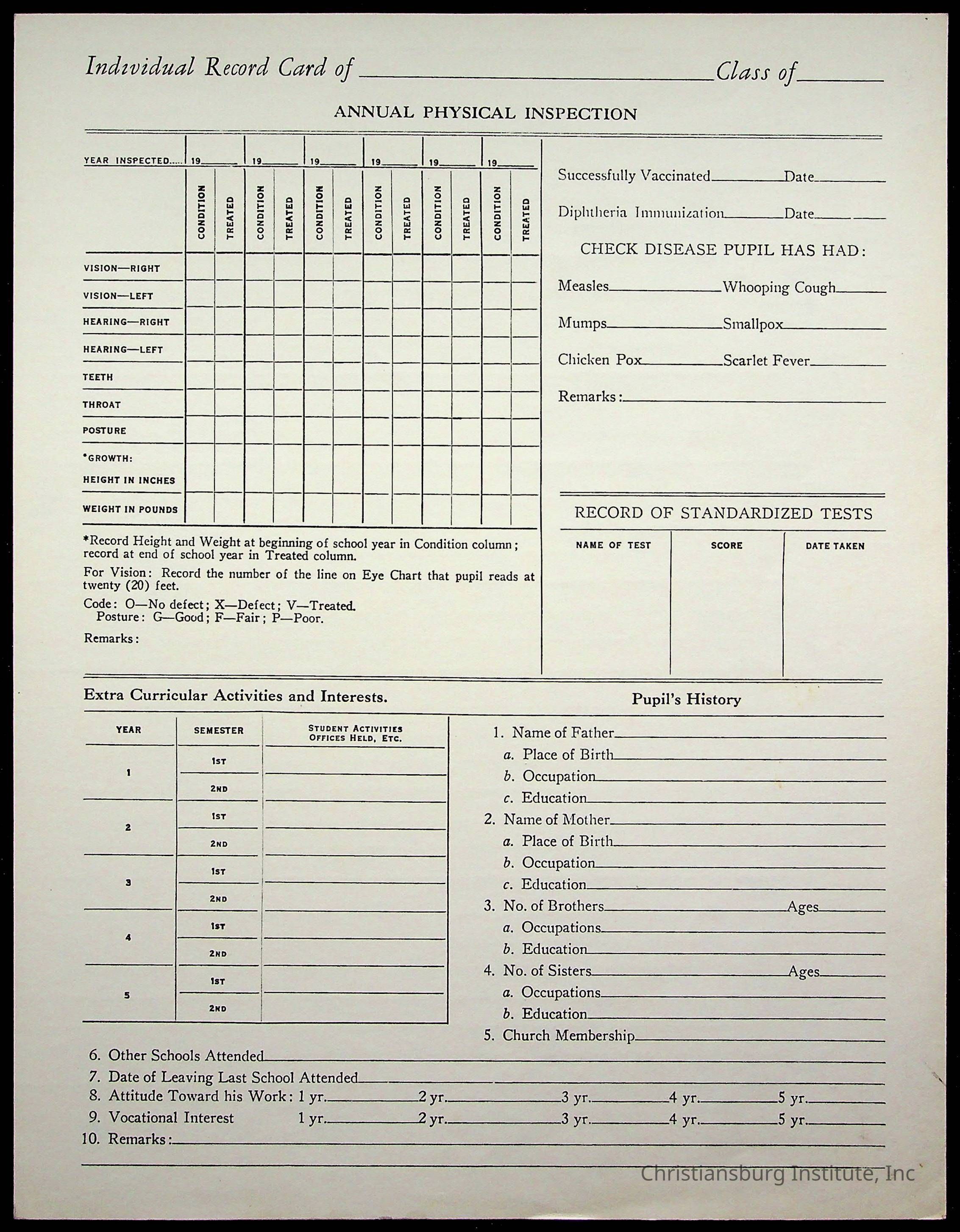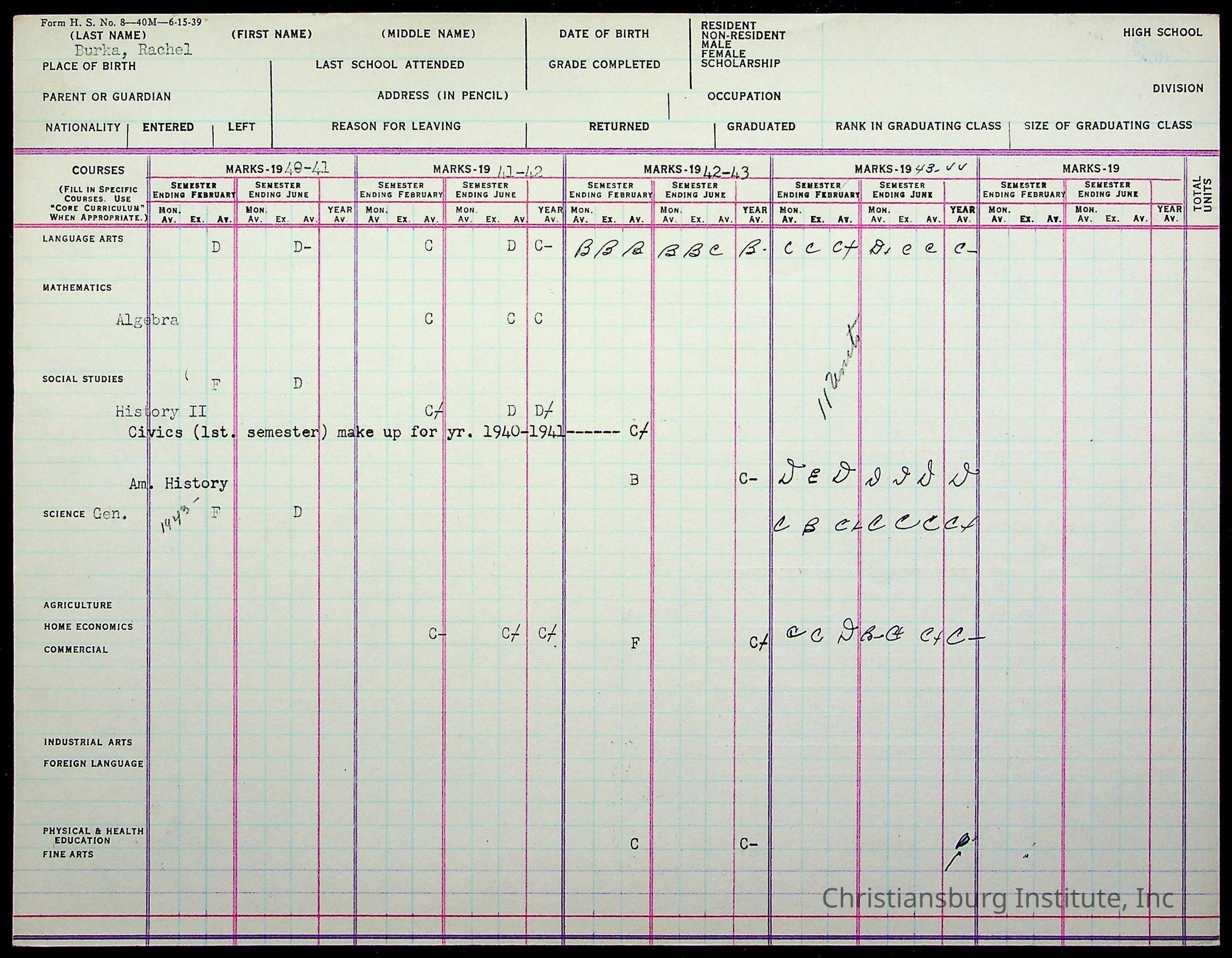 The student file for the Christiansburg Institute student, Rachel Burka circa 1940s.