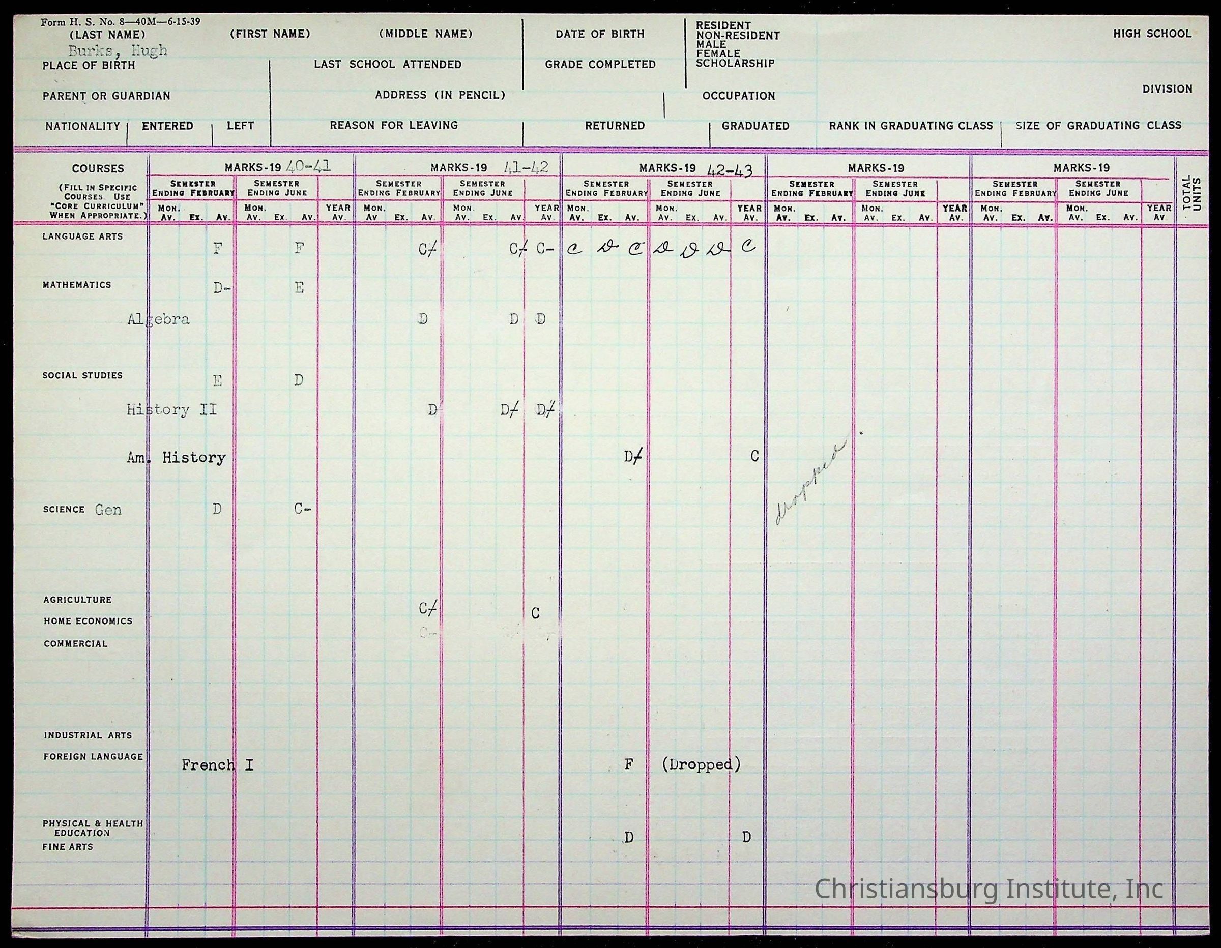 The student file for the Christiansburg Institute student, Hugh Burks circa 1940s.
