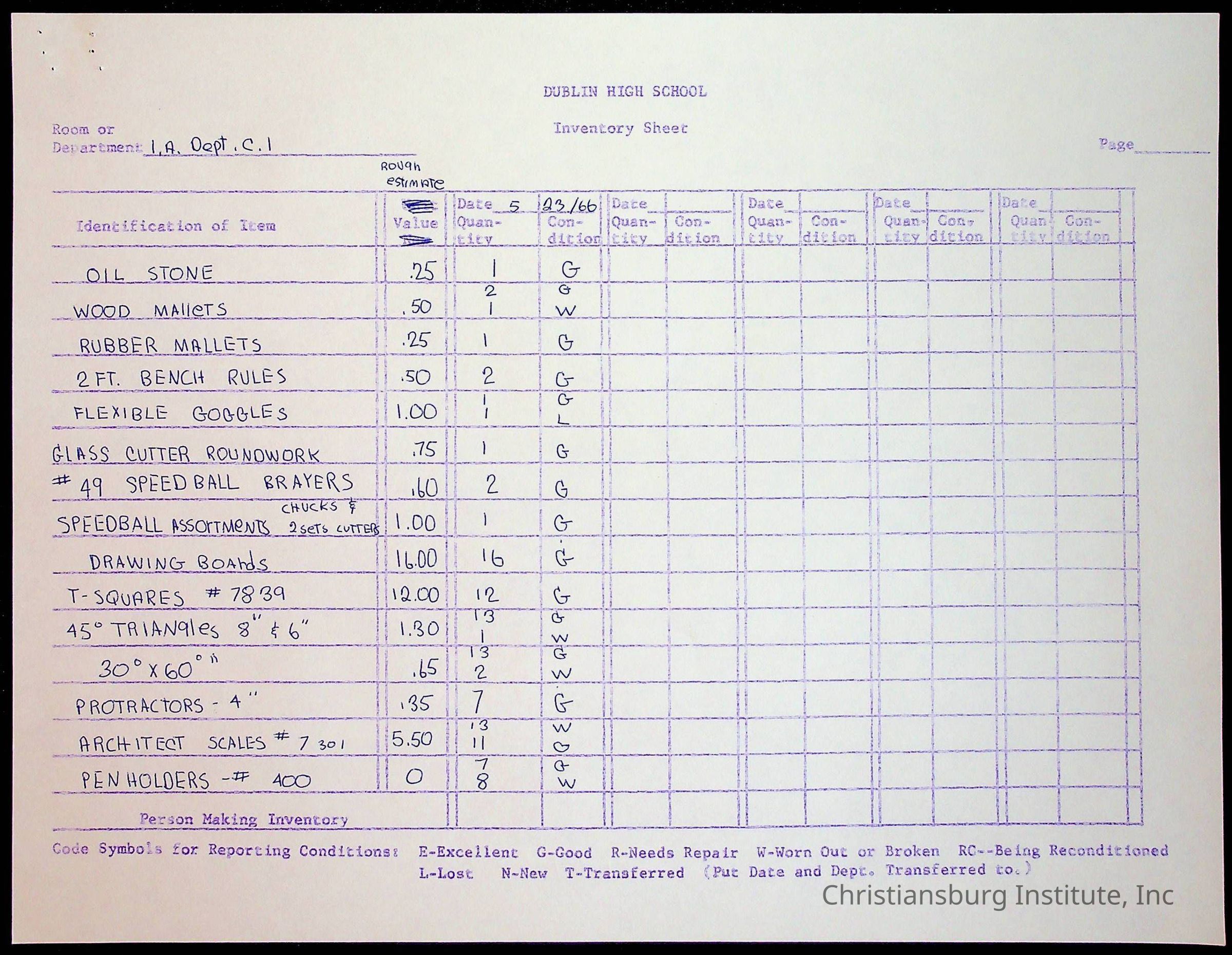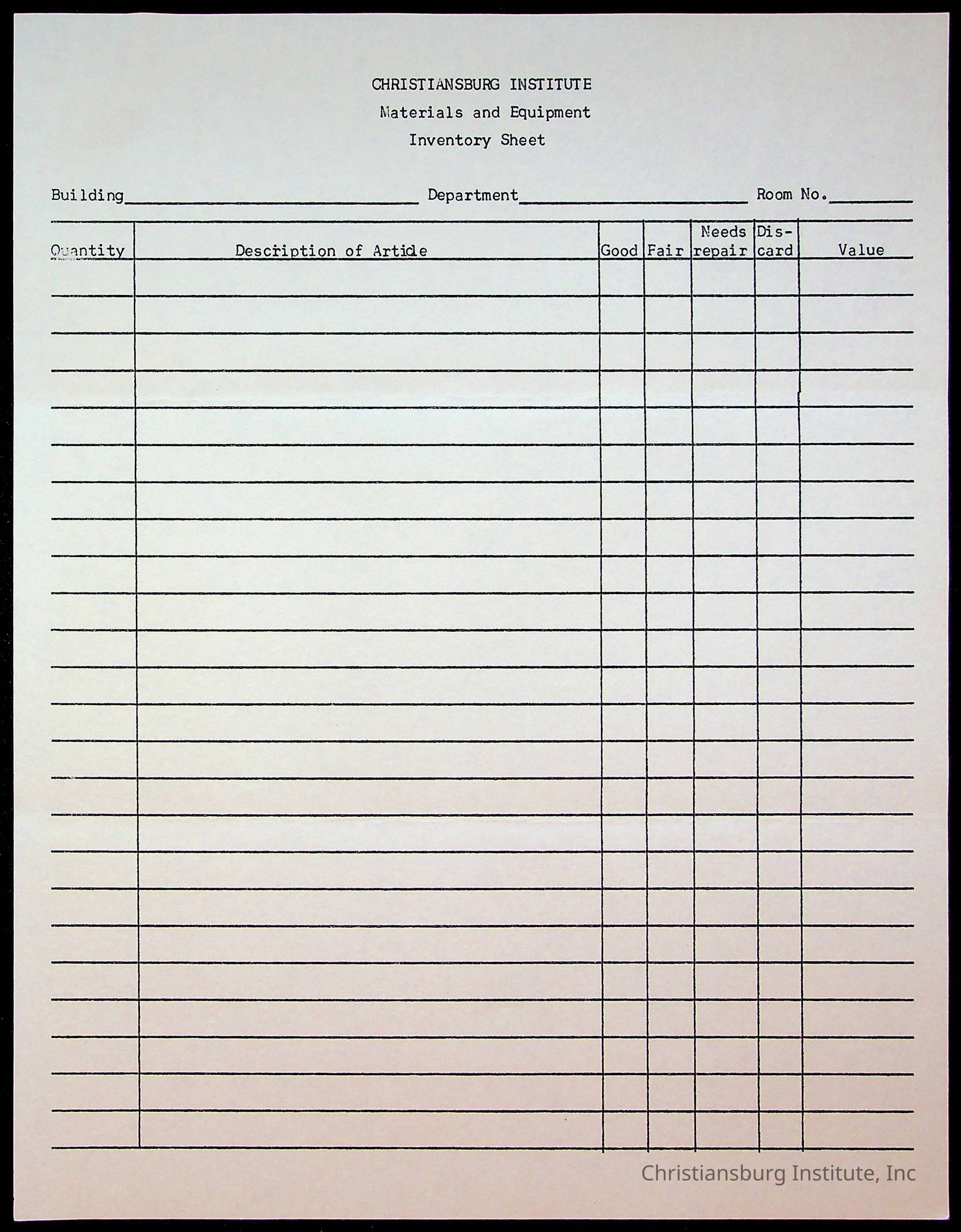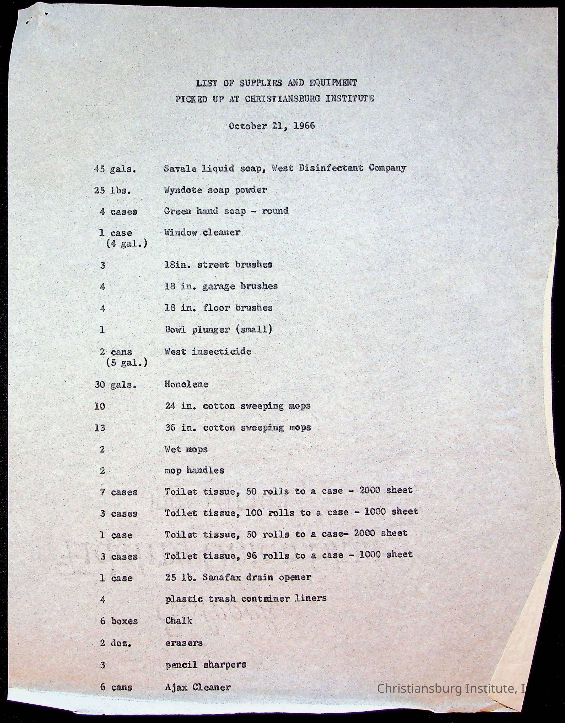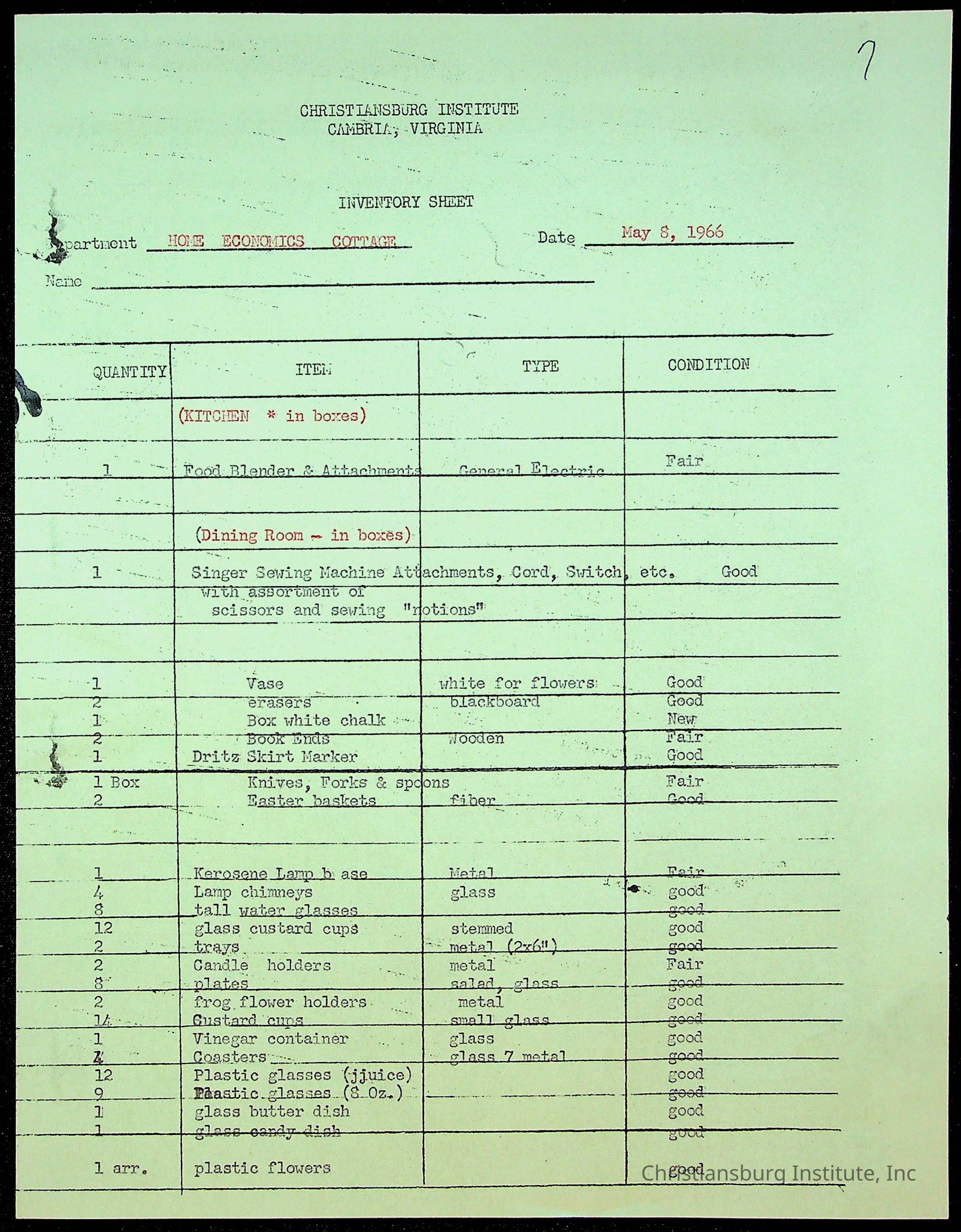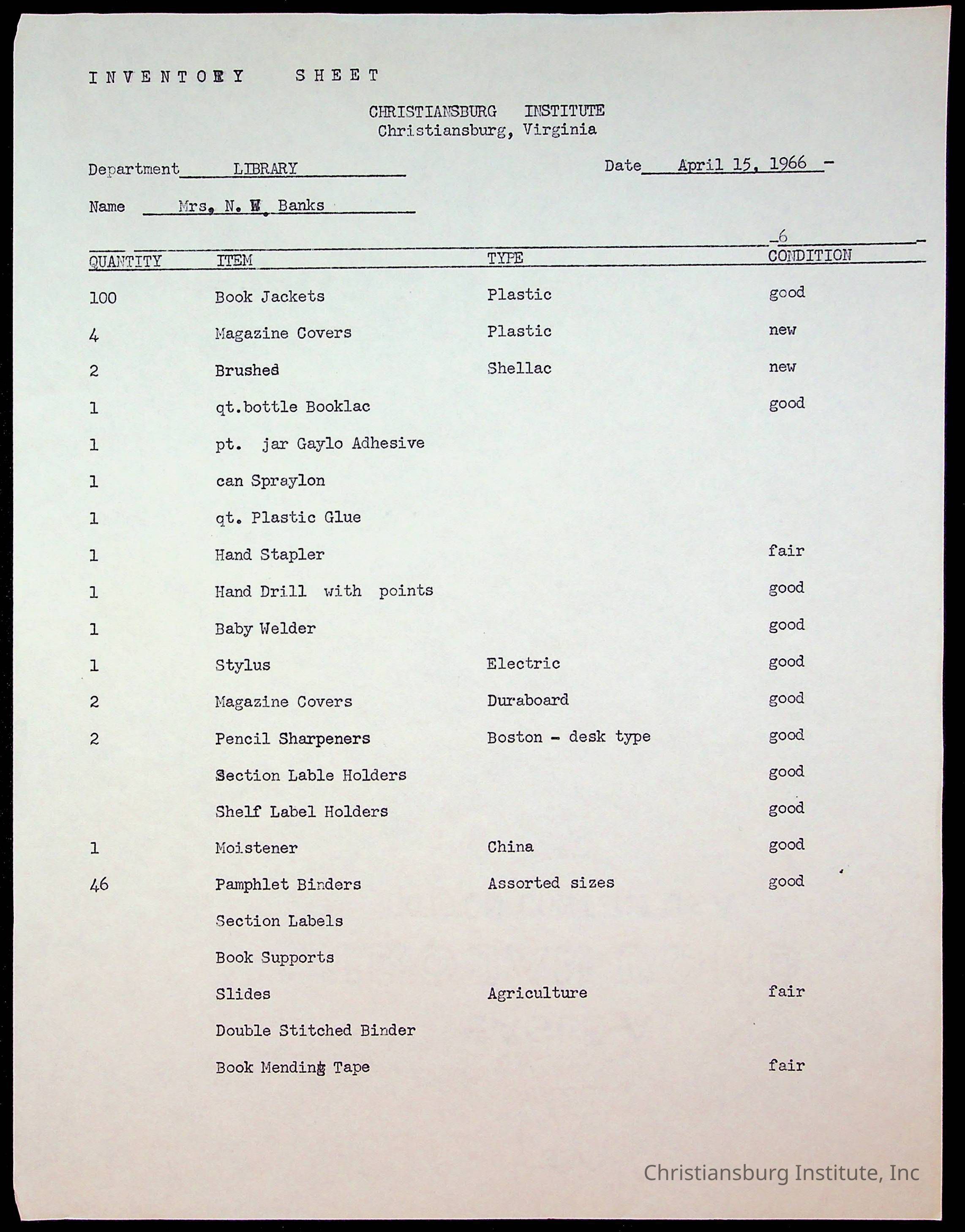 An archive of inventory sheets documenting Christiansburg Institute's inventory in the year 1966.