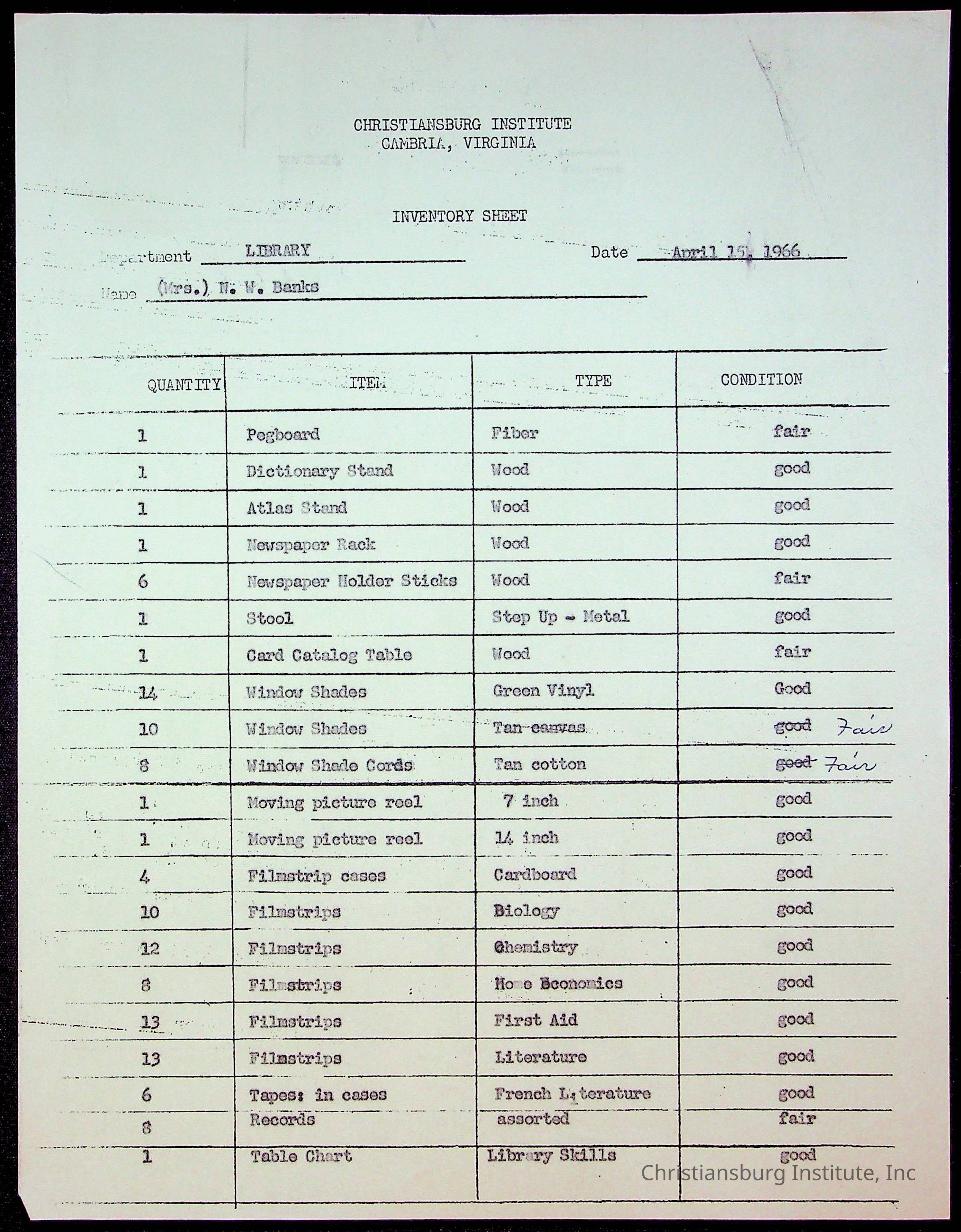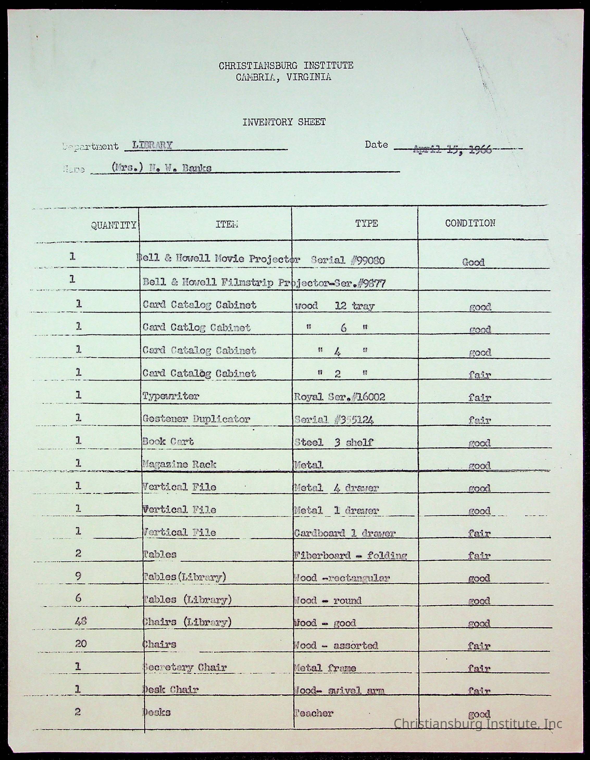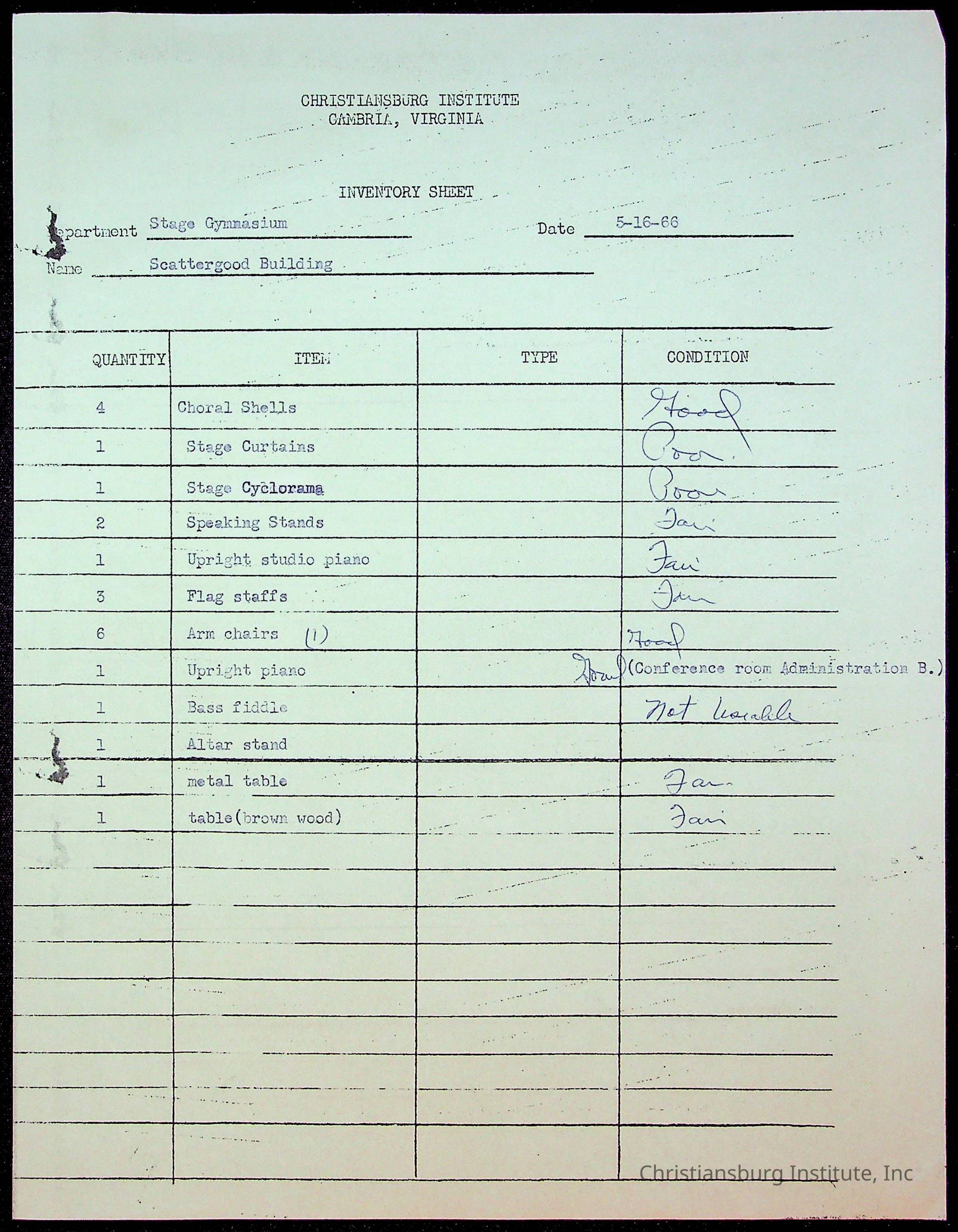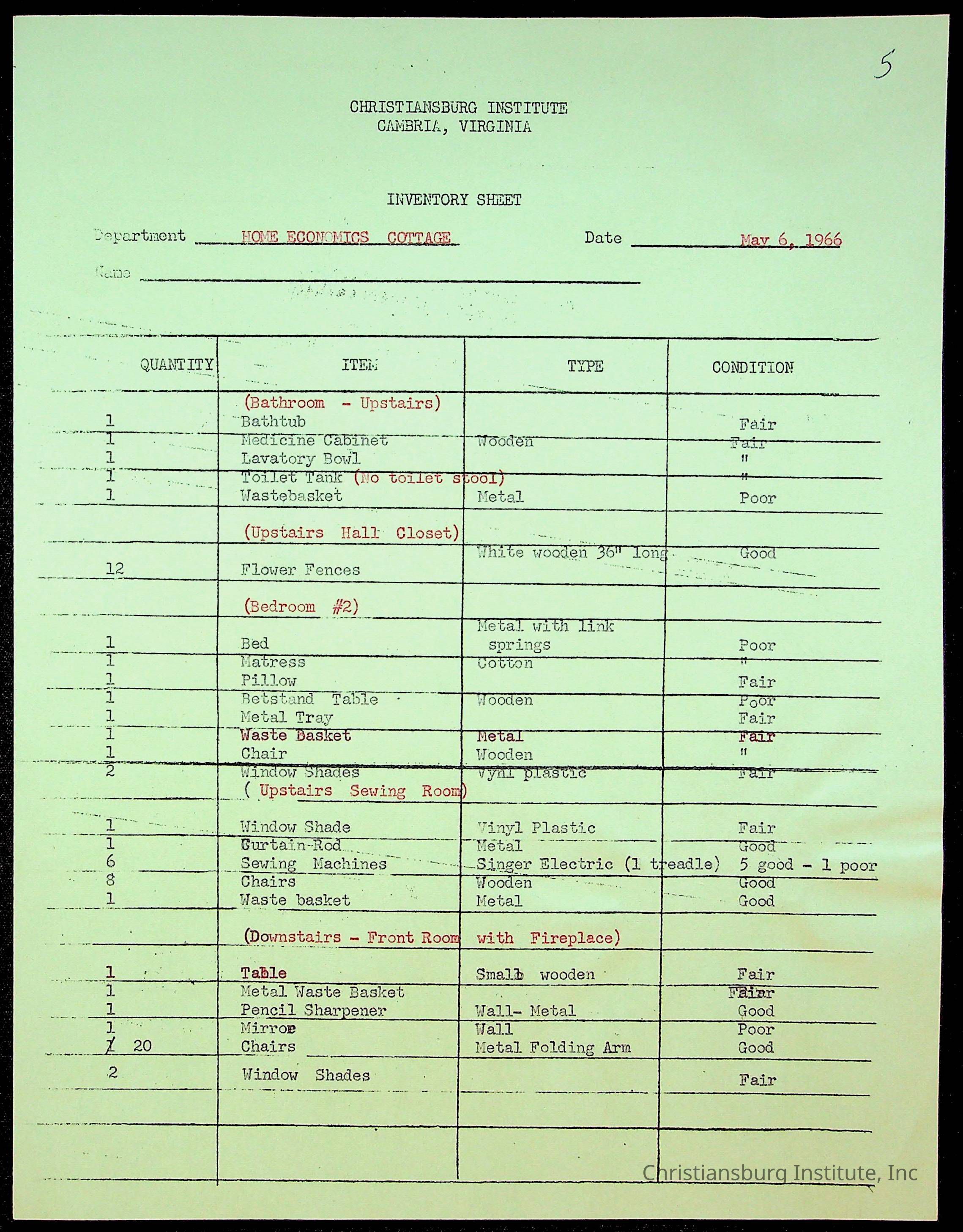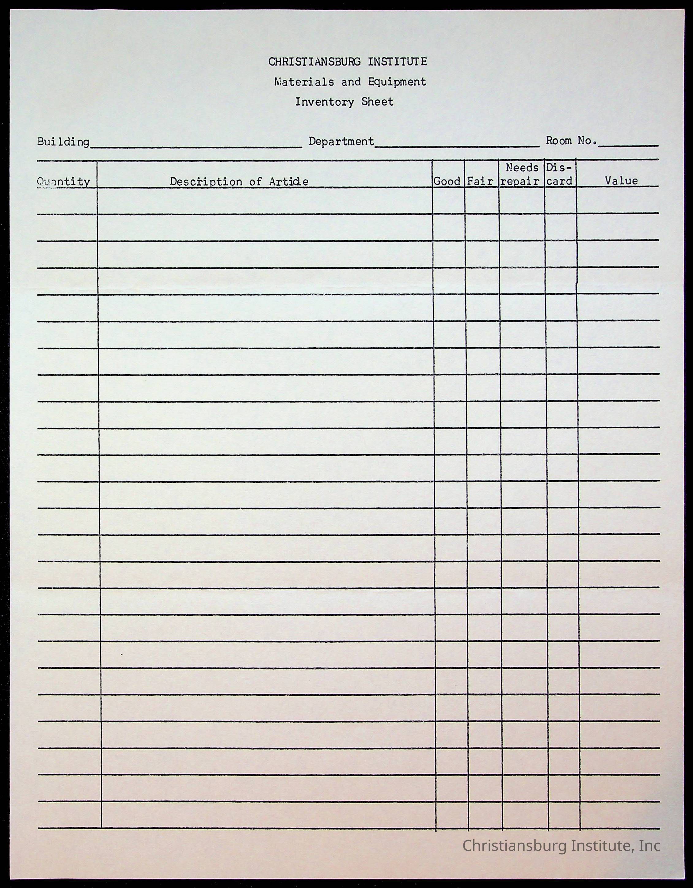 An archive of inventory sheets documenting Christiansburg Institute's inventory in the year 1966.