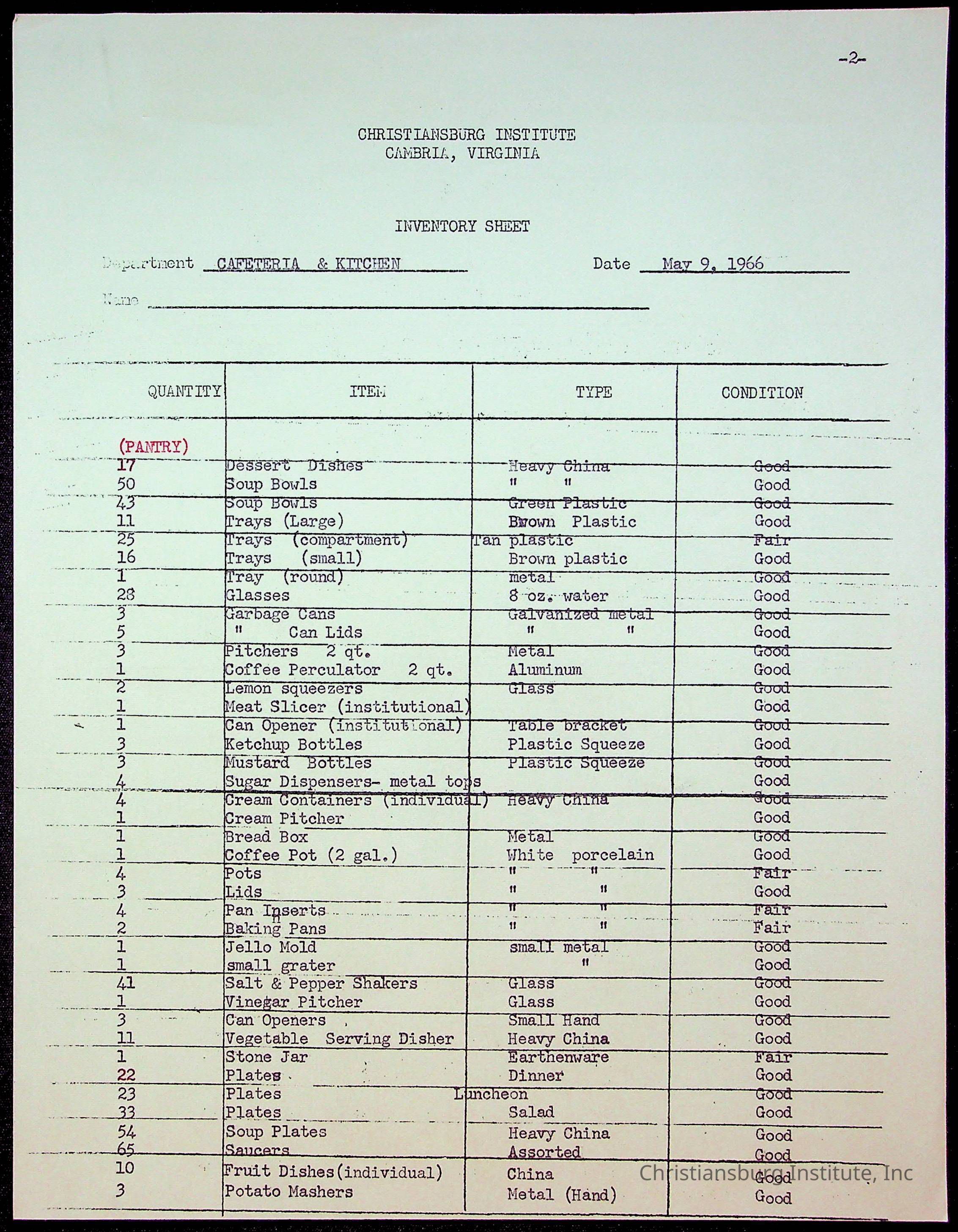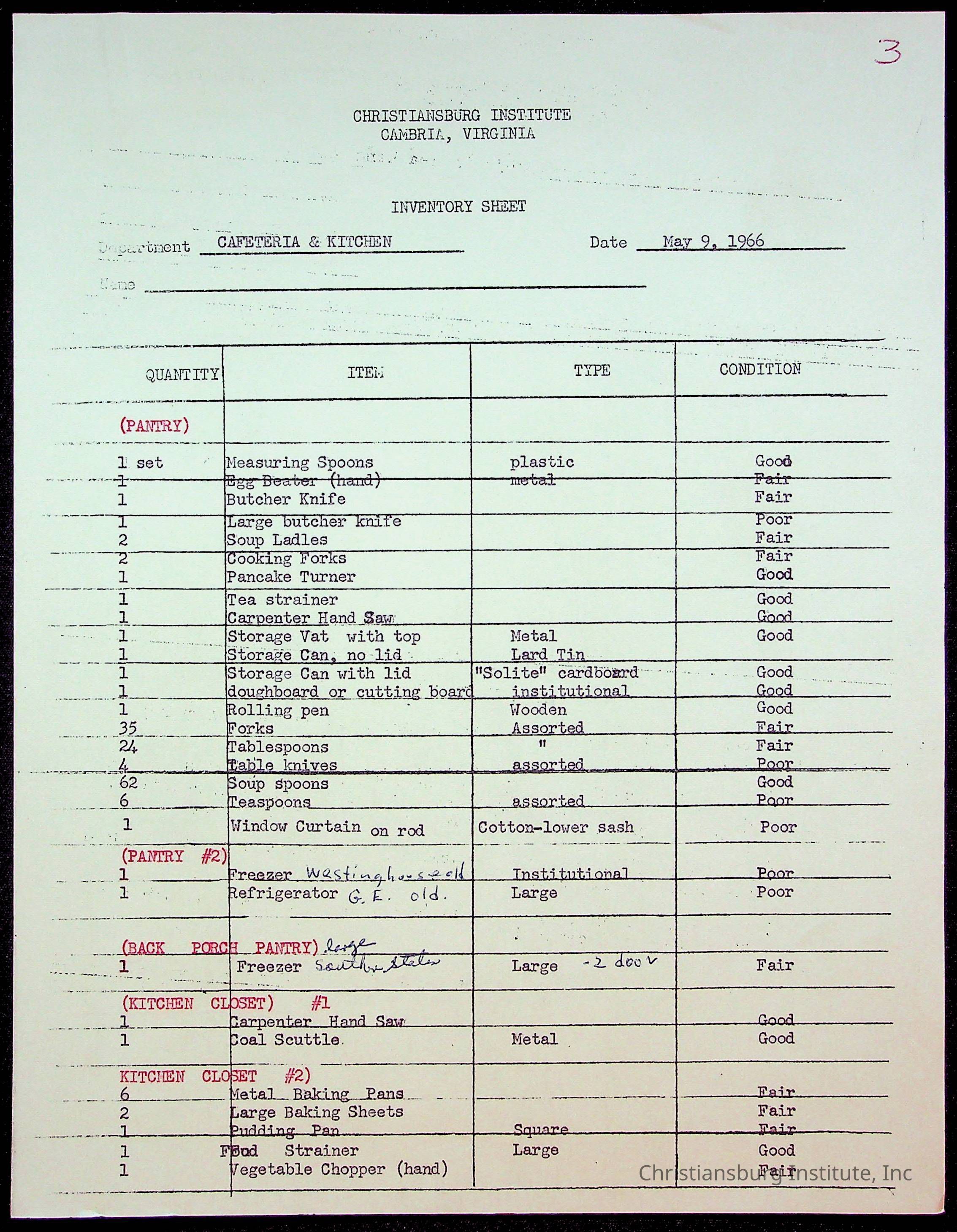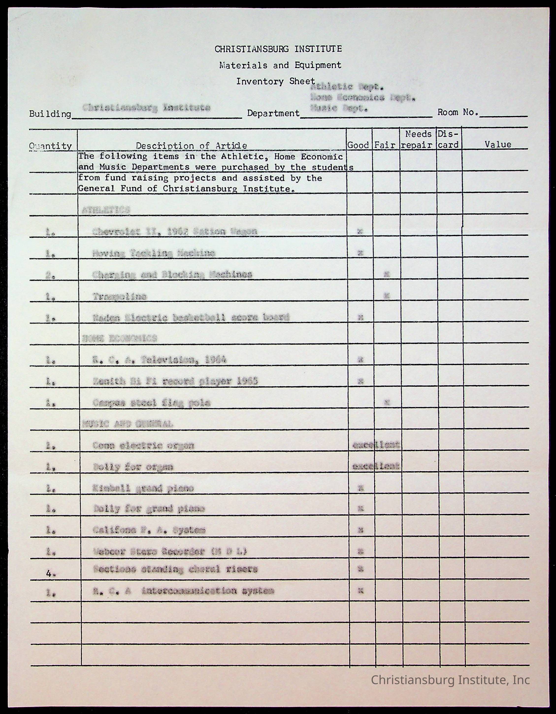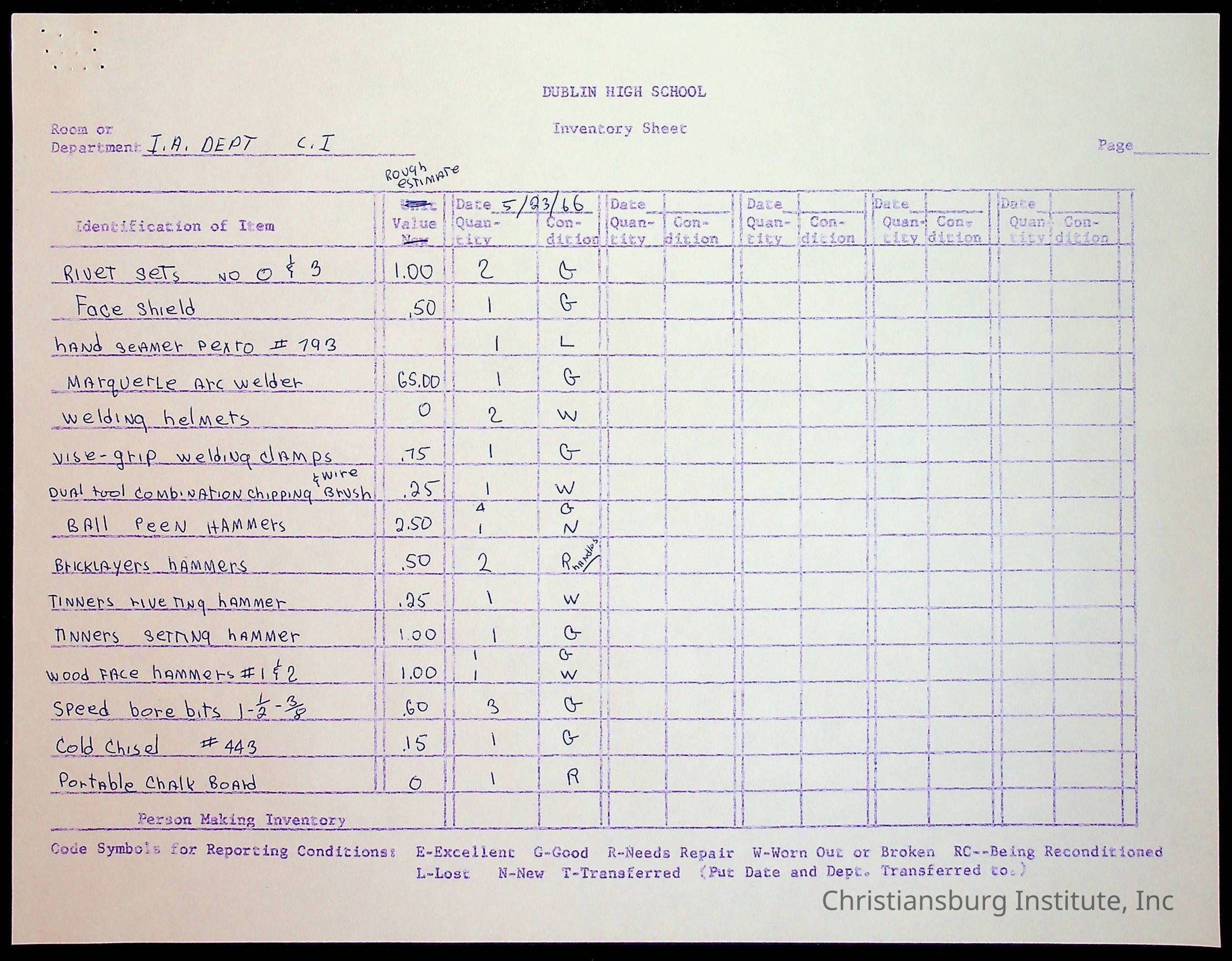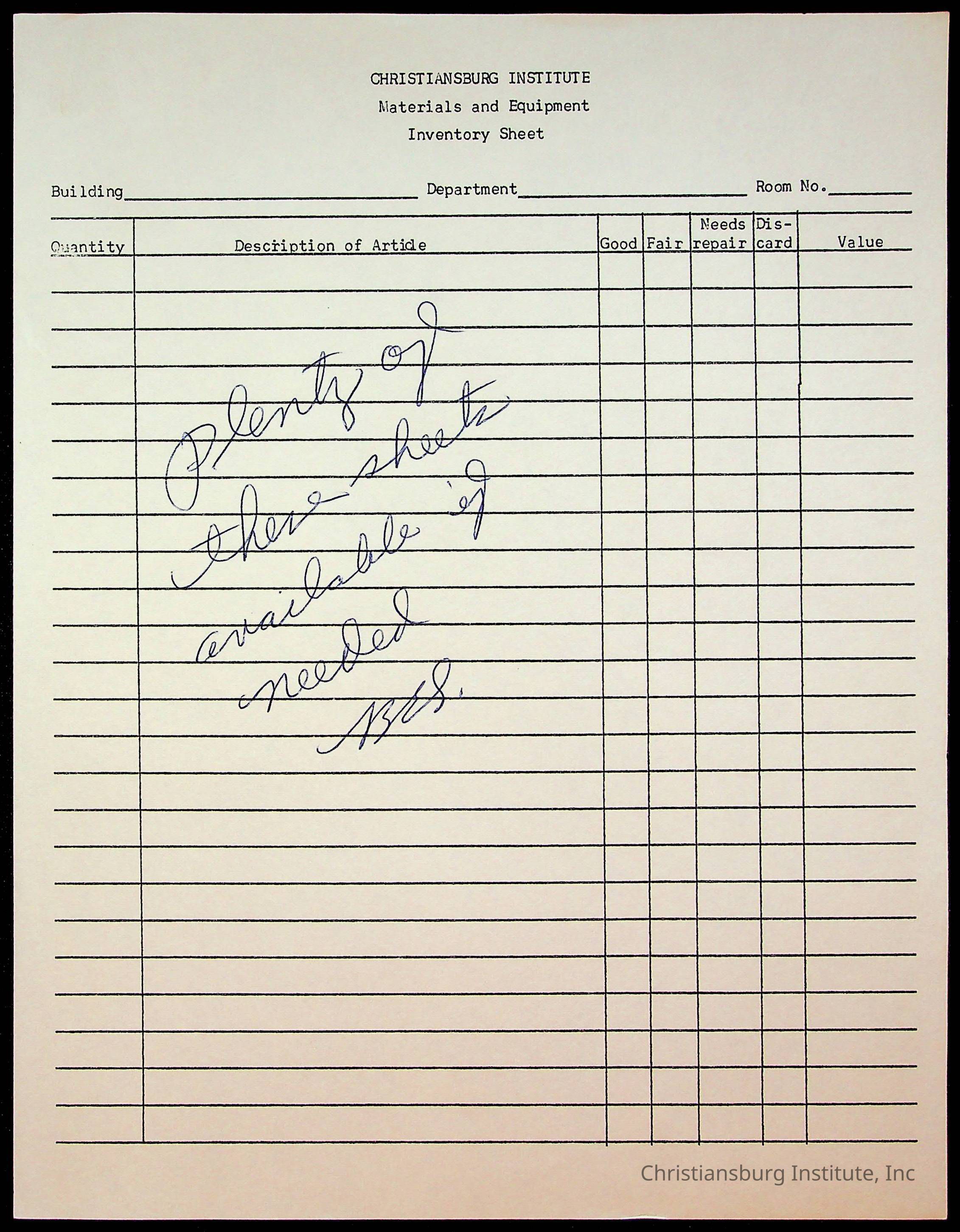 An archive of inventory sheets documenting Christiansburg Institute's inventory in the year 1966.