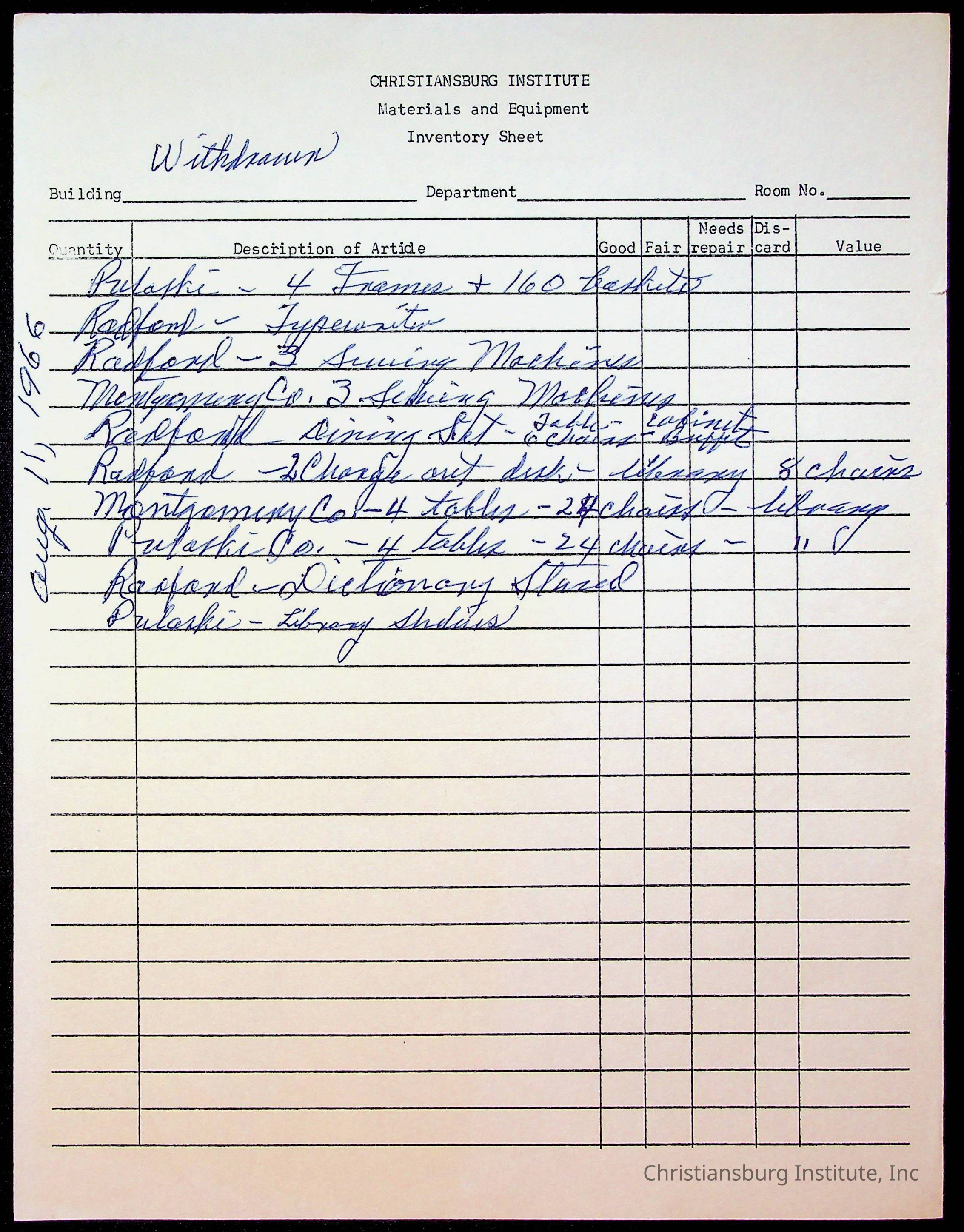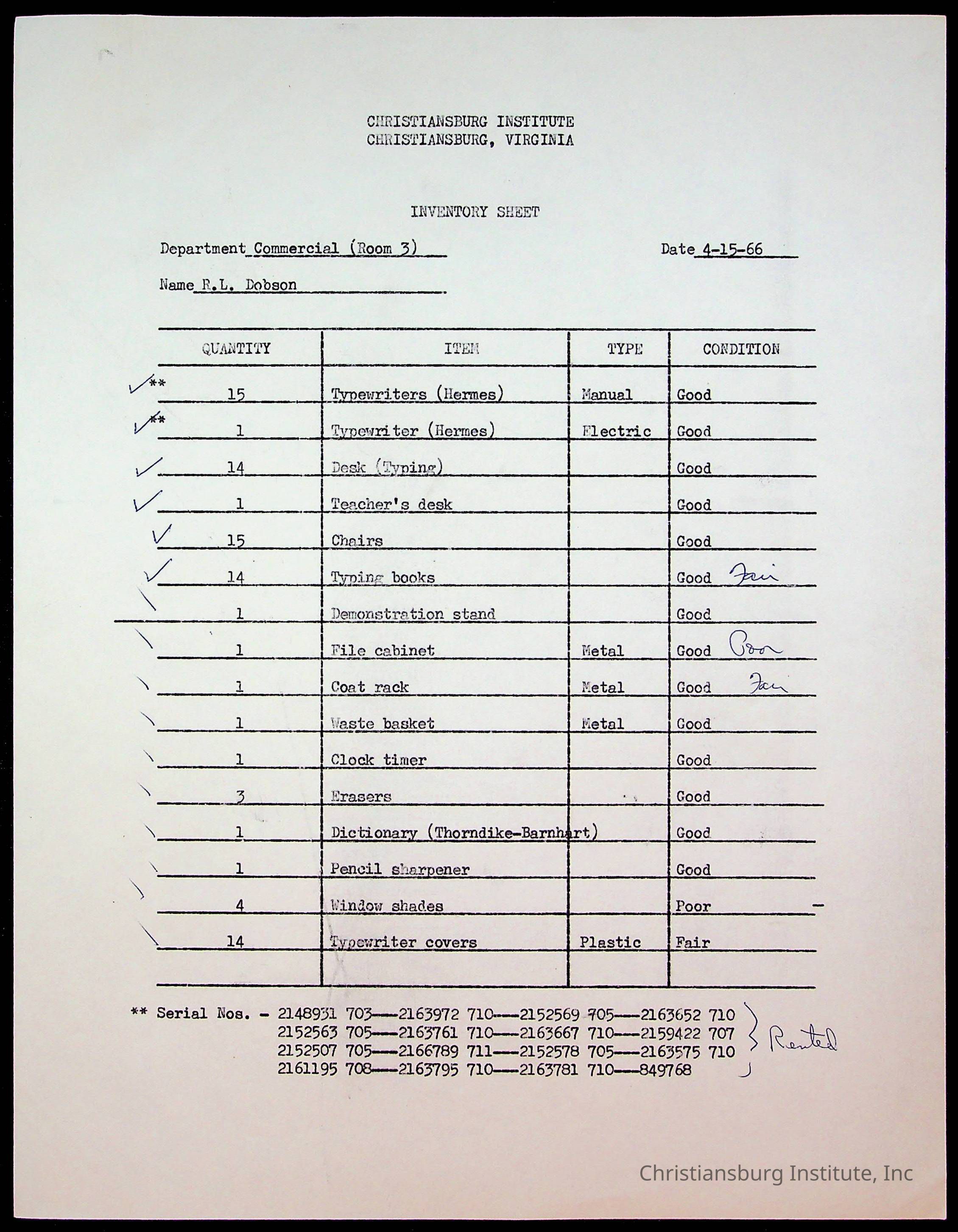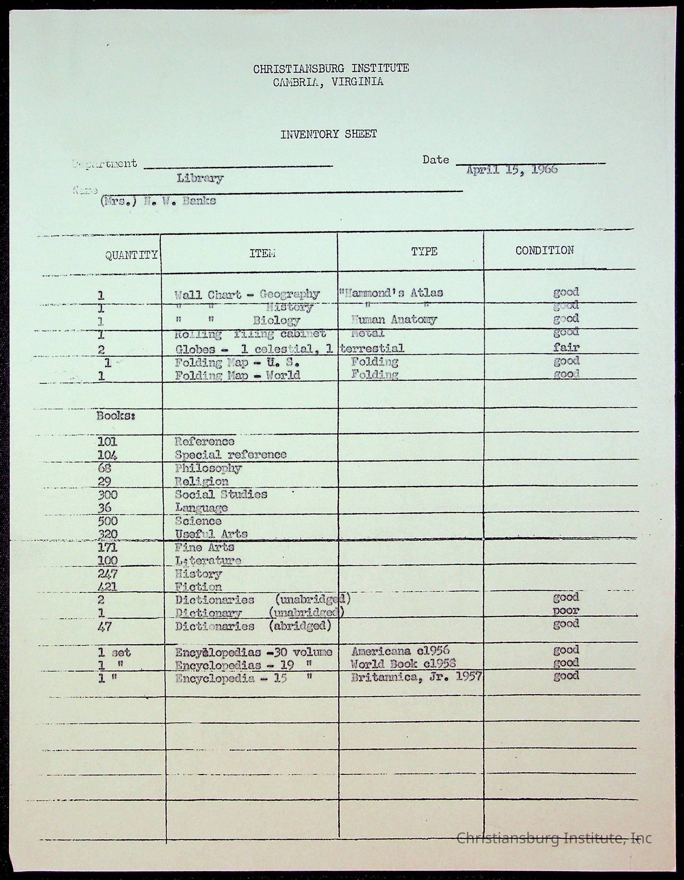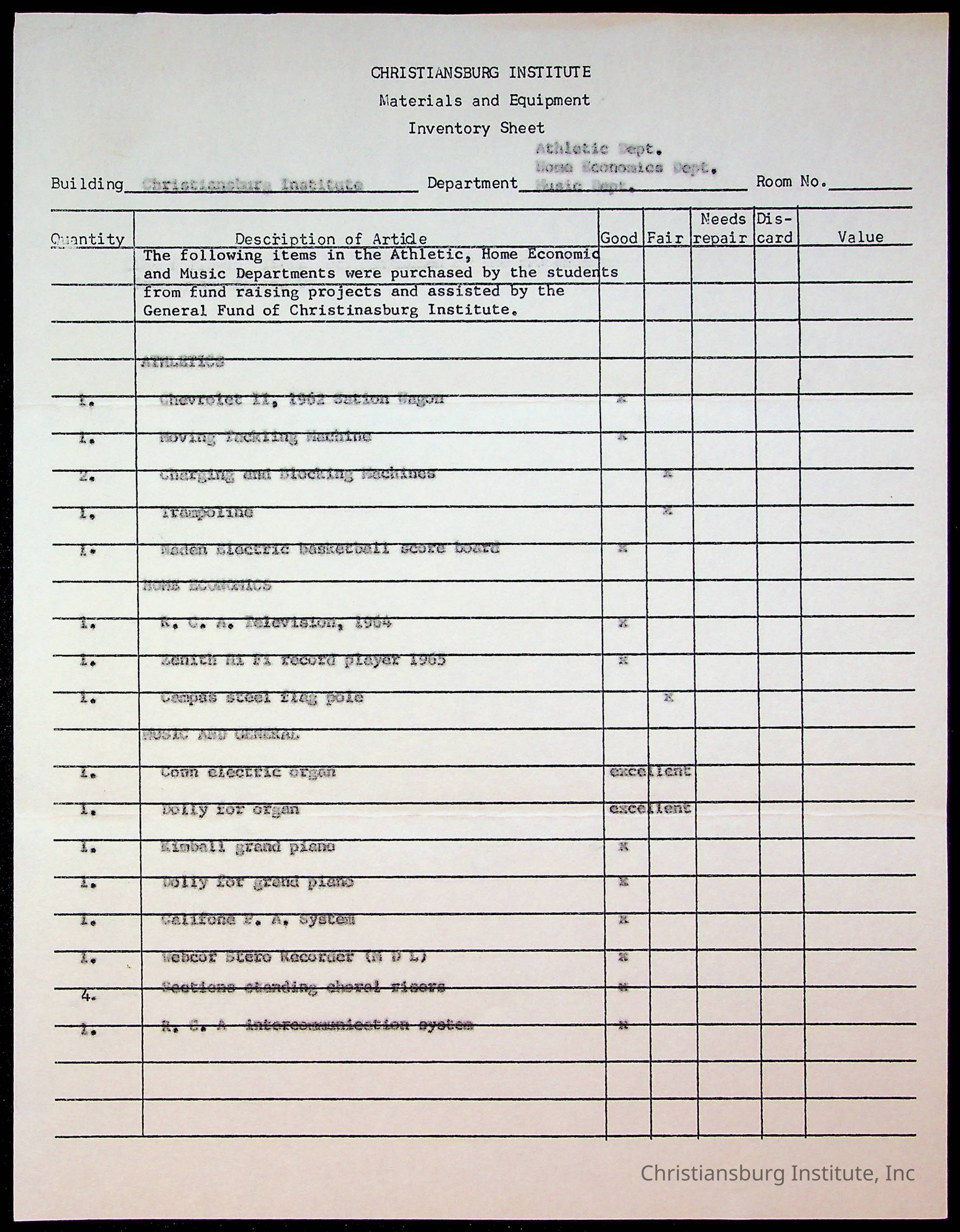 An archive of inventory sheets documenting Christiansburg Institute's inventory in the year 1966.
