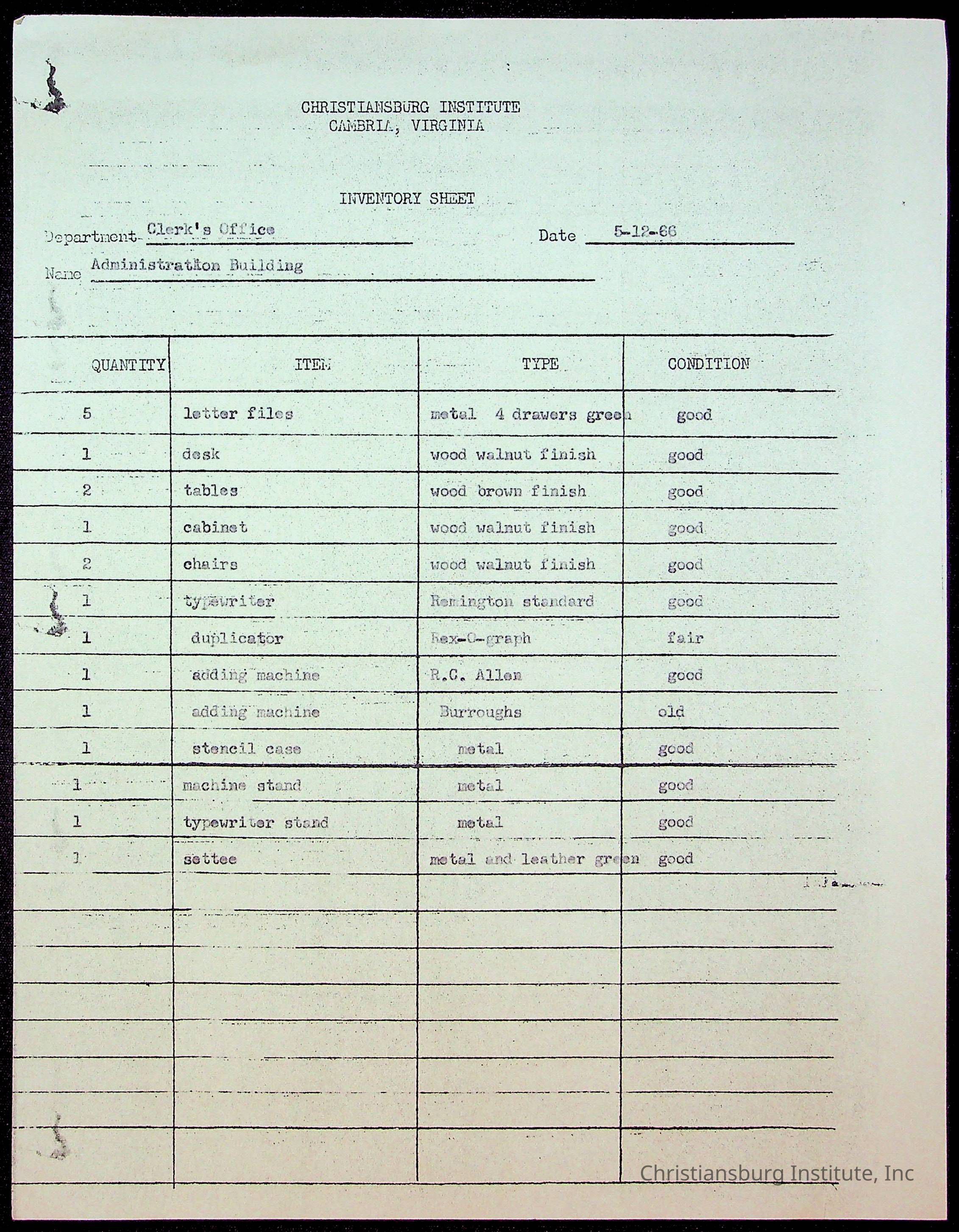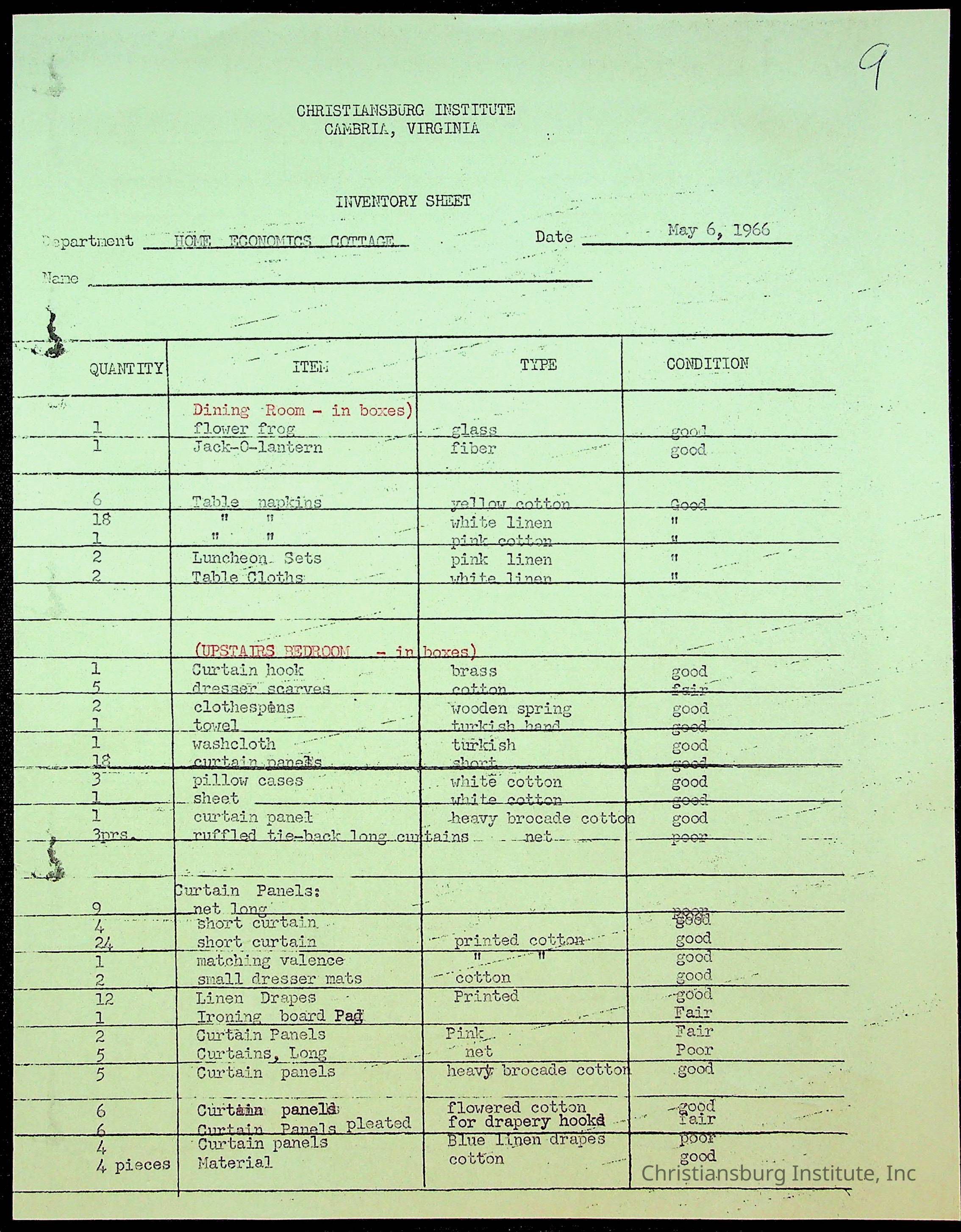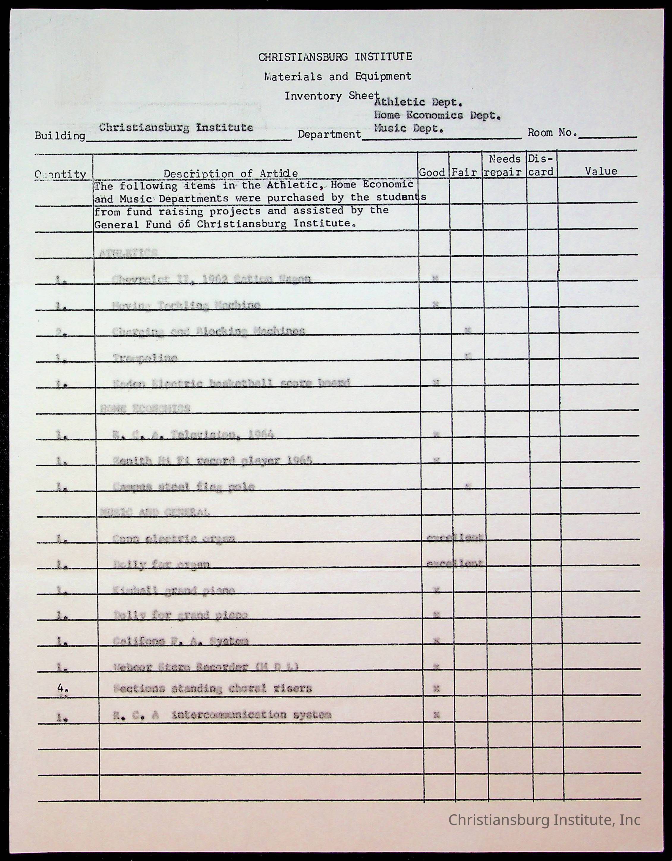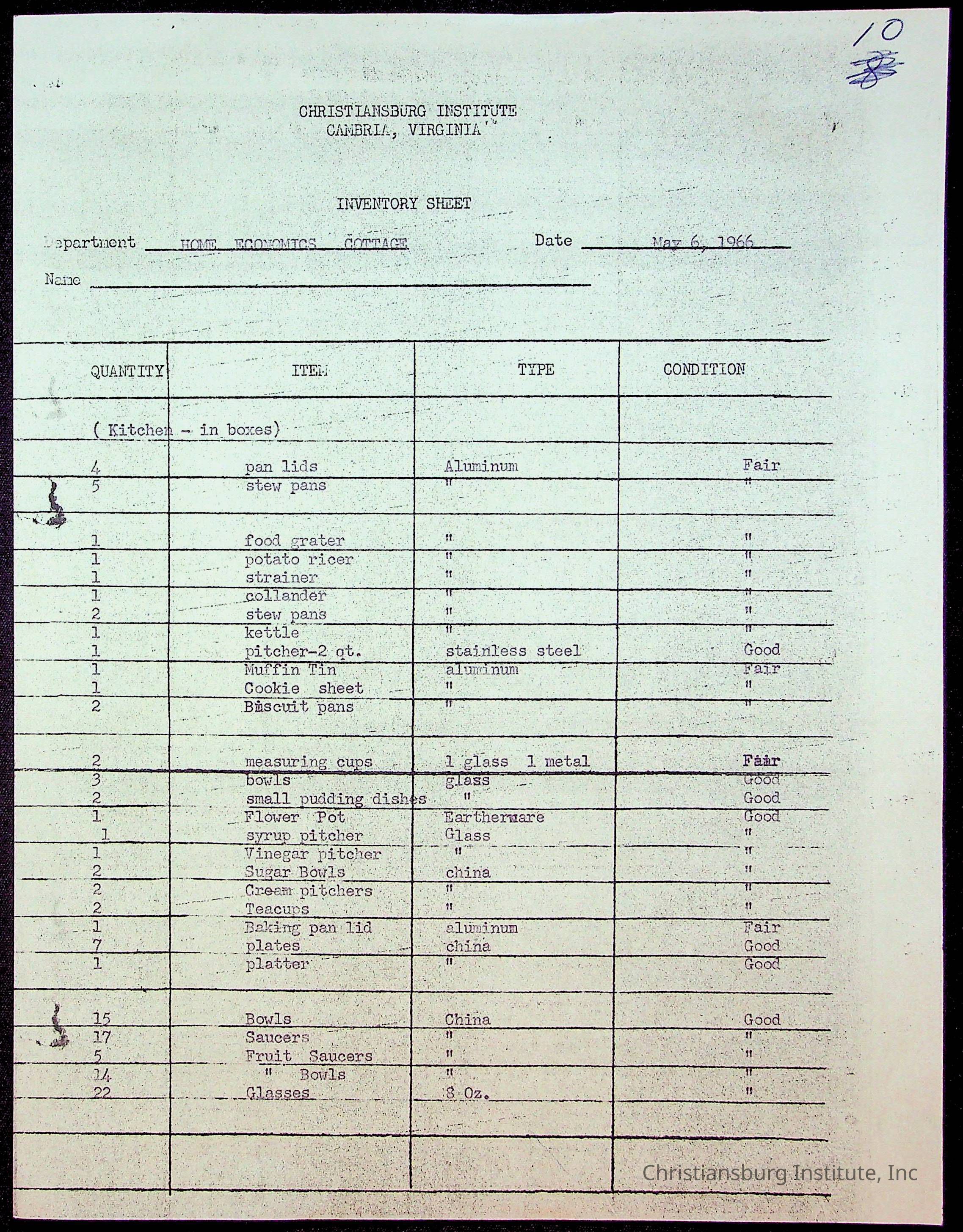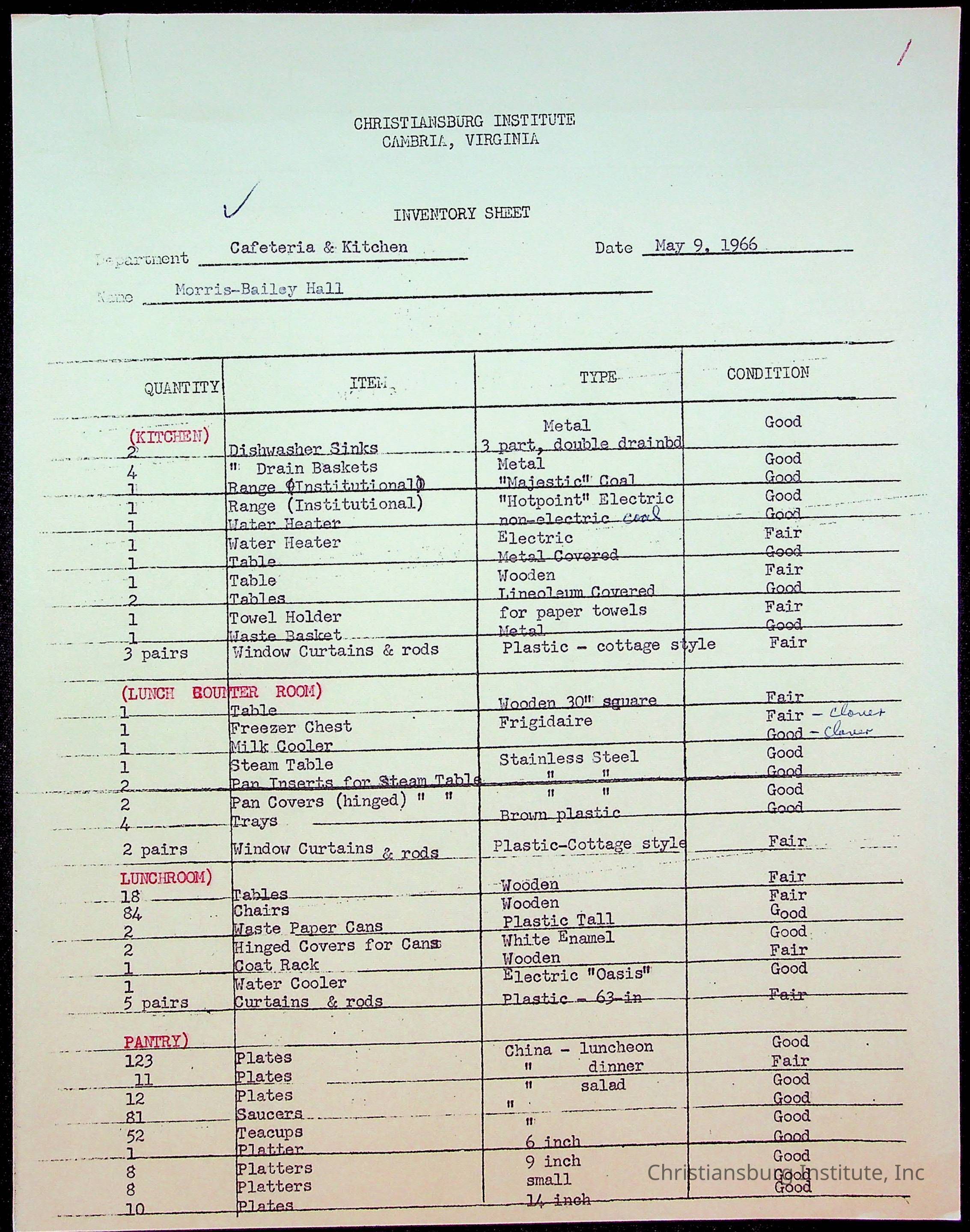 An archive of inventory sheets documenting Christiansburg Institute's inventory in the year 1966.
