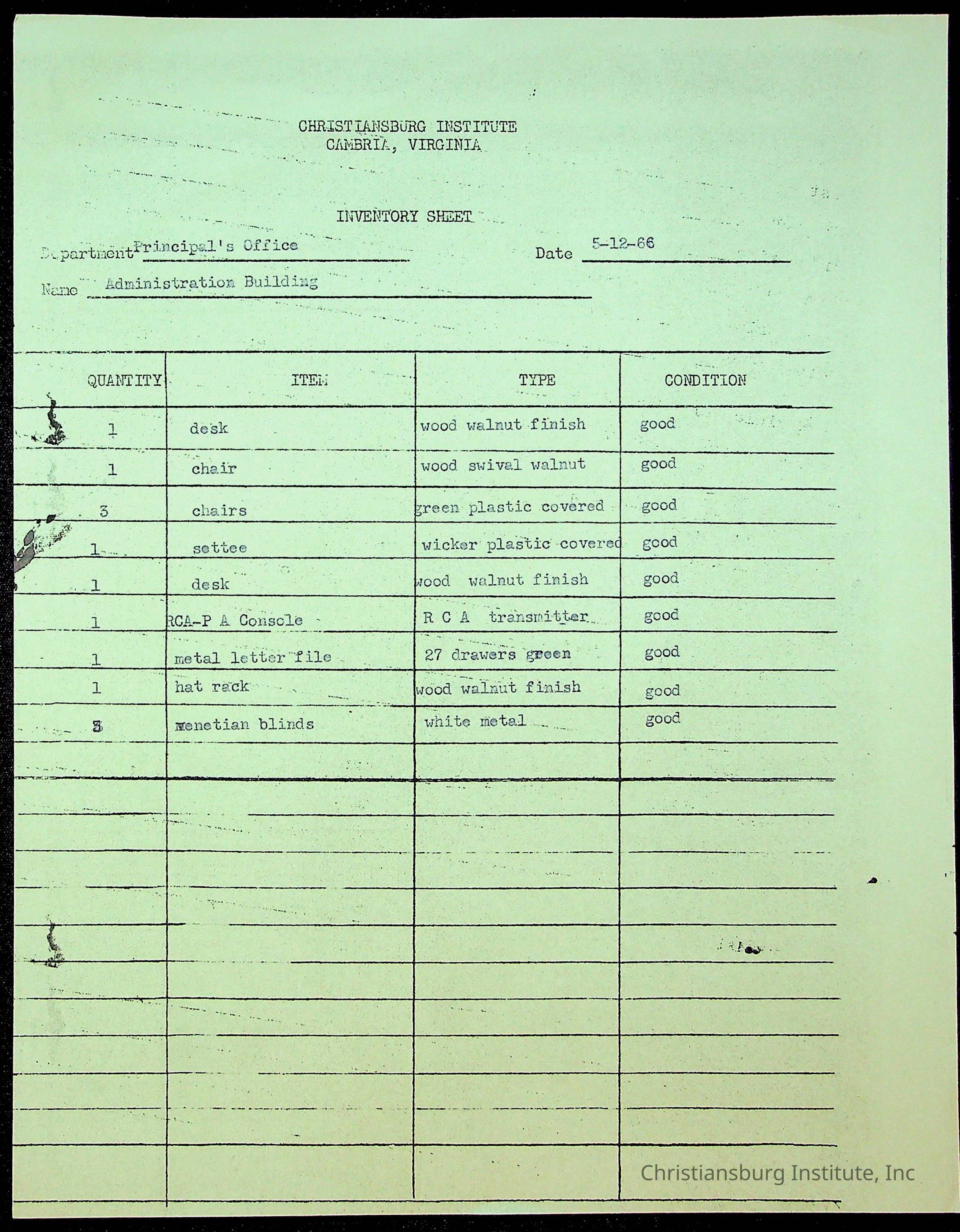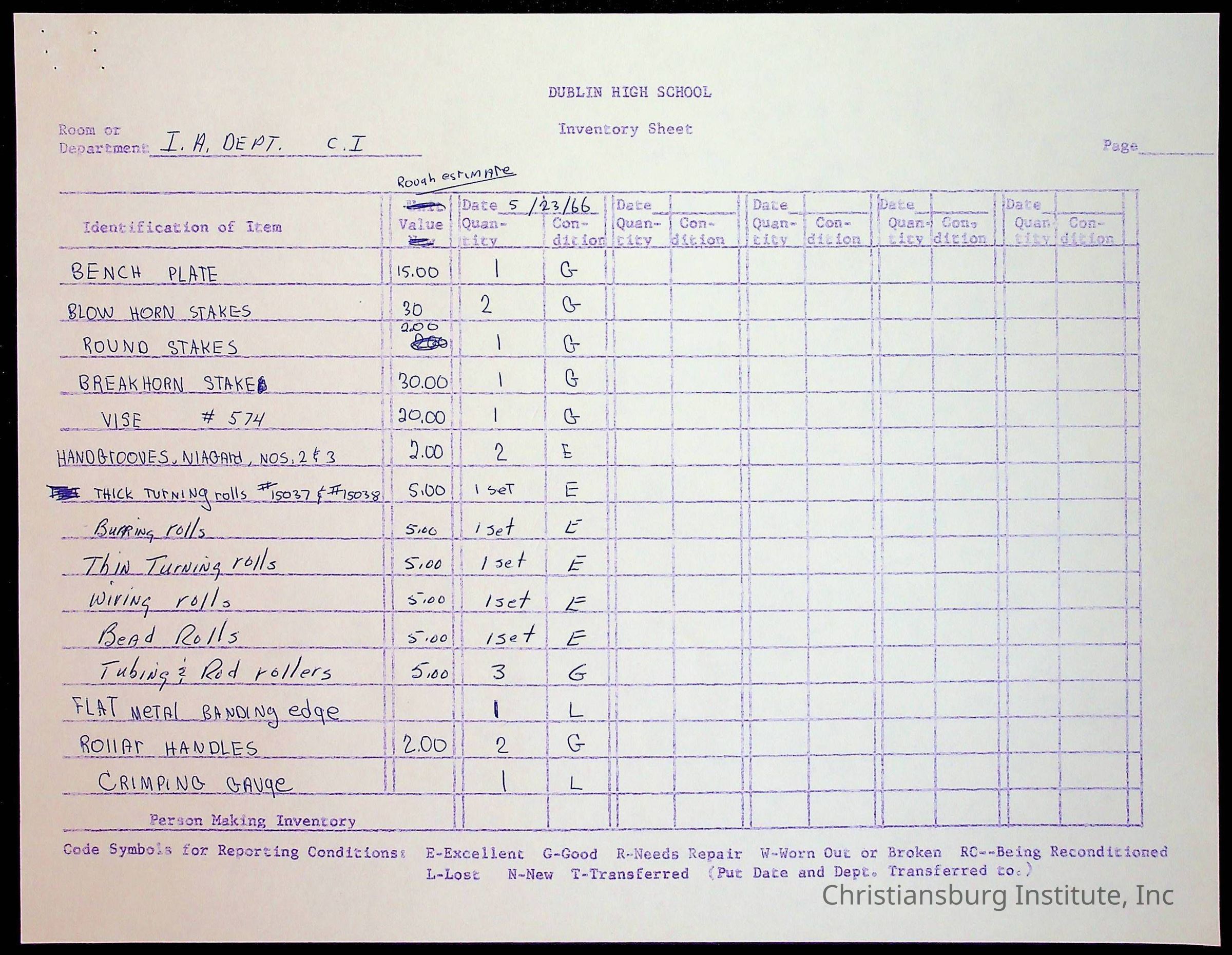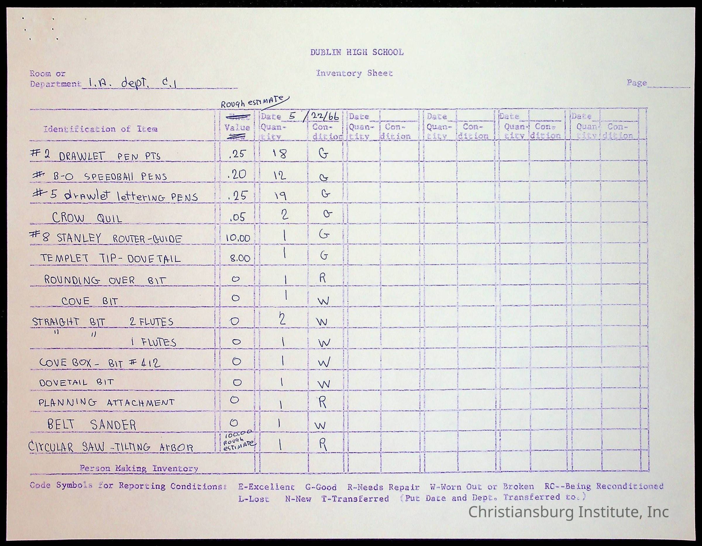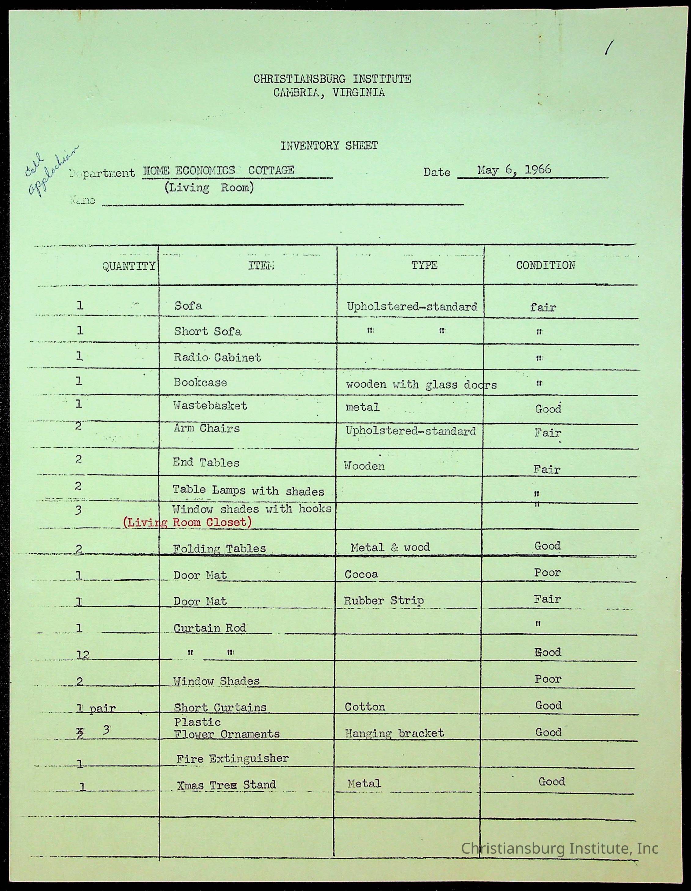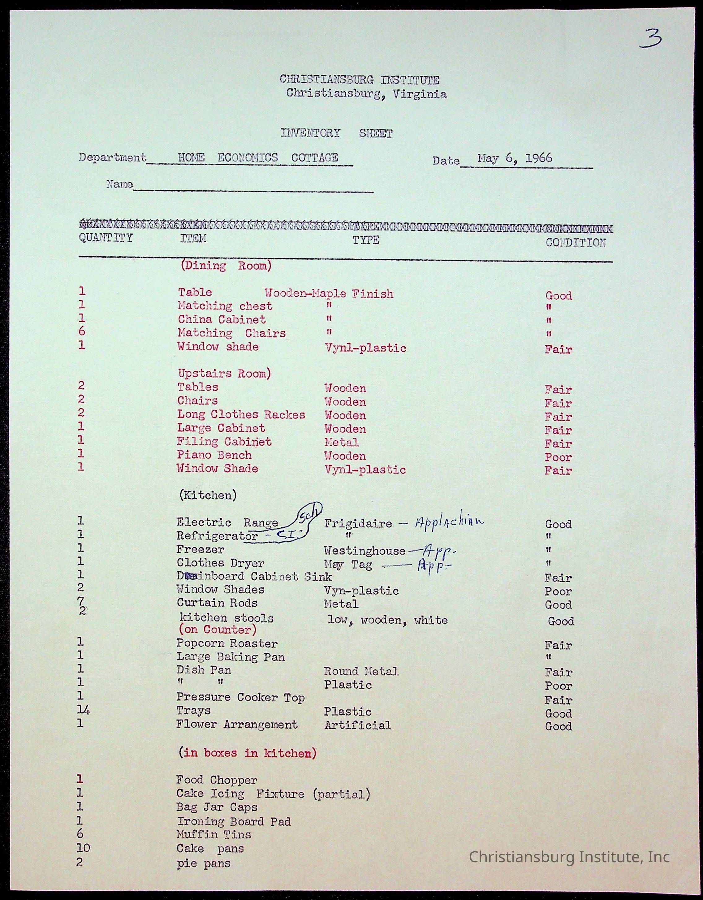 An archive of inventory sheets documenting Christiansburg Institute's inventory in the year 1966.