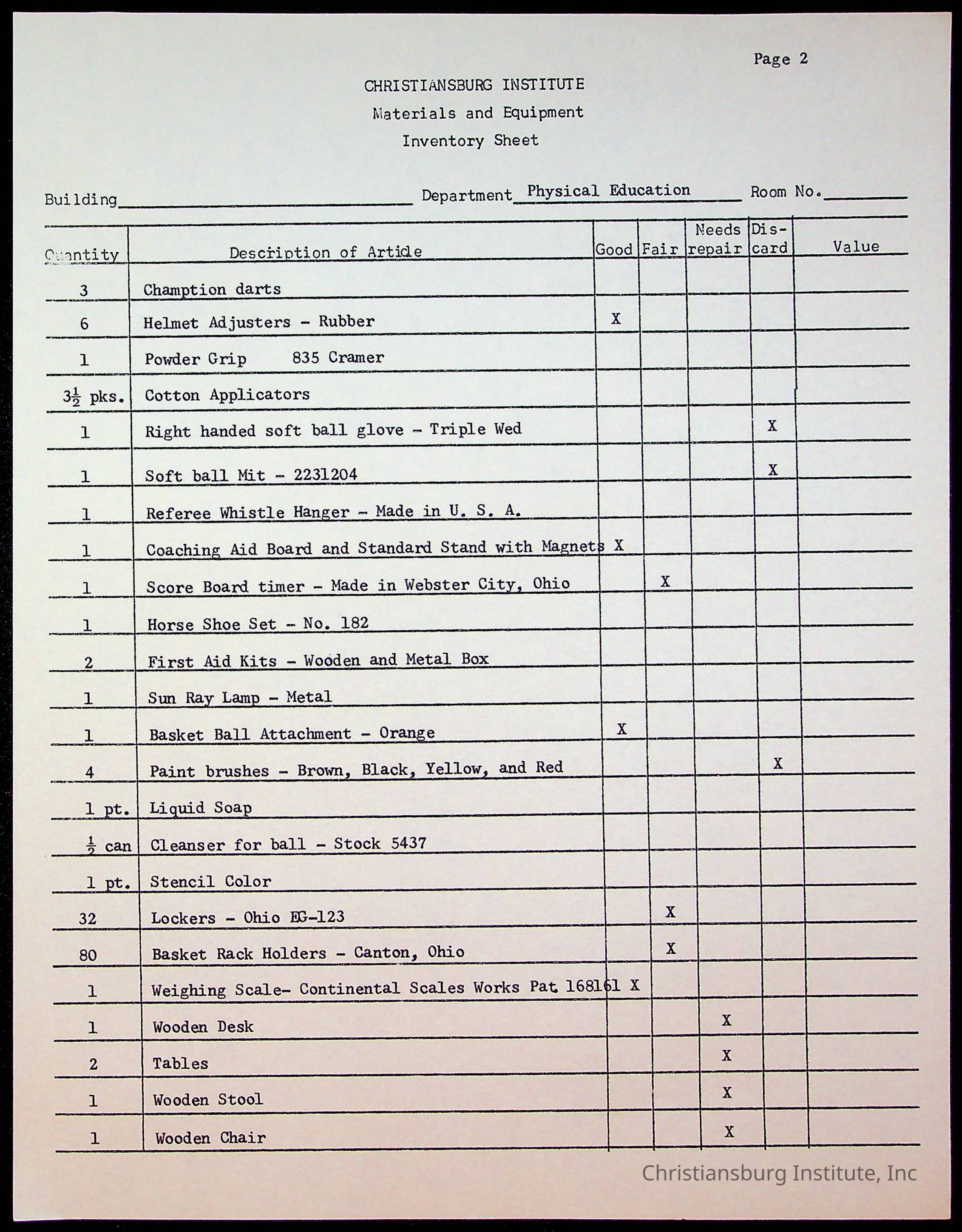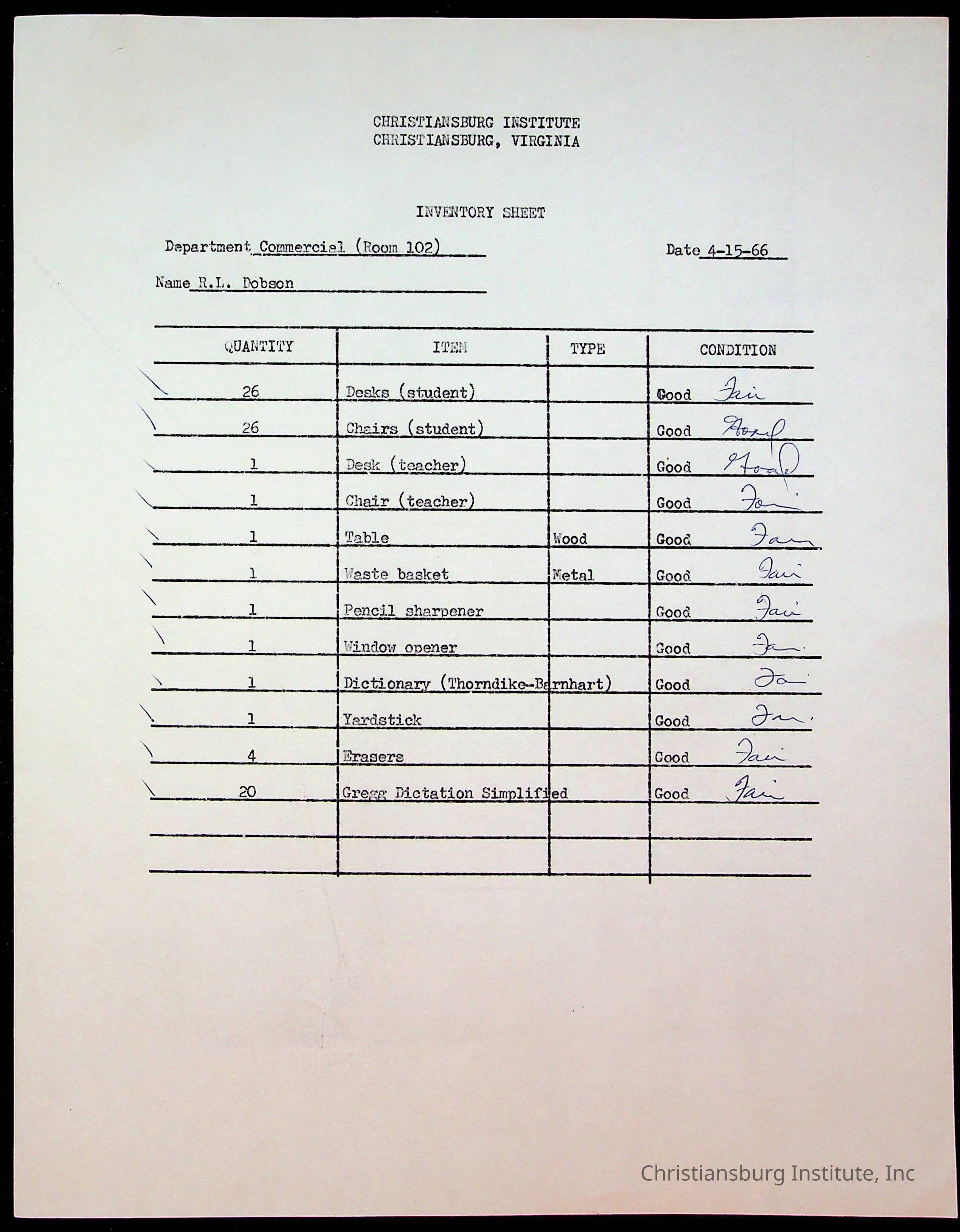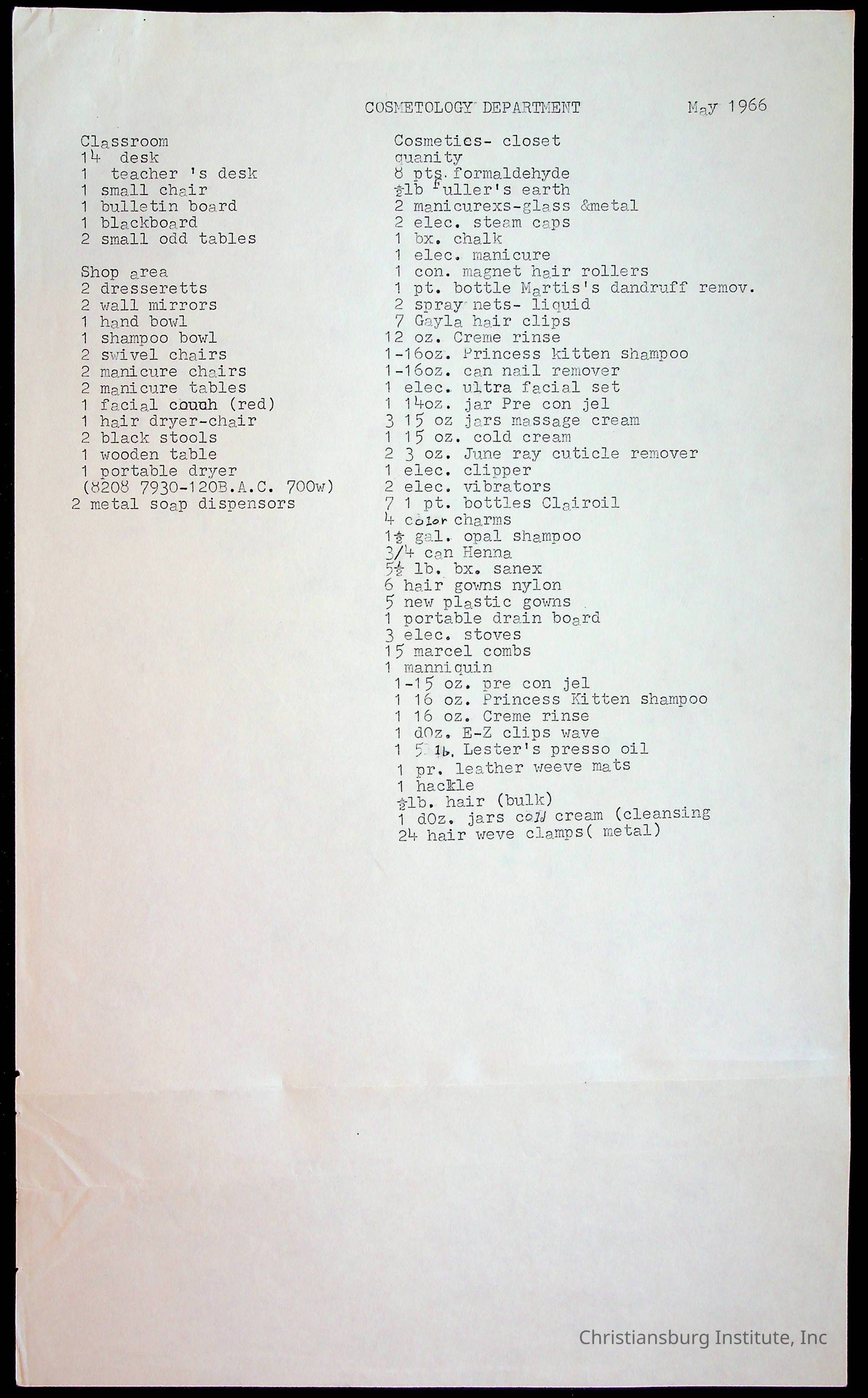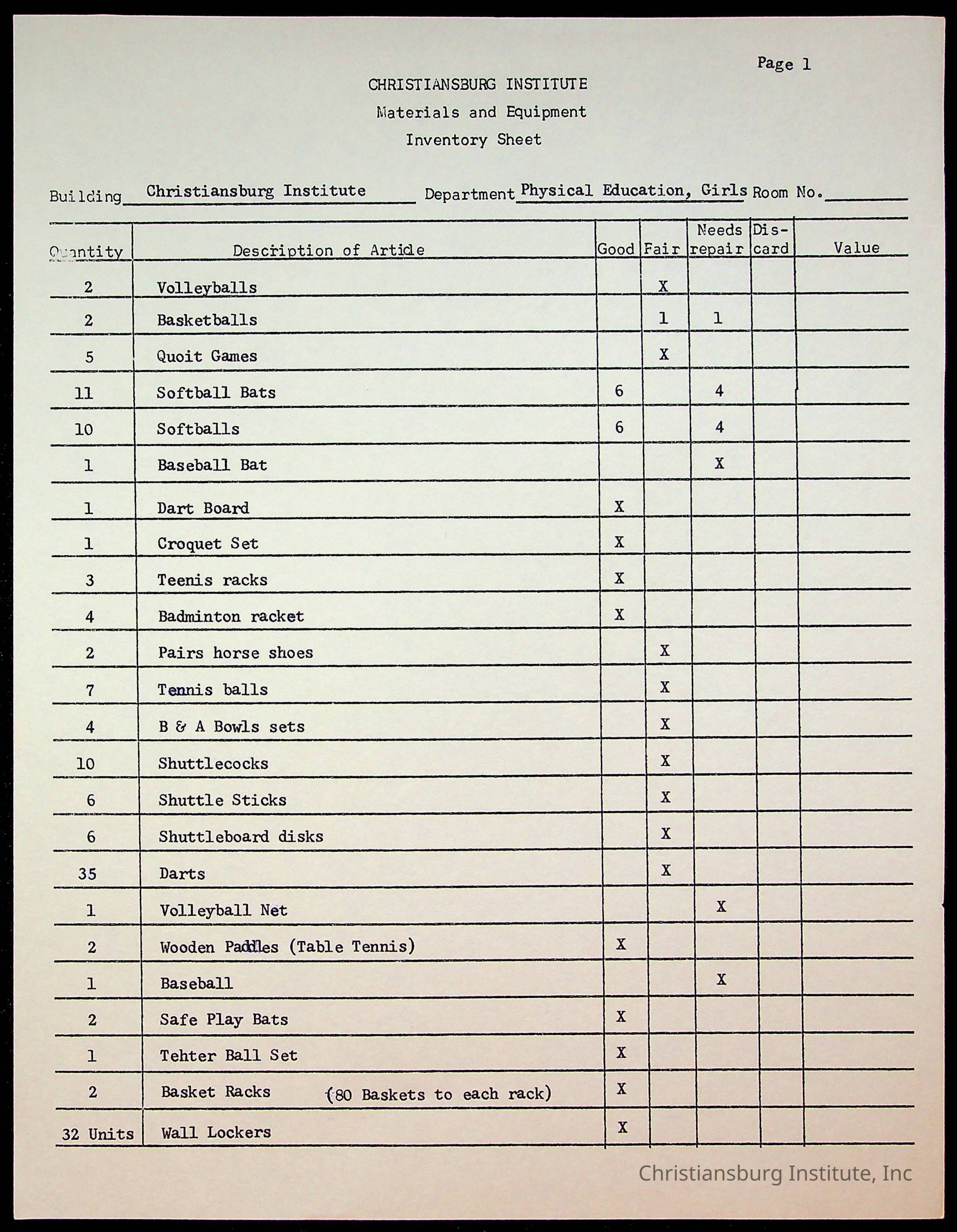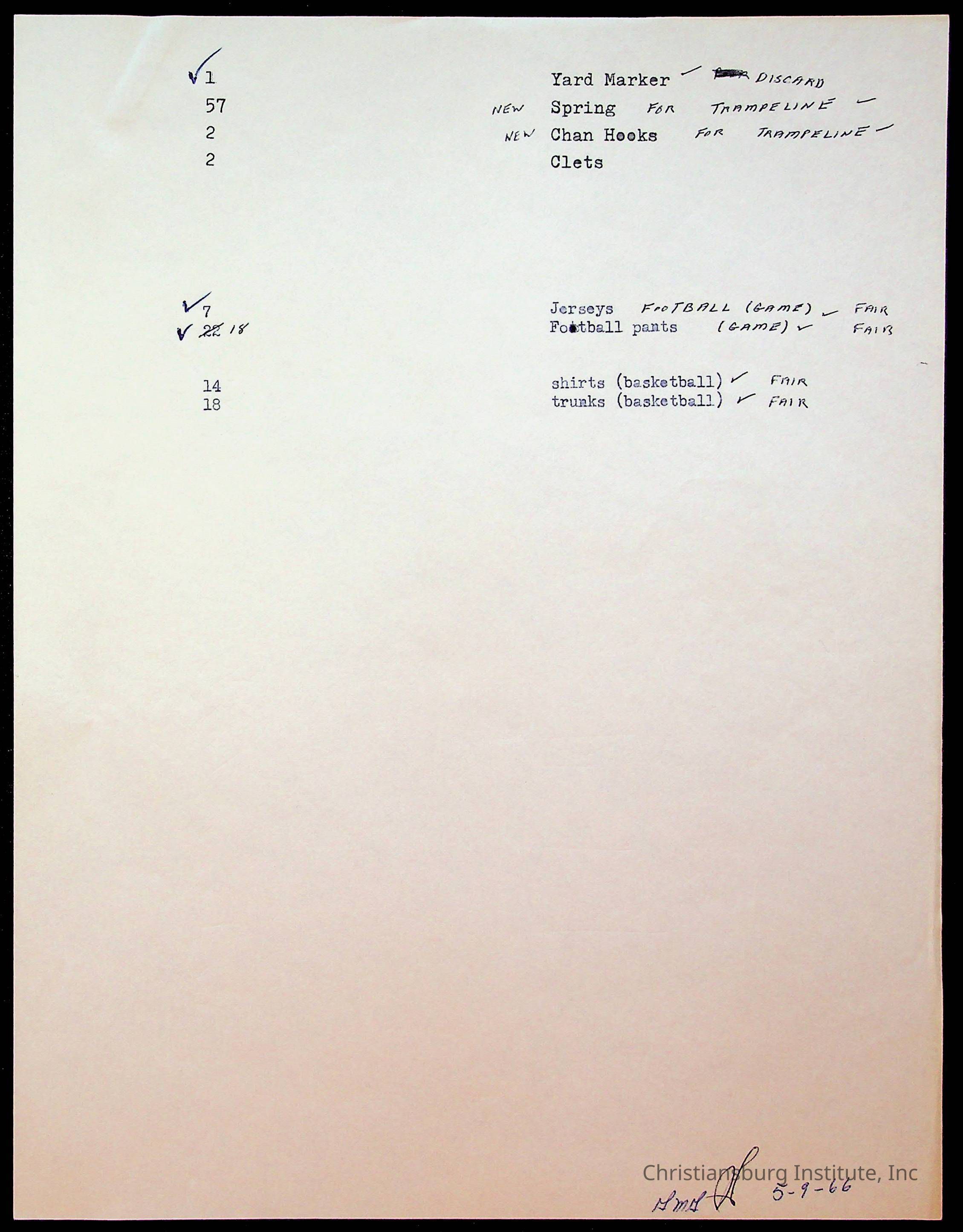 An archive of inventory sheets documenting Christiansburg Institute's inventory in the year 1966.