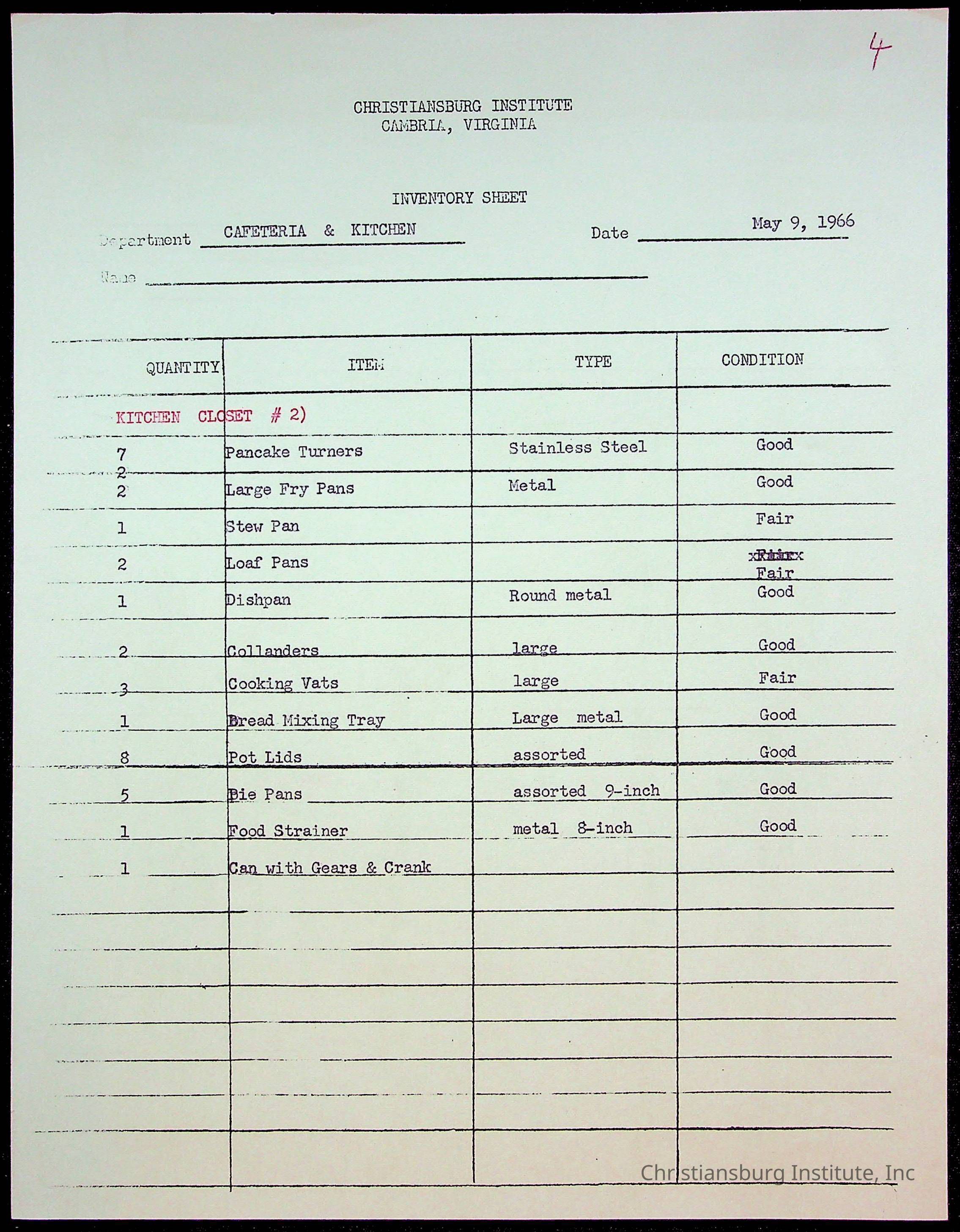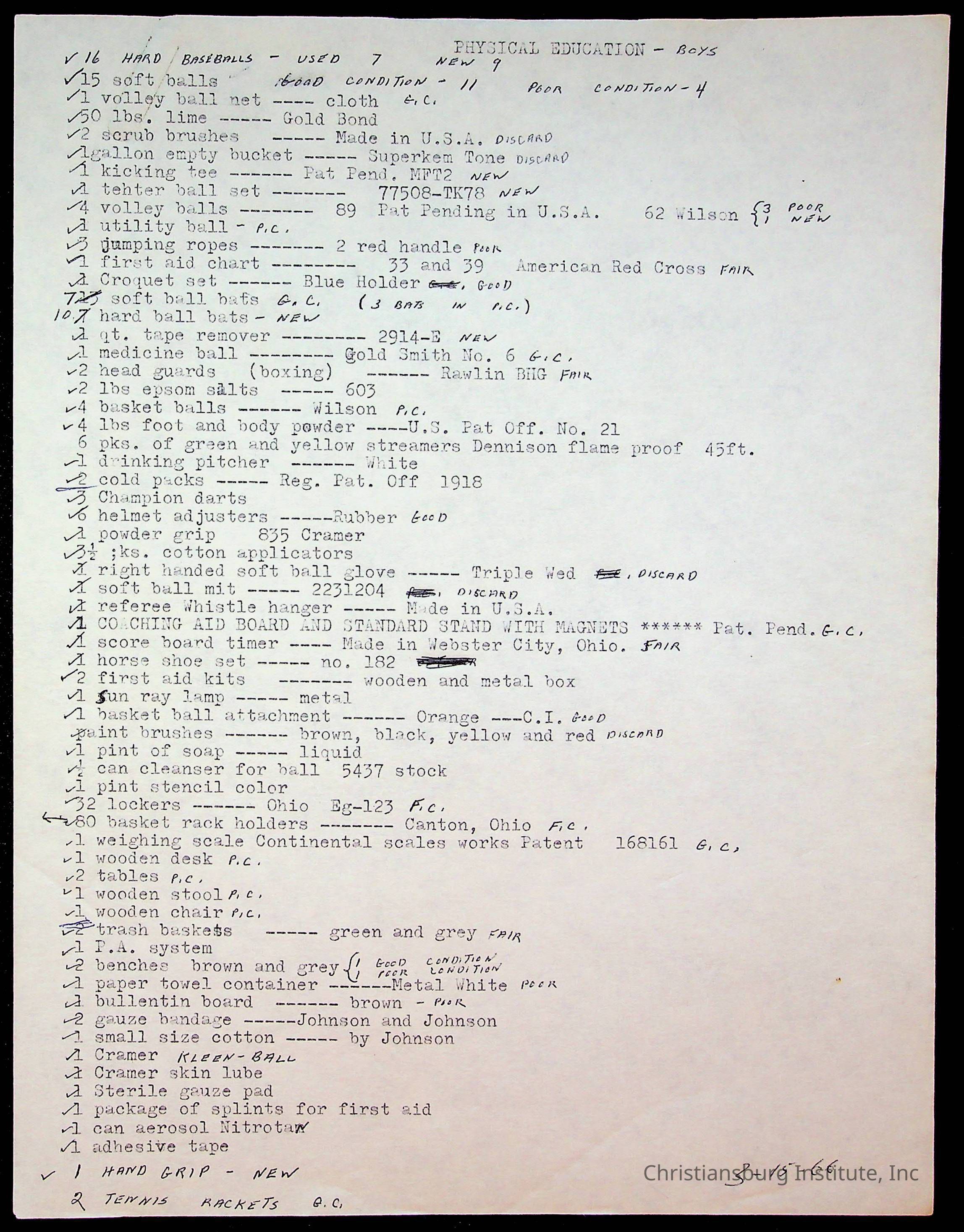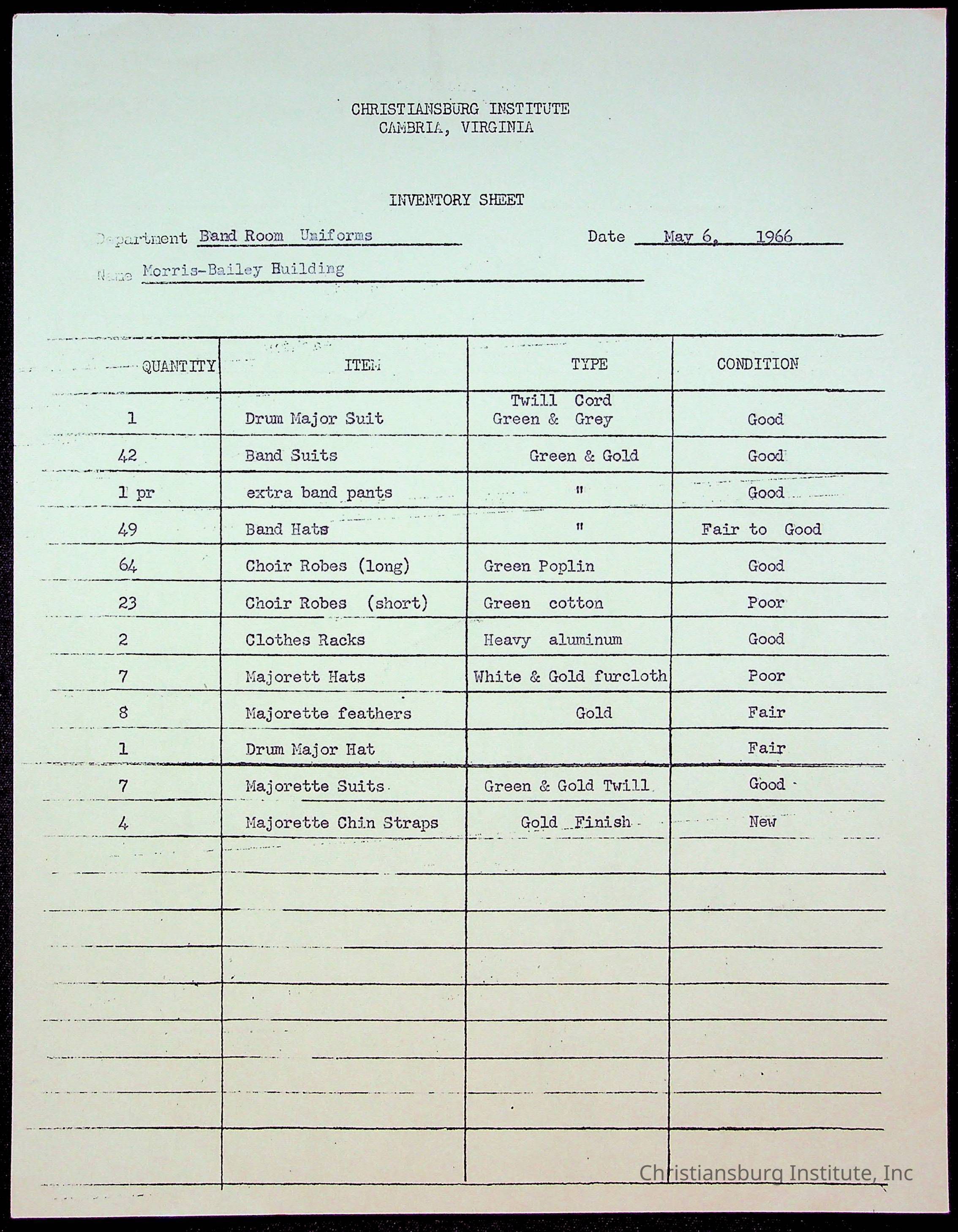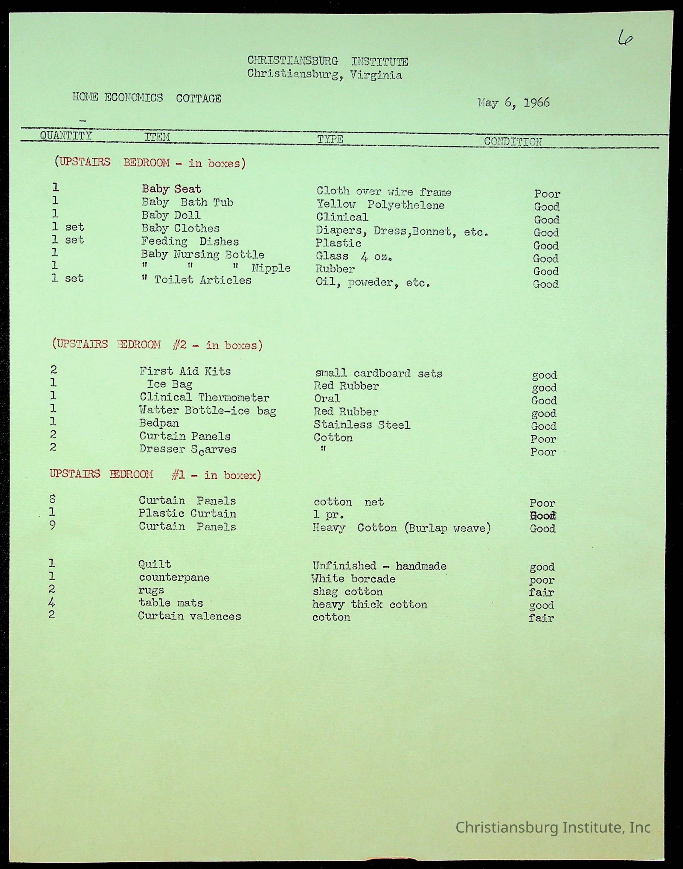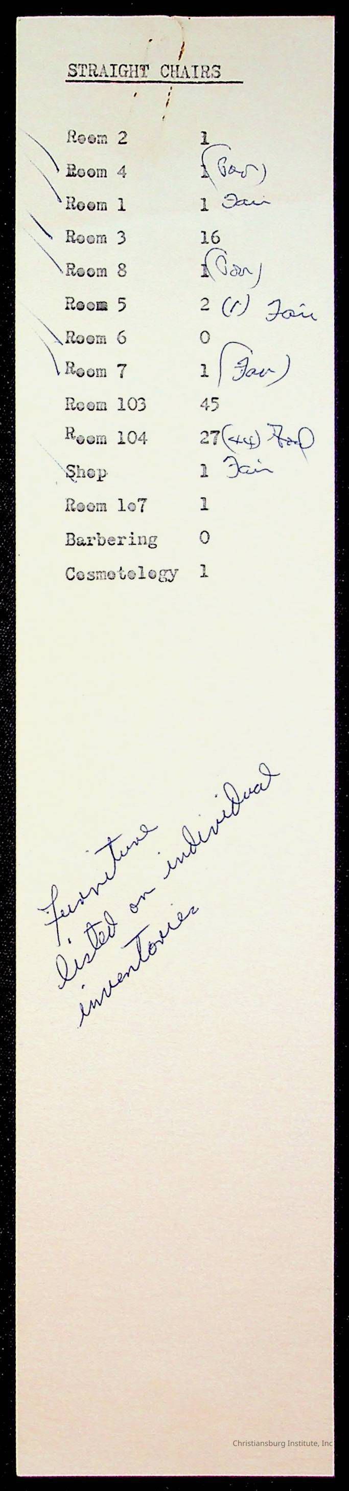 An archive of inventory sheets documenting Christiansburg Institute's inventory in the year 1966.