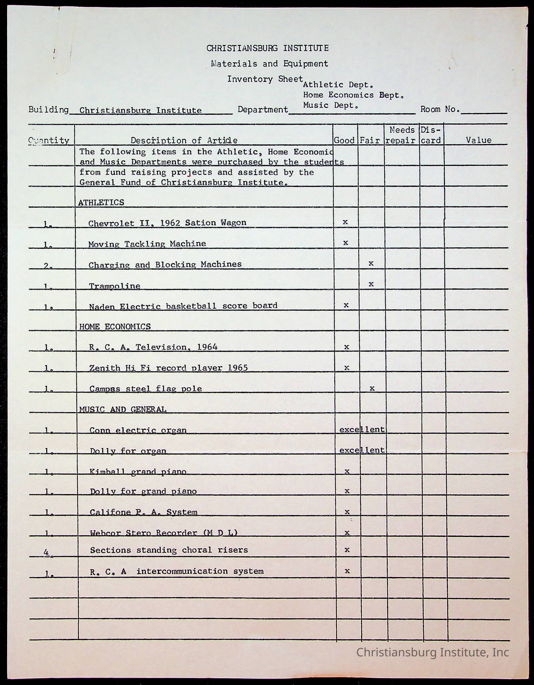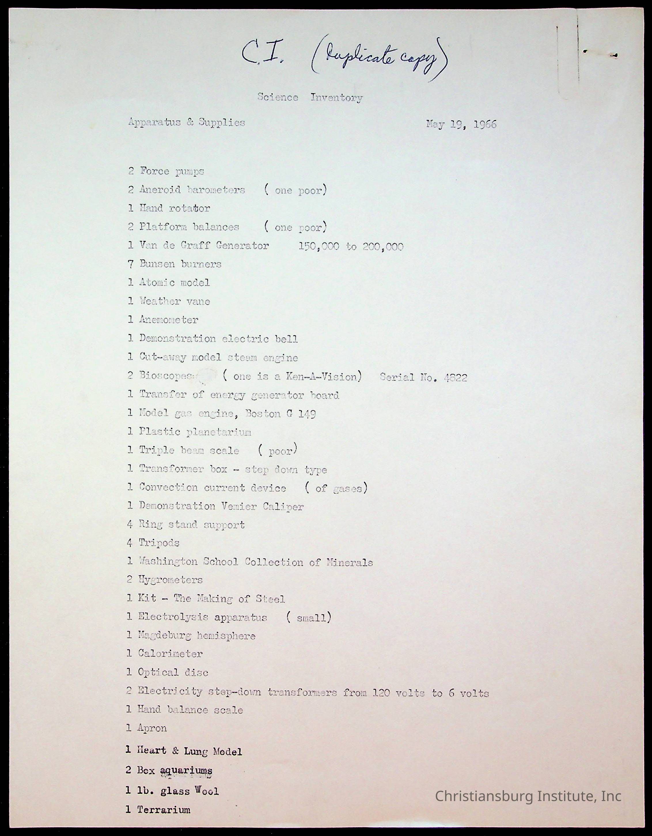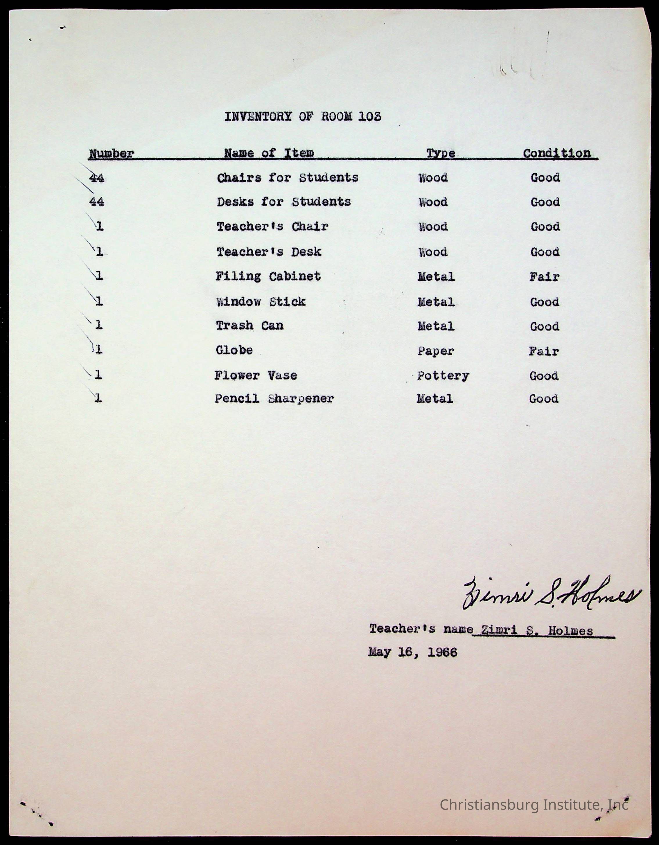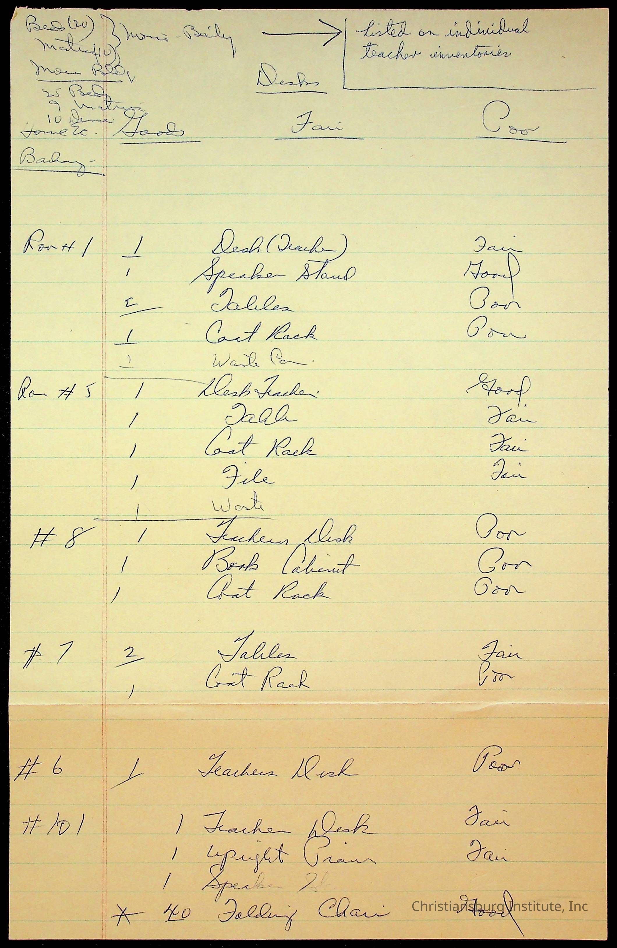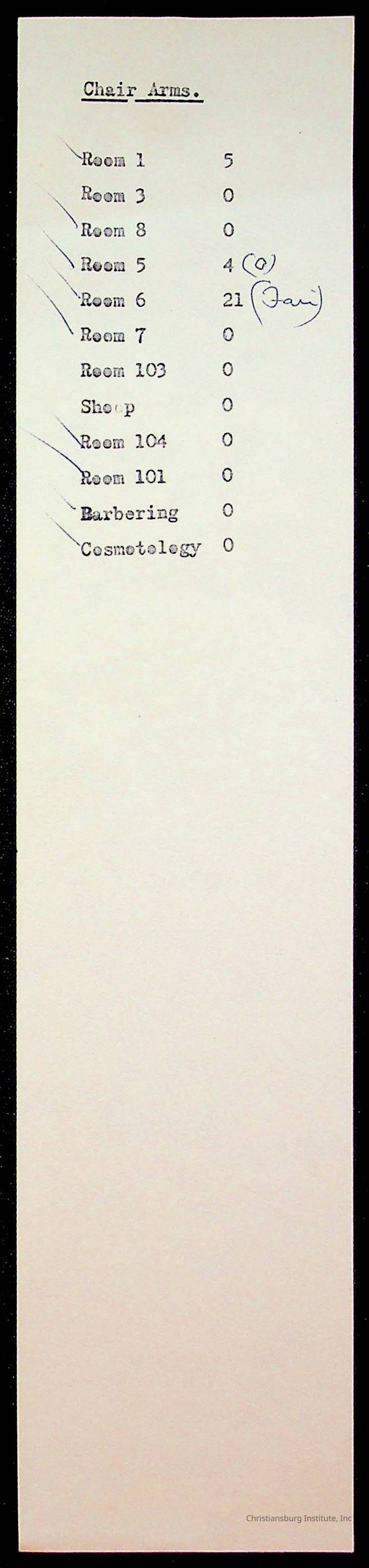 An archive of inventory sheets documenting Christiansburg Institute's inventory in the year 1966.