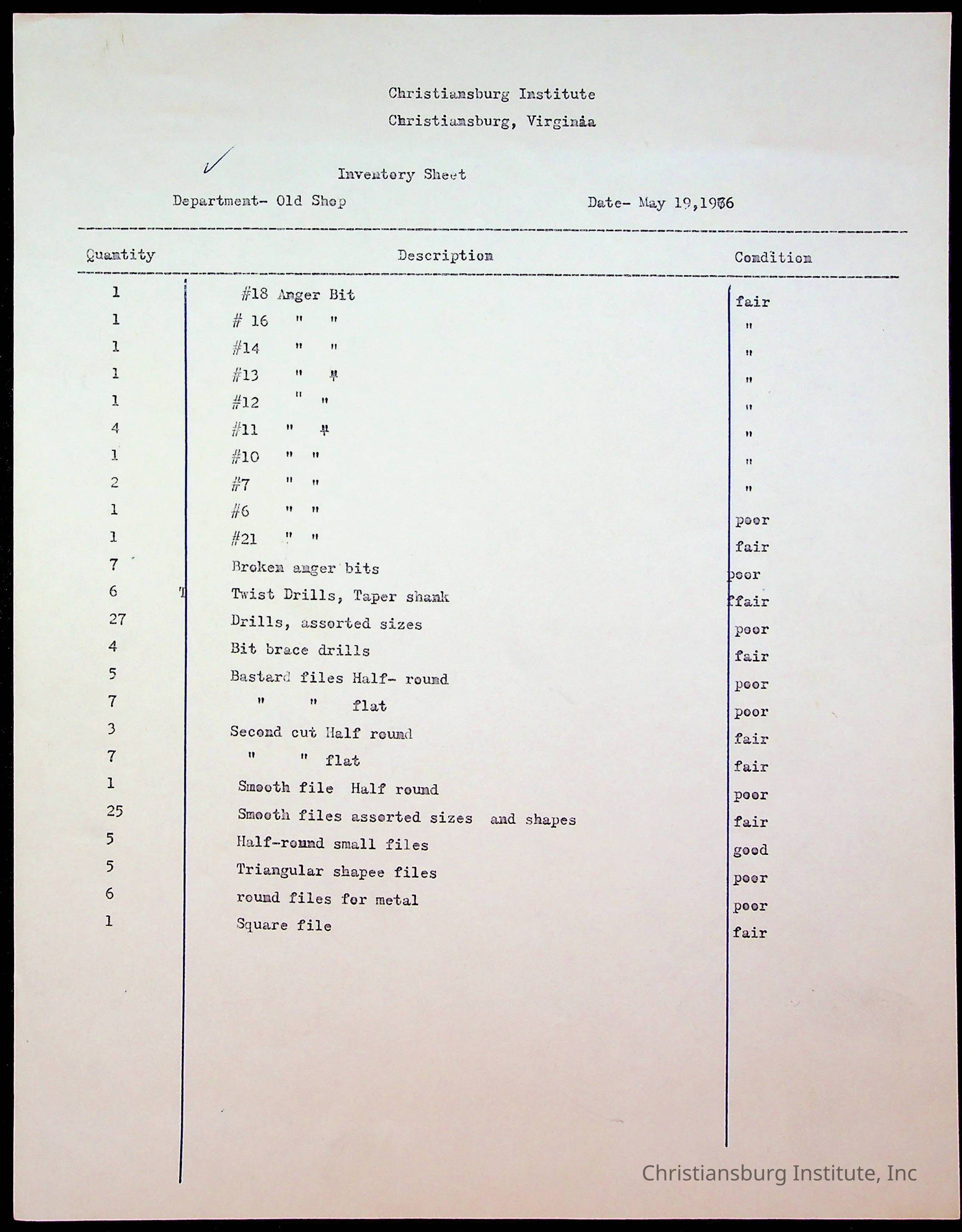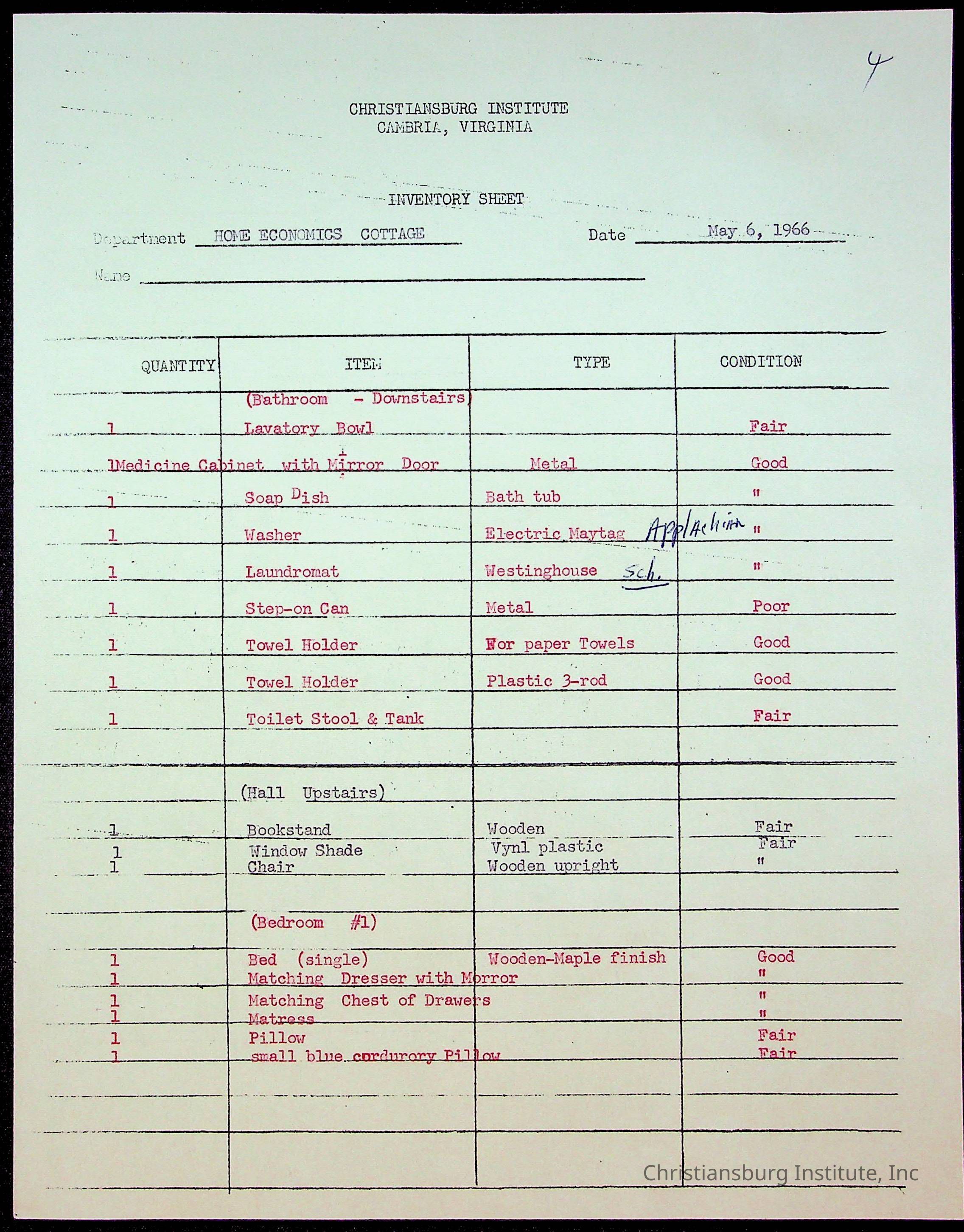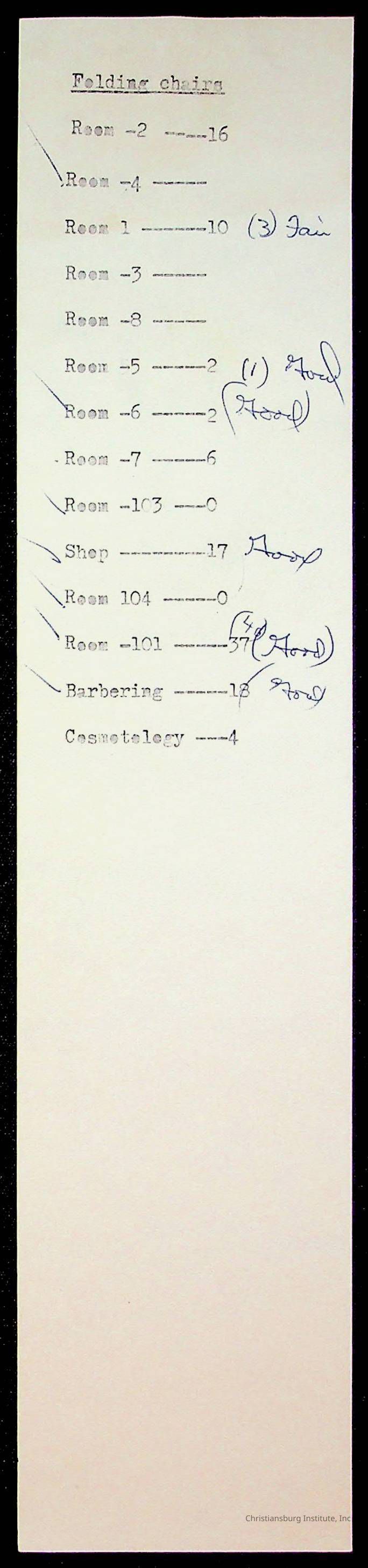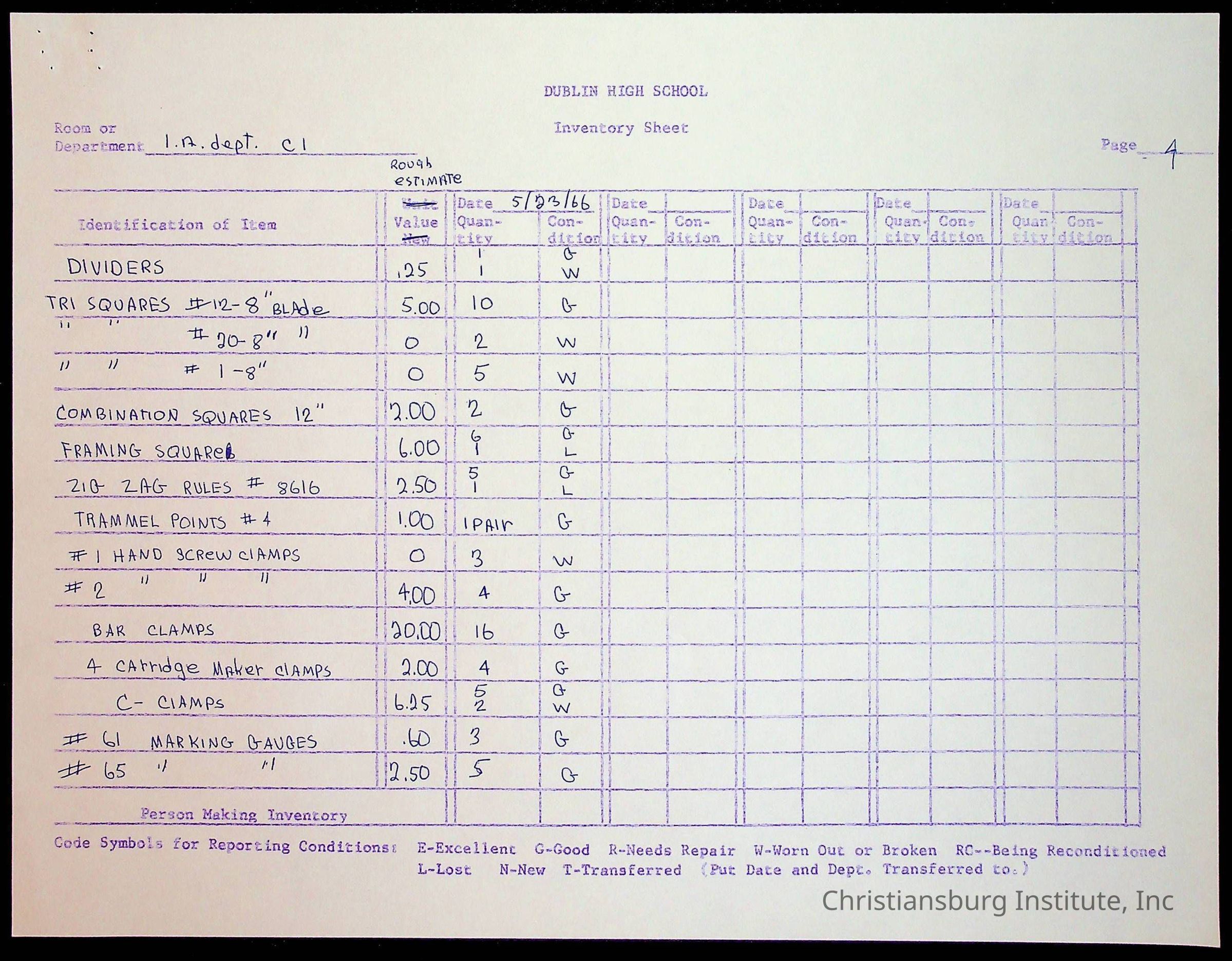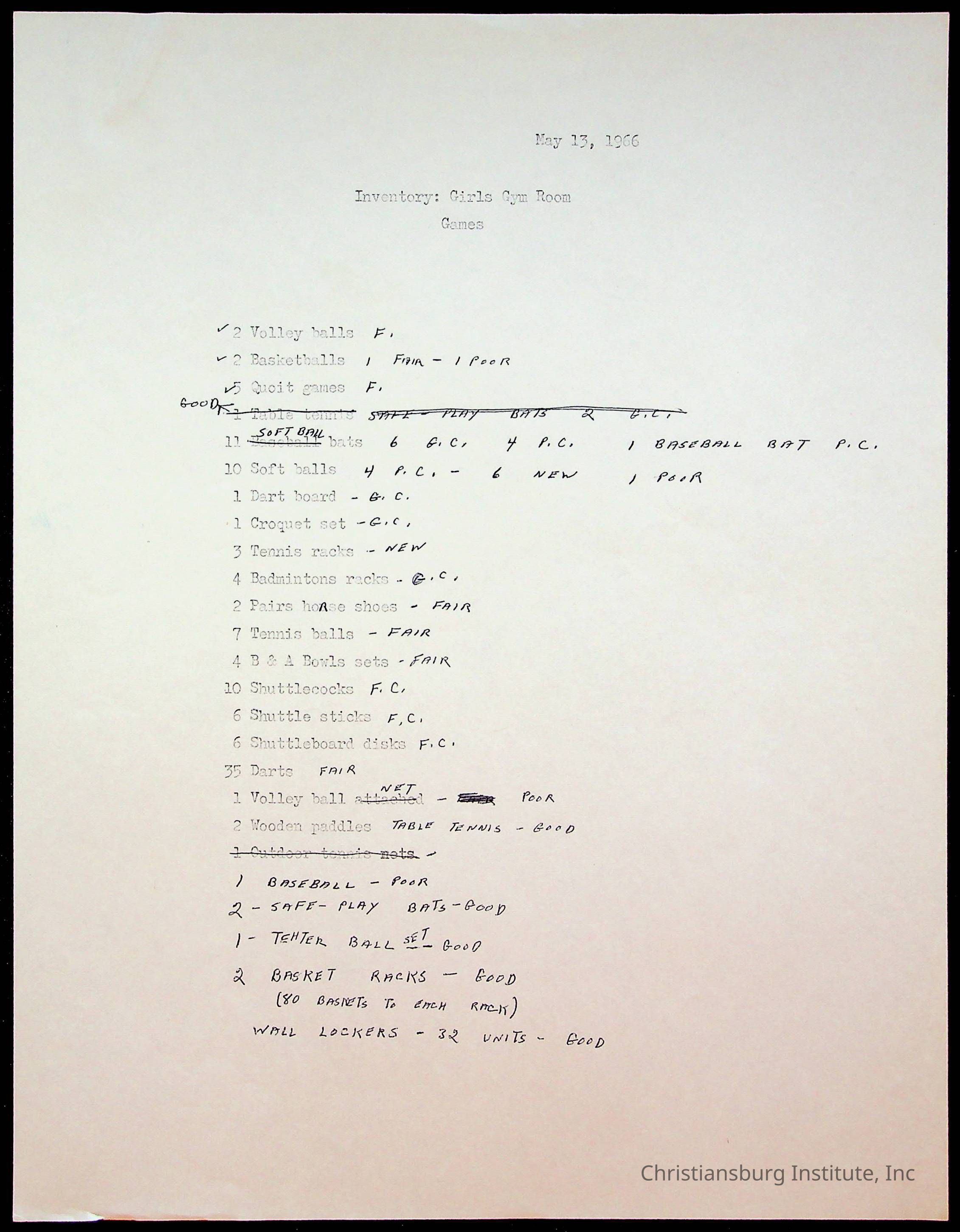 An archive of inventory sheets documenting Christiansburg Institute's inventory in the year 1966.