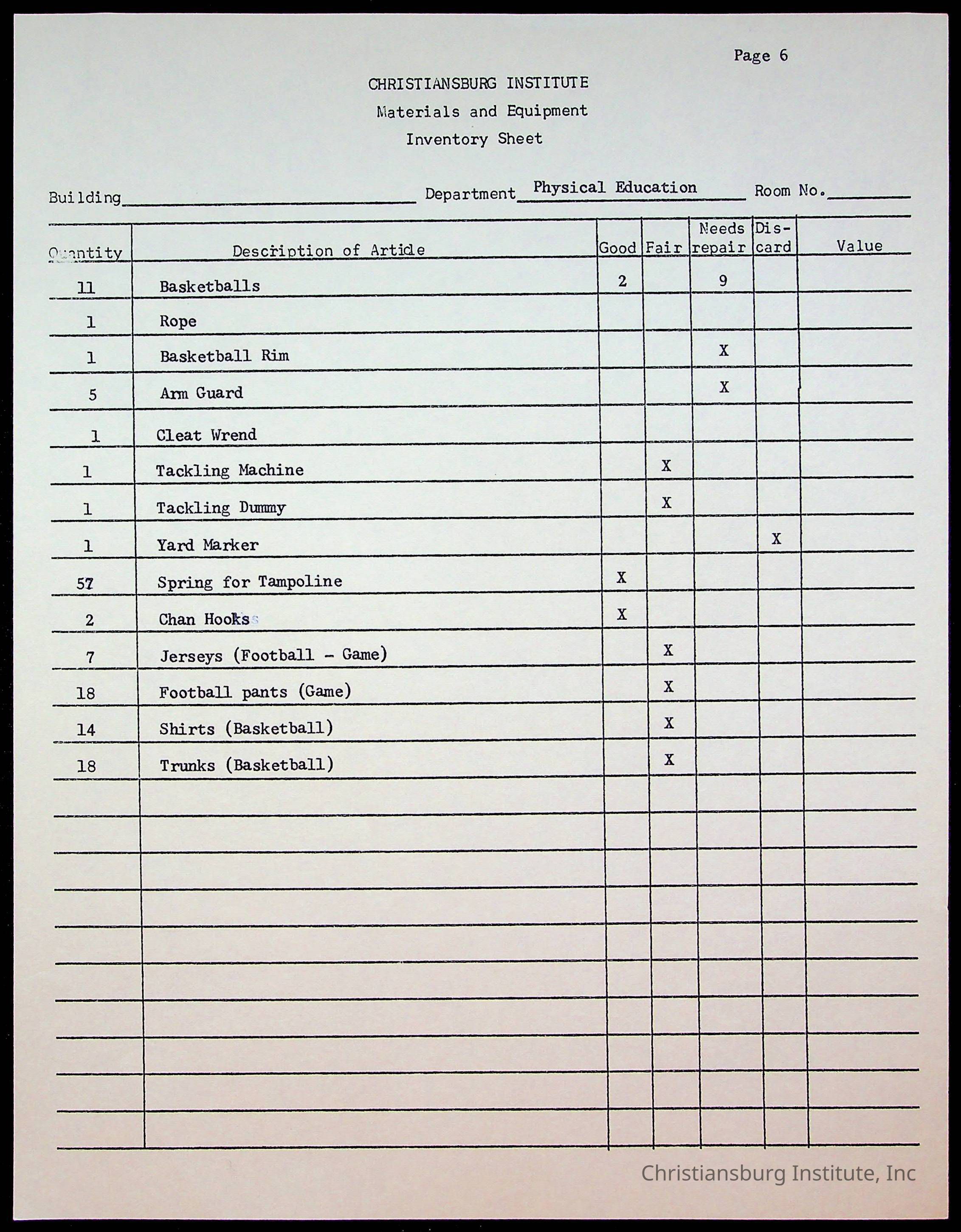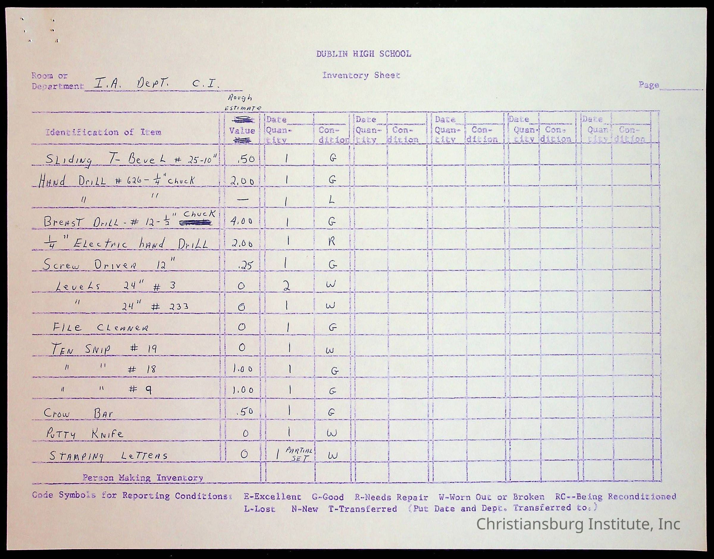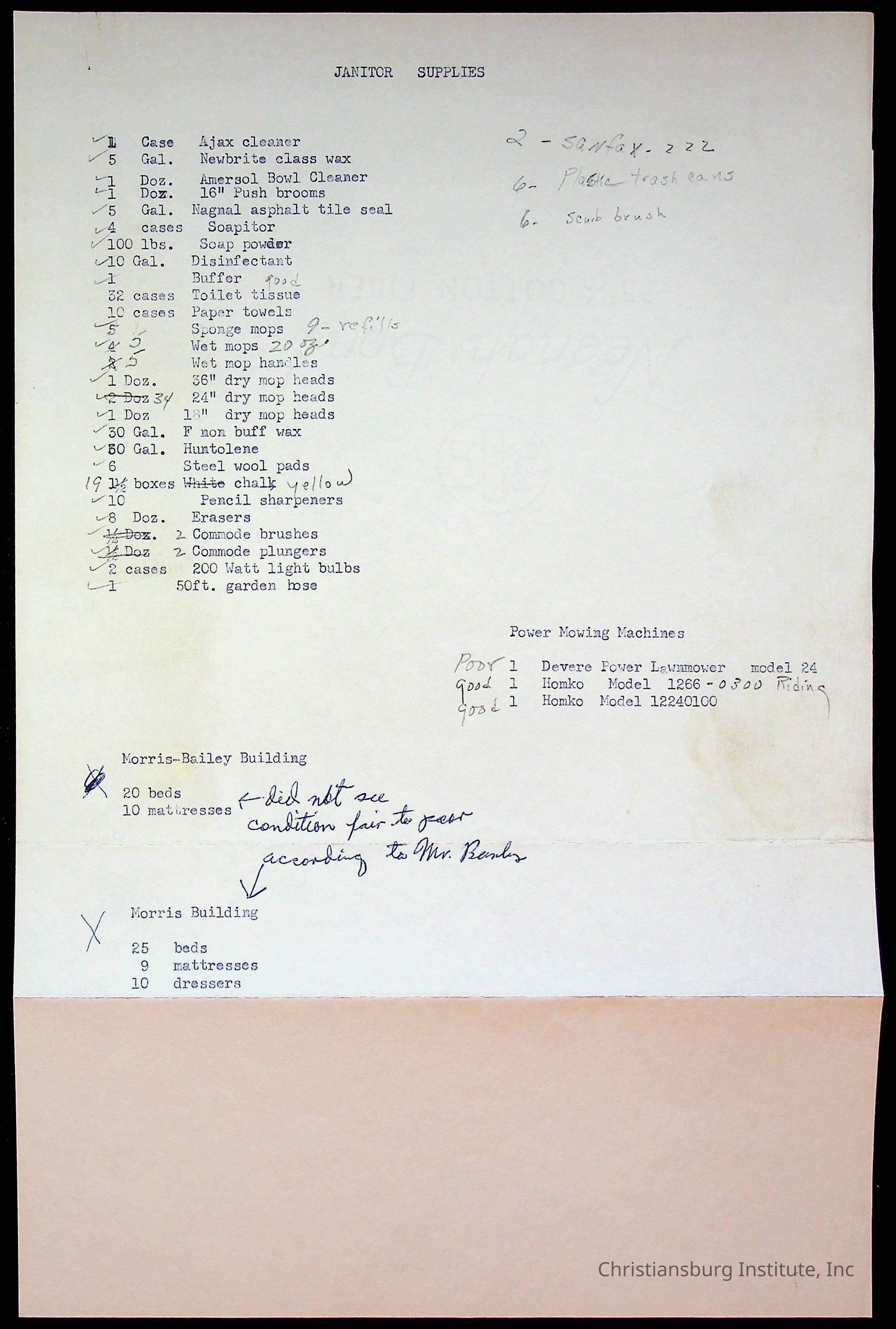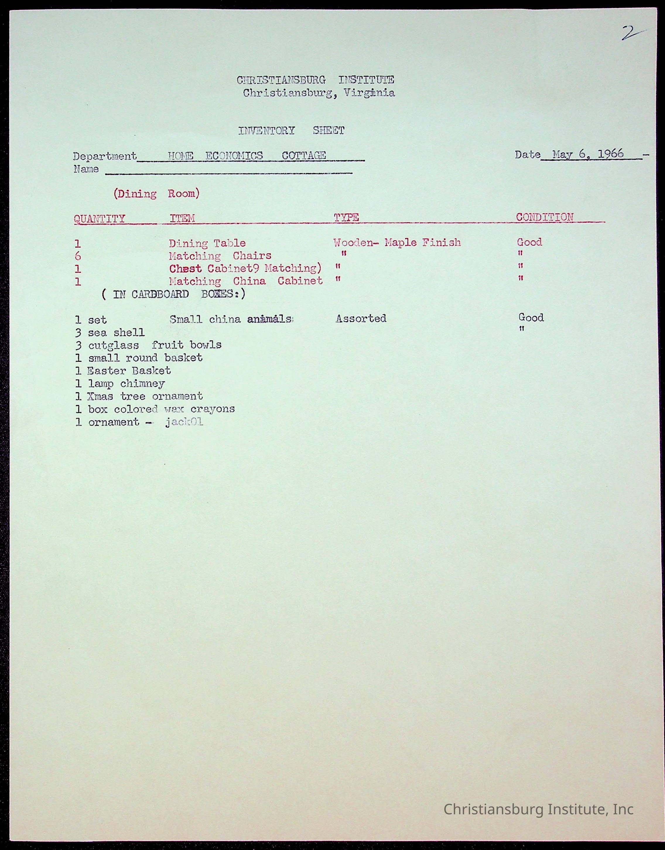 An archive of inventory sheets documenting Christiansburg Institute's inventory in the year 1966.