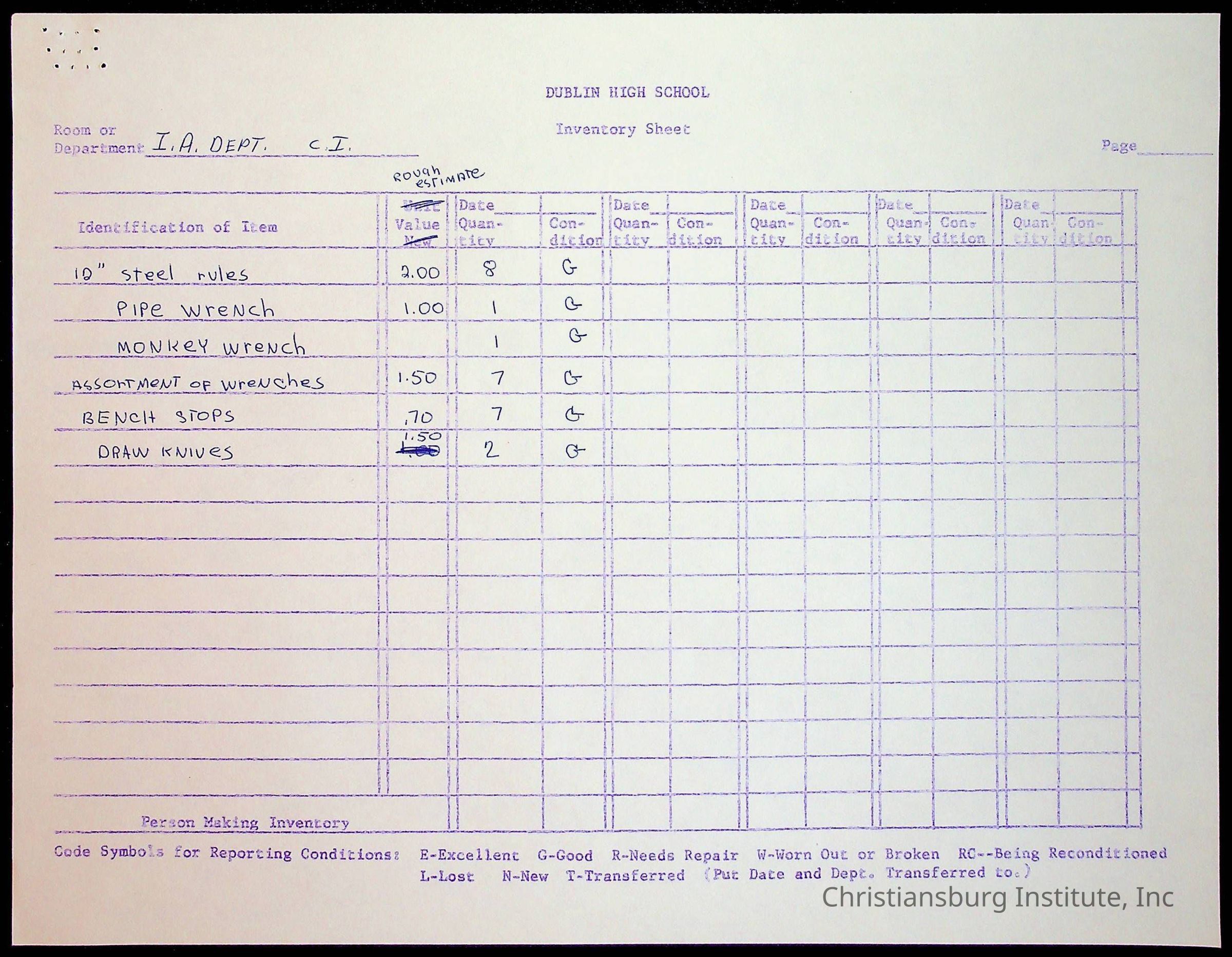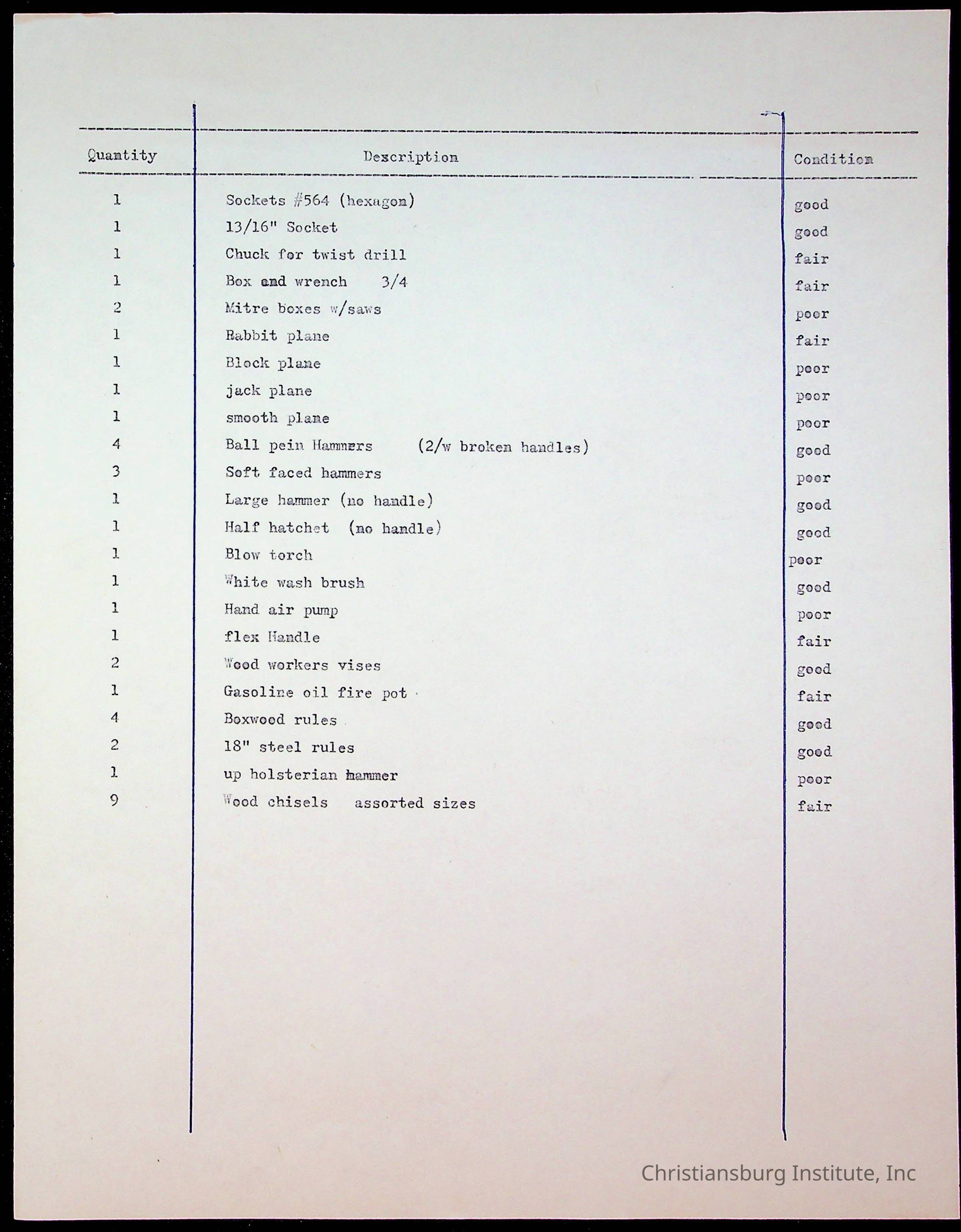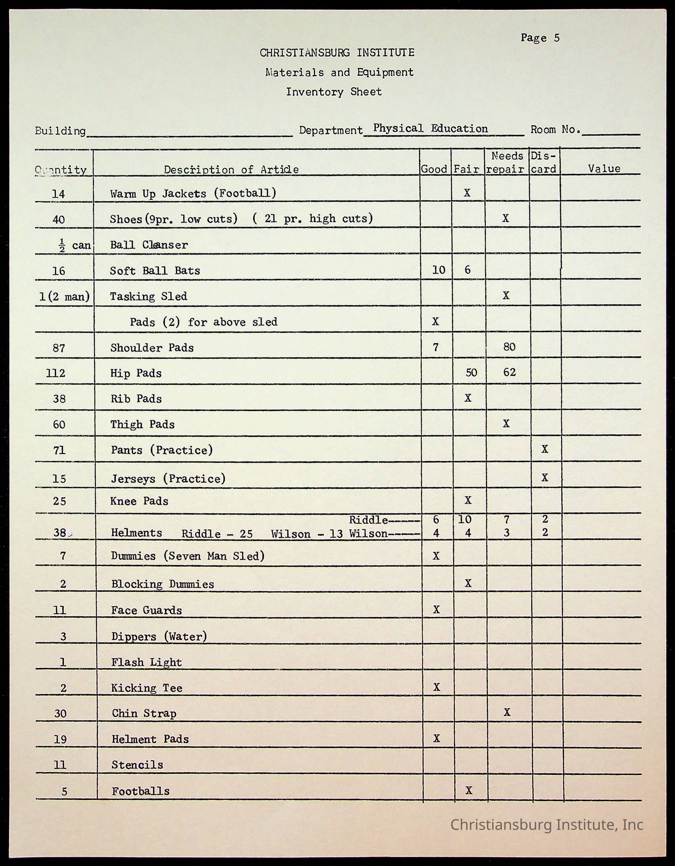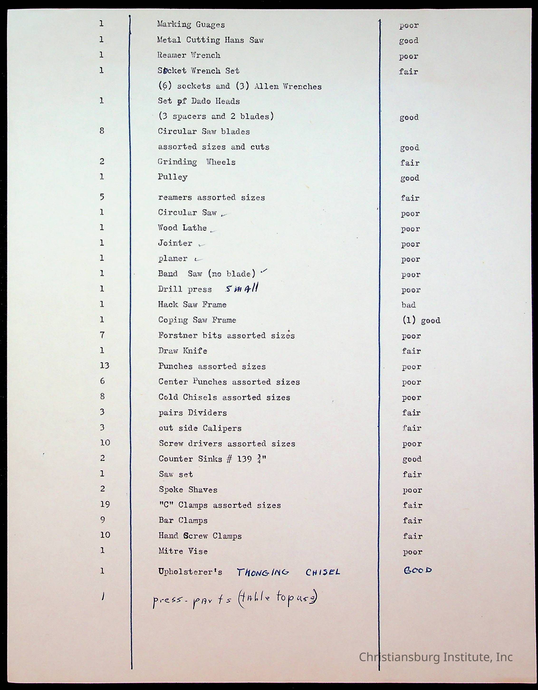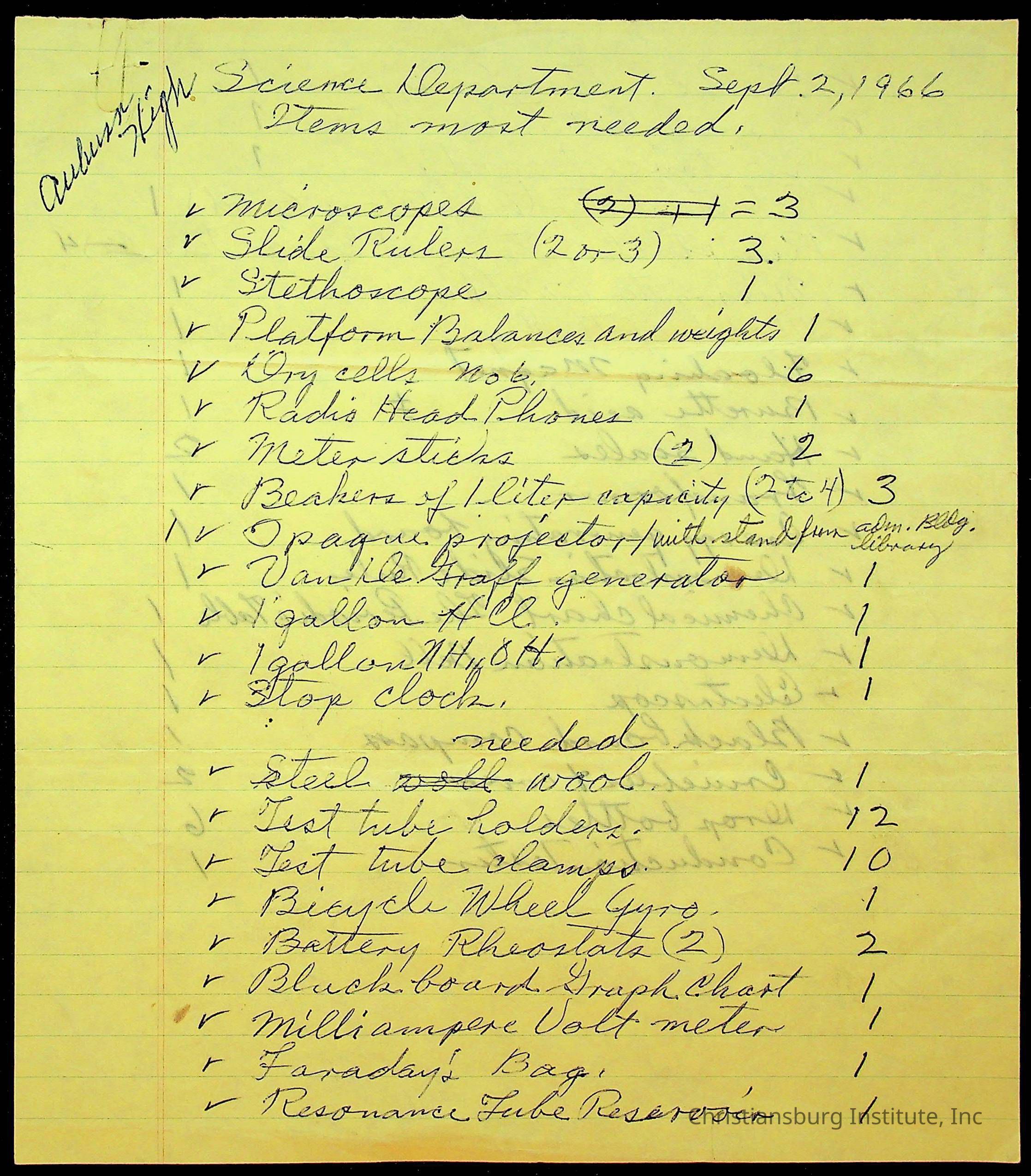 An archive of inventory sheets documenting Christiansburg Institute's inventory in the year 1966.