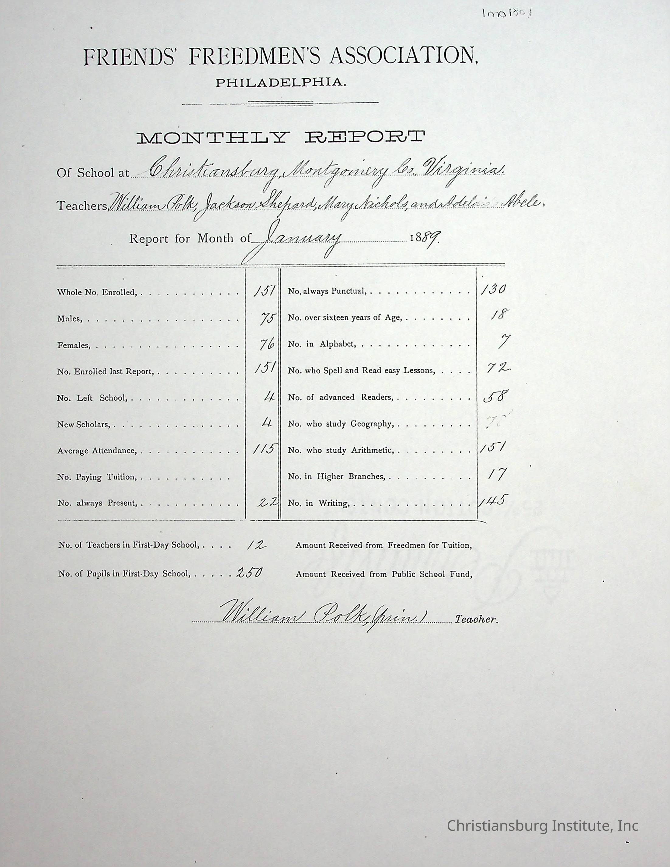 A series of monthly reports written by William Polk Jr about Christiansburg Institute from the years 1888 to 1889. Includes statistics about Christiansburg Institute.Creator