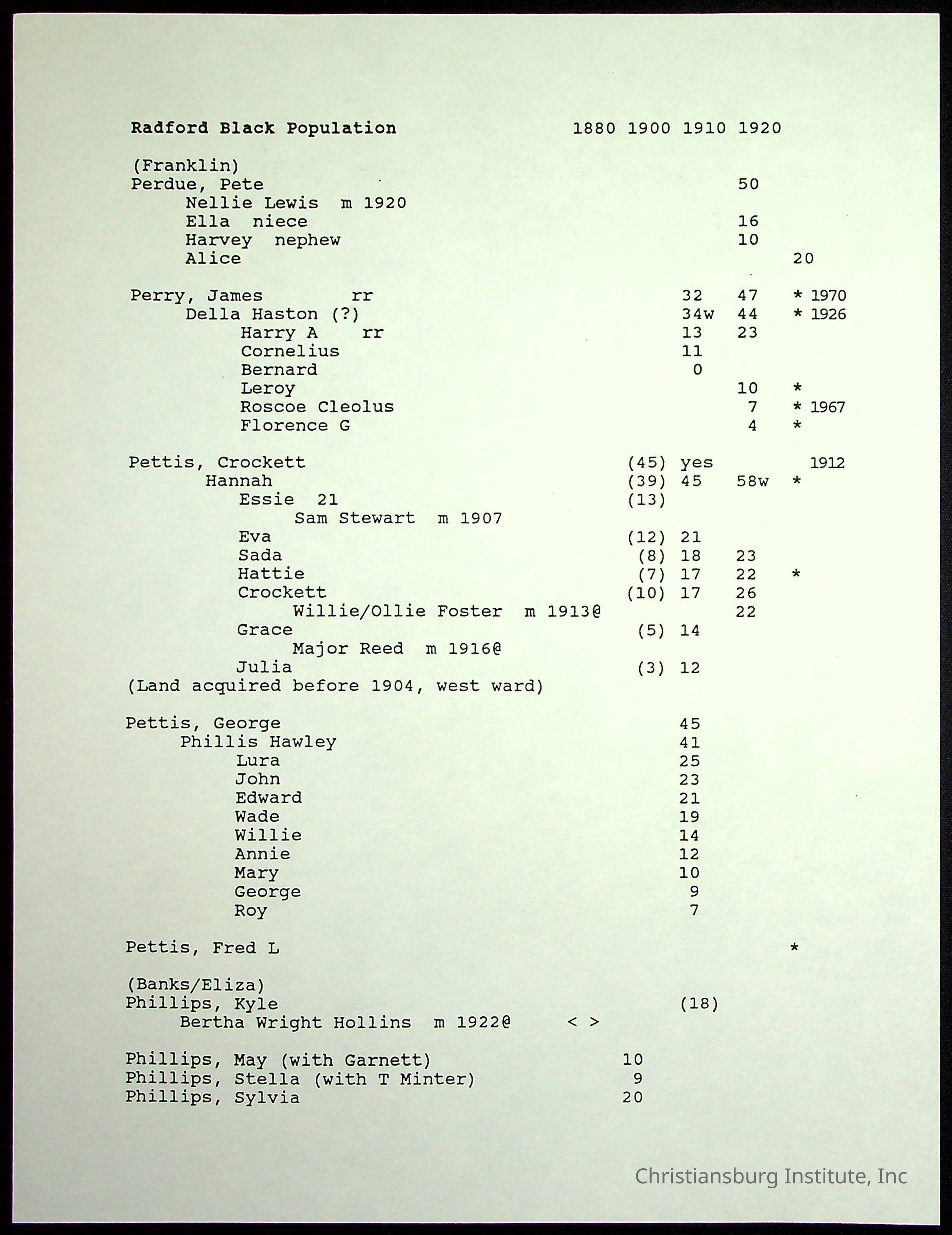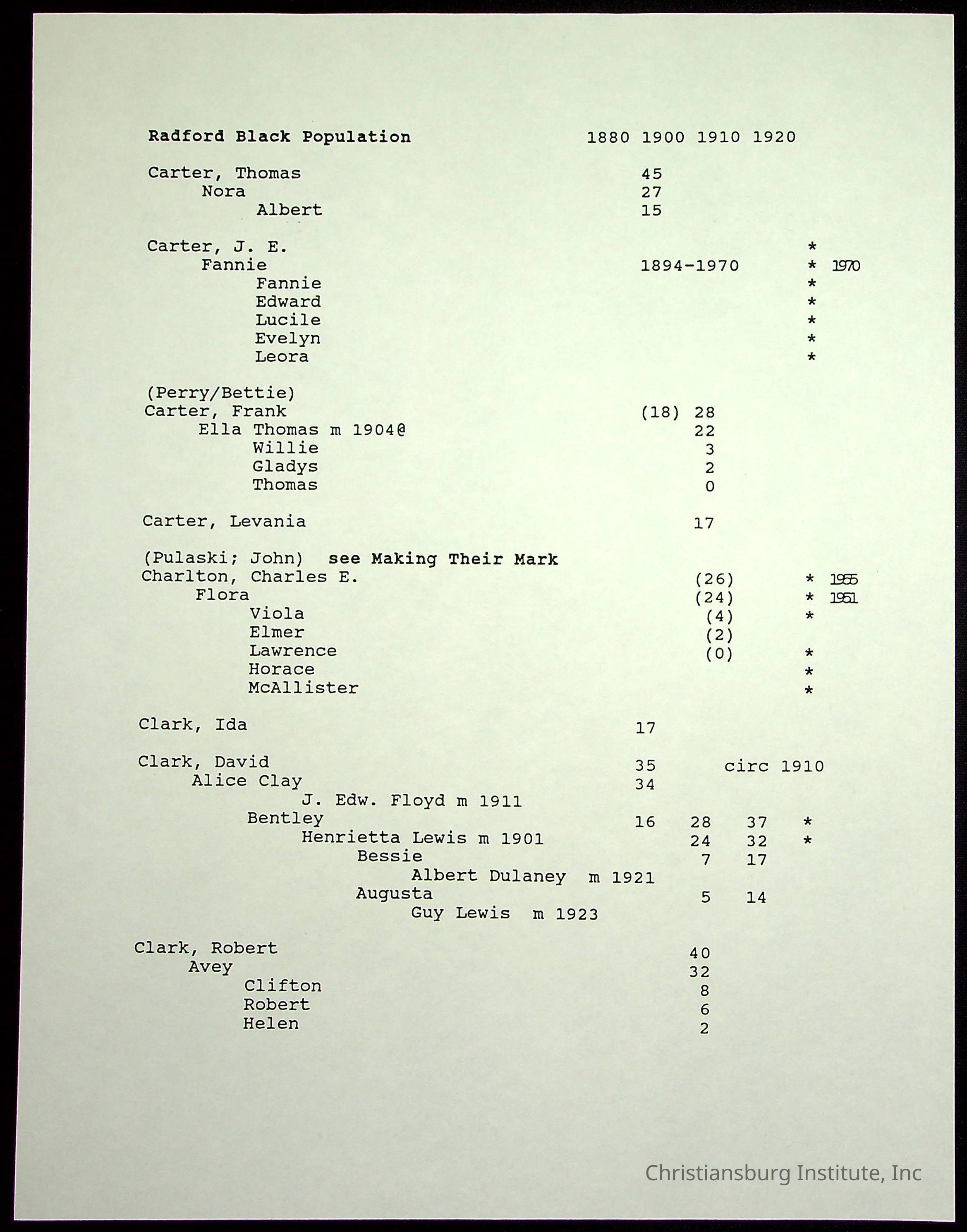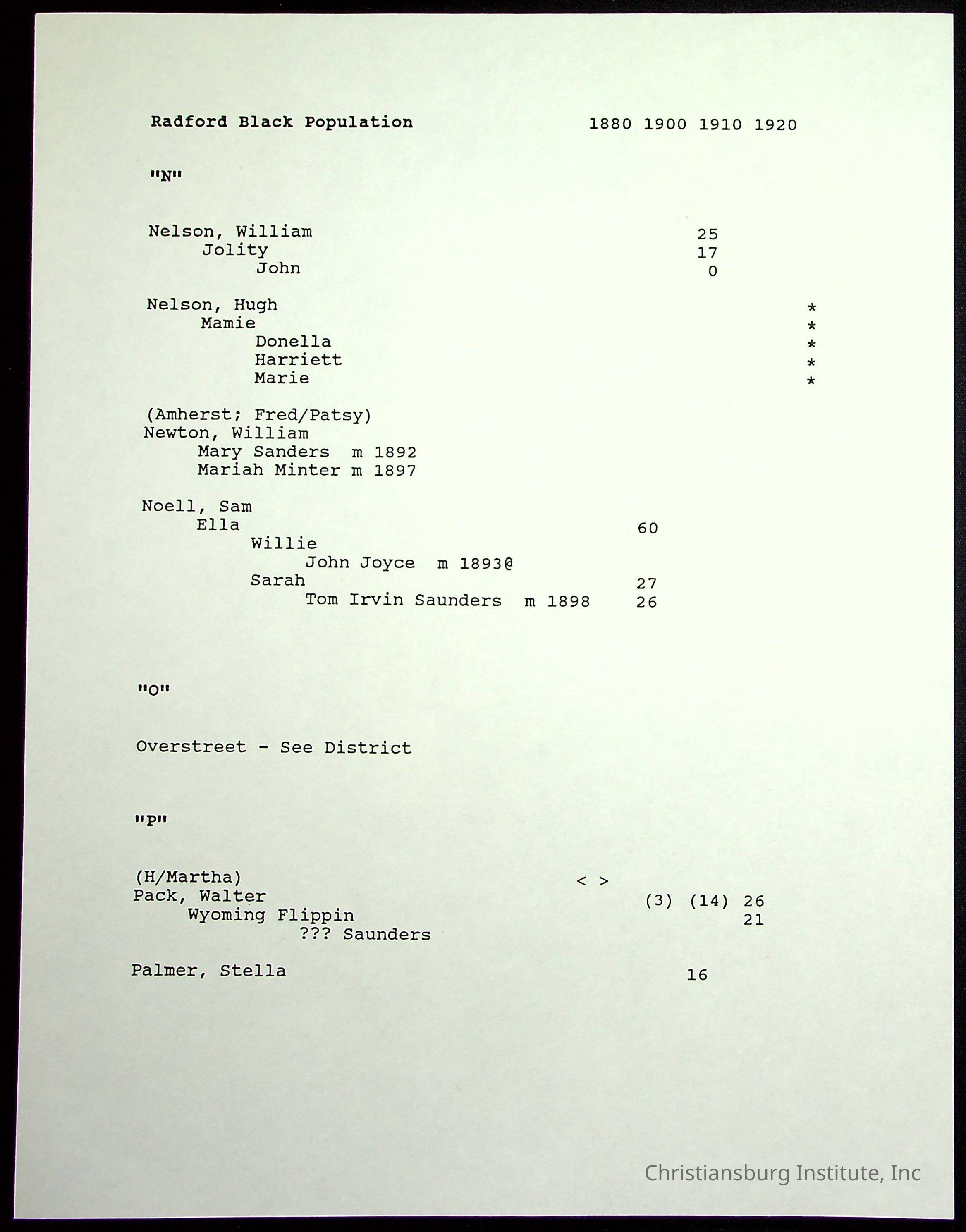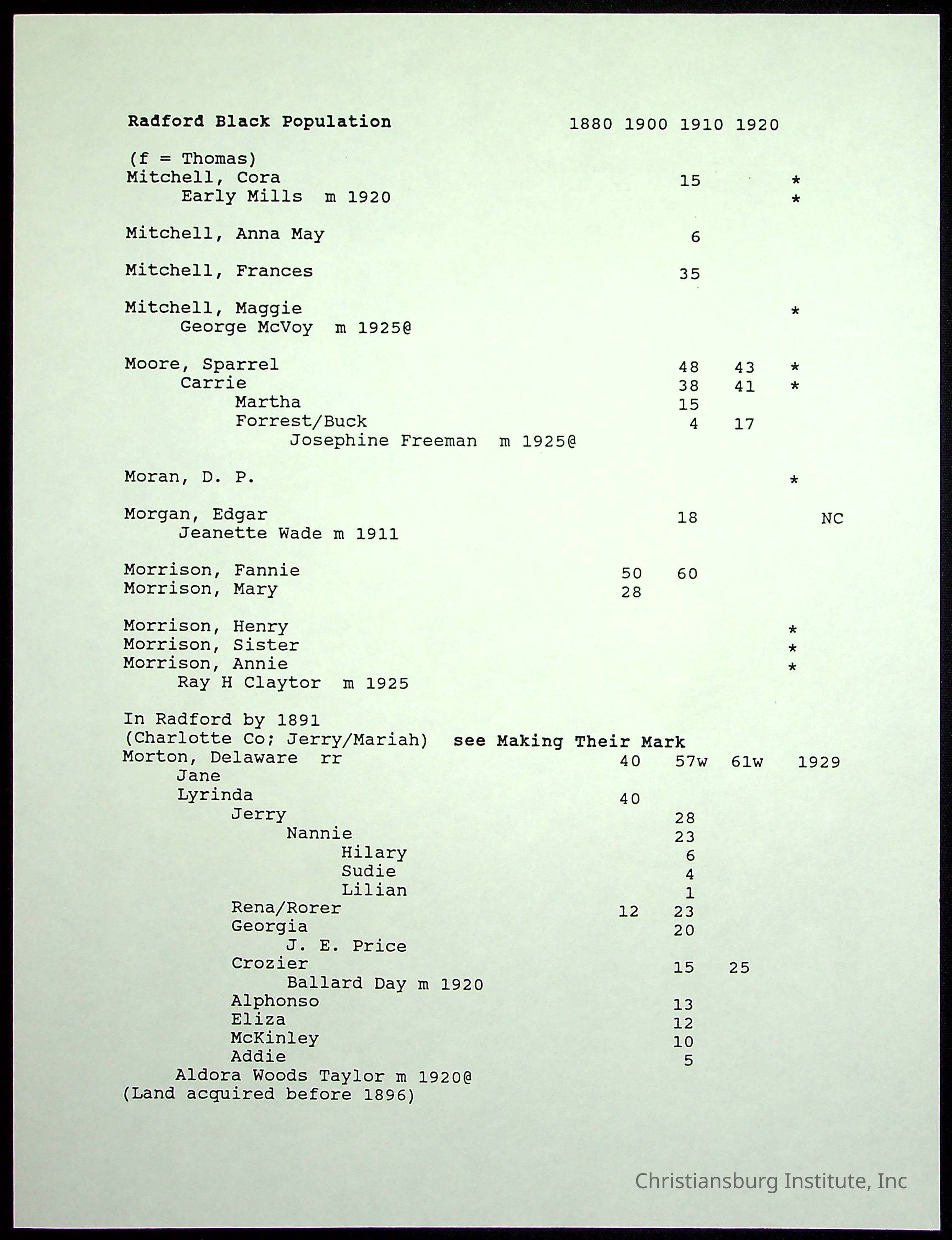 A folder of research materials collected by Radford University professor, Dr Linda Killen. This folder is titled 'Radford's Early Black Residents' and includes Killen's research on the Black population of Radford, Virginia. This research file includes census records.