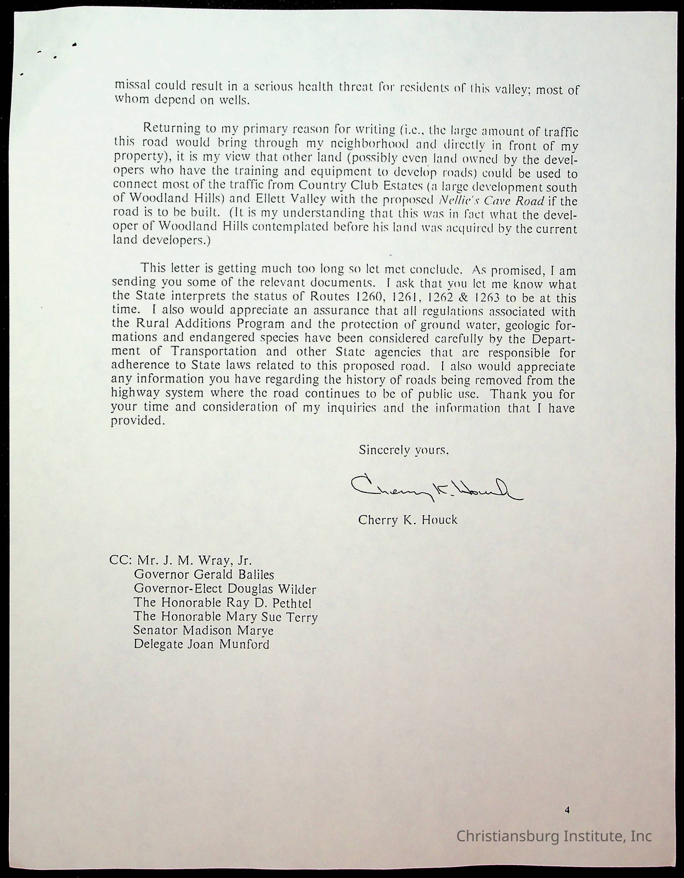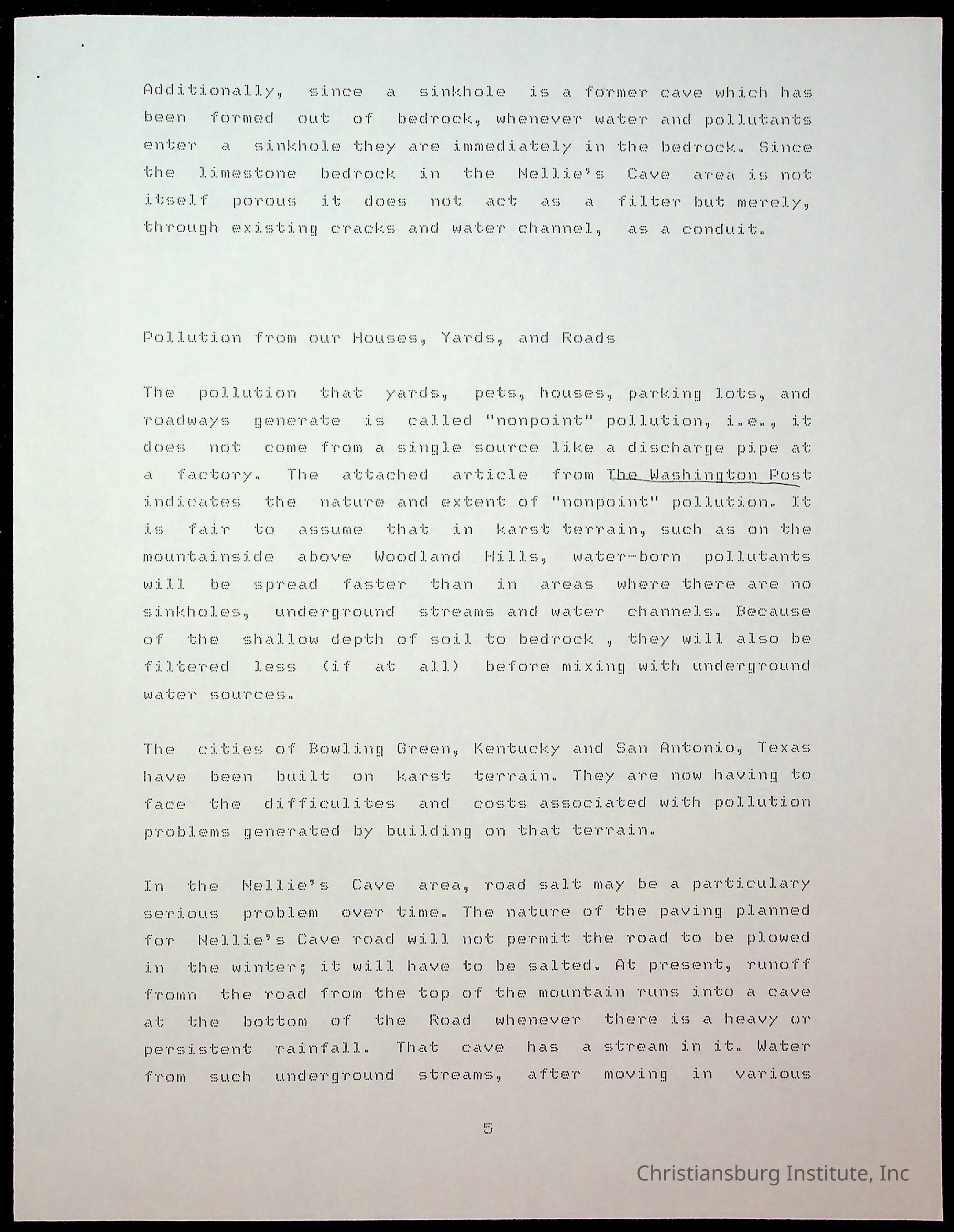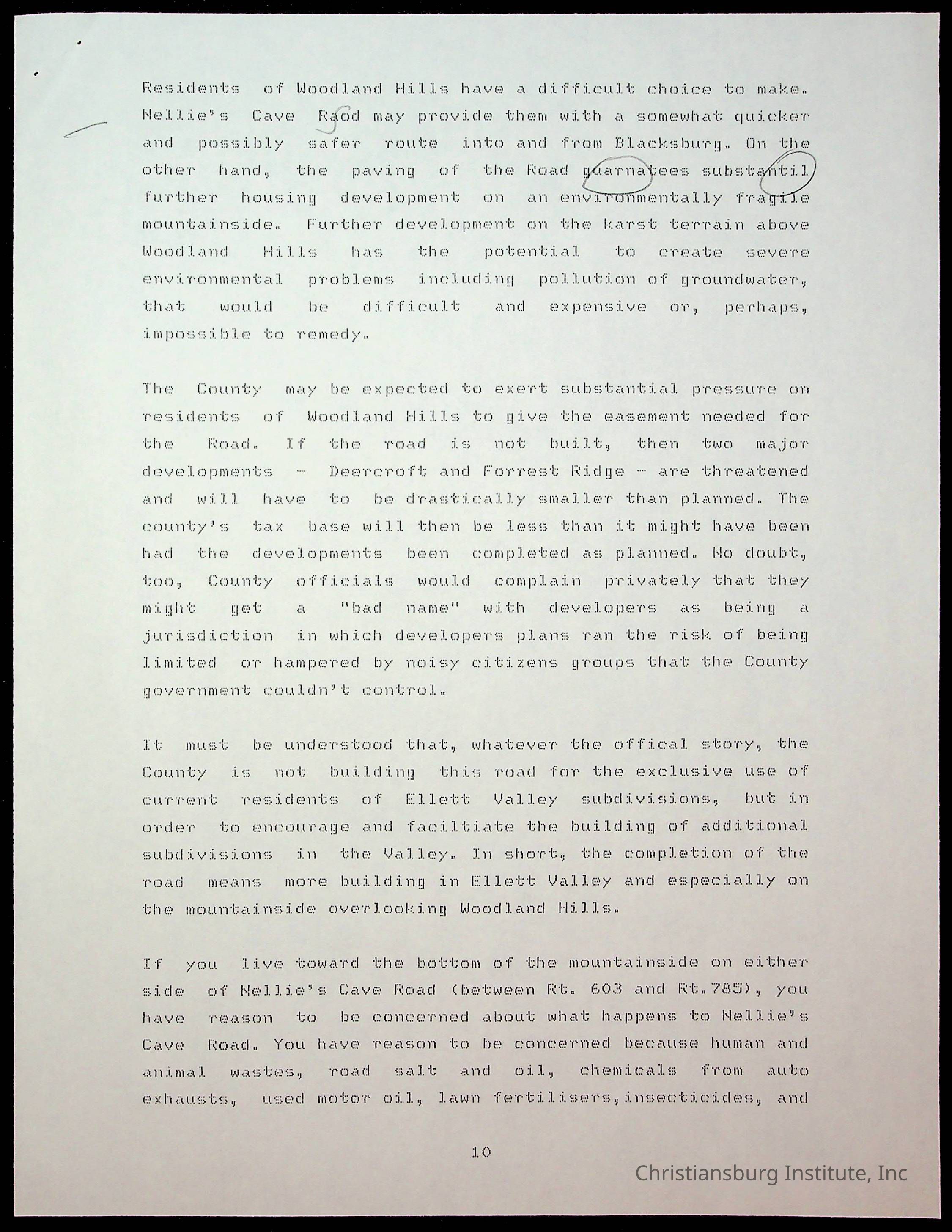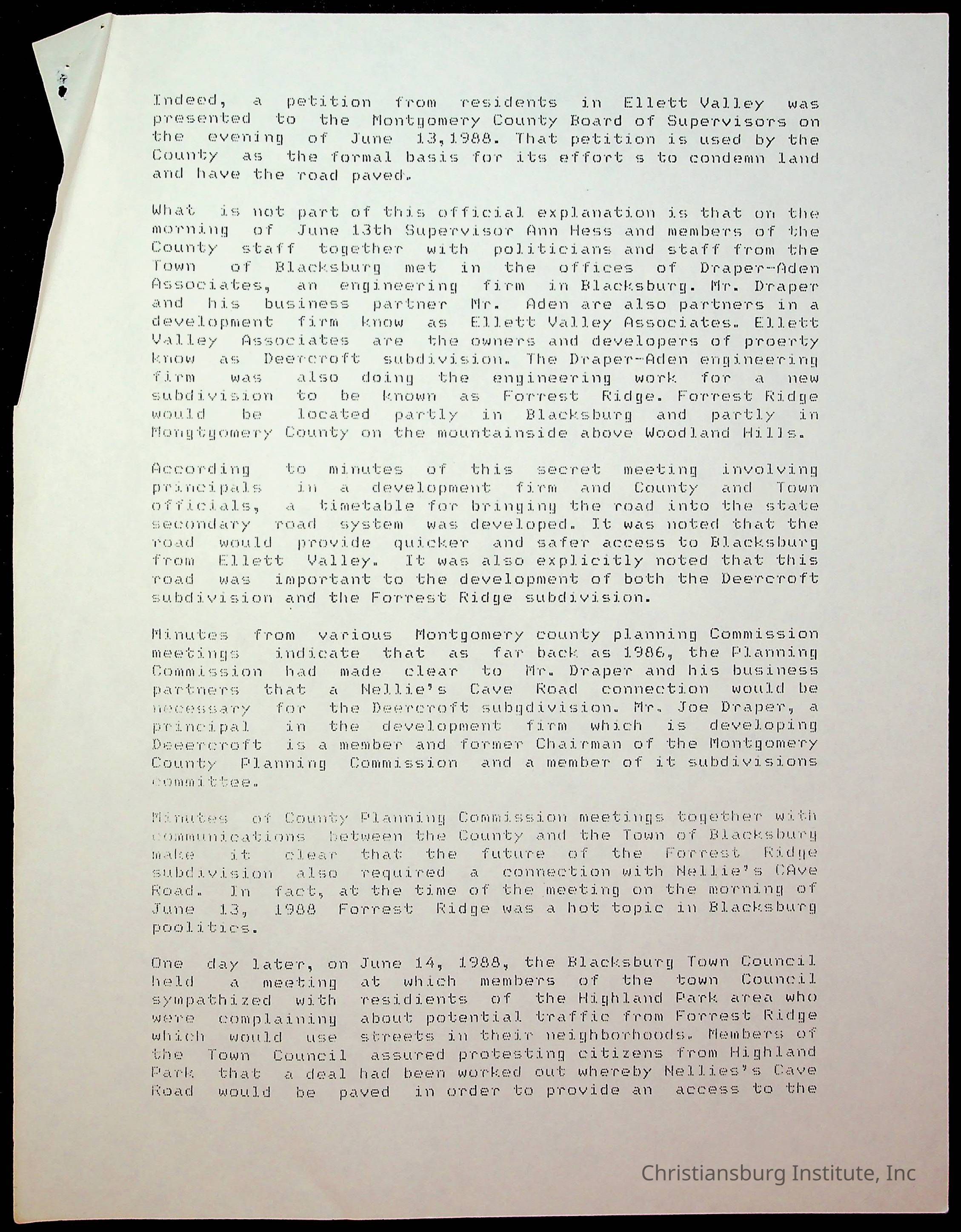 An archive of documents about the group, Woodland Hills, Inc, and their involvement with the Nellies Cave Road project, complied by Elizabeth Fine circa 1990s.