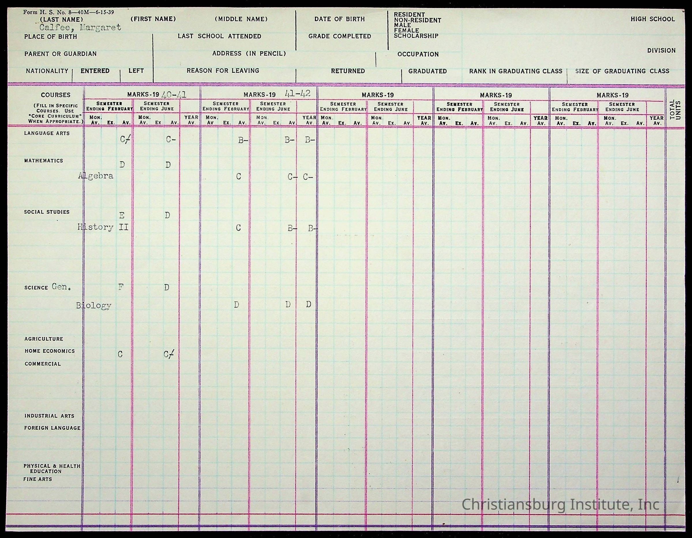 The student file for the Christiansburg Institute student, Margaret Calfee circa 1940s.