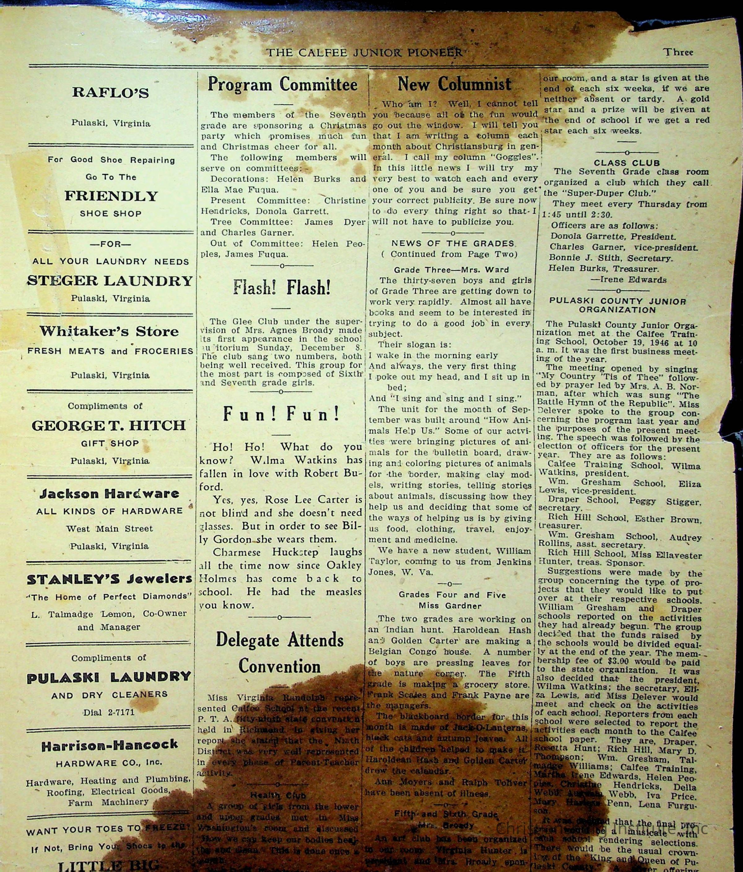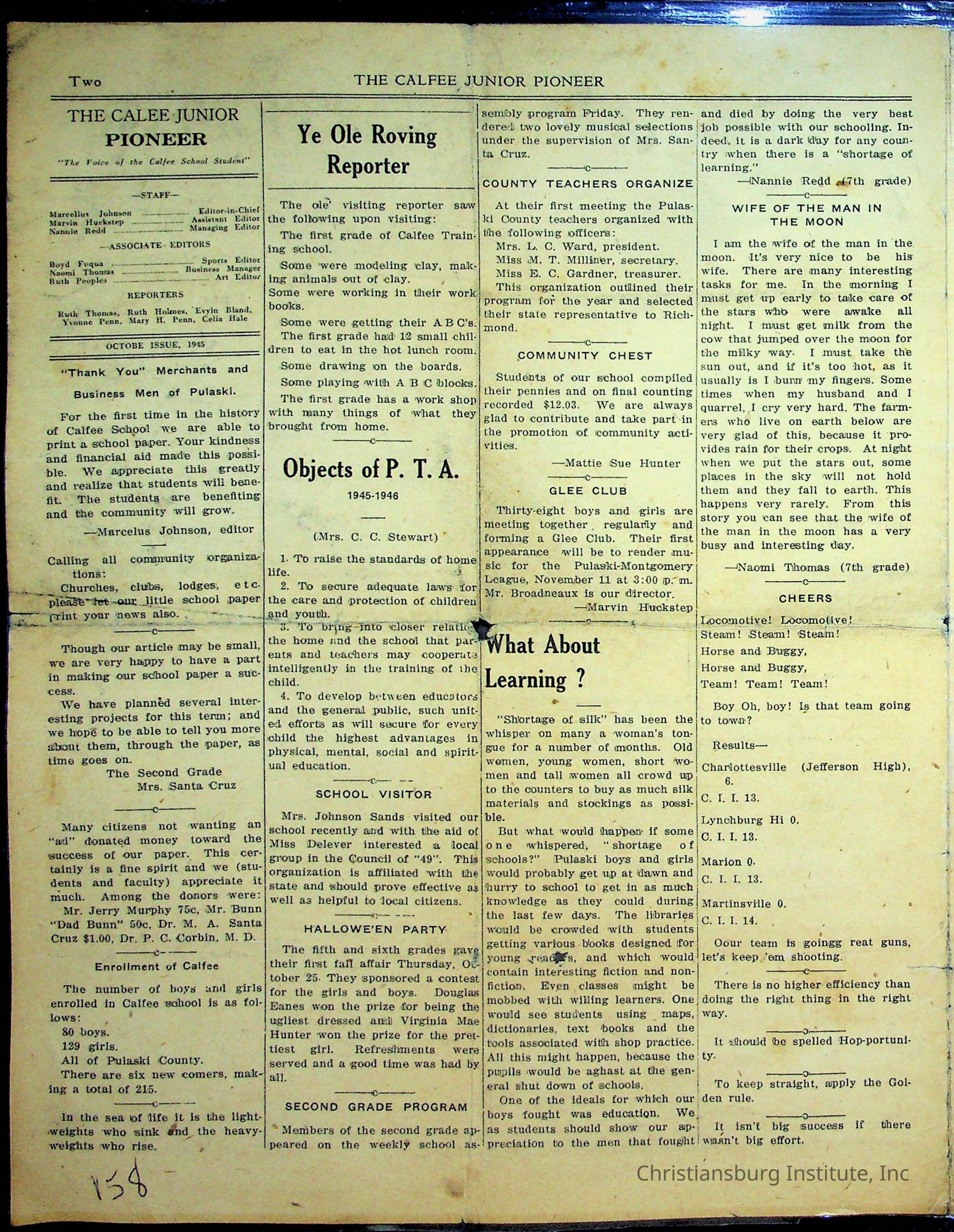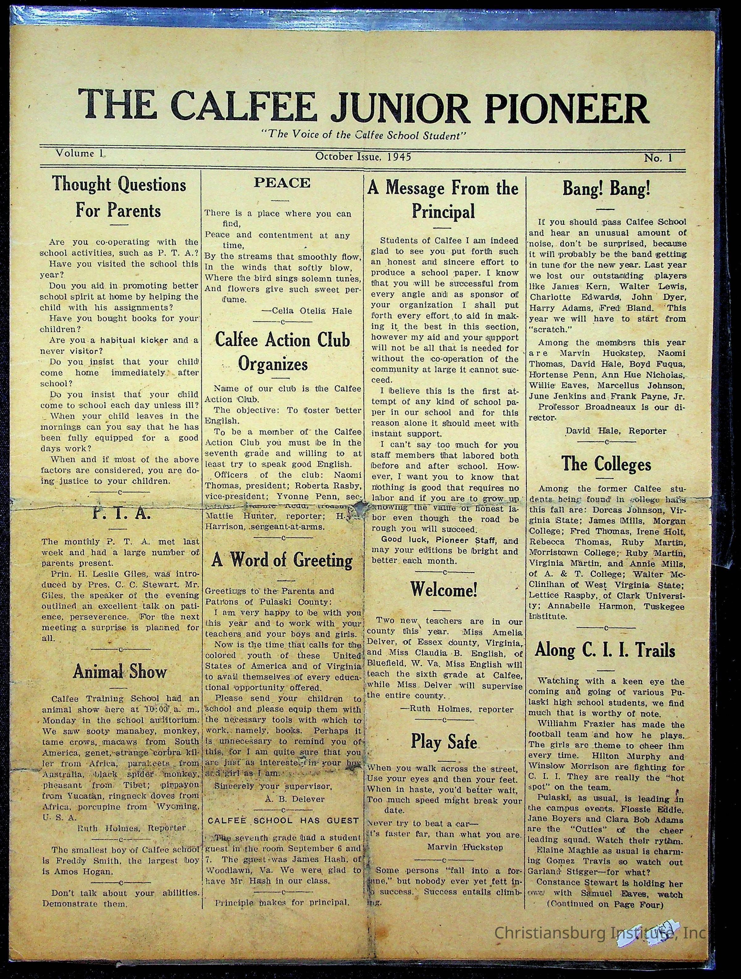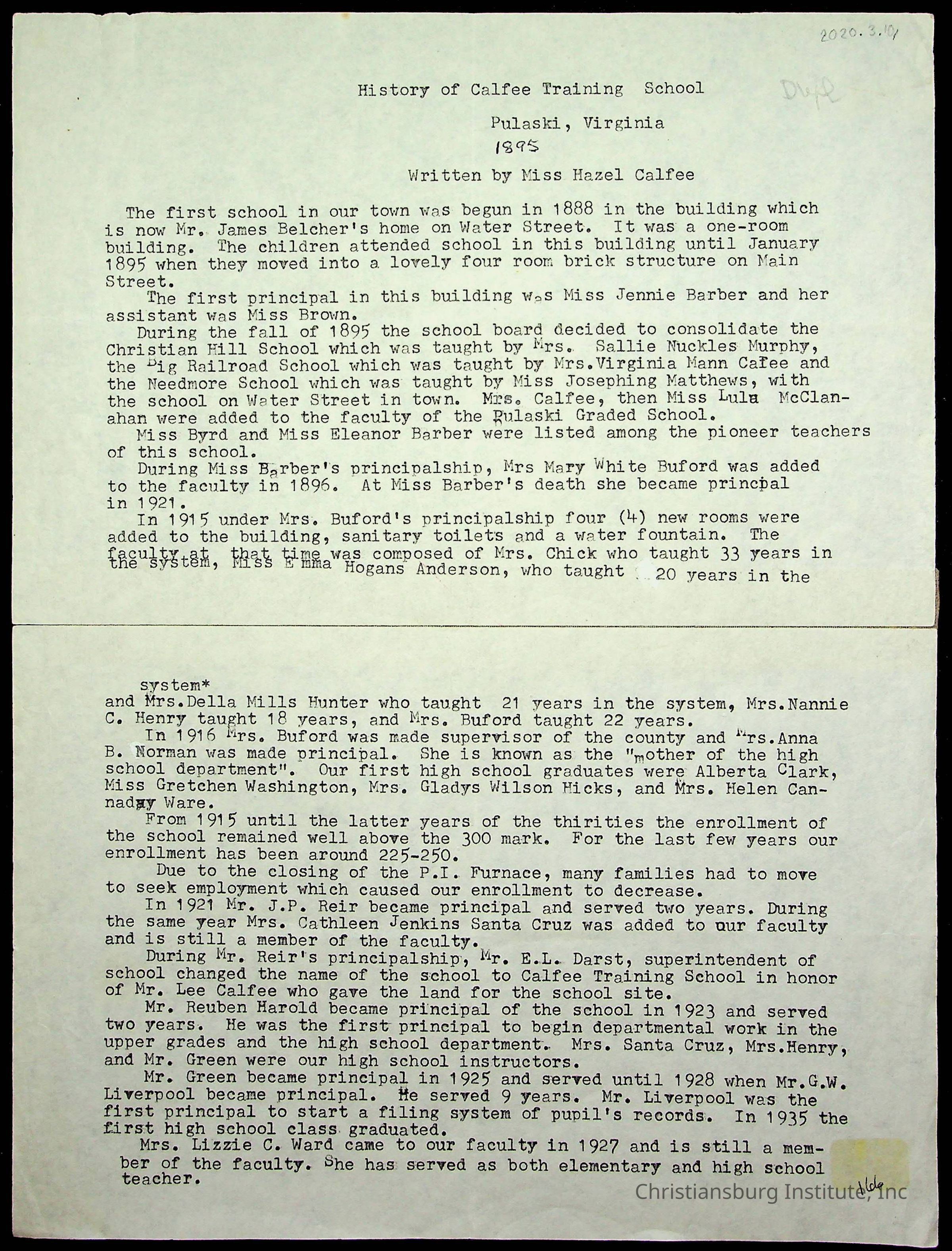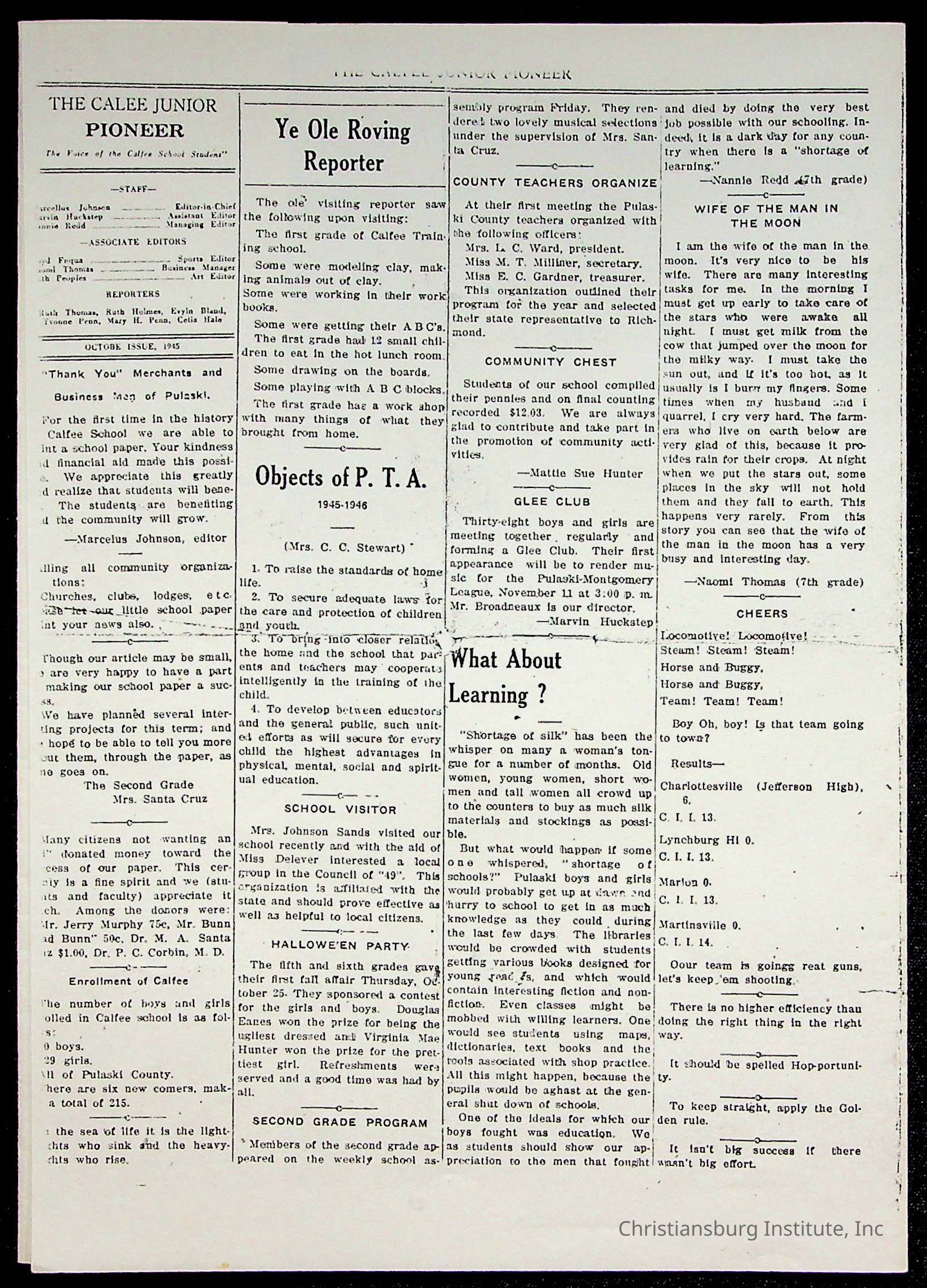 An archive of materials from the Calfee Training School including photographs, educational exercises, and the student publication, Calfee Junior Pioneer. The archive materials are from 1919-1946.Collection