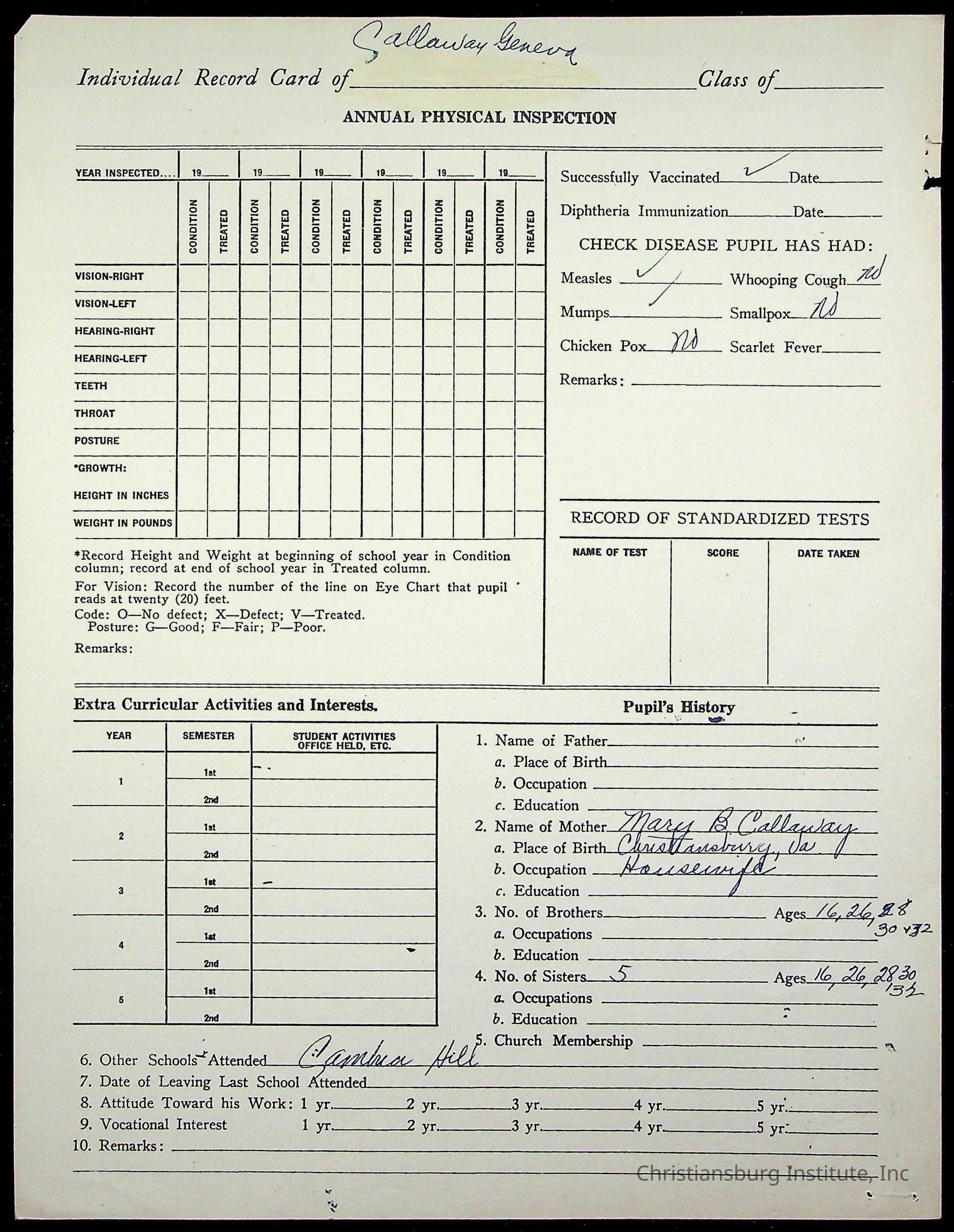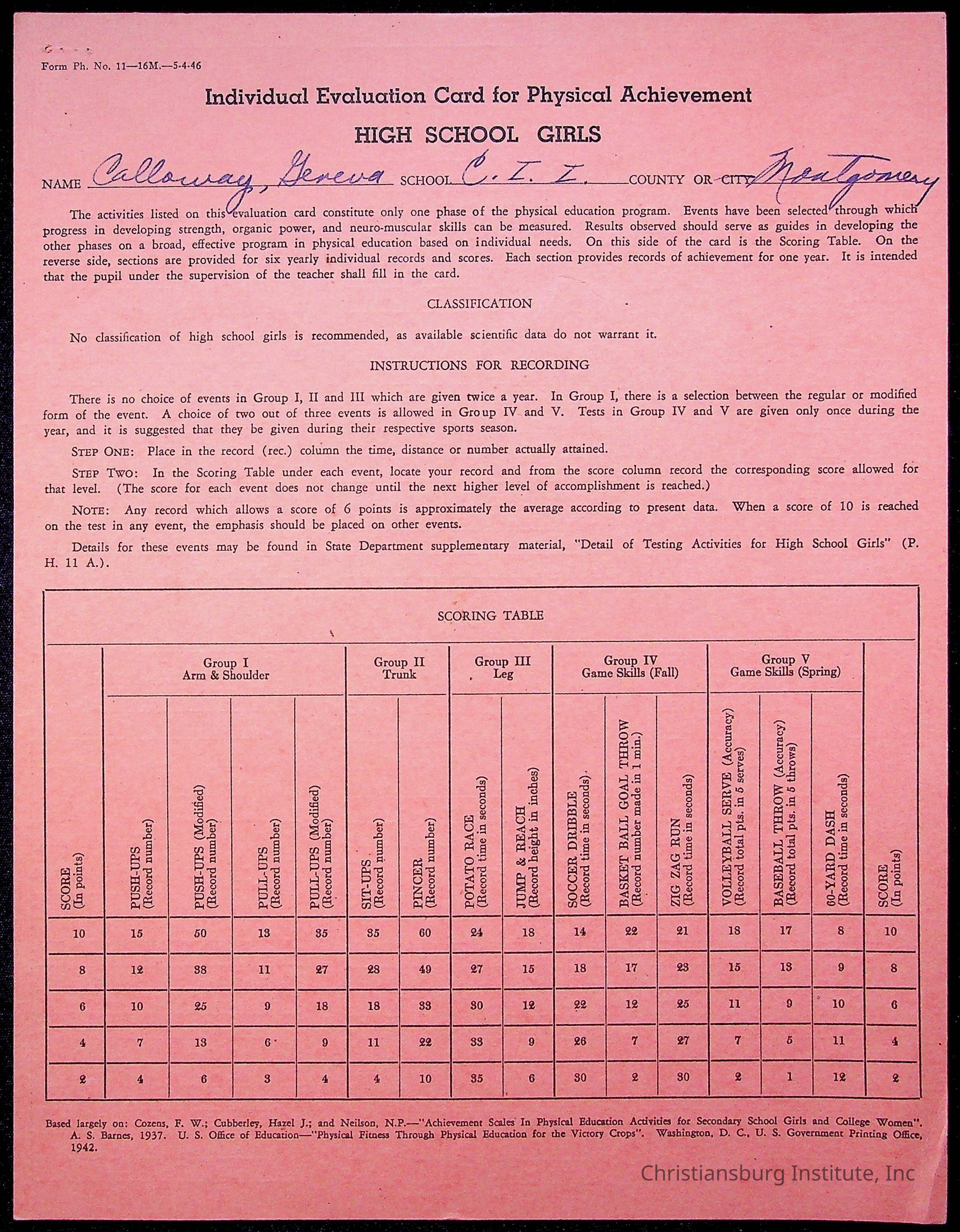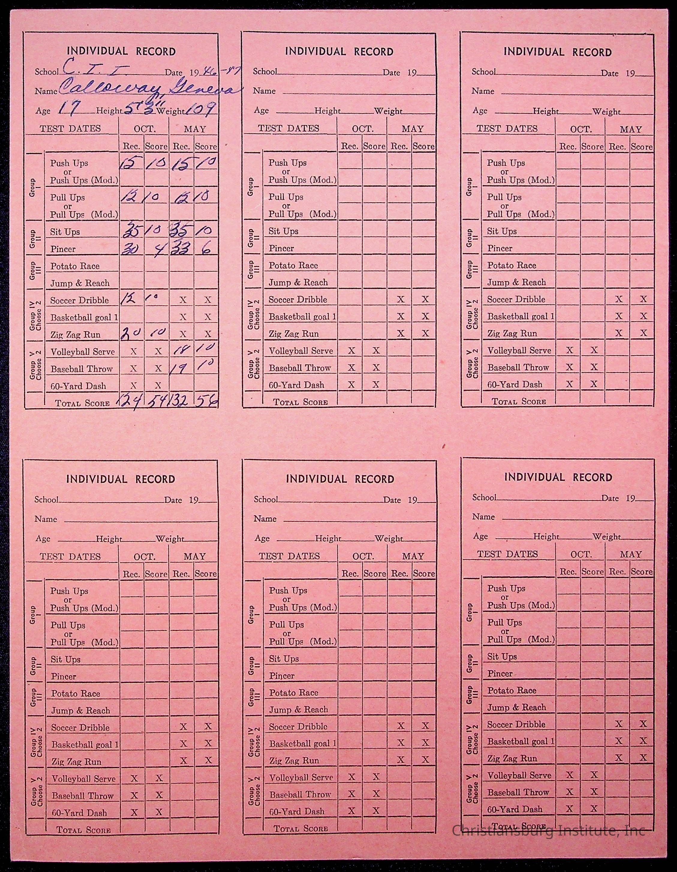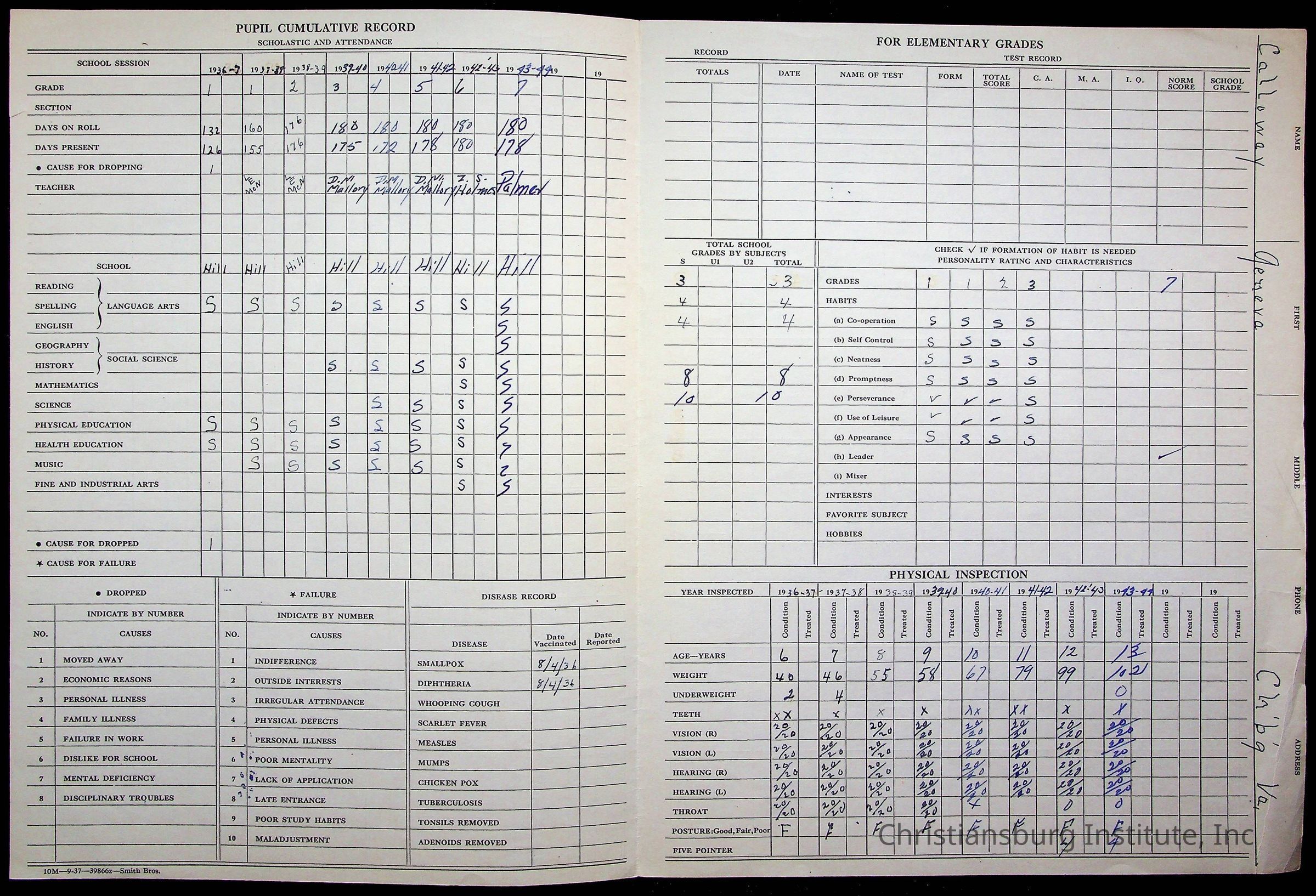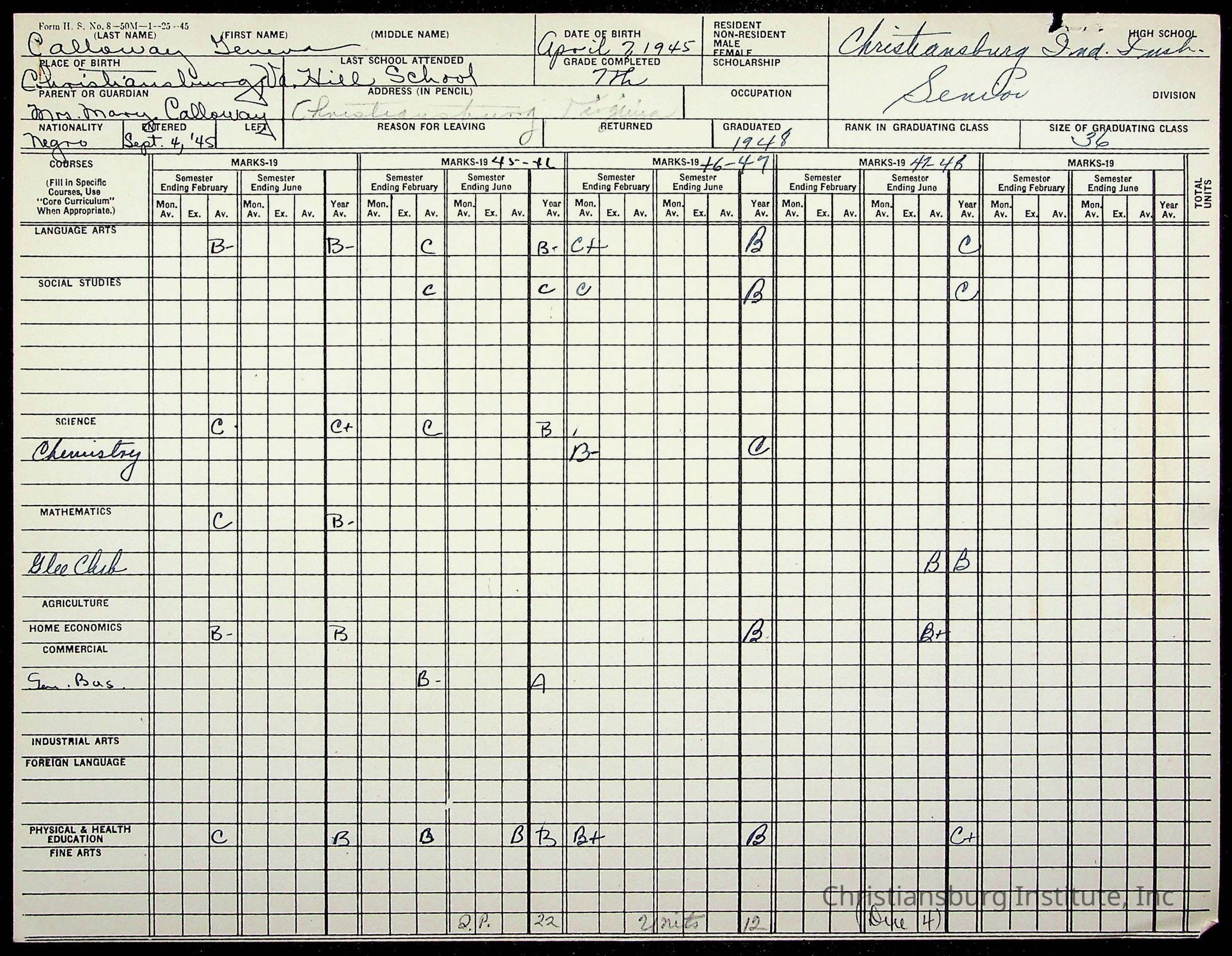 The student file for the Christiansburg Institute student, Geneva Calloway circa 1940s.